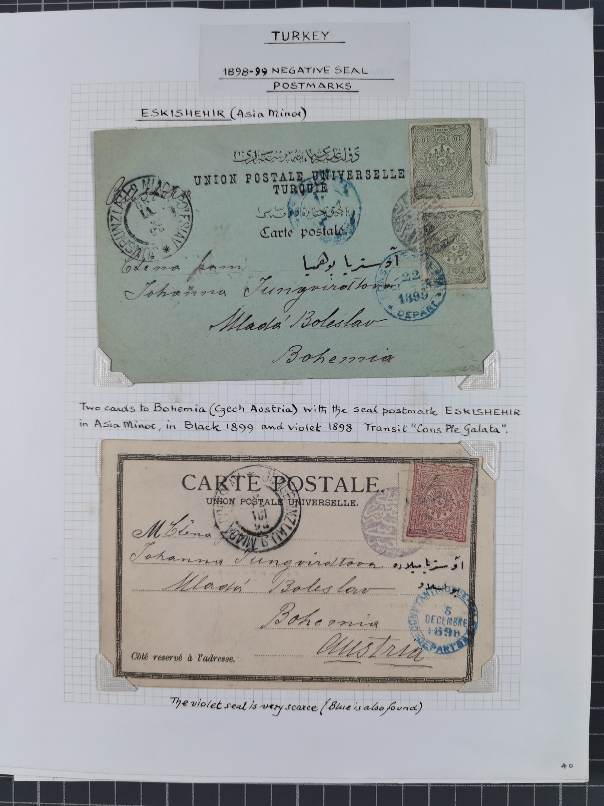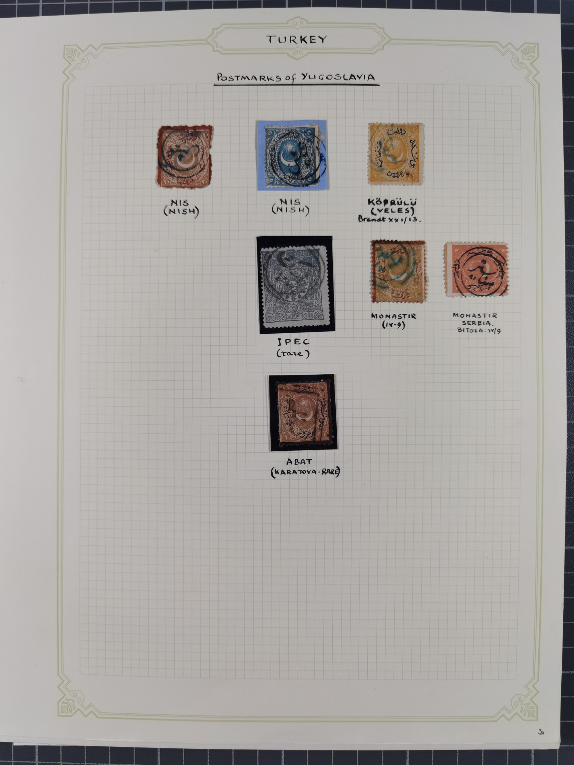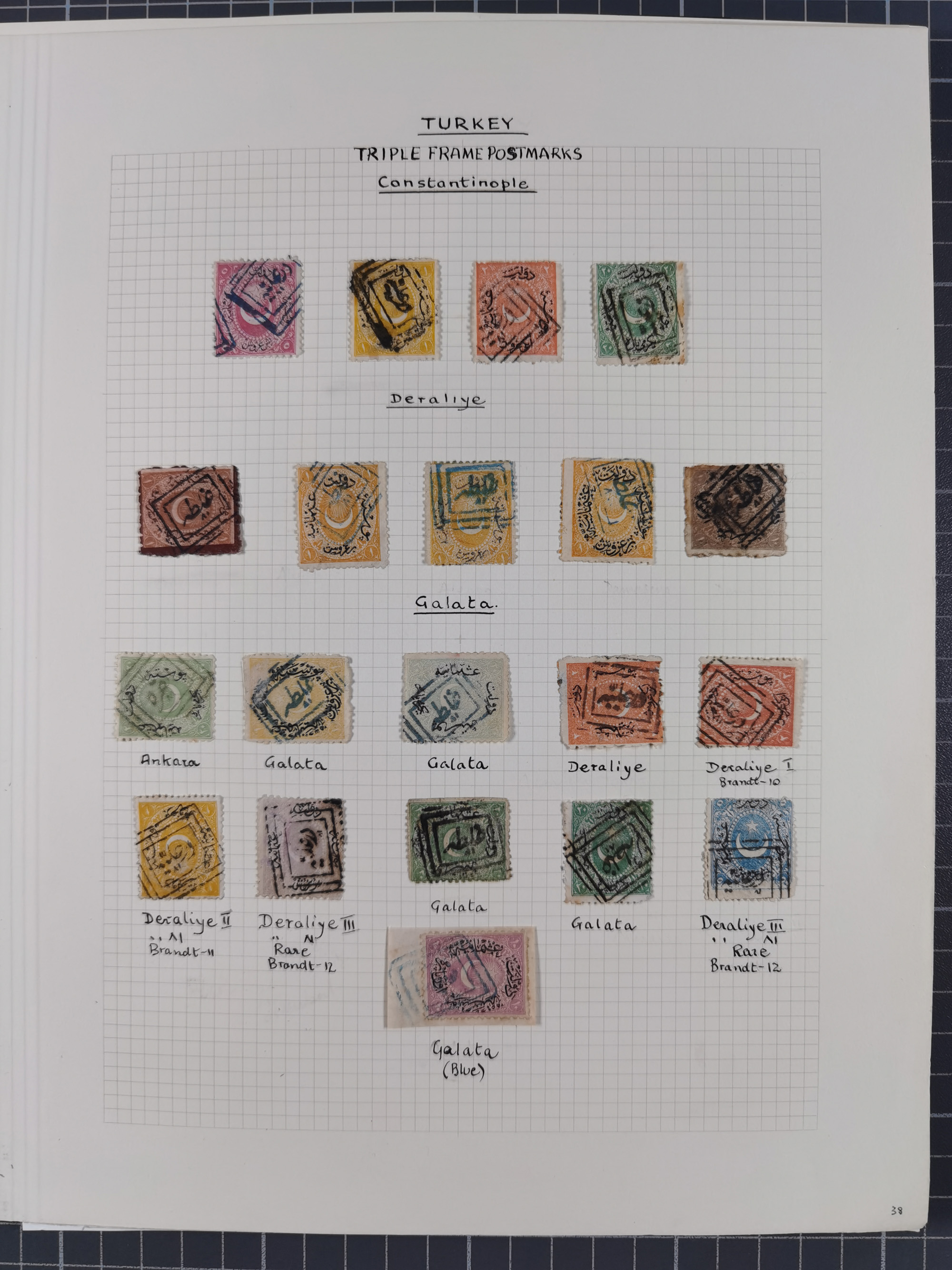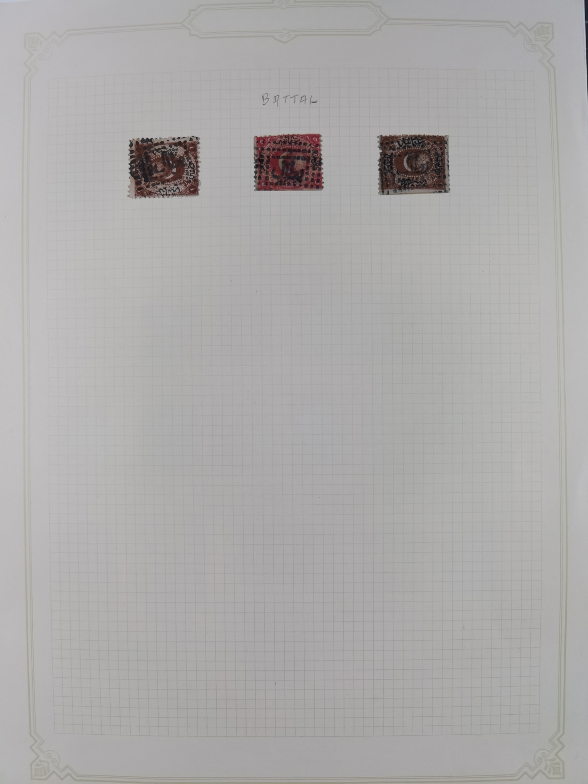 1840/1918, "ALL ARABIC CANCELLATIONS COLLECTION" on old selfmade album pages according to Brandt & Ceylan Types, starting pre-philatelic period with covers from Uskub, Konia, Bursa, Edirne and Ankara. Including 7 Duloz covers with cancellations of Nigde Posta Subesi 1287 (negativ type), Adana Turquie, Dersaadet 3 etc. and 25 pia. single stamps cancelled Bagdad 1865 and P.I.O. 1871, over 150 stamps with clear town cancellations, three postcards with arabic type cancellations of Eskishehir and Edirne Rüstem Pasha Hani, few different, but mainly fine.