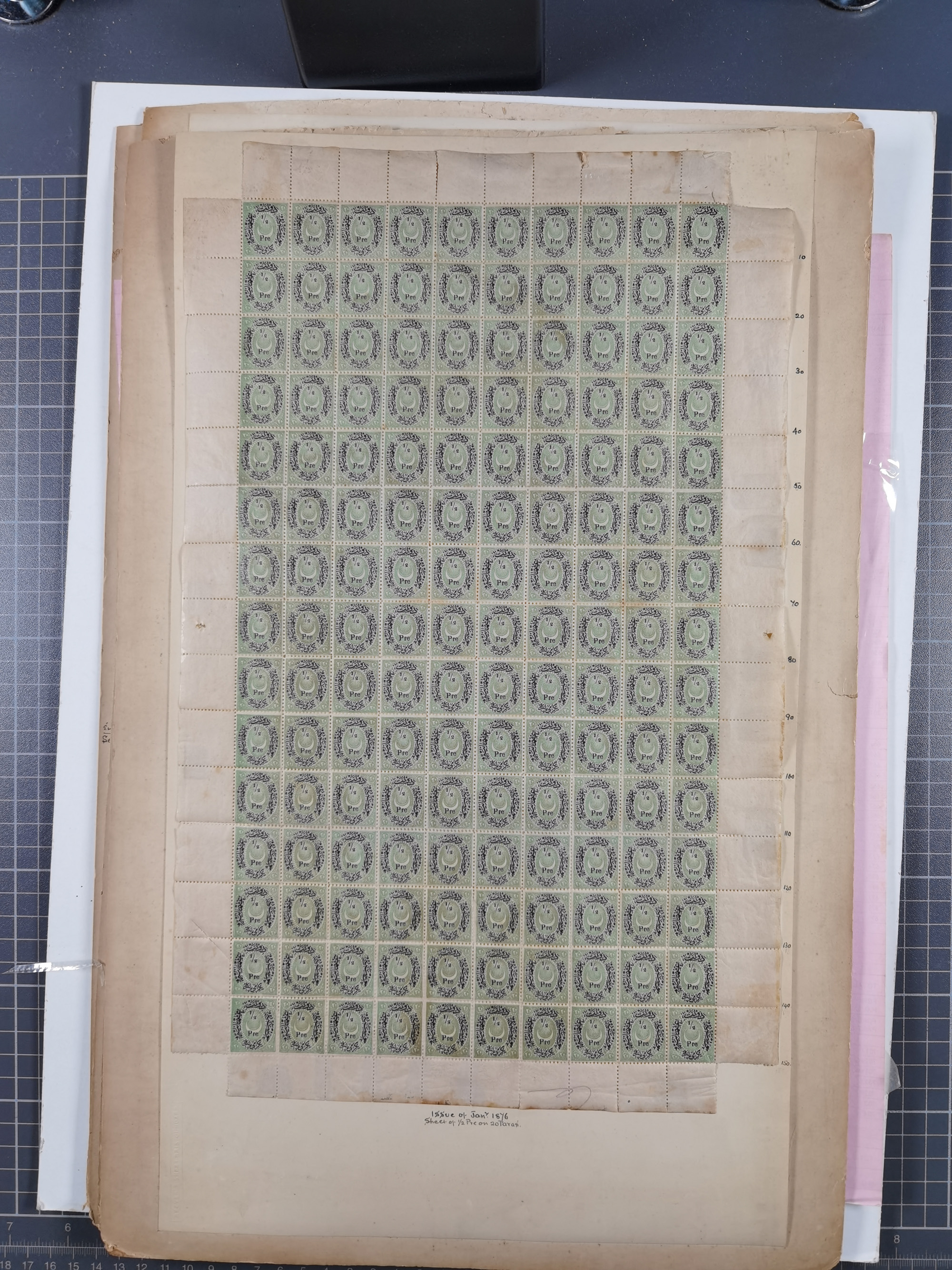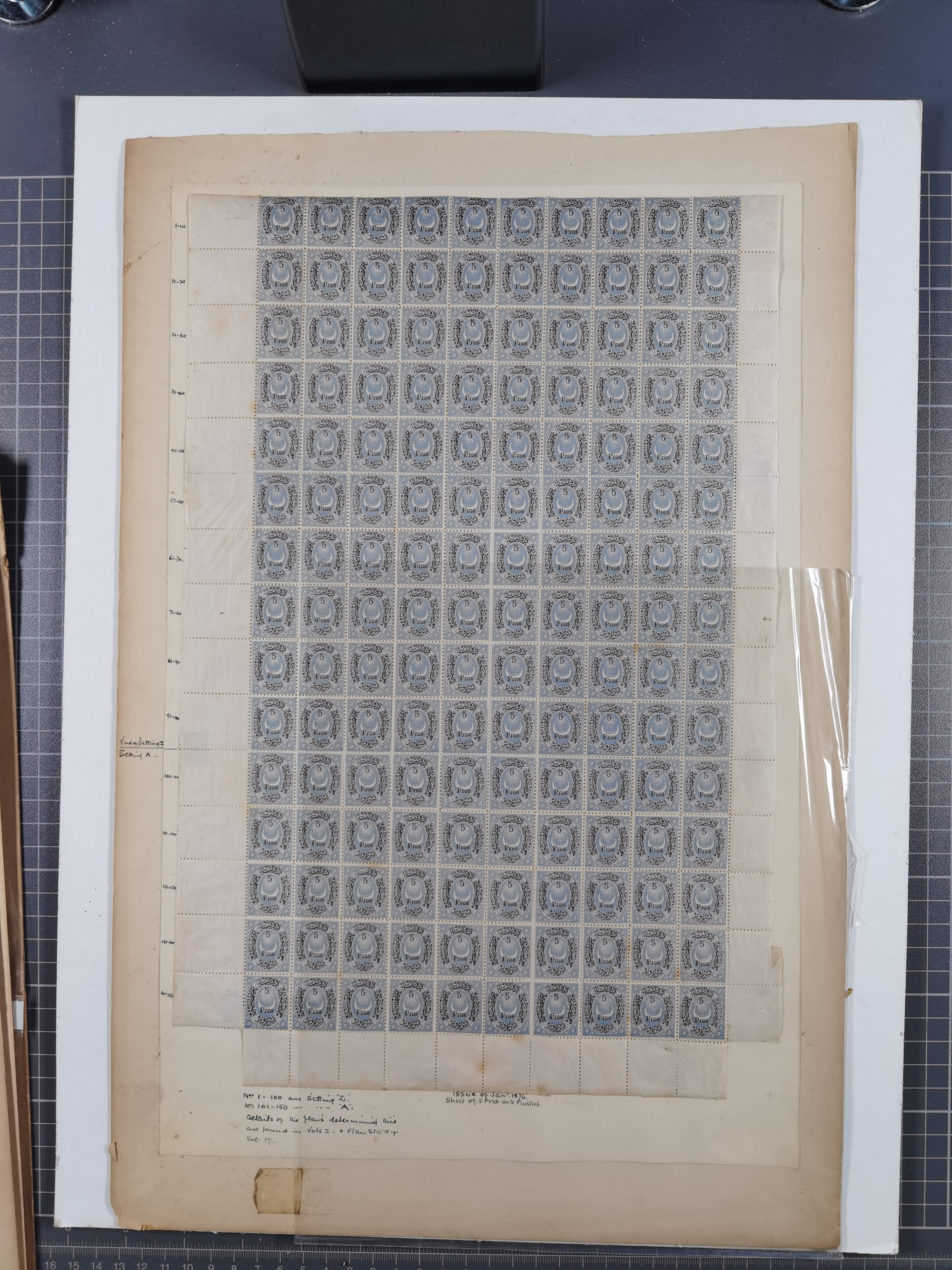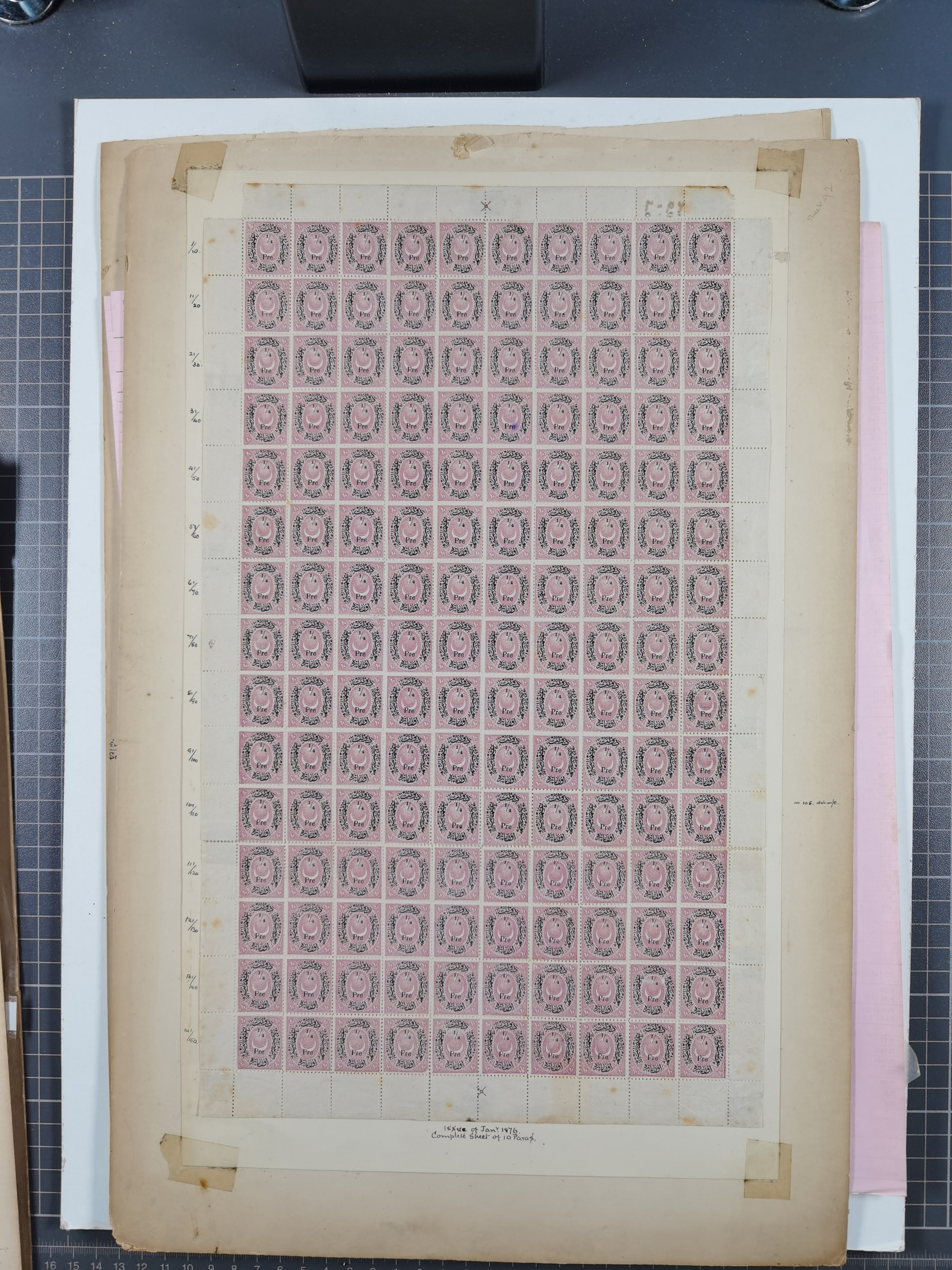 1876, Duloz four complete sheets in large folder, including 5 Pres,½ Pres, ¼ Pres, 1¼ Pres. (Mi.22-24, 26), most fine, few perfs apart and little different, isf. catalogue value over 2.500 Euro