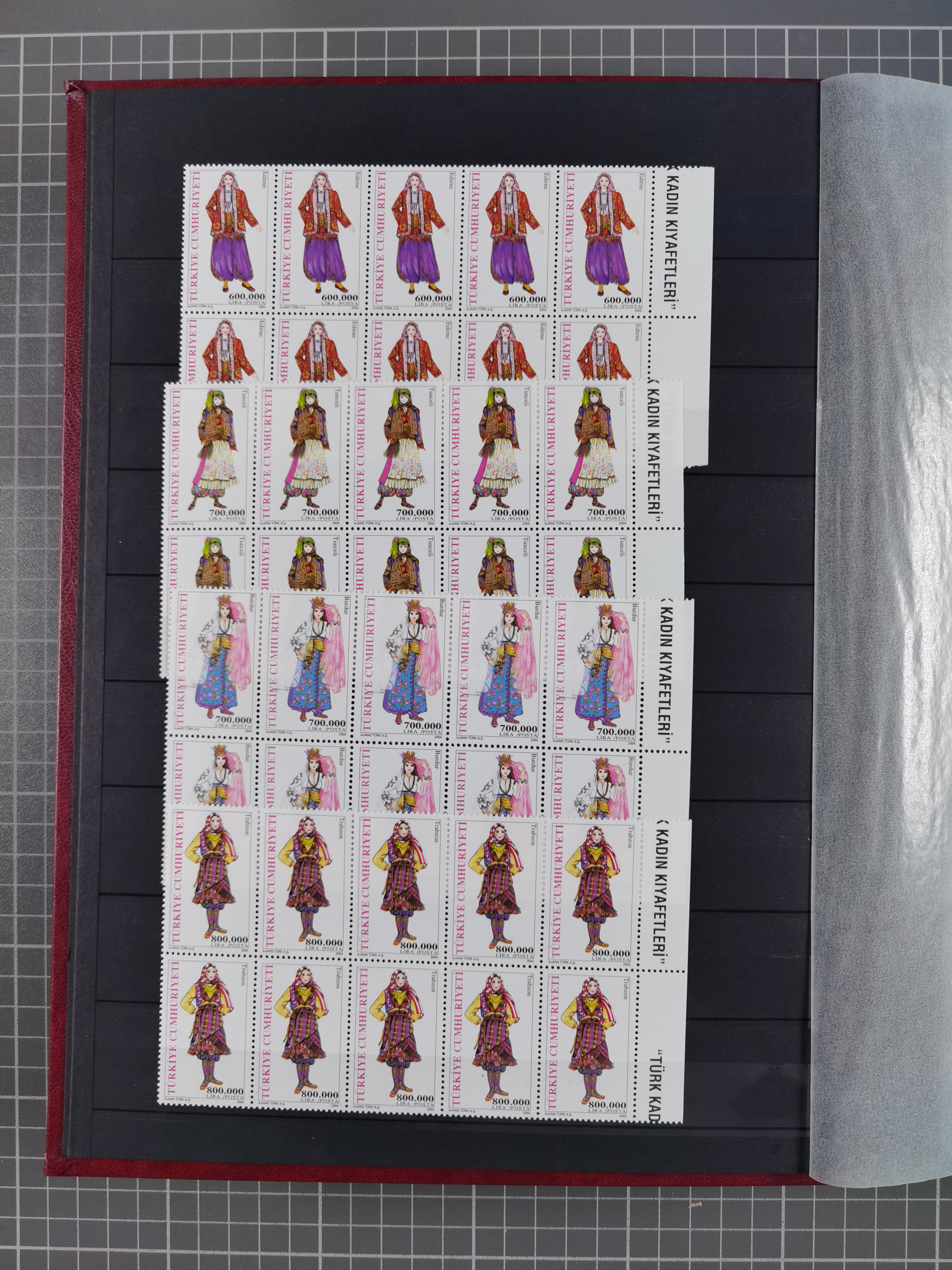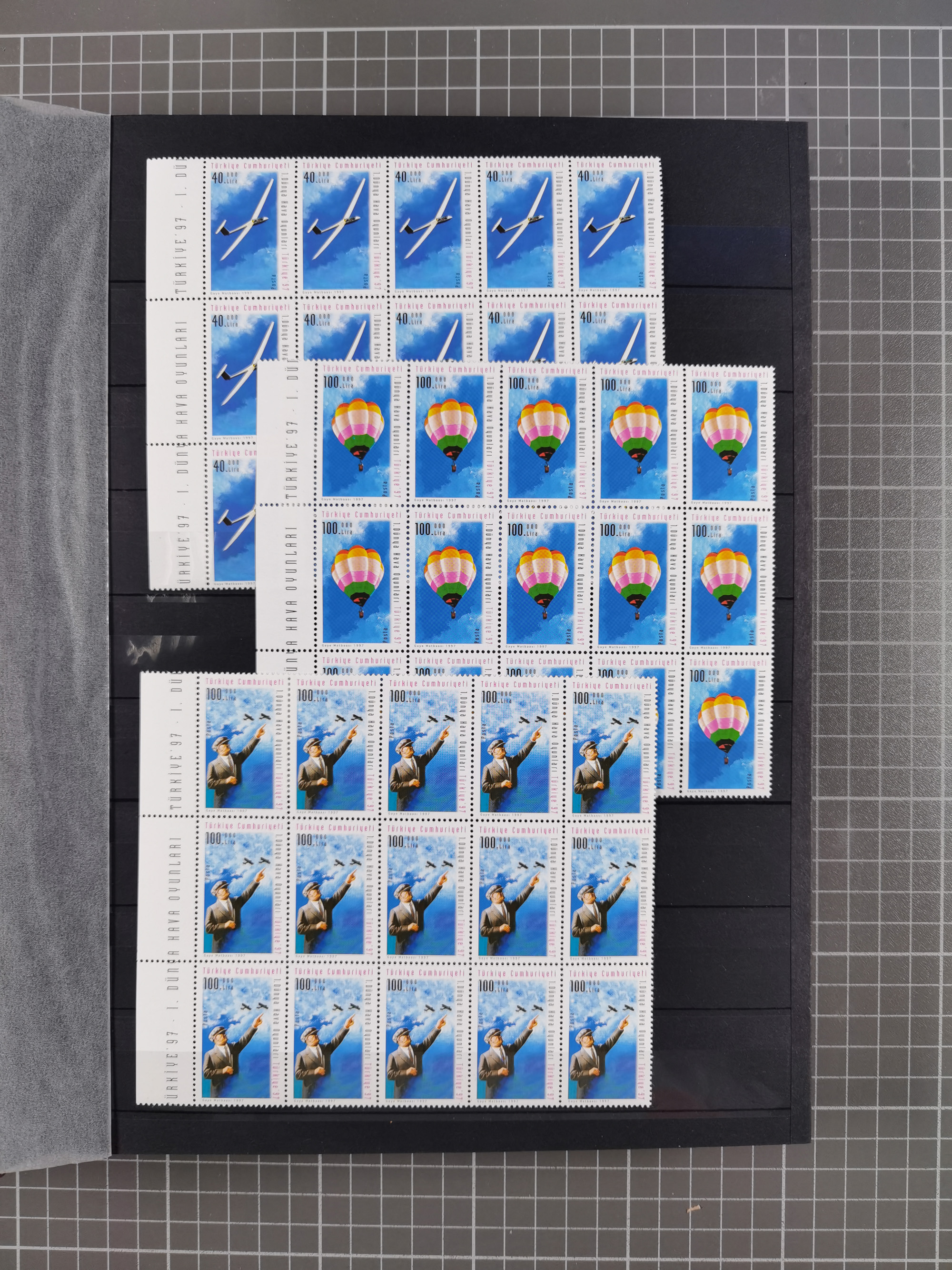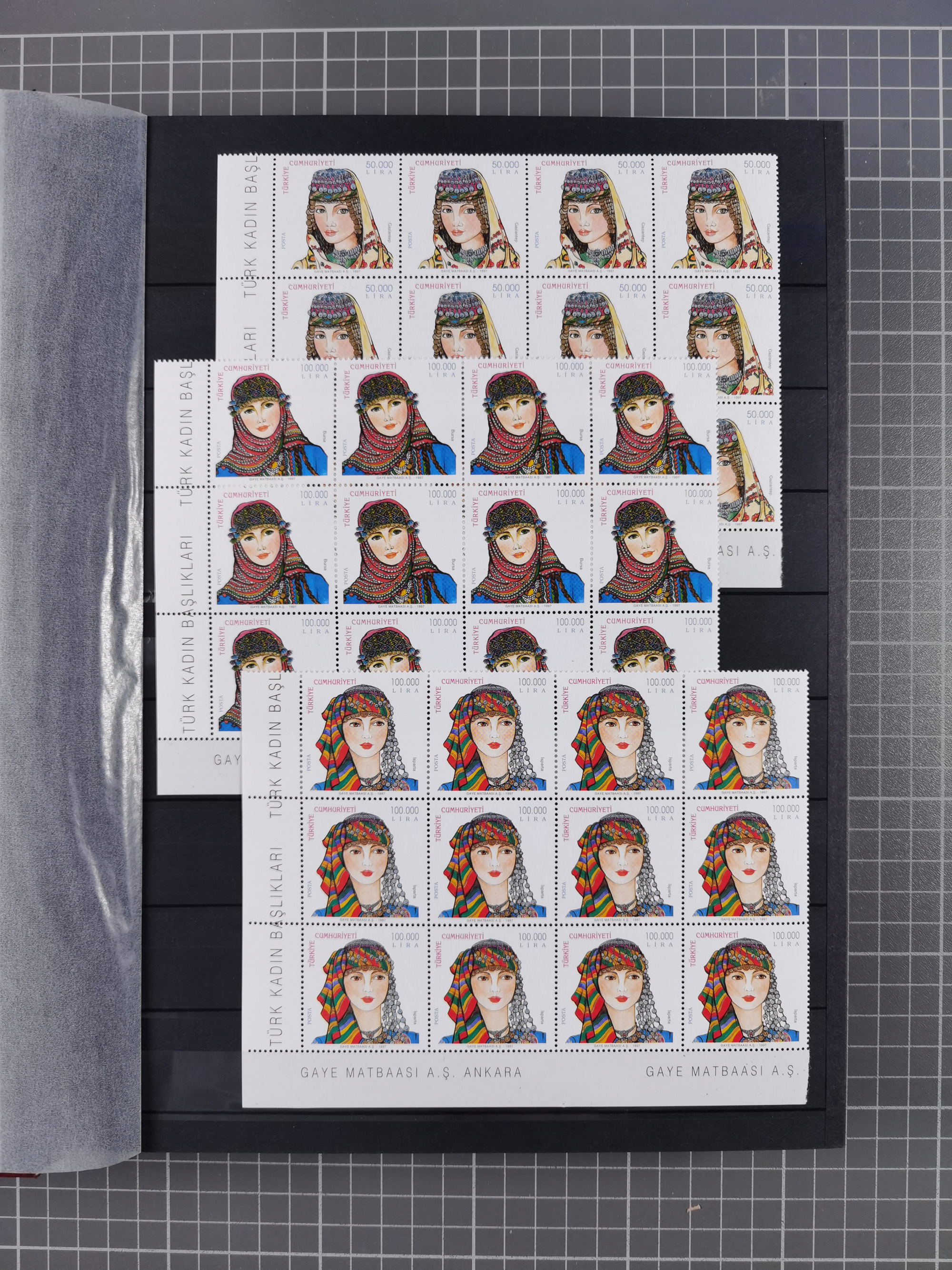 1876, Duloz four complete sheets in large folder, including 5 Pres,½ Pres, ¼ Pres, 1¼ Pres. (Mi.22-24, 26), most fine, few perfs apart and little different, isf. catalogue value over 2.500 Euro