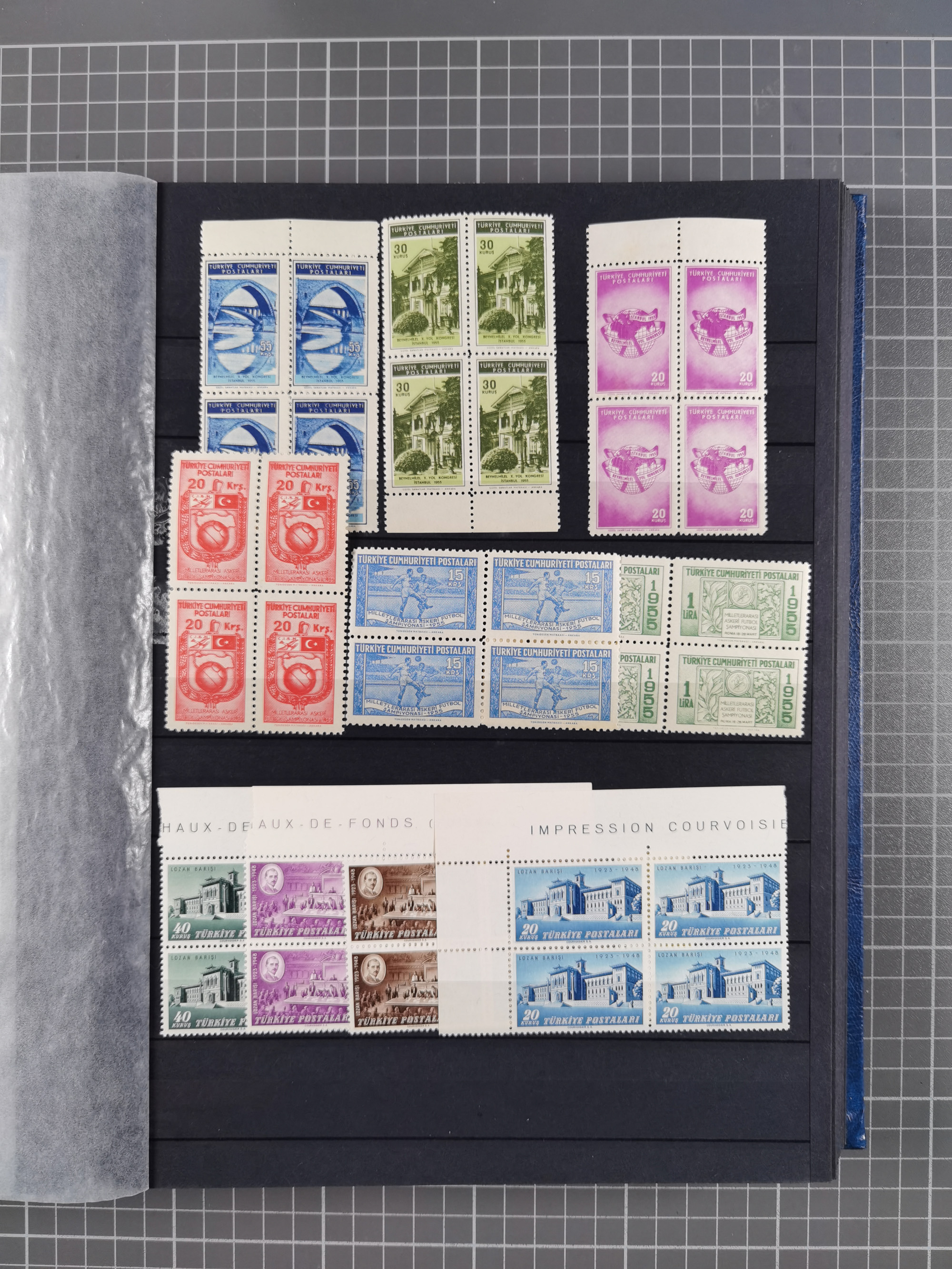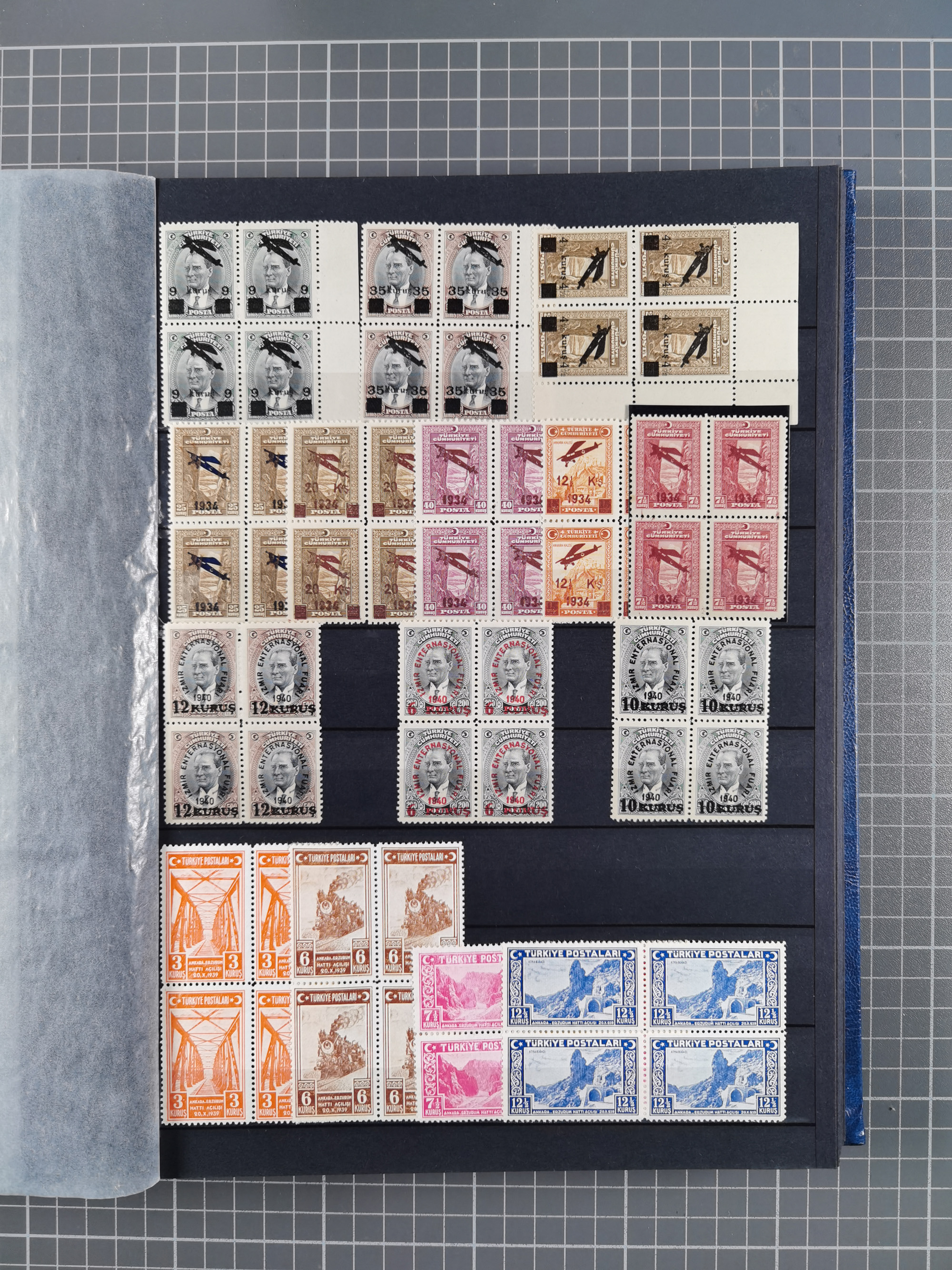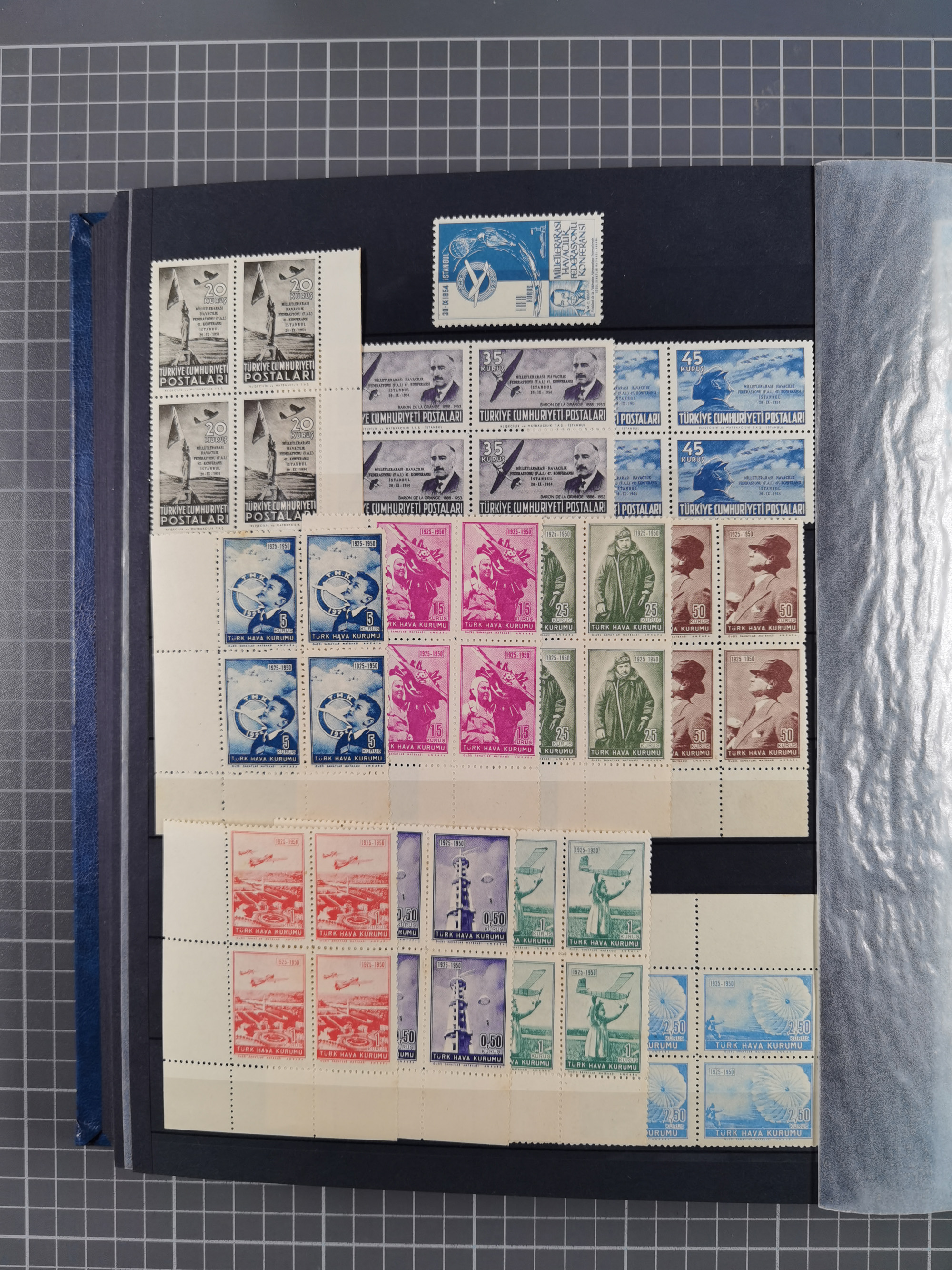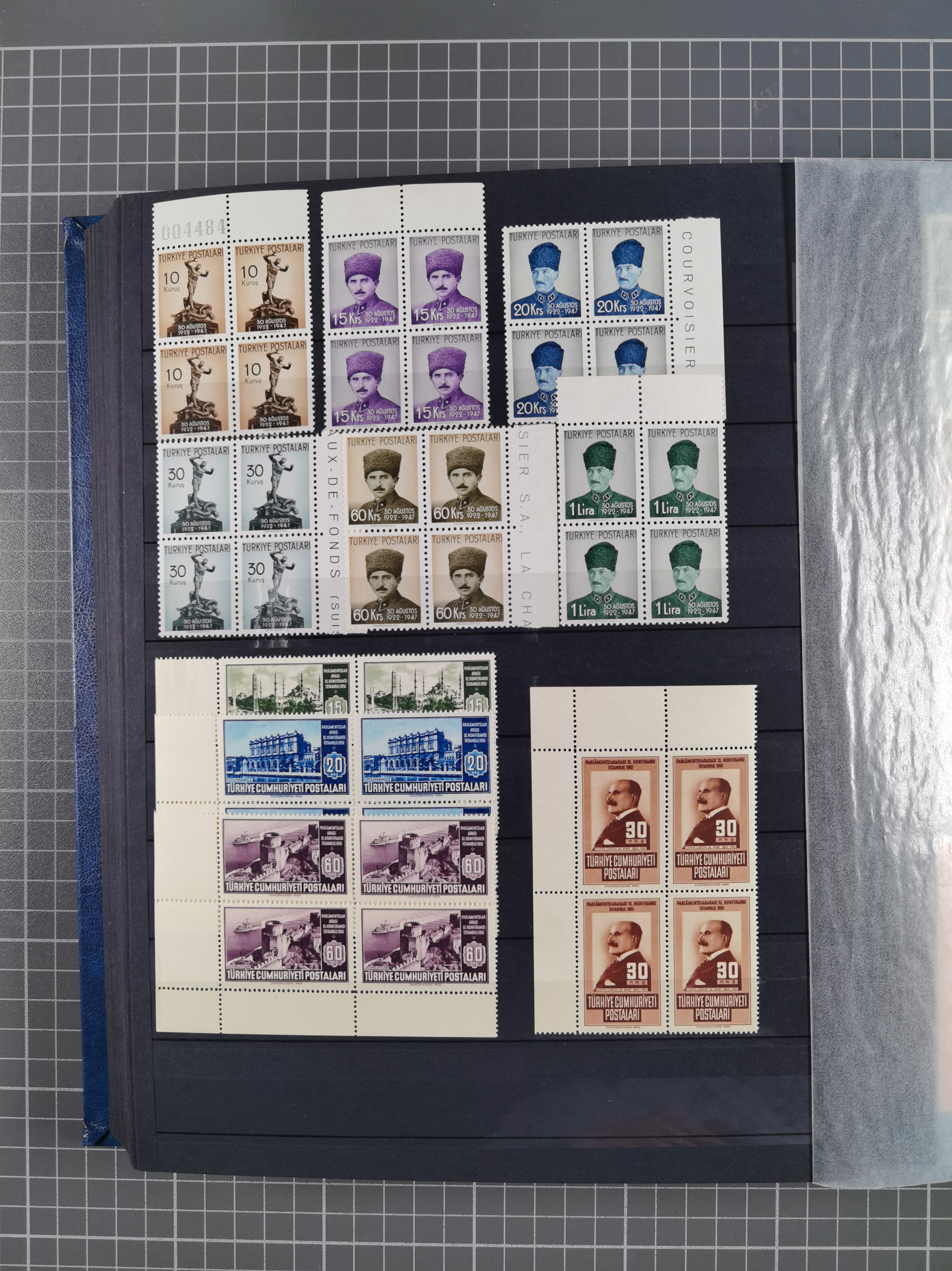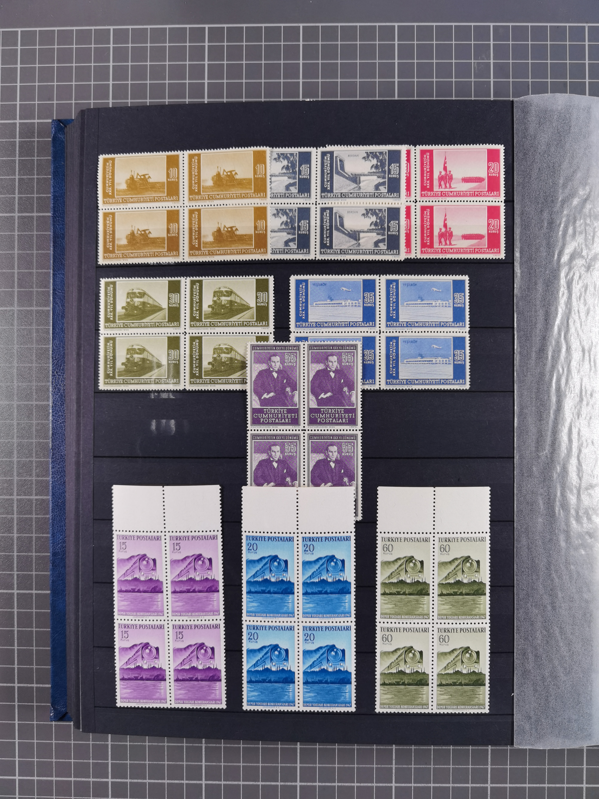 1921/55, valuable holding in stock book with many better issues, often in blocks, some varieties and specialities, containing for instance First Adana set (Mi. 754-66), Crescent issue with 500 pia. green (Mi.825) and Sivas Railway complete sets unused, Women Congress mnh, imperf sets, air mails and official issues in blocks of four, etc. A great lot