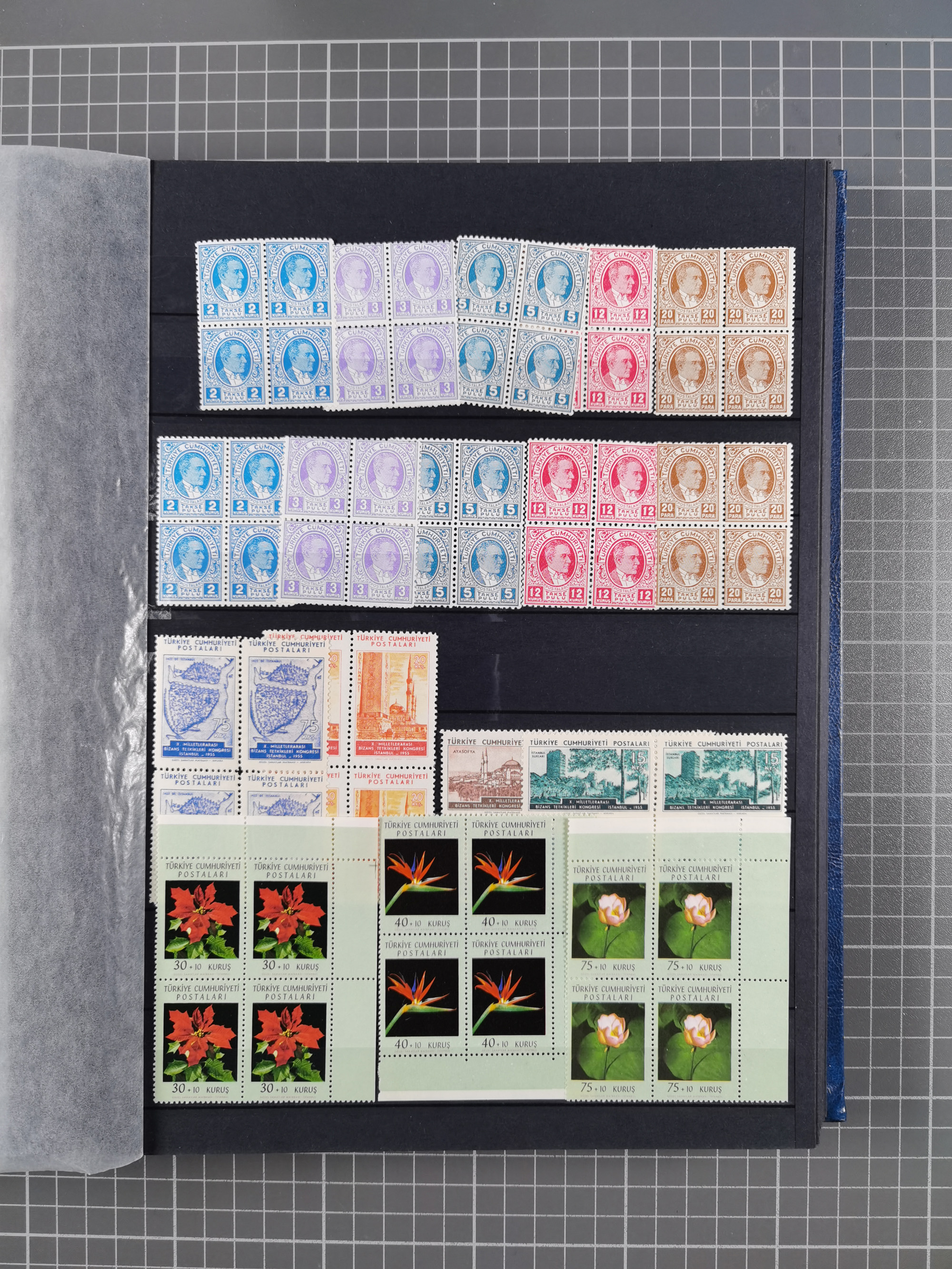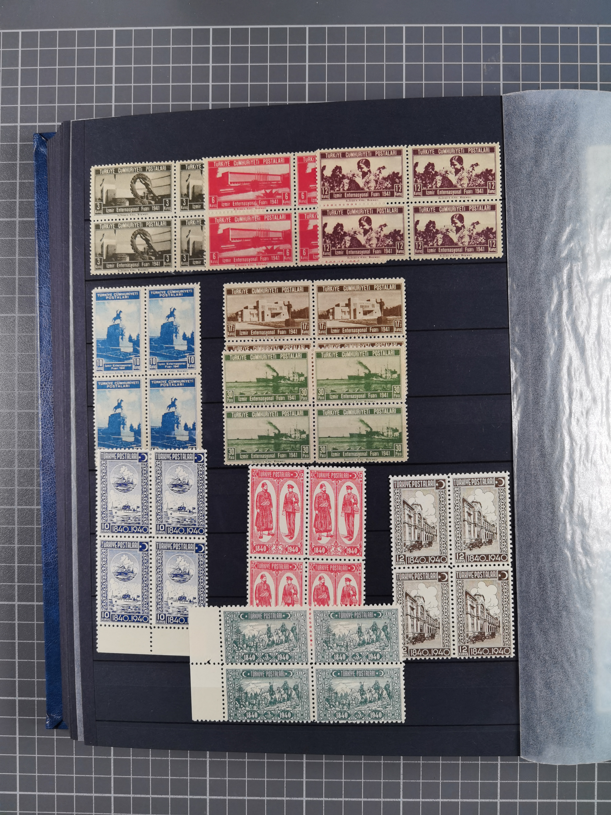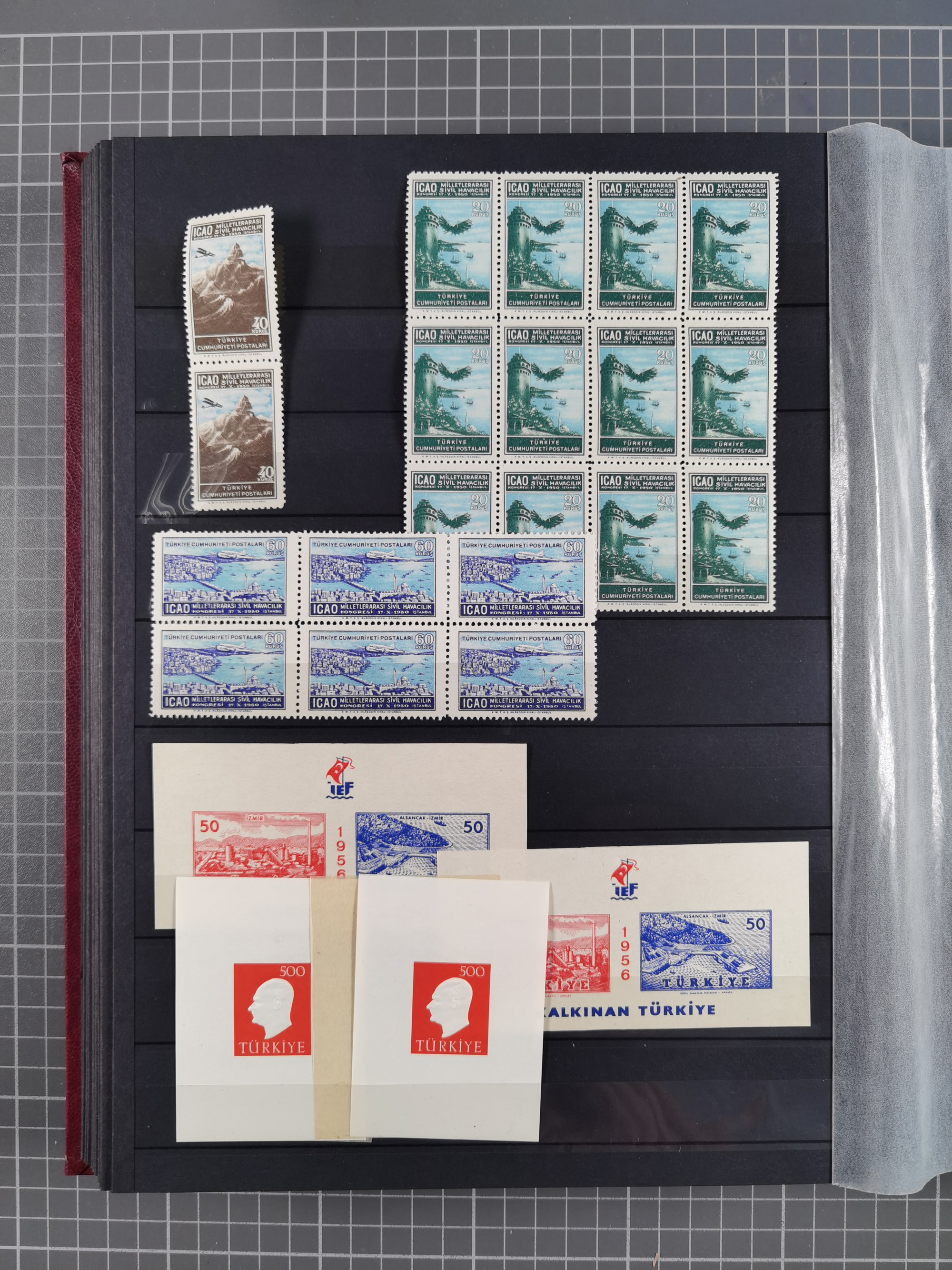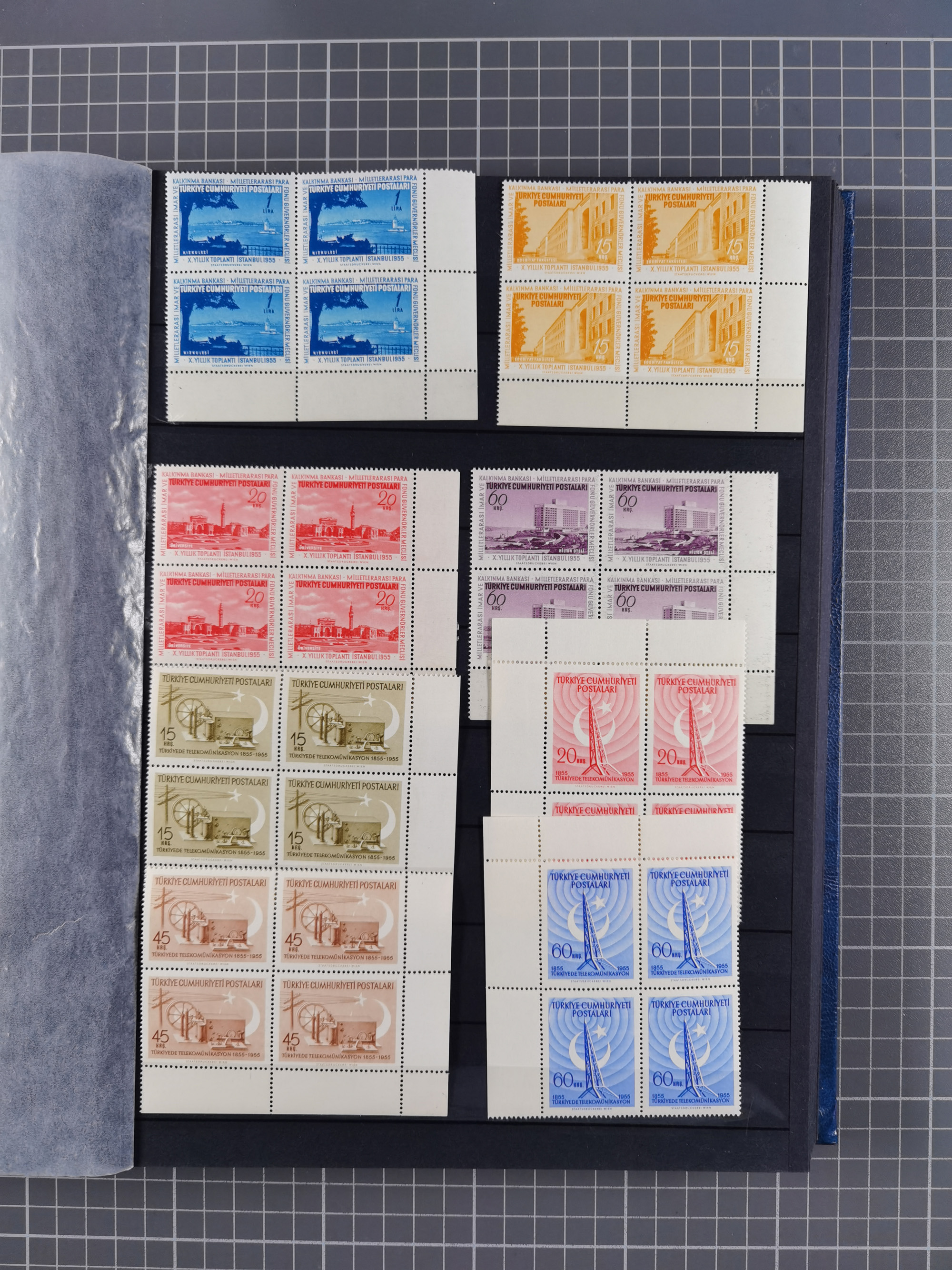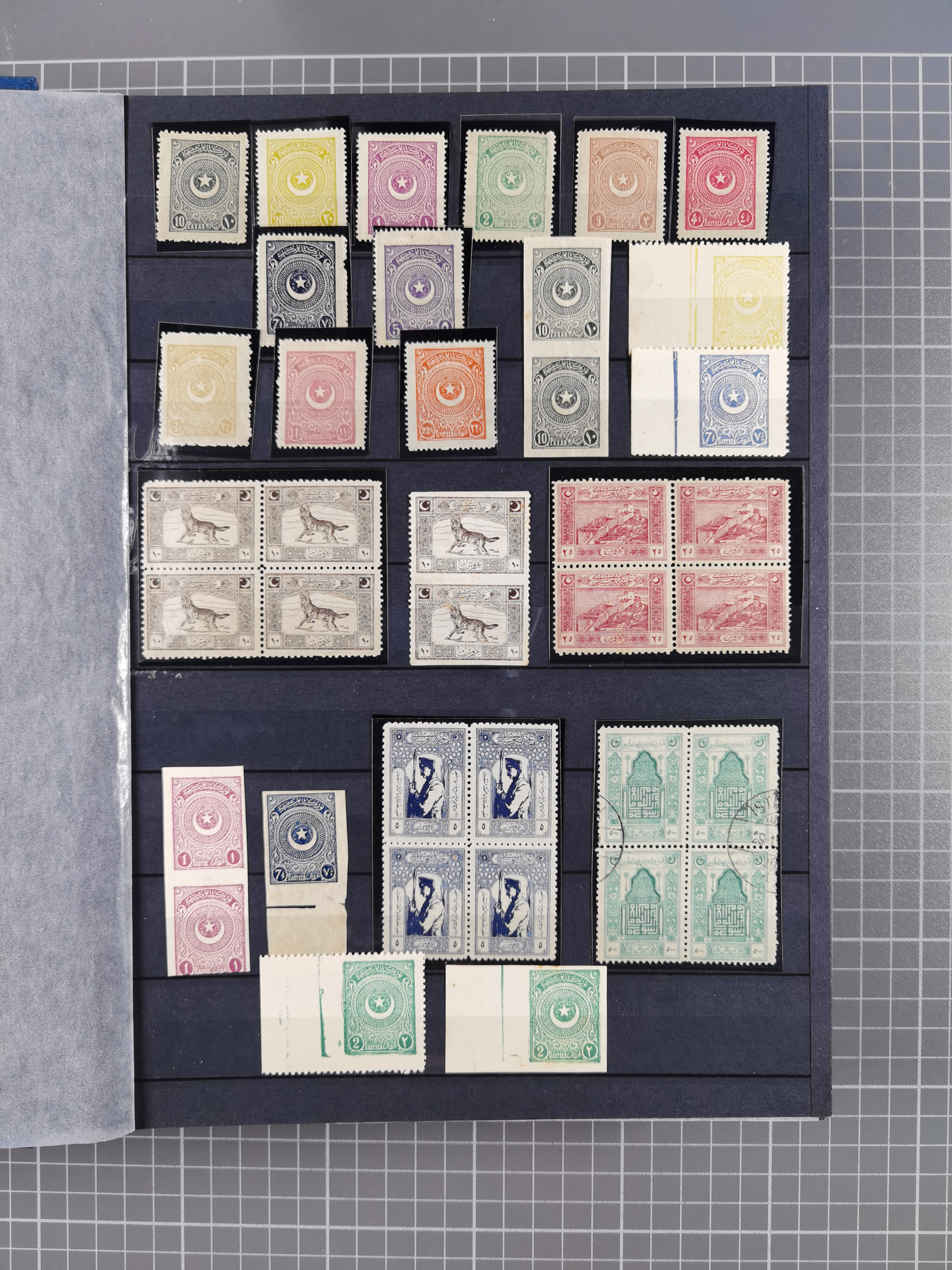 1921/55, valuable holding in stock book with many better issues, often in blocks, some varieties and specialities, containing for instance First Adana set (Mi. 754-66), Crescent issue with 500 pia. green (Mi.825) and Sivas Railway complete sets unused, Women Congress mnh, imperf sets, air mails and official issues in blocks of four, etc. A great lot