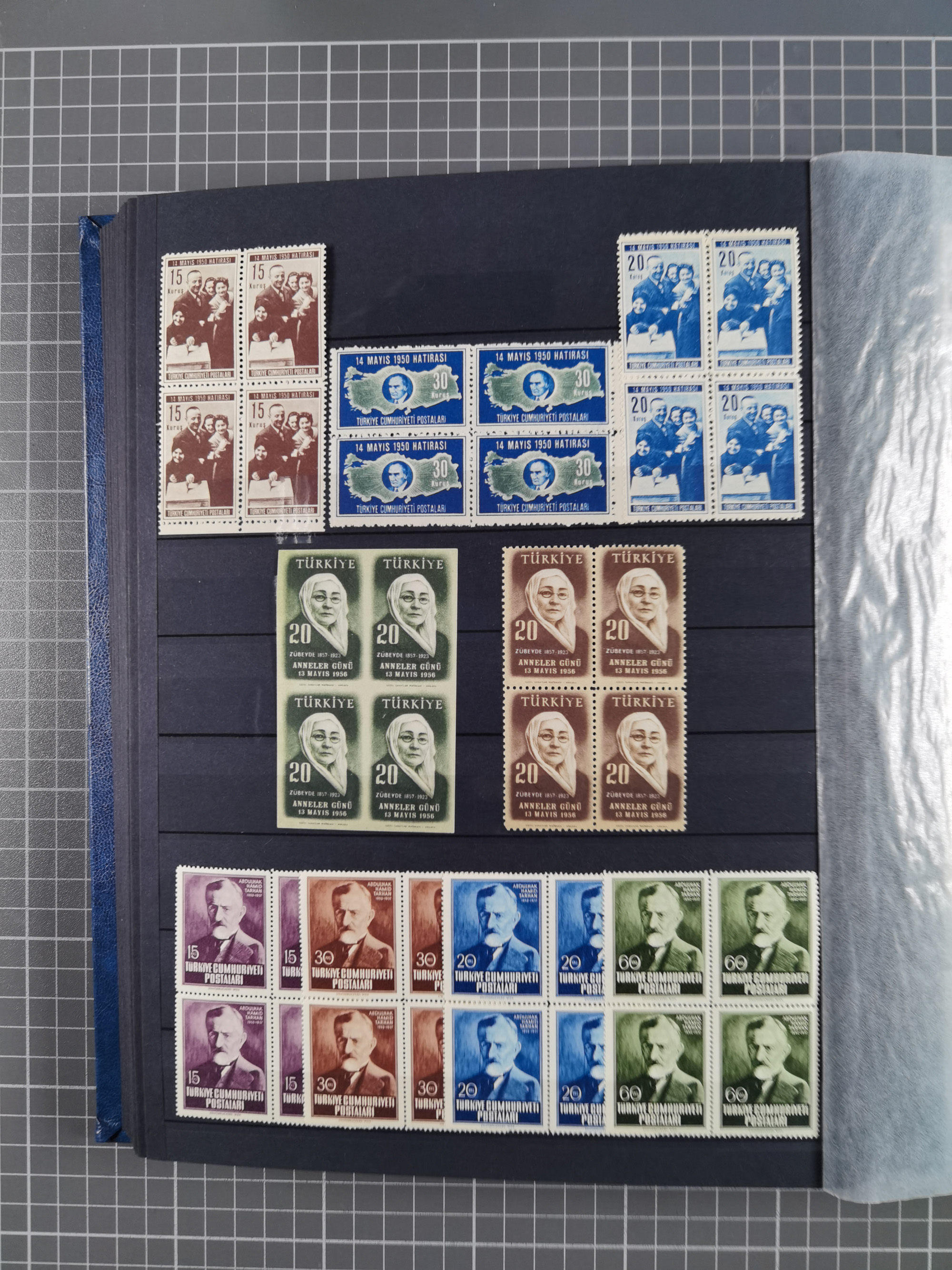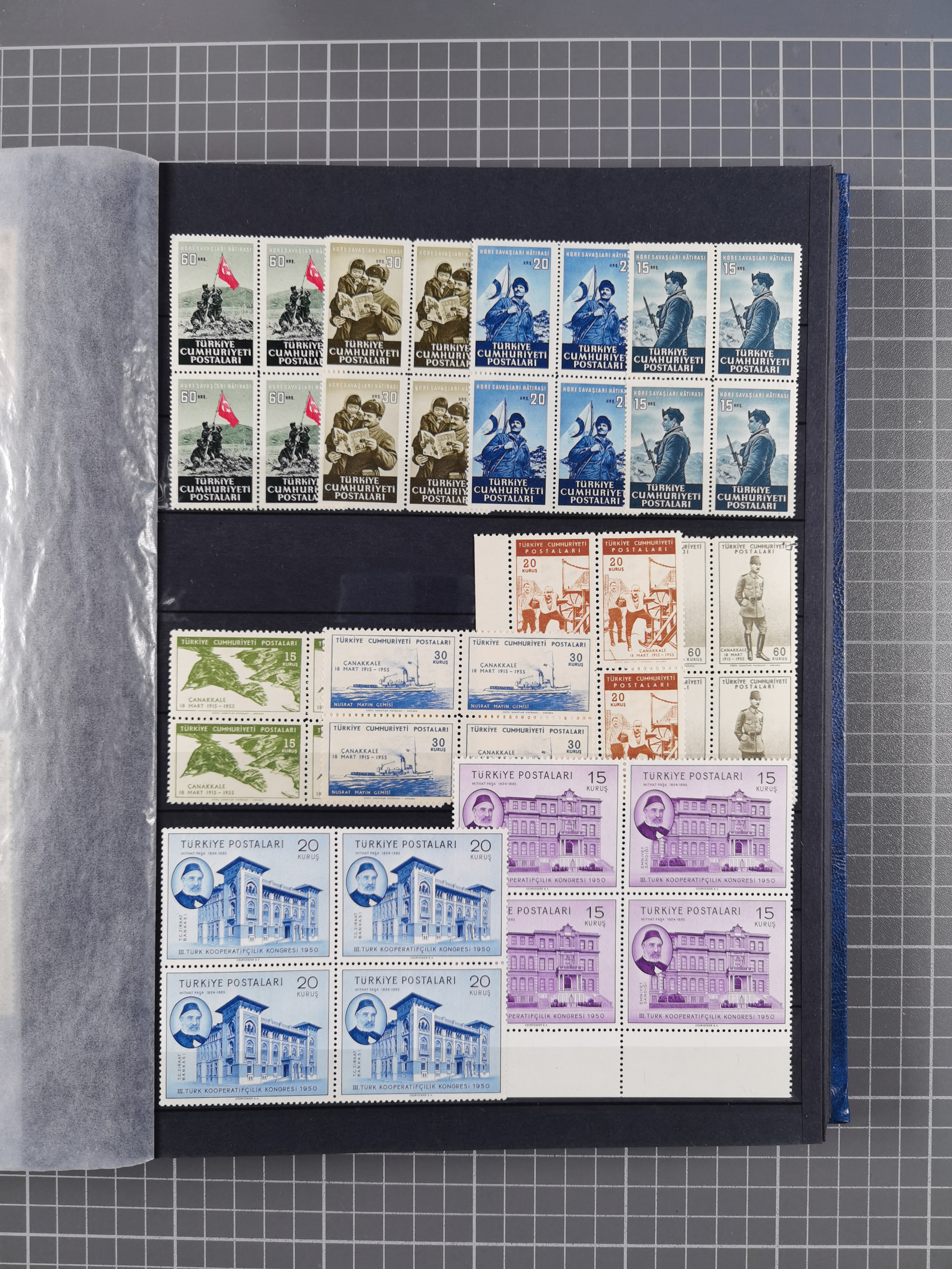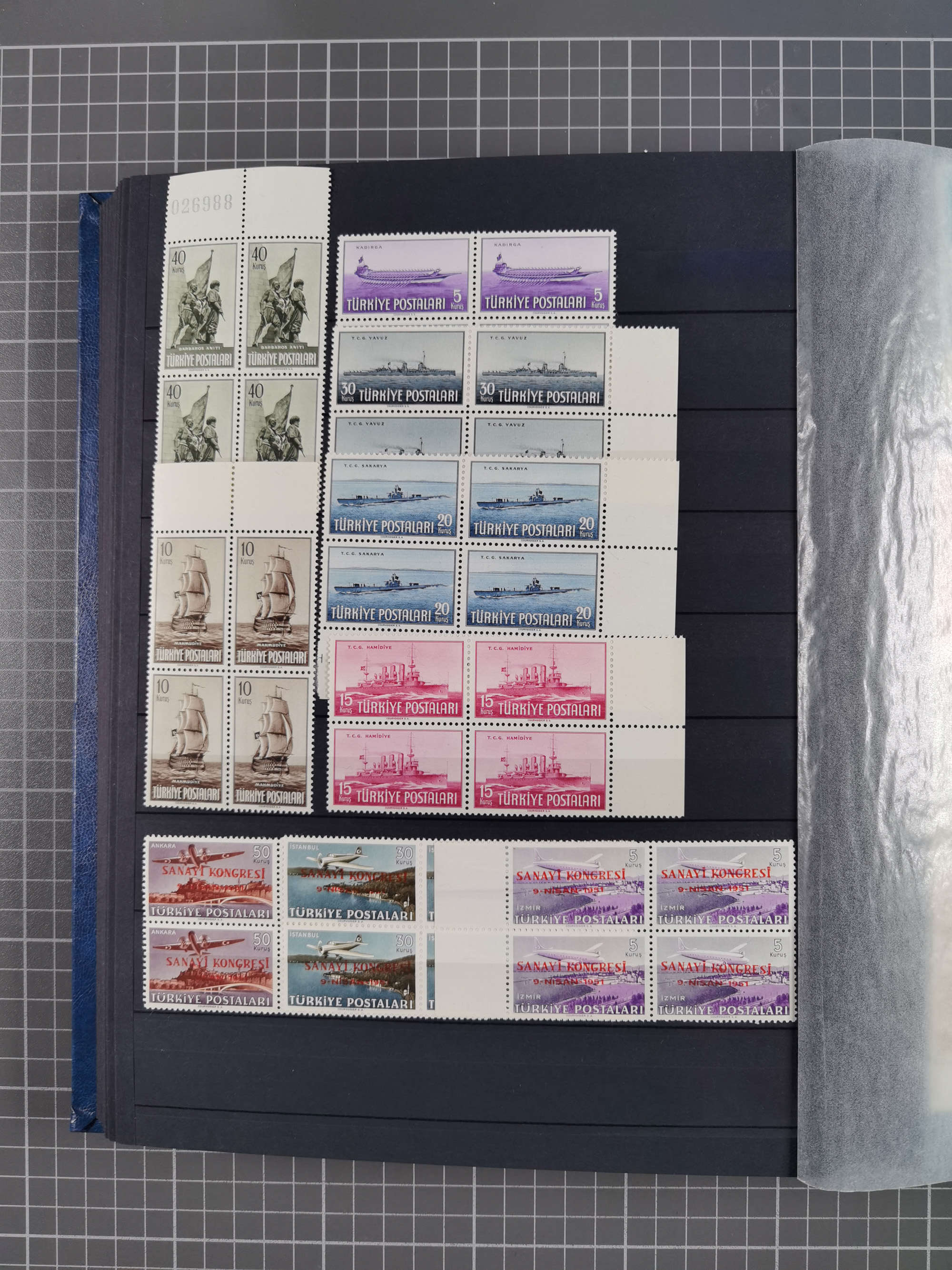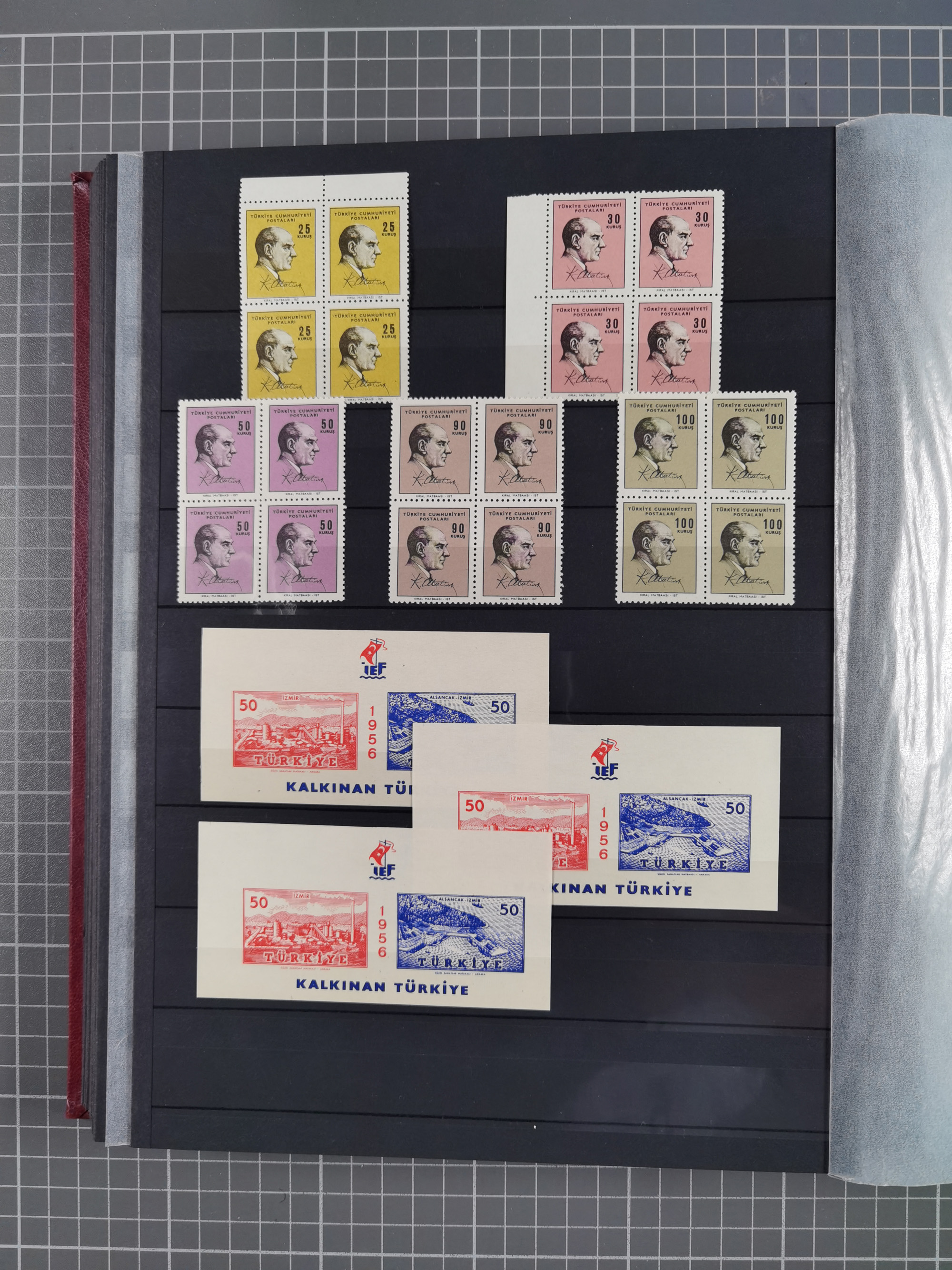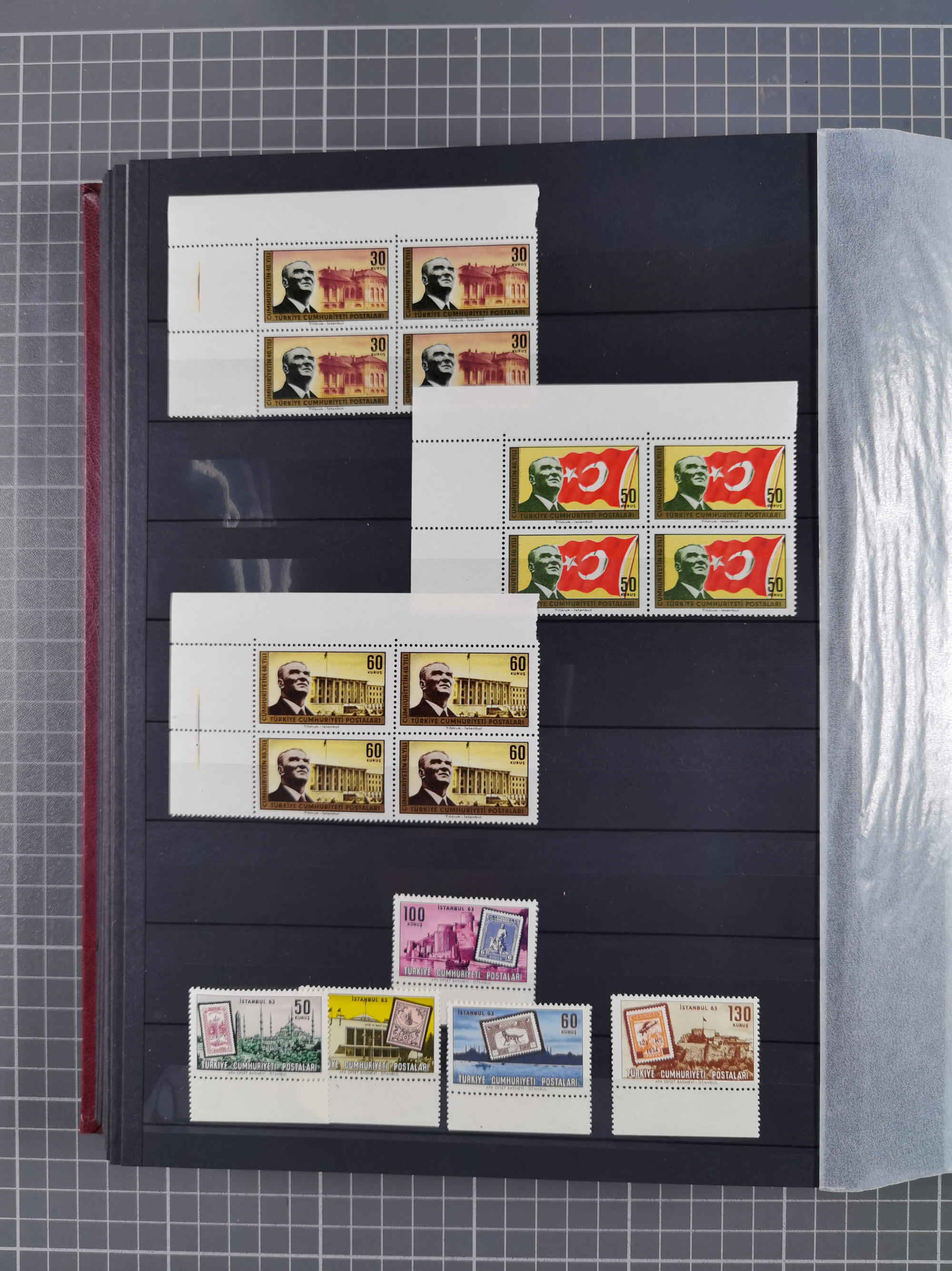 1921/55, valuable holding in stock book with many better issues, often in blocks, some varieties and specialities, containing for instance First Adana set (Mi. 754-66), Crescent issue with 500 pia. green (Mi.825) and Sivas Railway complete sets unused, Women Congress mnh, imperf sets, air mails and official issues in blocks of four, etc. A great lot