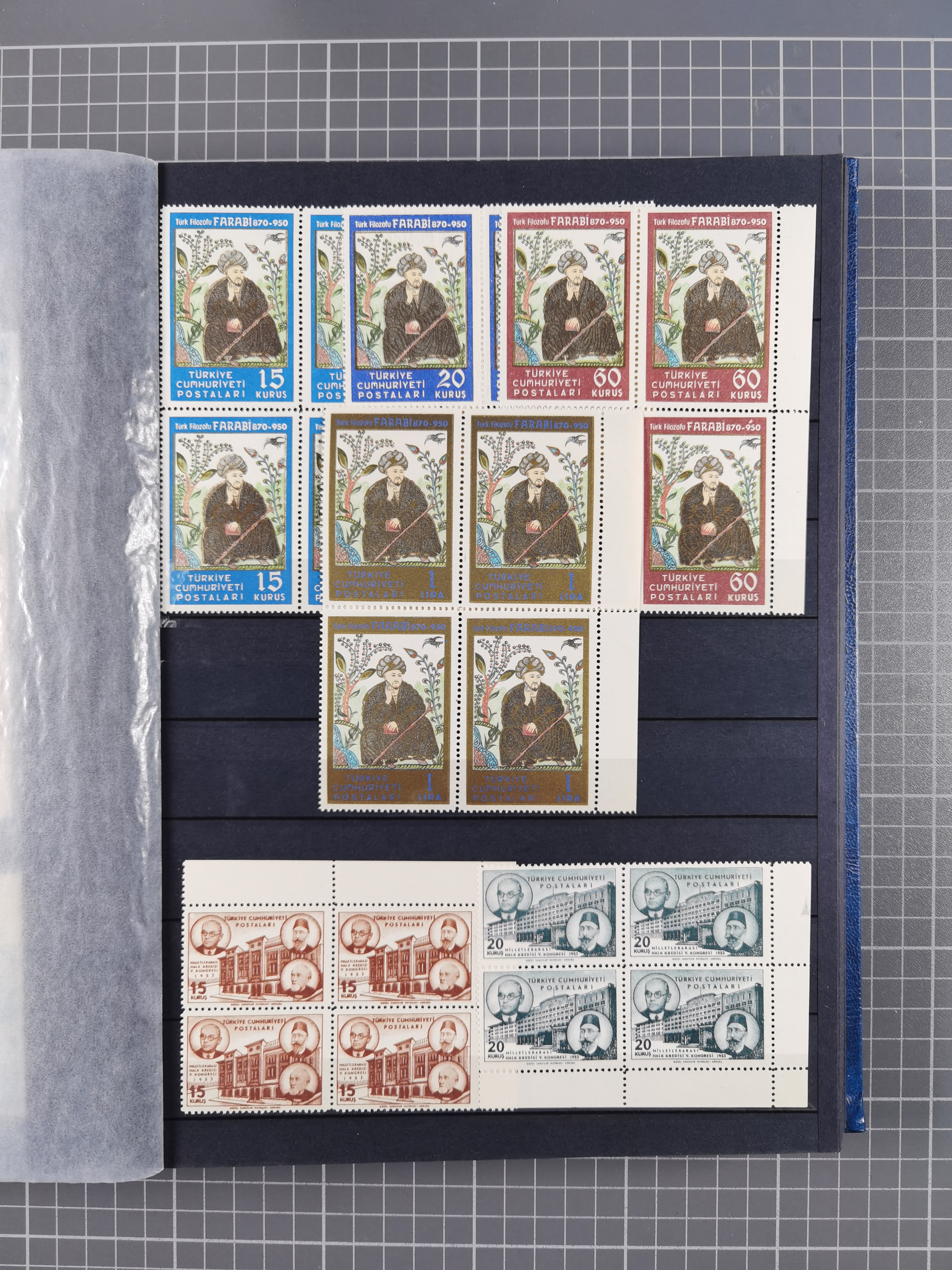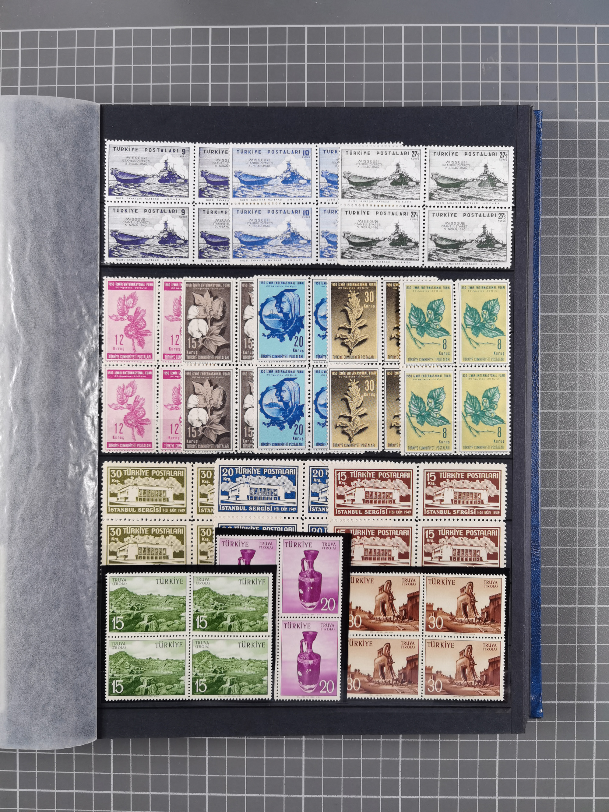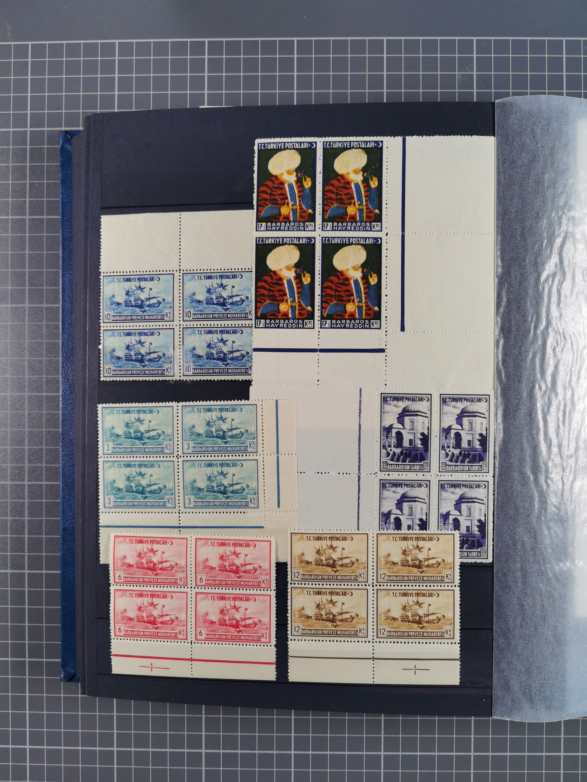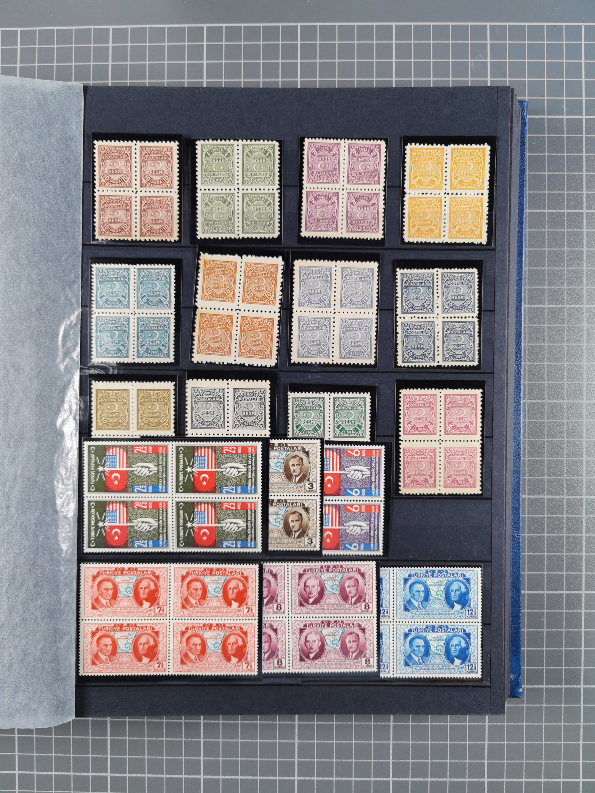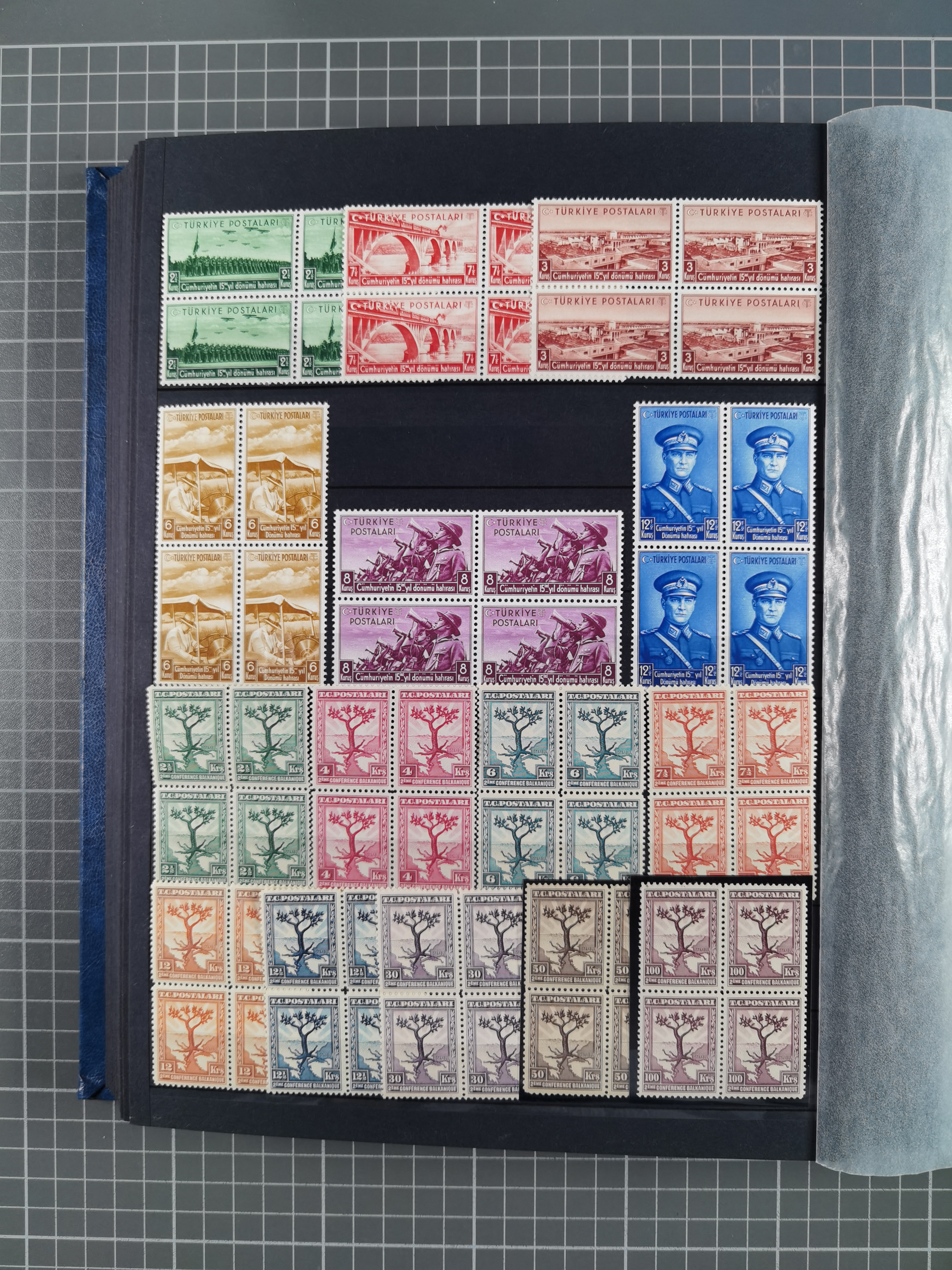 1921/55, valuable holding in stock book with many better issues, often in blocks, some varieties and specialities, containing for instance First Adana set (Mi. 754-66), Crescent issue with 500 pia. green (Mi.825) and Sivas Railway complete sets unused, Women Congress mnh, imperf sets, air mails and official issues in blocks of four, etc. A great lot
