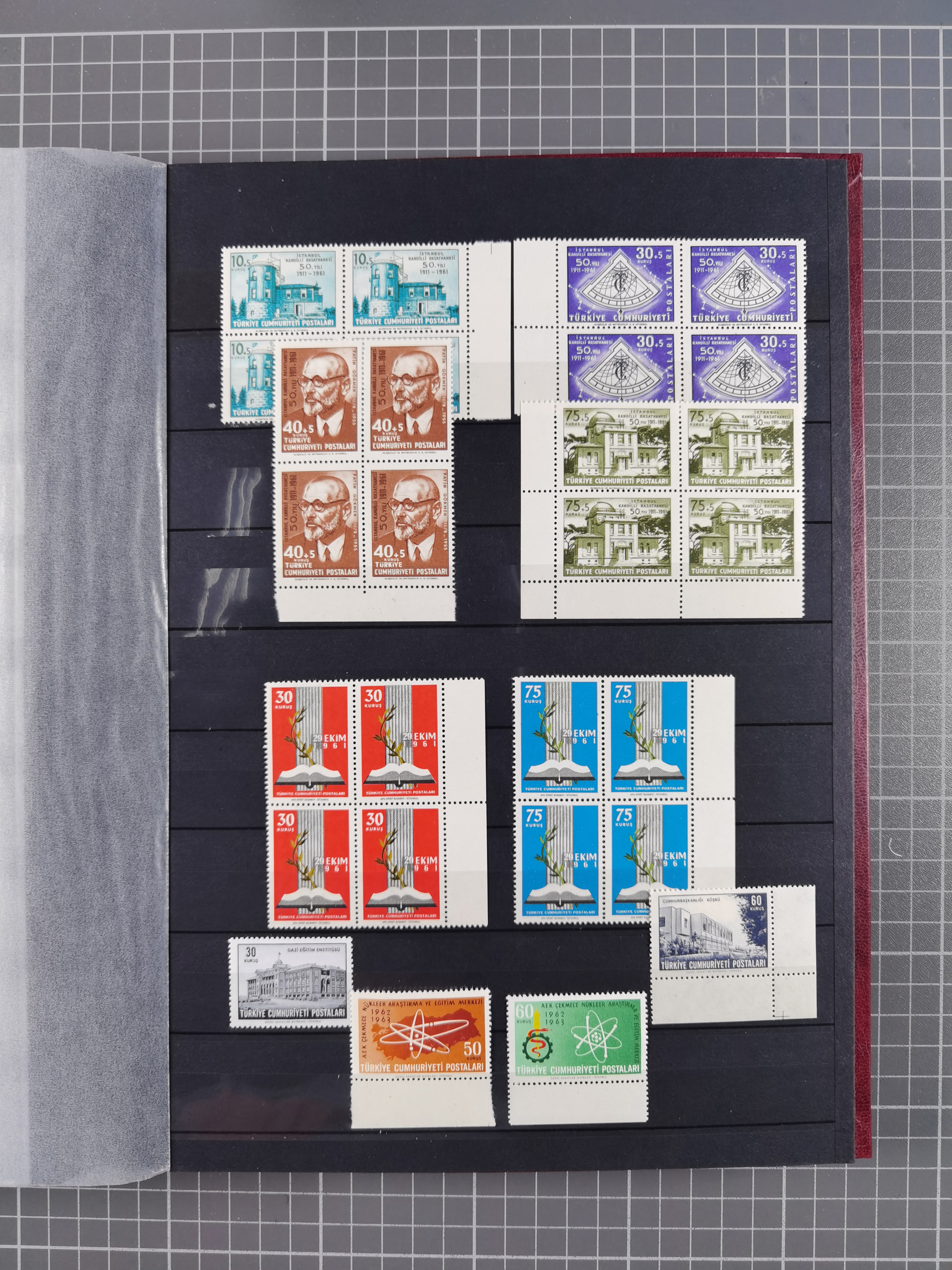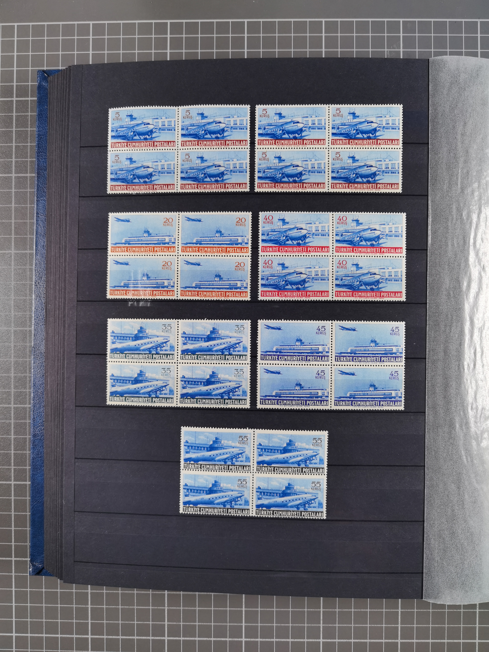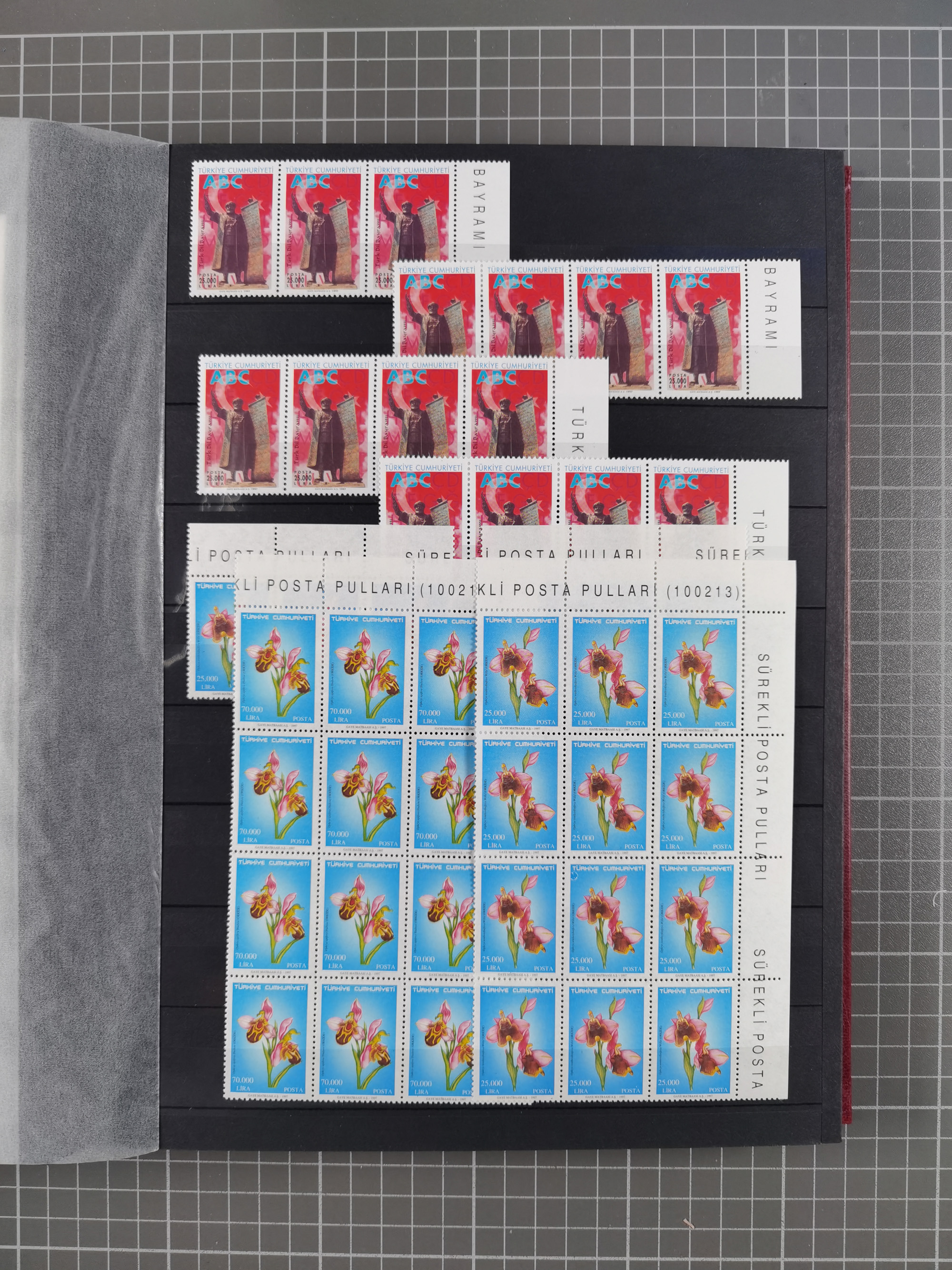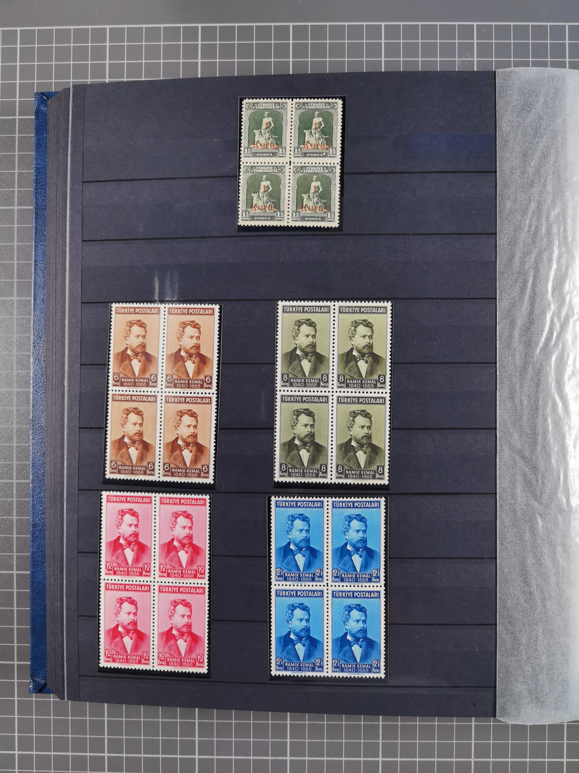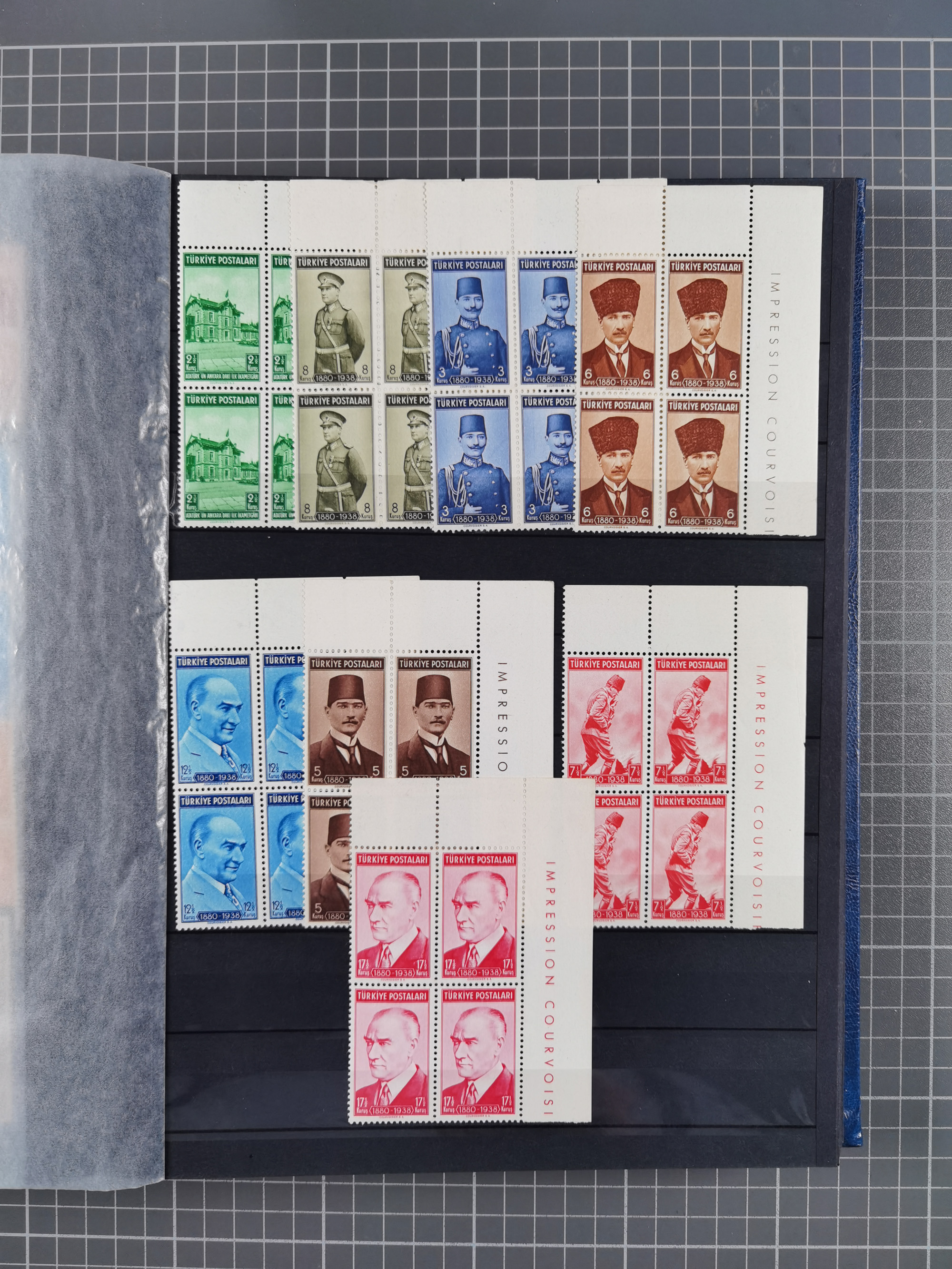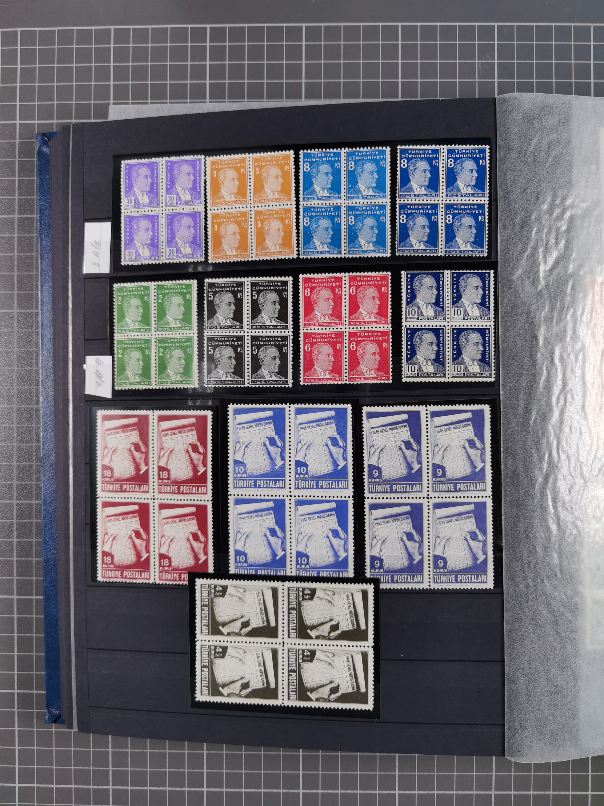 1921/55, valuable holding in stock book with many better issues, often in blocks, some varieties and specialities, containing for instance First Adana set (Mi. 754-66), Crescent issue with 500 pia. green (Mi.825) and Sivas Railway complete sets unused, Women Congress mnh, imperf sets, air mails and official issues in blocks of four, etc. A great lot