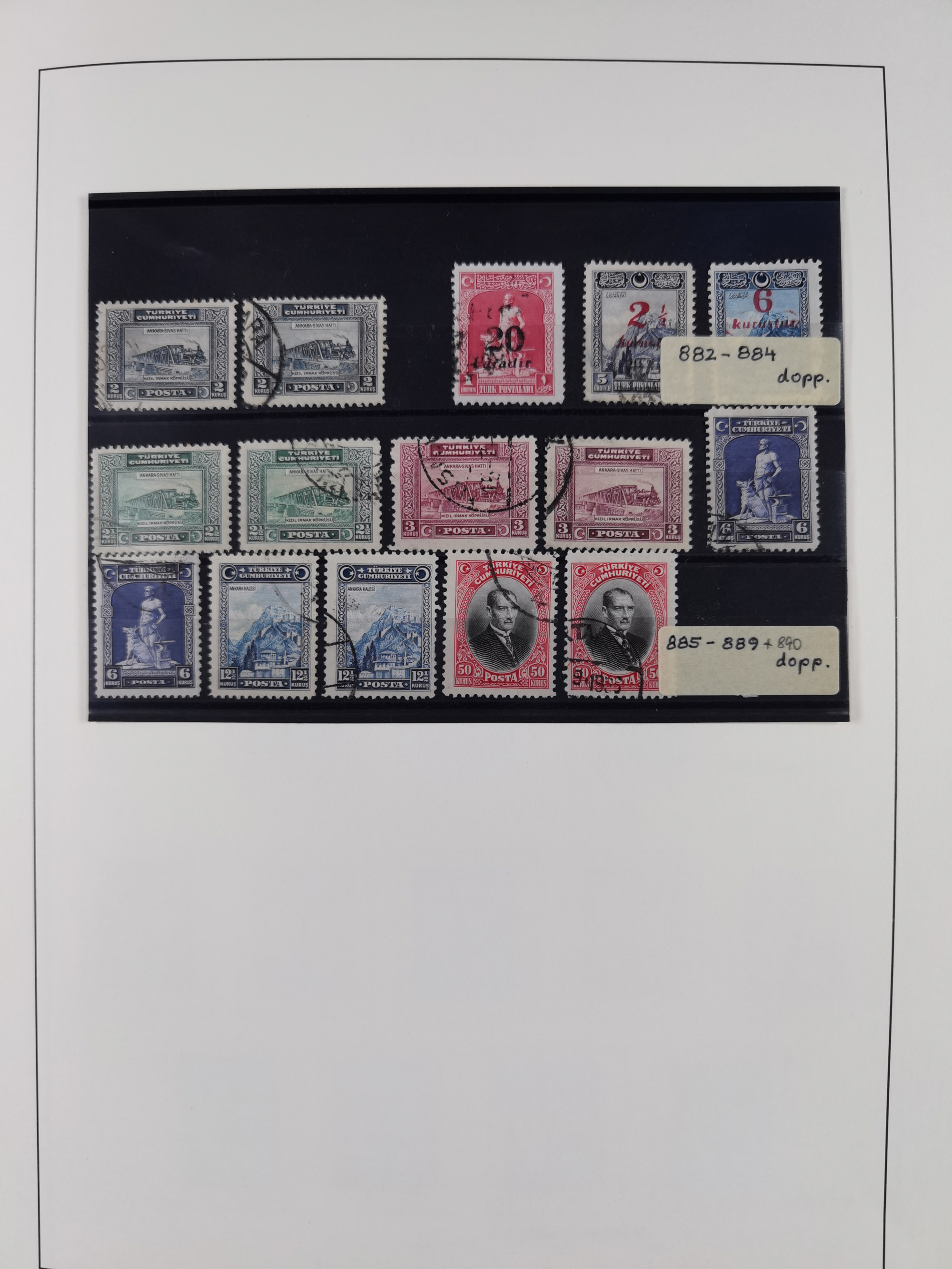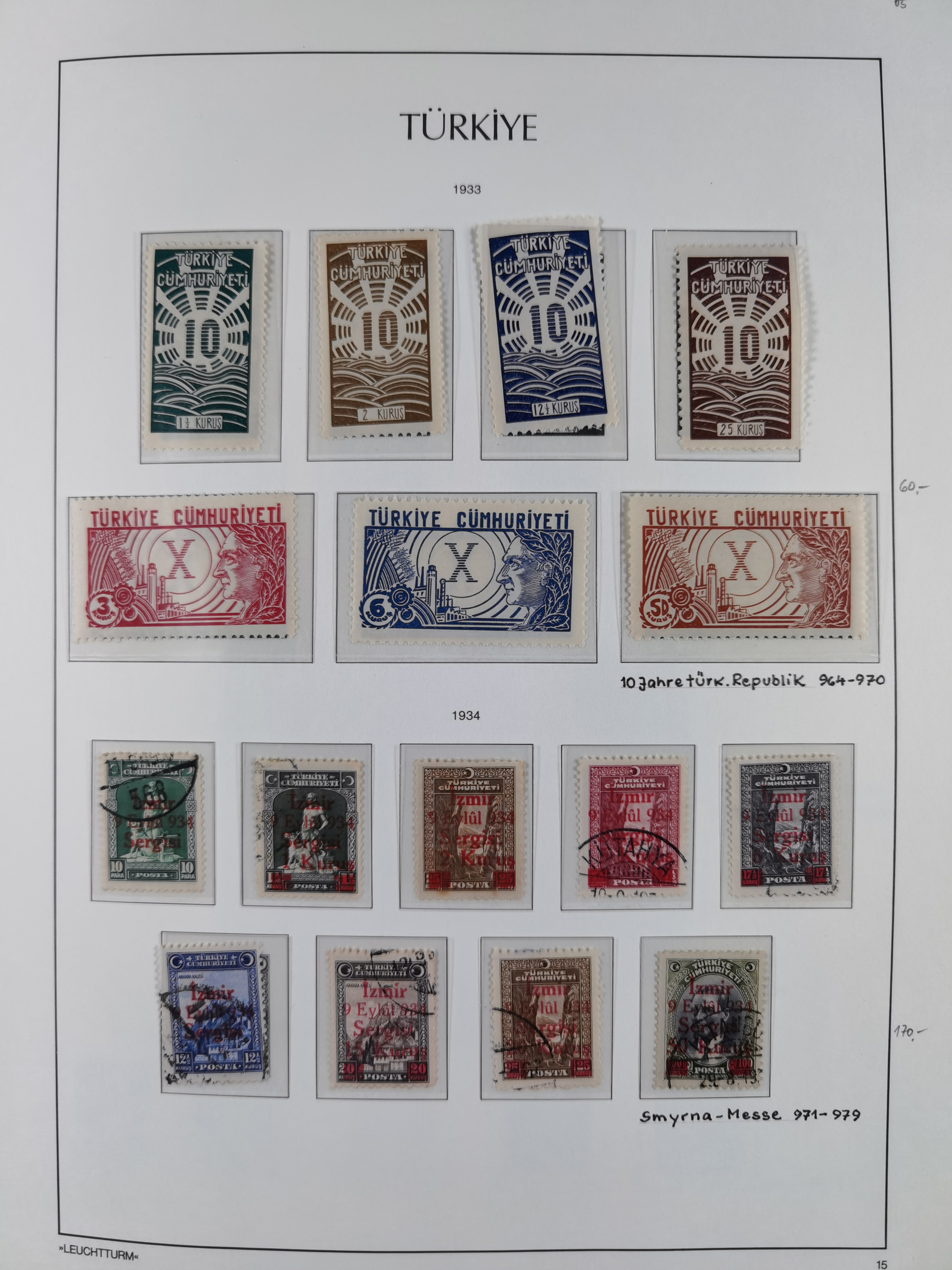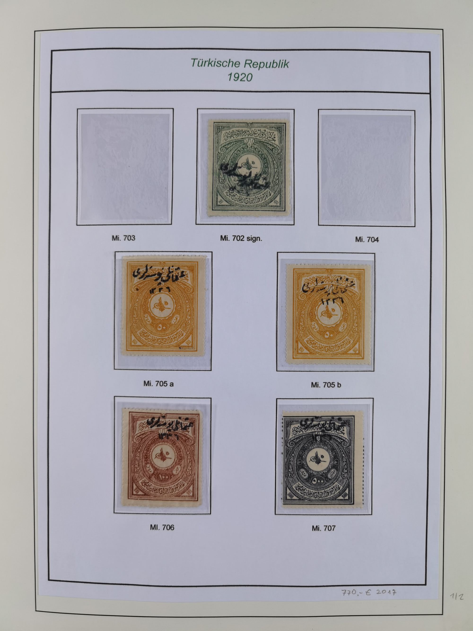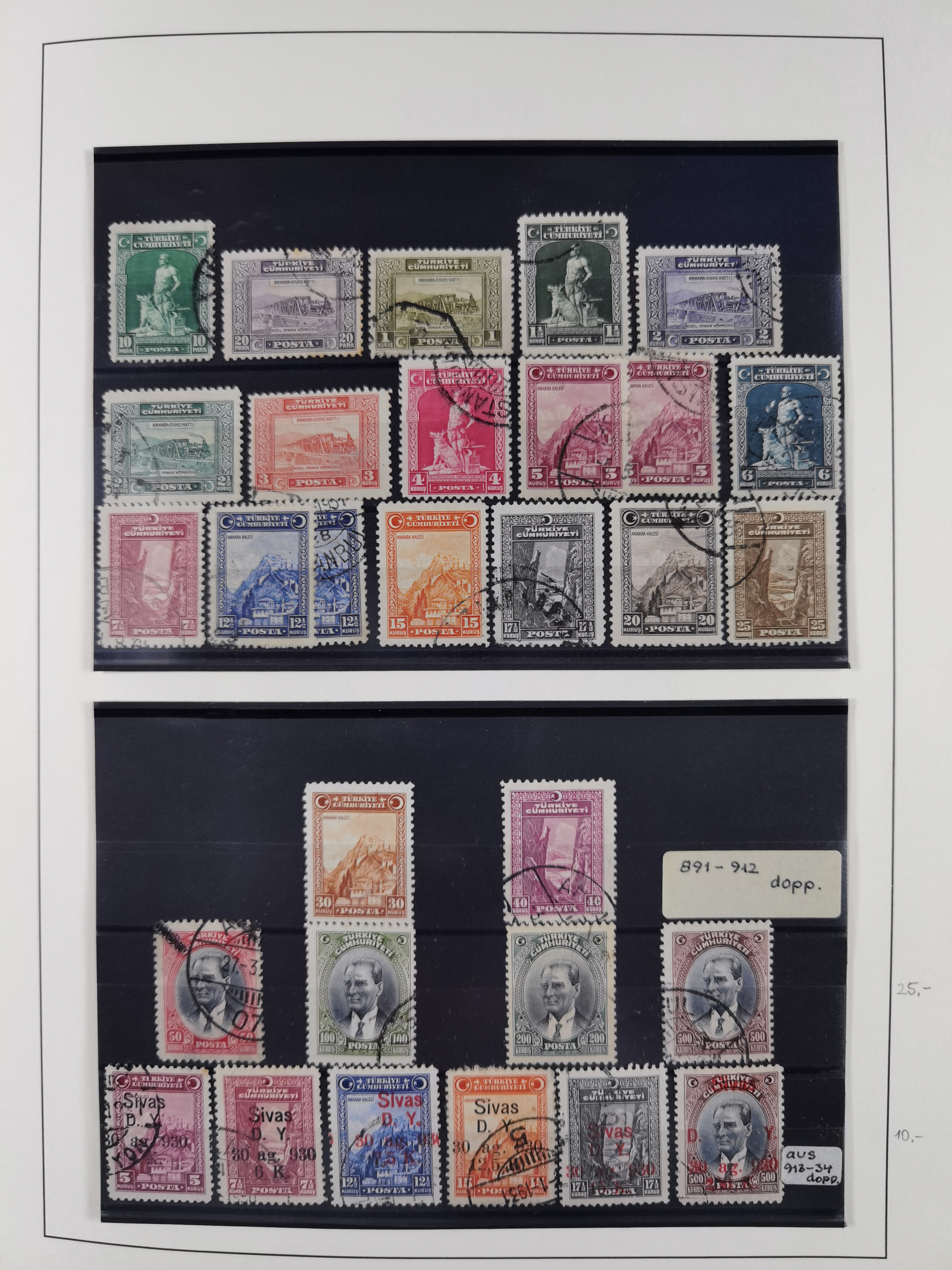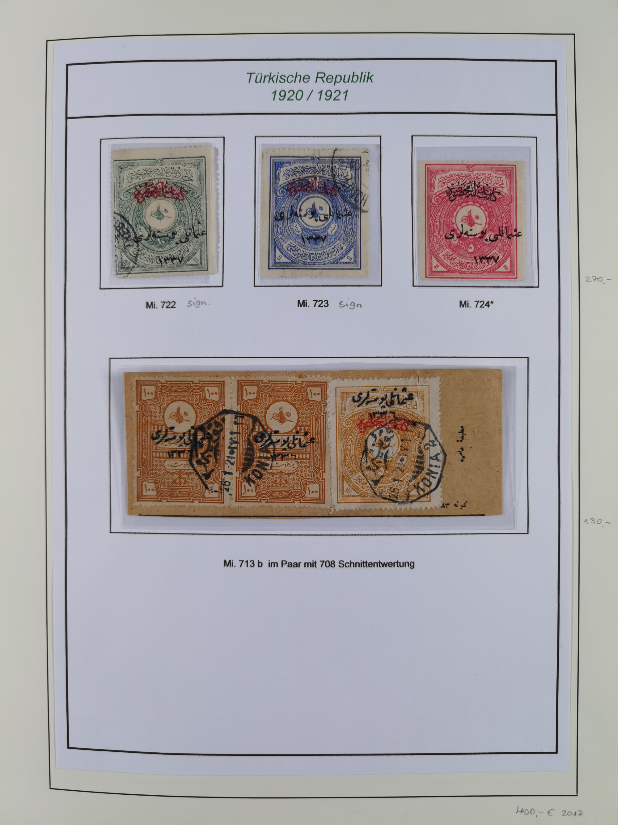 1920/69, mostly unused/mint and cancelled collection ‘Republic of Turkey’ in album with some better and complete issues Angora Government (Mi.705-708, 714-15, A721, 728H inverted and double), as well as some special items, including Mi. No. 754-766 unused (better signed or cert.), Sivas Railway (Mi. 913-934) unused. Many better stamps signed, condition from slightly flawed to flawless.
