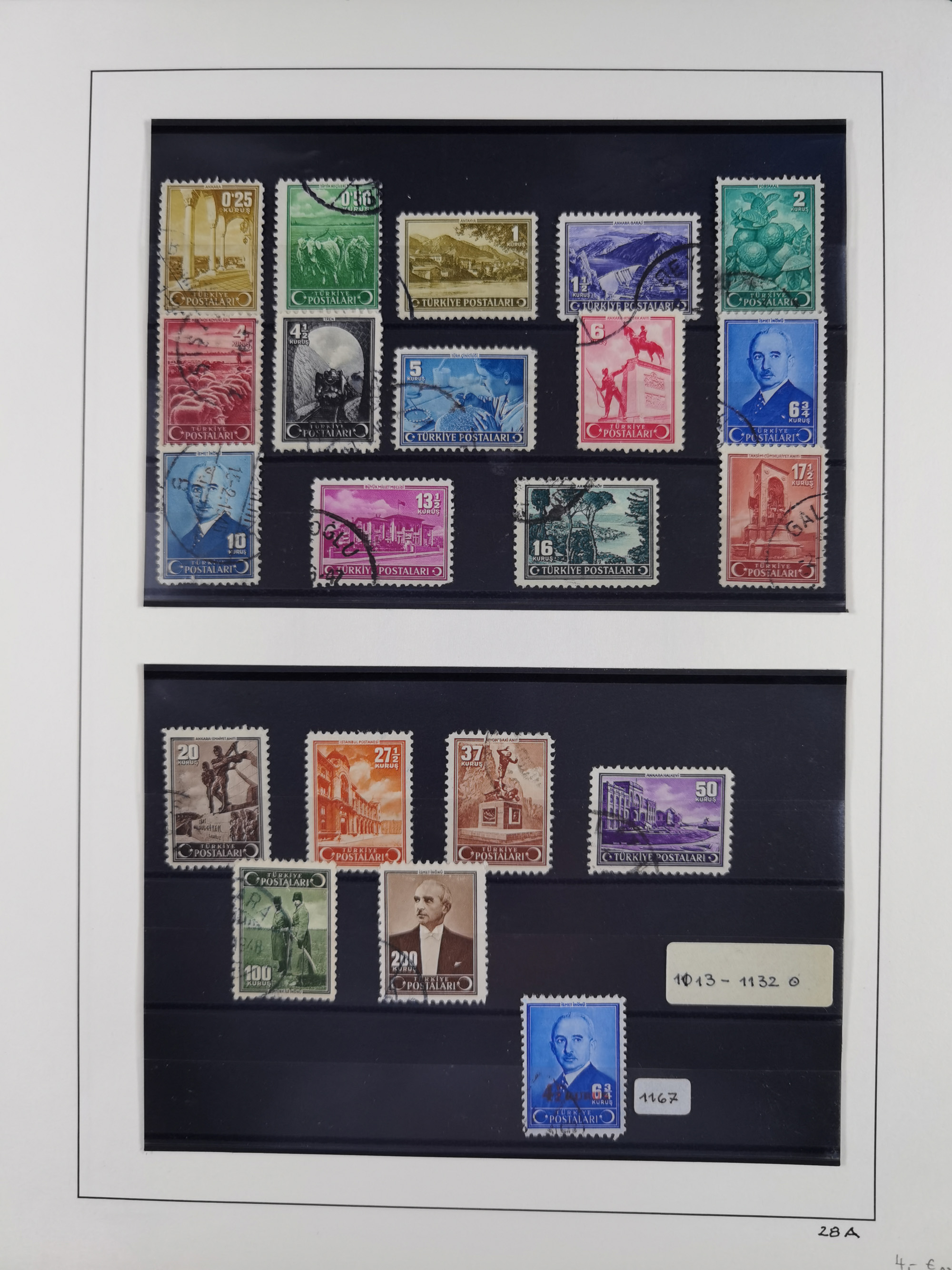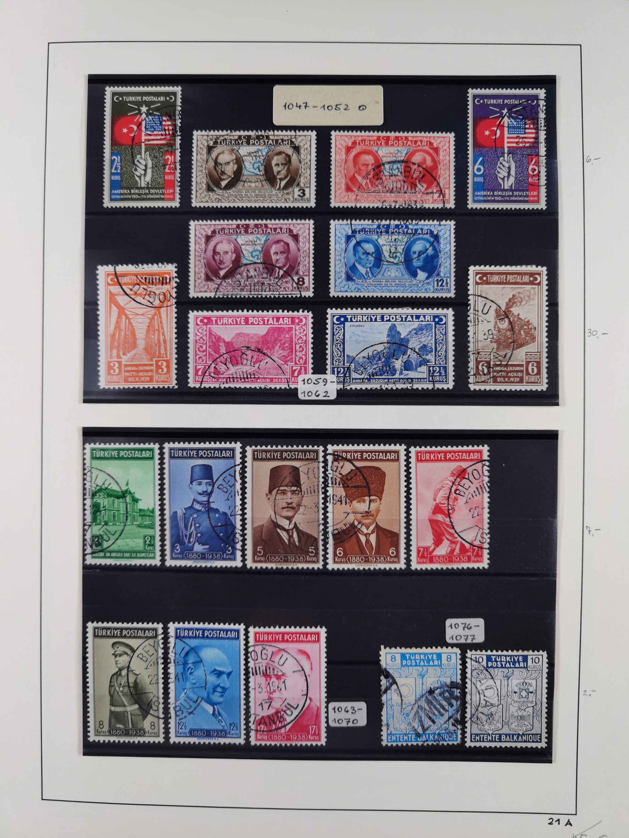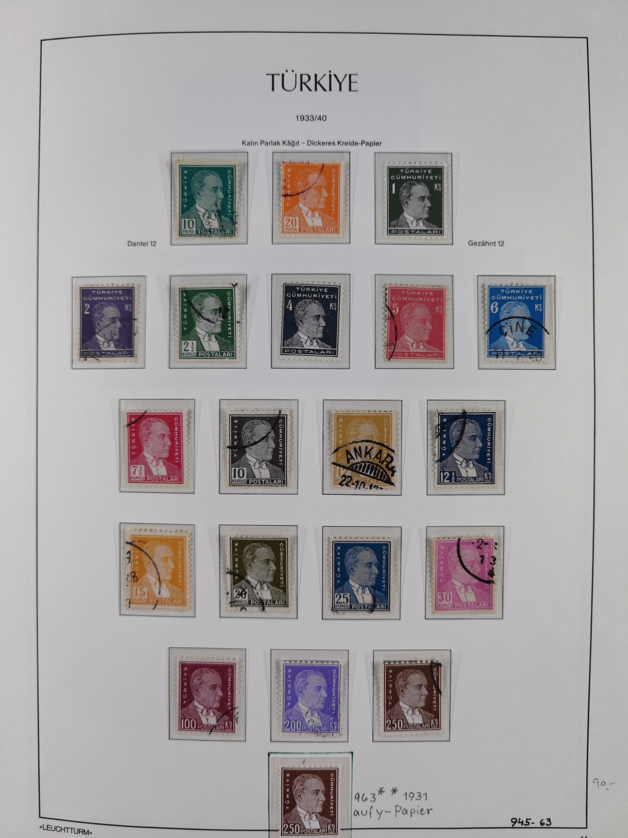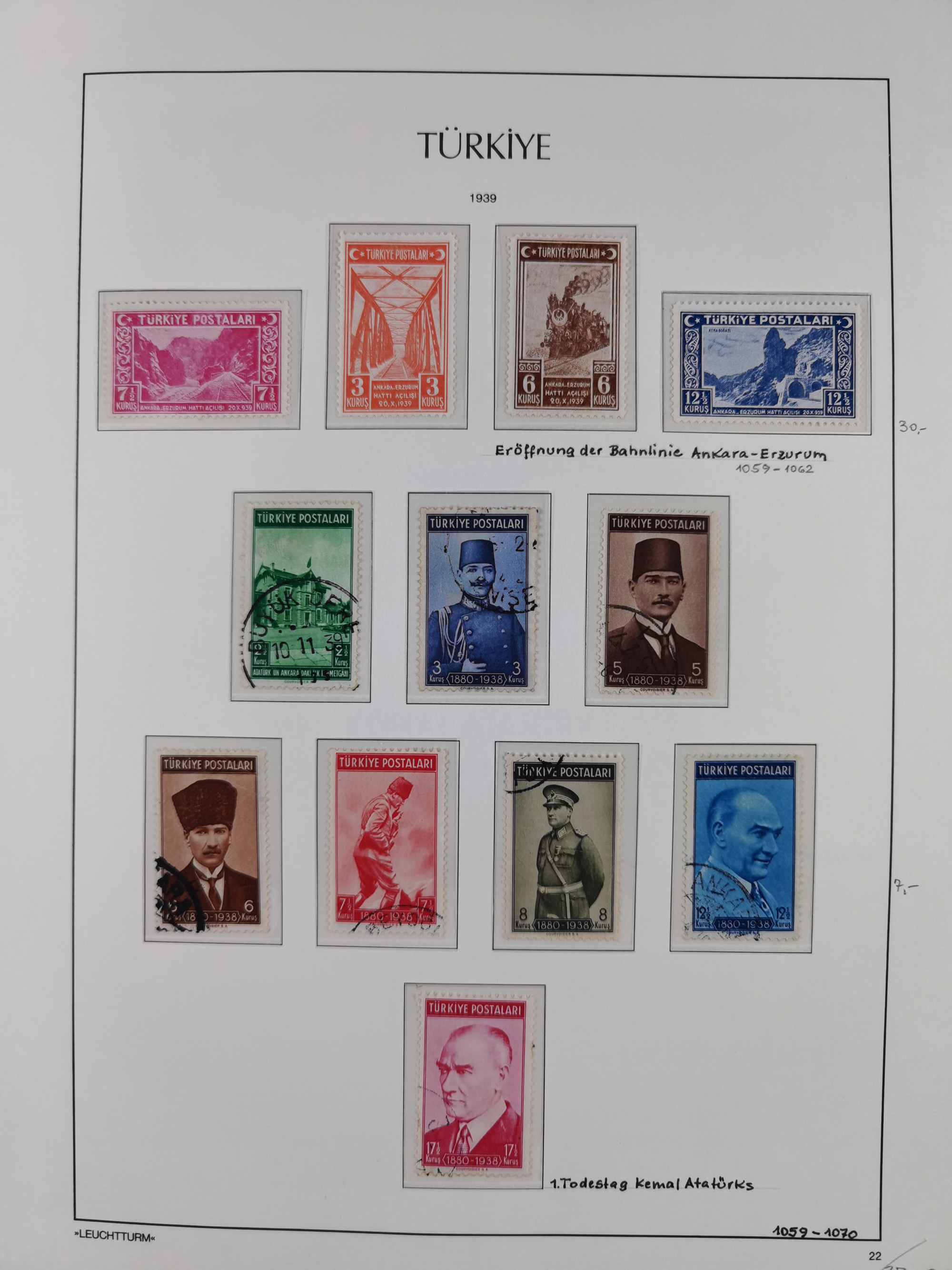 1920/69, mostly unused/mint and cancelled collection ‘Republic of Turkey’ in album with some better and complete issues Angora Government (Mi.705-708, 714-15, A721, 728H inverted and double), as well as some special items, including Mi. No. 754-766 unused (better signed or cert.), Sivas Railway (Mi. 913-934) unused. Many better stamps signed, condition from slightly flawed to flawless.