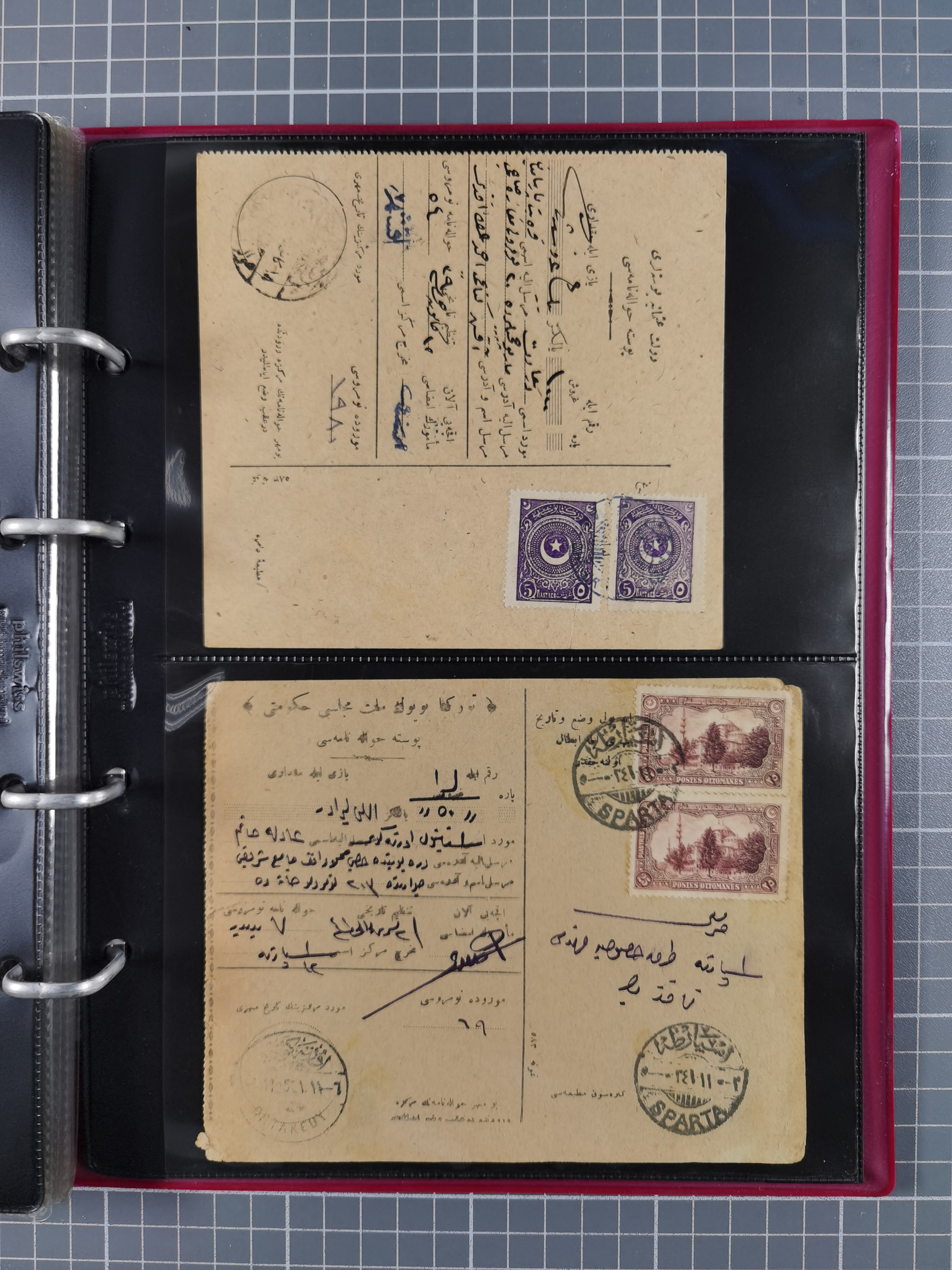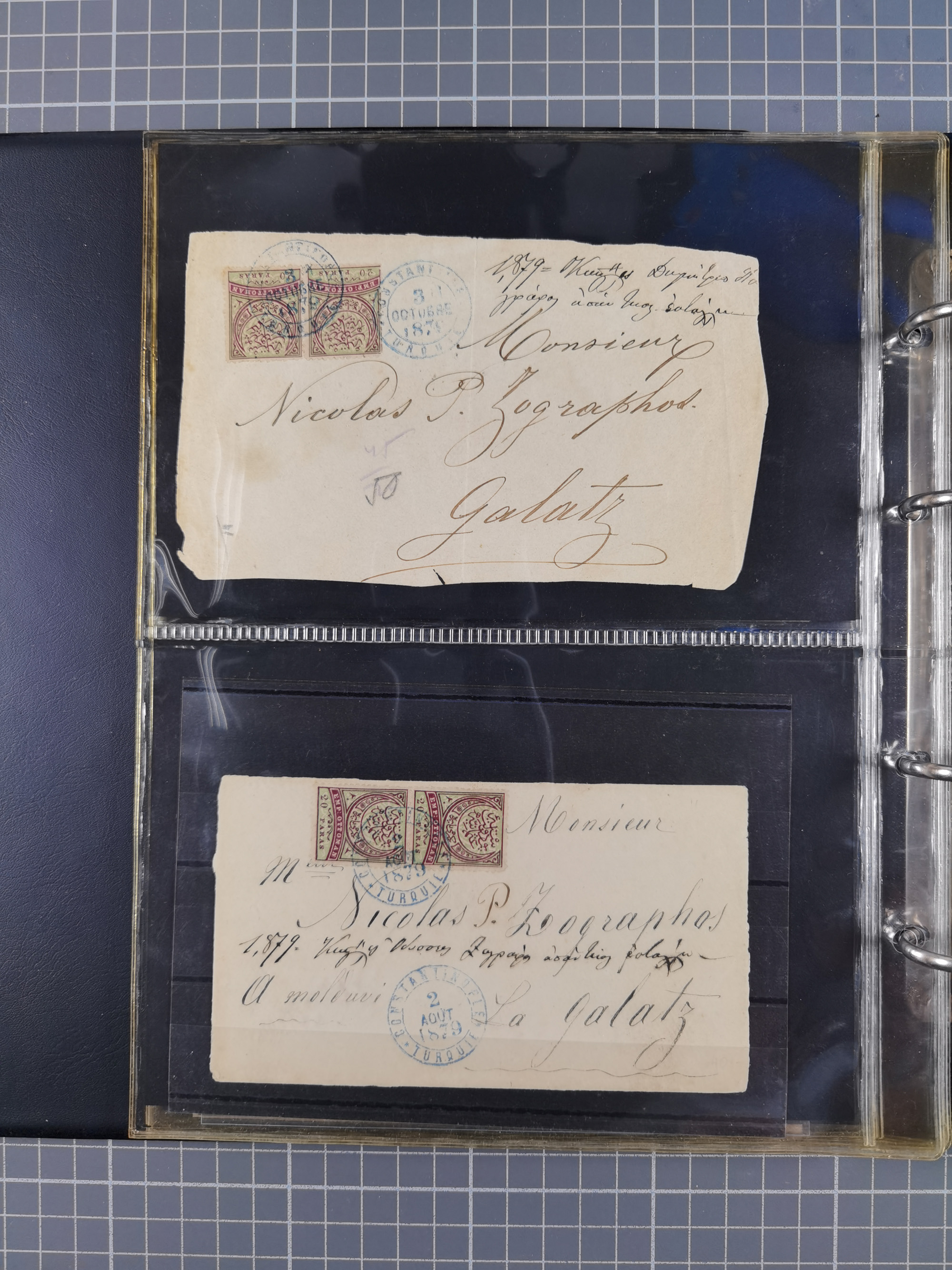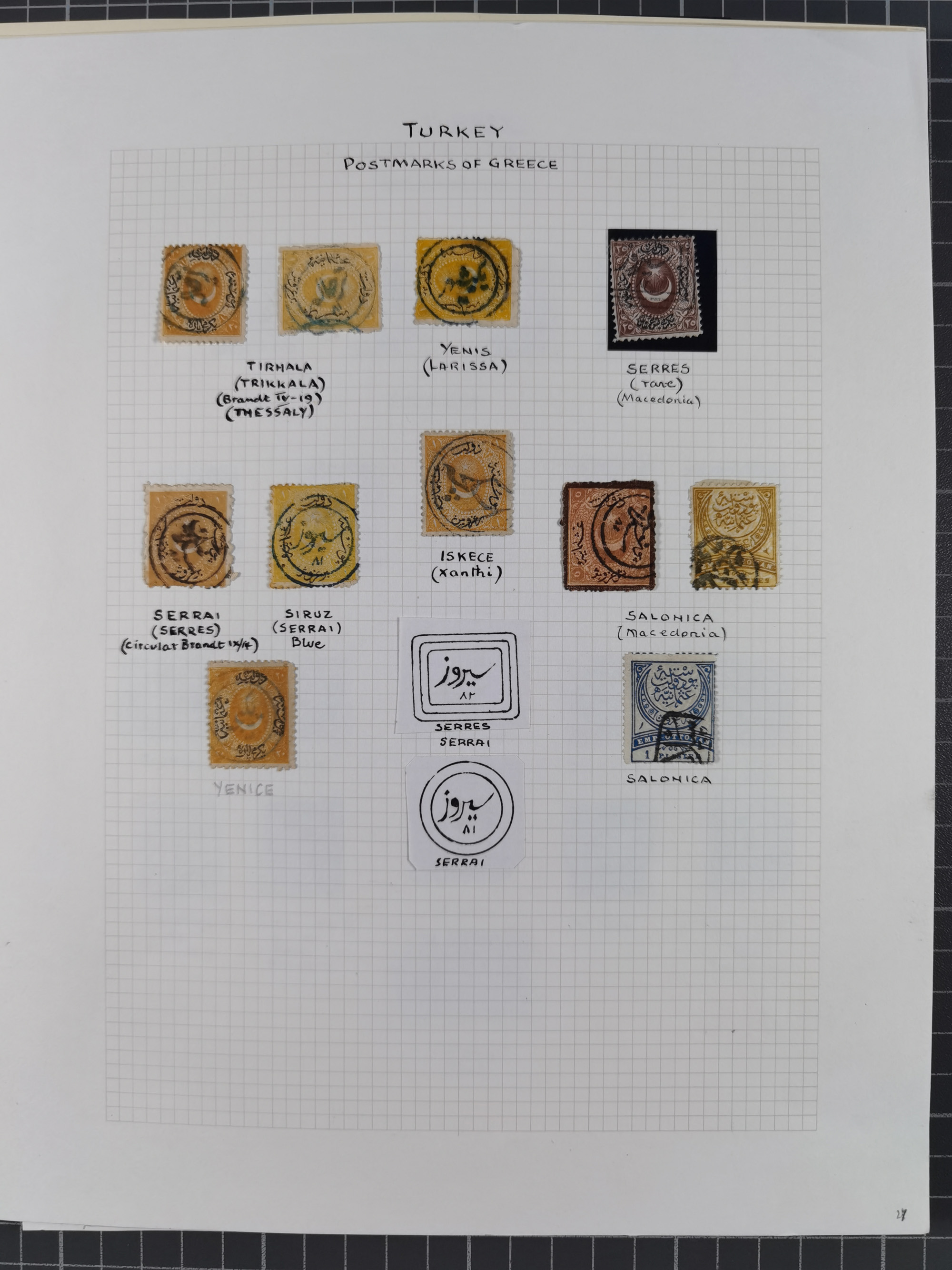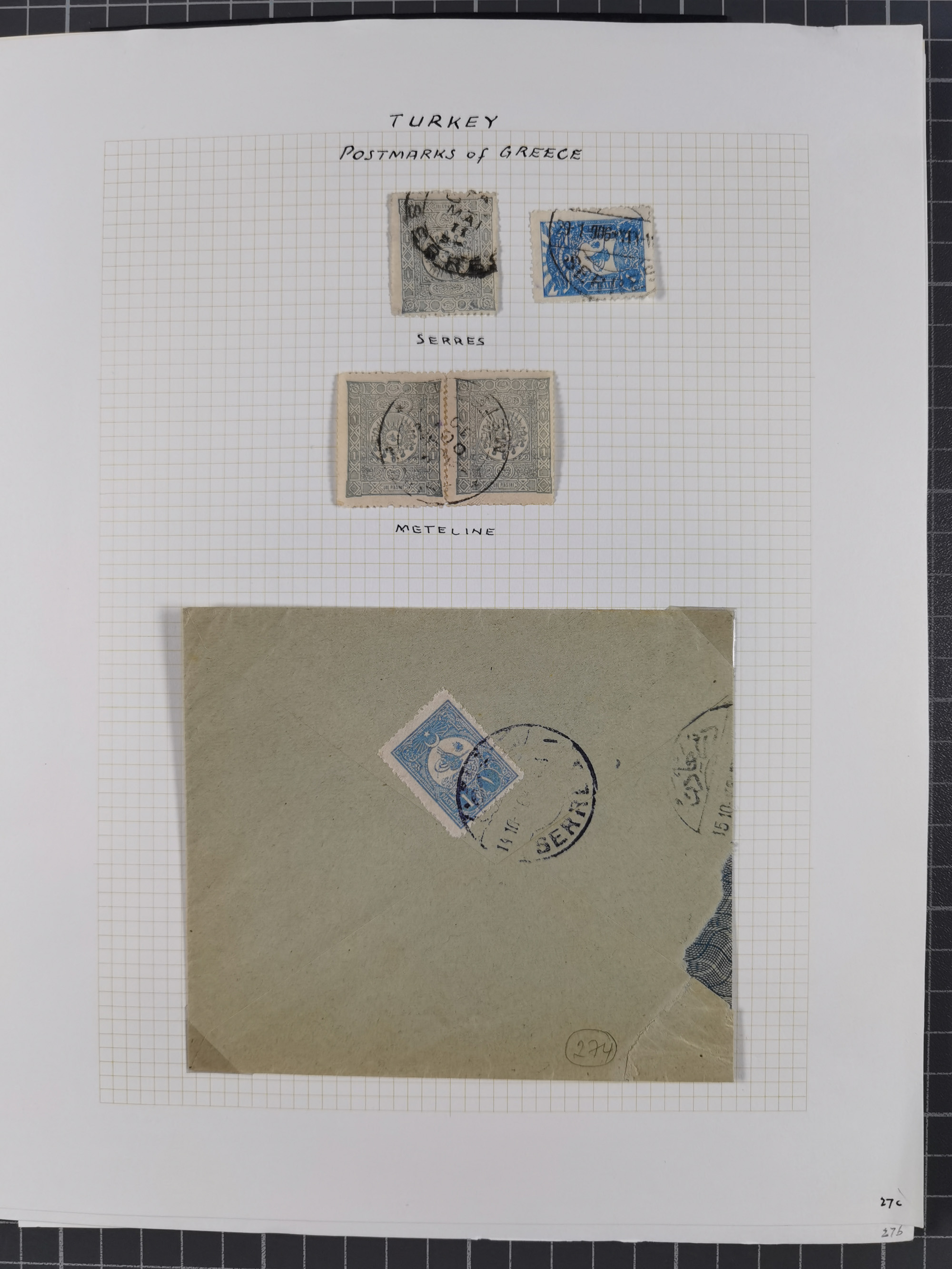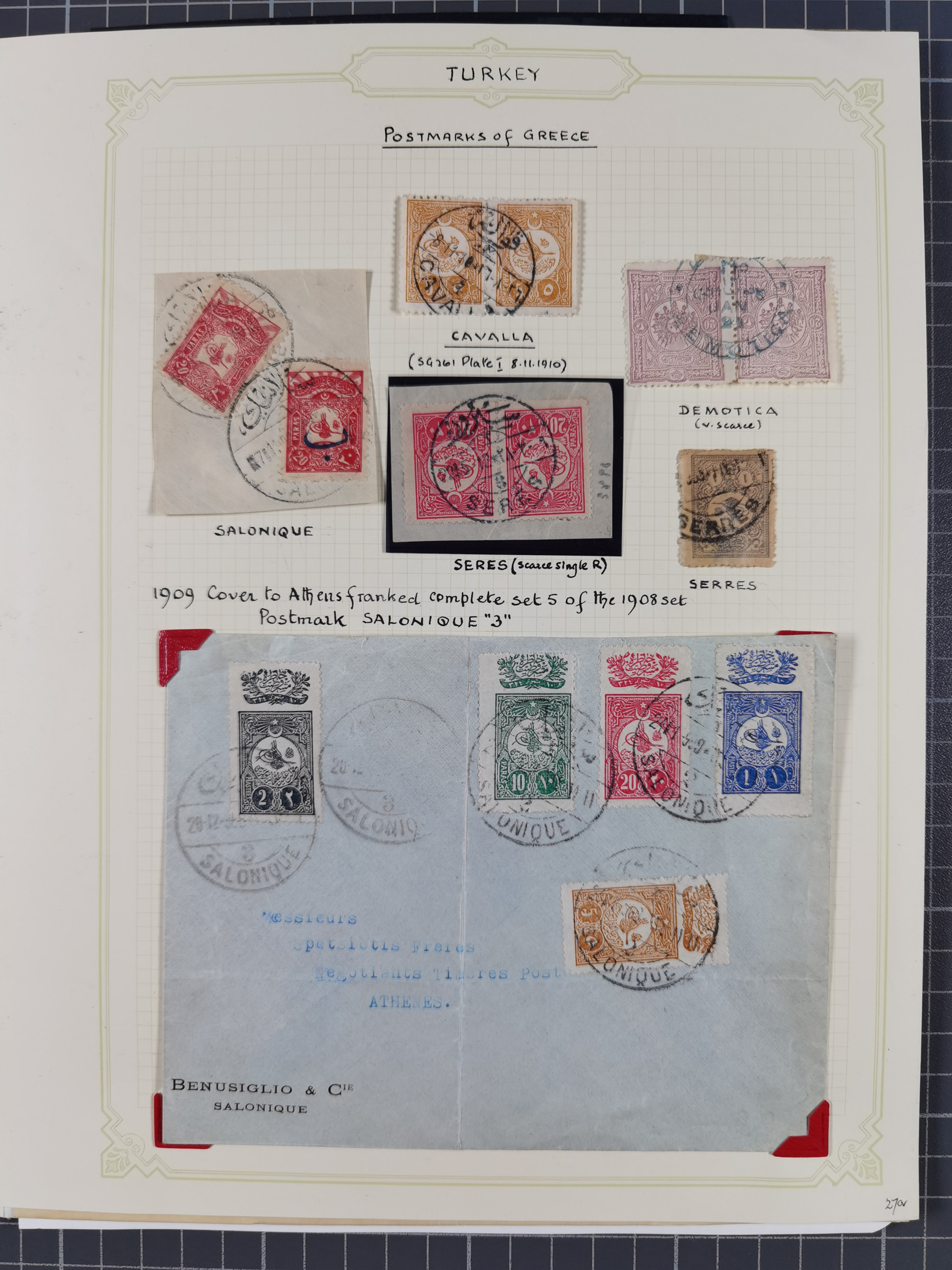 1840/1912, Vilayet of Selanik / Salonica : The collection on leaves with covers/ cards (19) including 1840 prefilatelic envelope front with all arabic SELANIK in blue, Tatar Post documents with clear cancellations of Yanya 256, Yenisehir Fener 257, Salonique 258, Cavalla 2651903 cover at 1 pi. rate tied TIMOUR-HISSAR cds, 1906 card with 5 pa. pair tied by bold YALILAR / (SALONIQUE) datestamp in purple, 1910 cover with 20 pa. pair tied SERRÉS/1 cds, scarce 1911 and 1912 covers with 1 pi. frankings tied SERÉS/3 cds's, 1912 20 pa. rate cover tied CAVALLA/4 cds, cards from SERRES (one cancelled in violet), 1910 cover with 1 pi. tied CAVALLA cds, 20 pa. card cancelled by superb DRAMA cds. etc. A generally fine group.