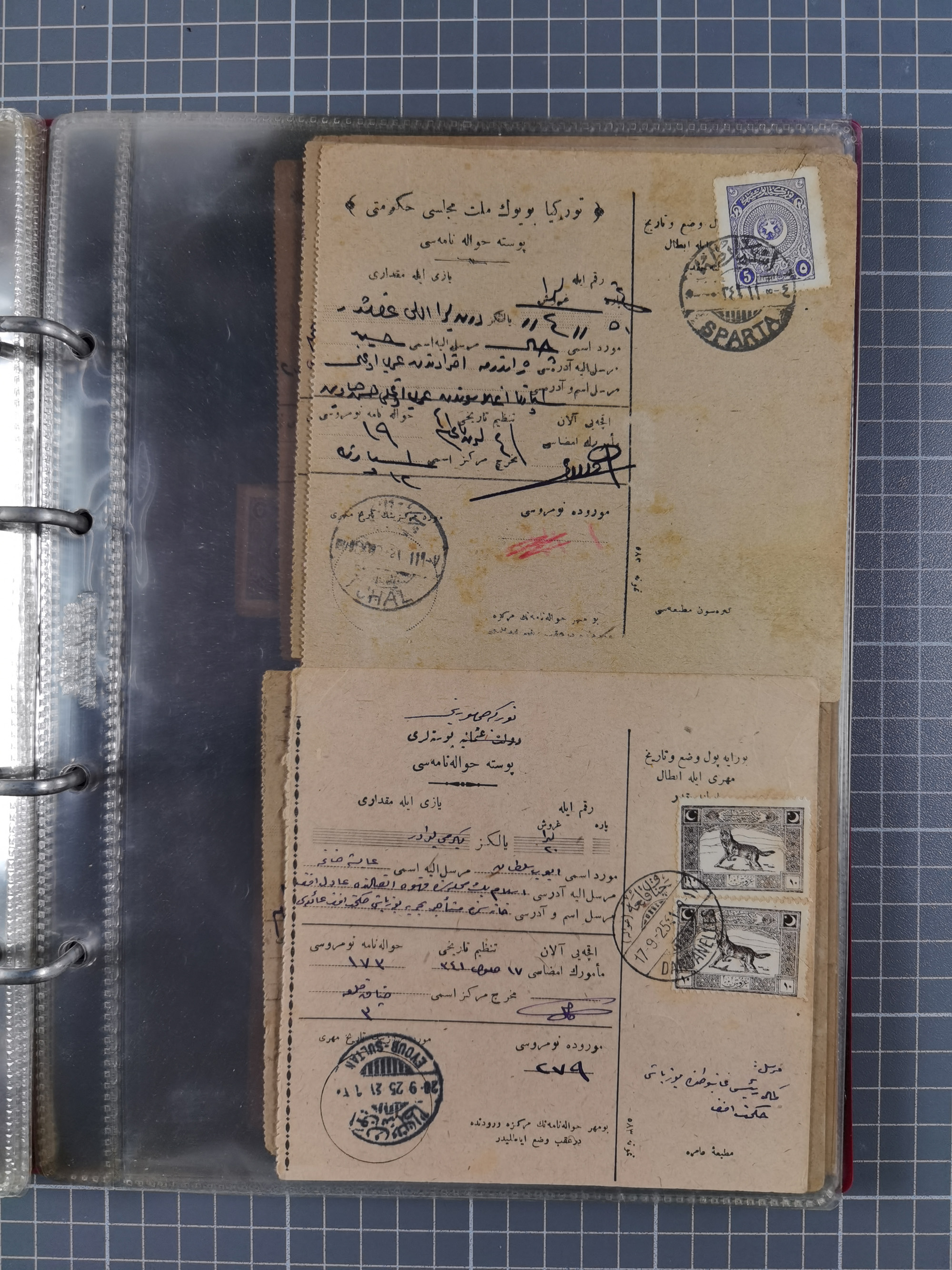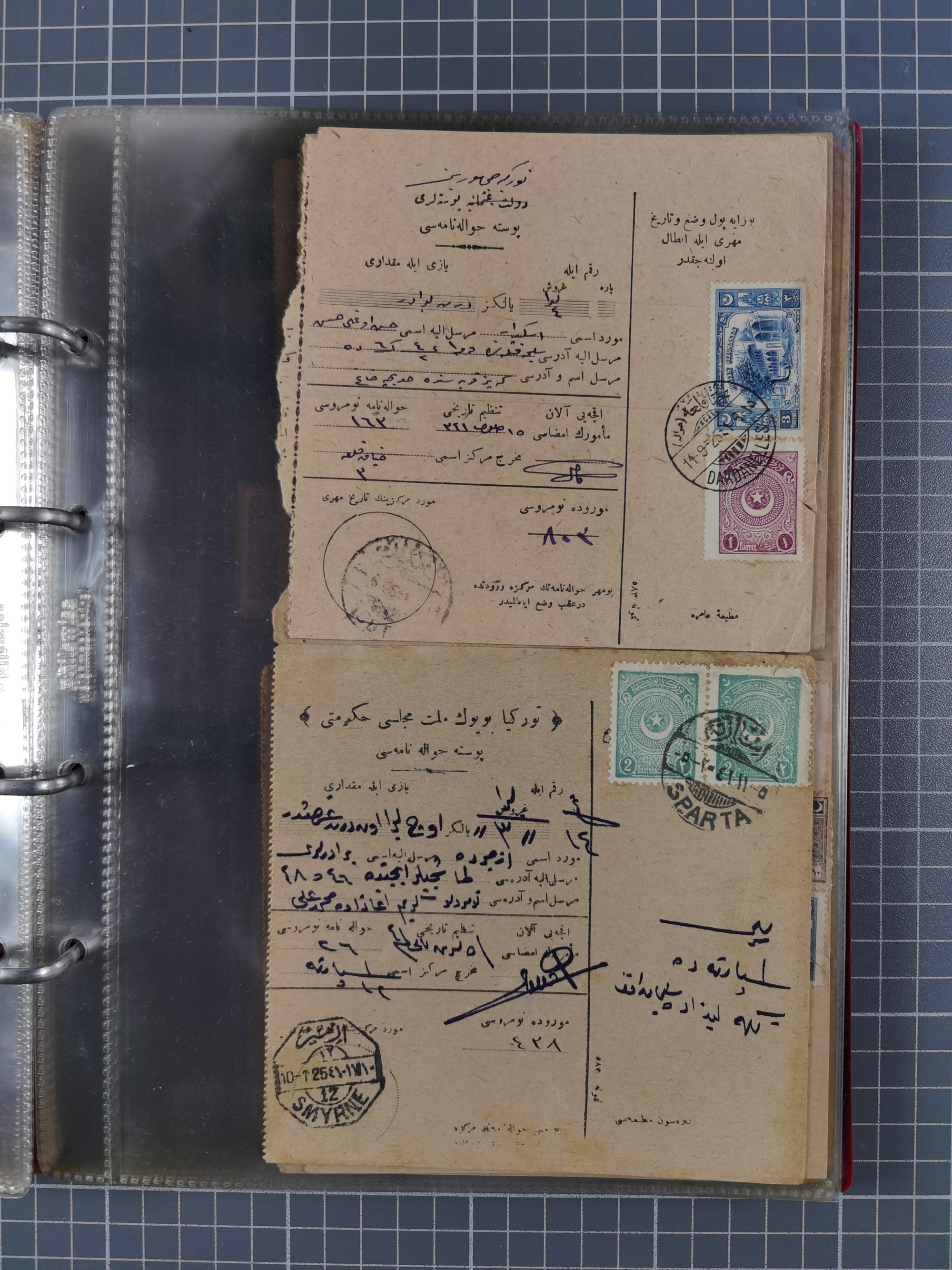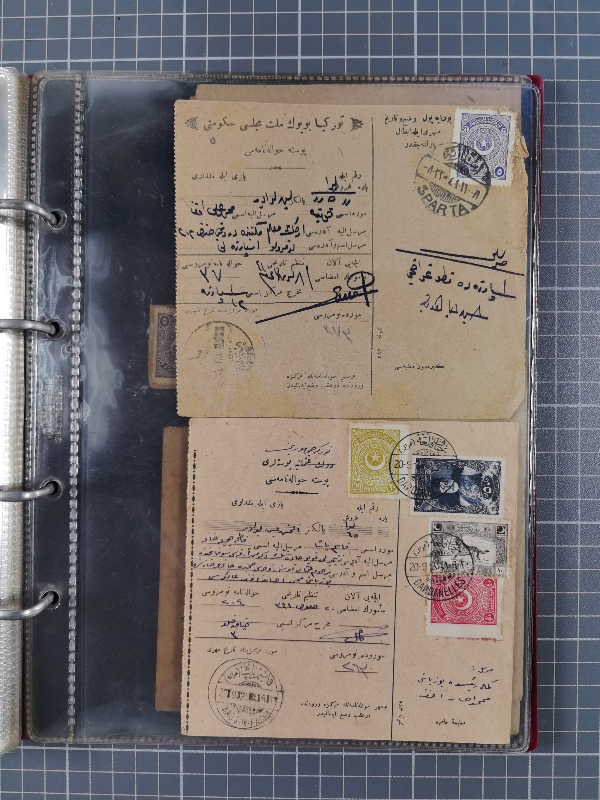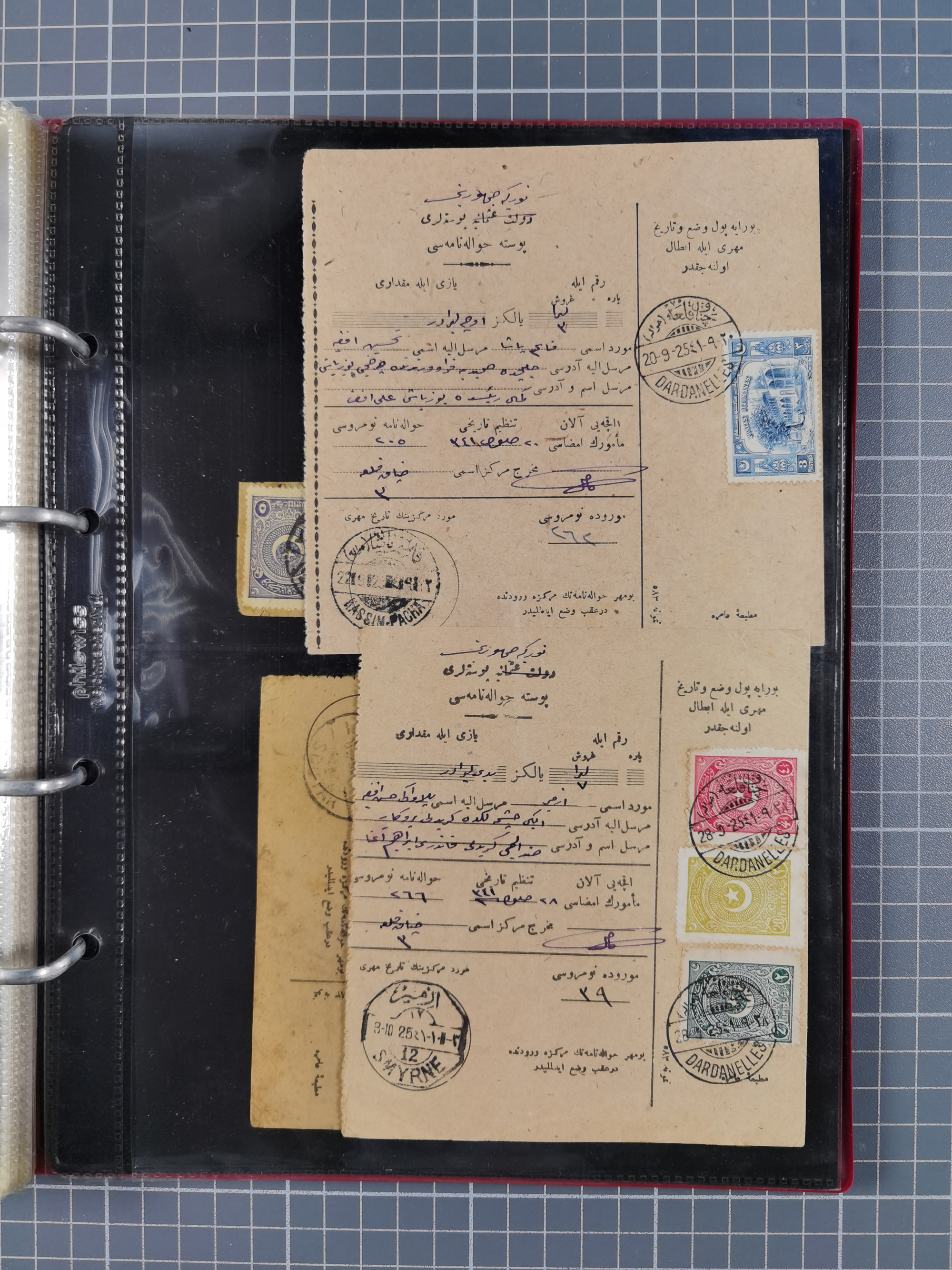1917/25, 48 parcel cards and money transfers, mainly early republic, including 1917 order from Elvechre with bisect stamp to ministery of war, good cancellations of Dardanelles, Sparta, Chorlou, Tarsus, Manisa etc., some different, mainly fine.