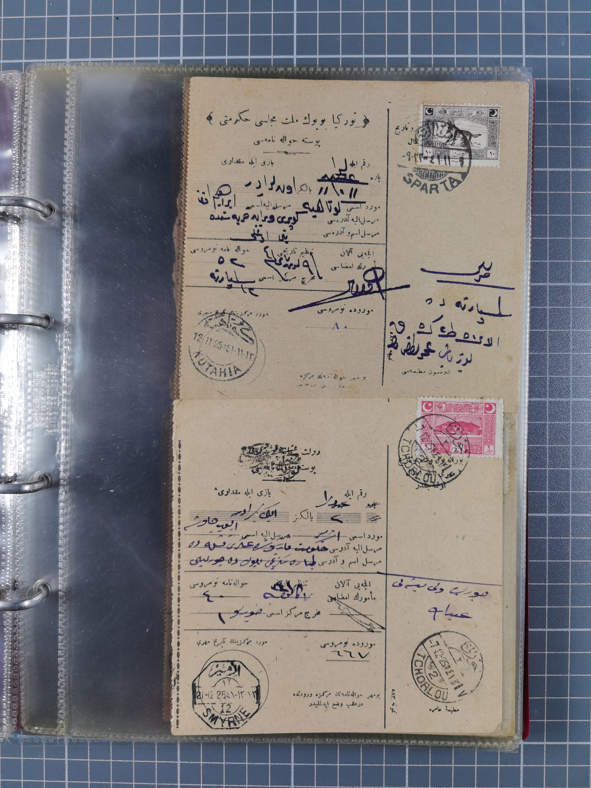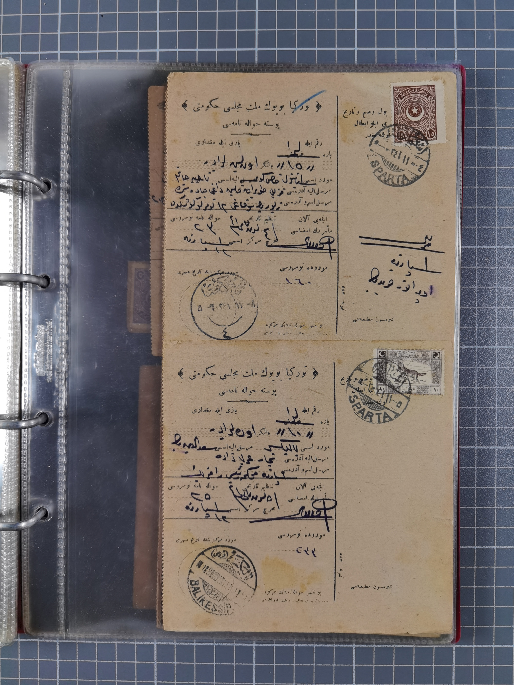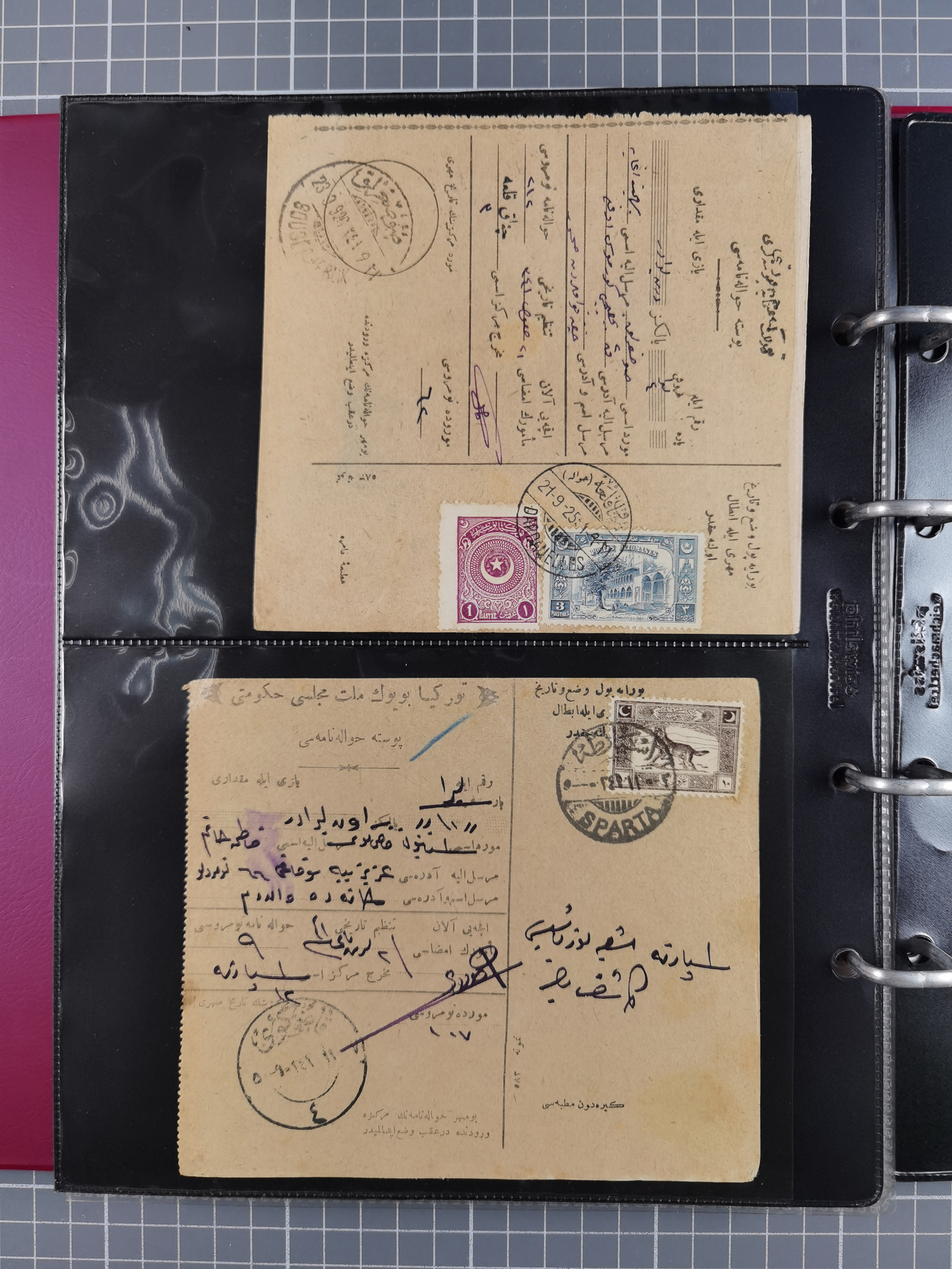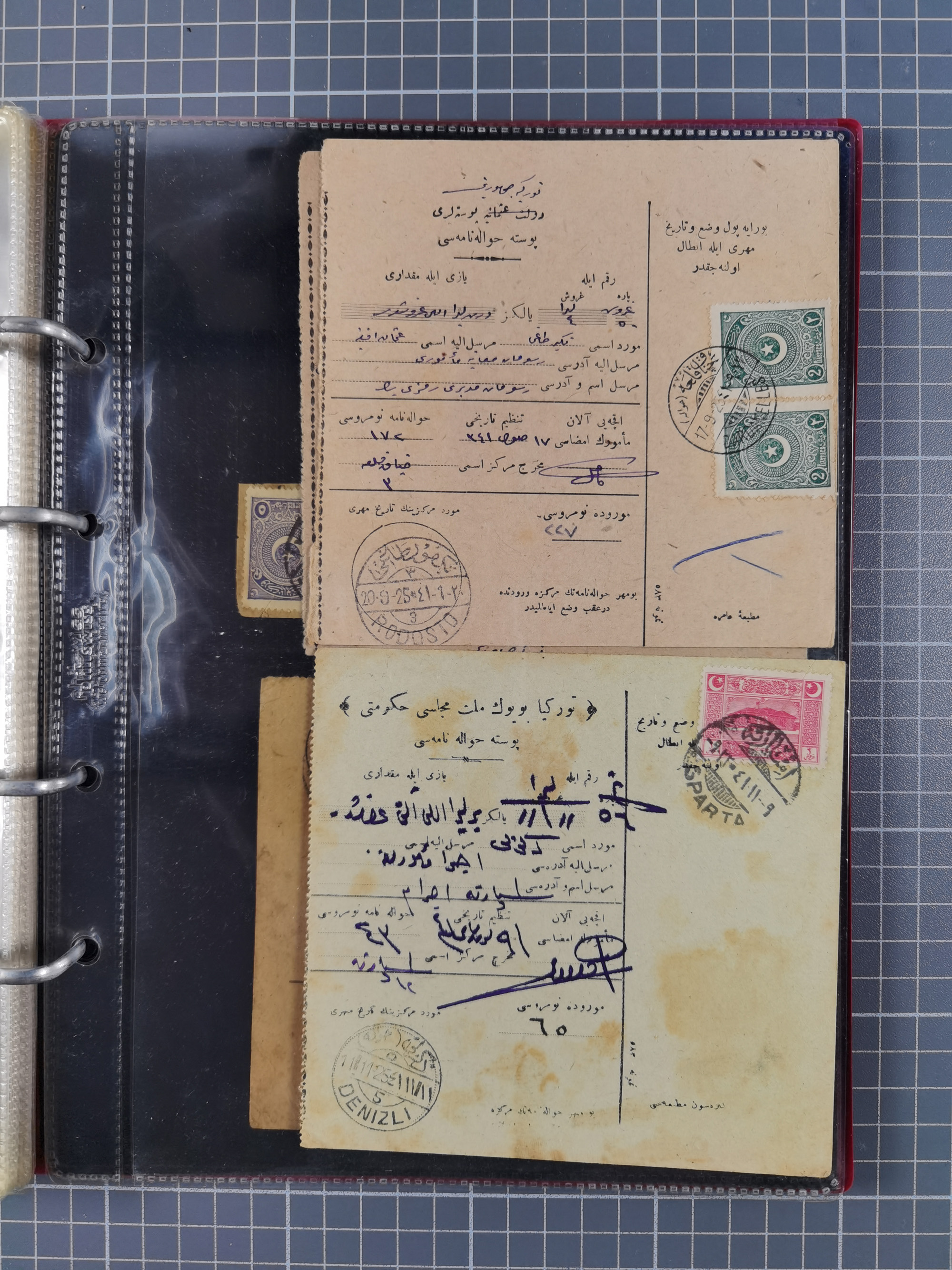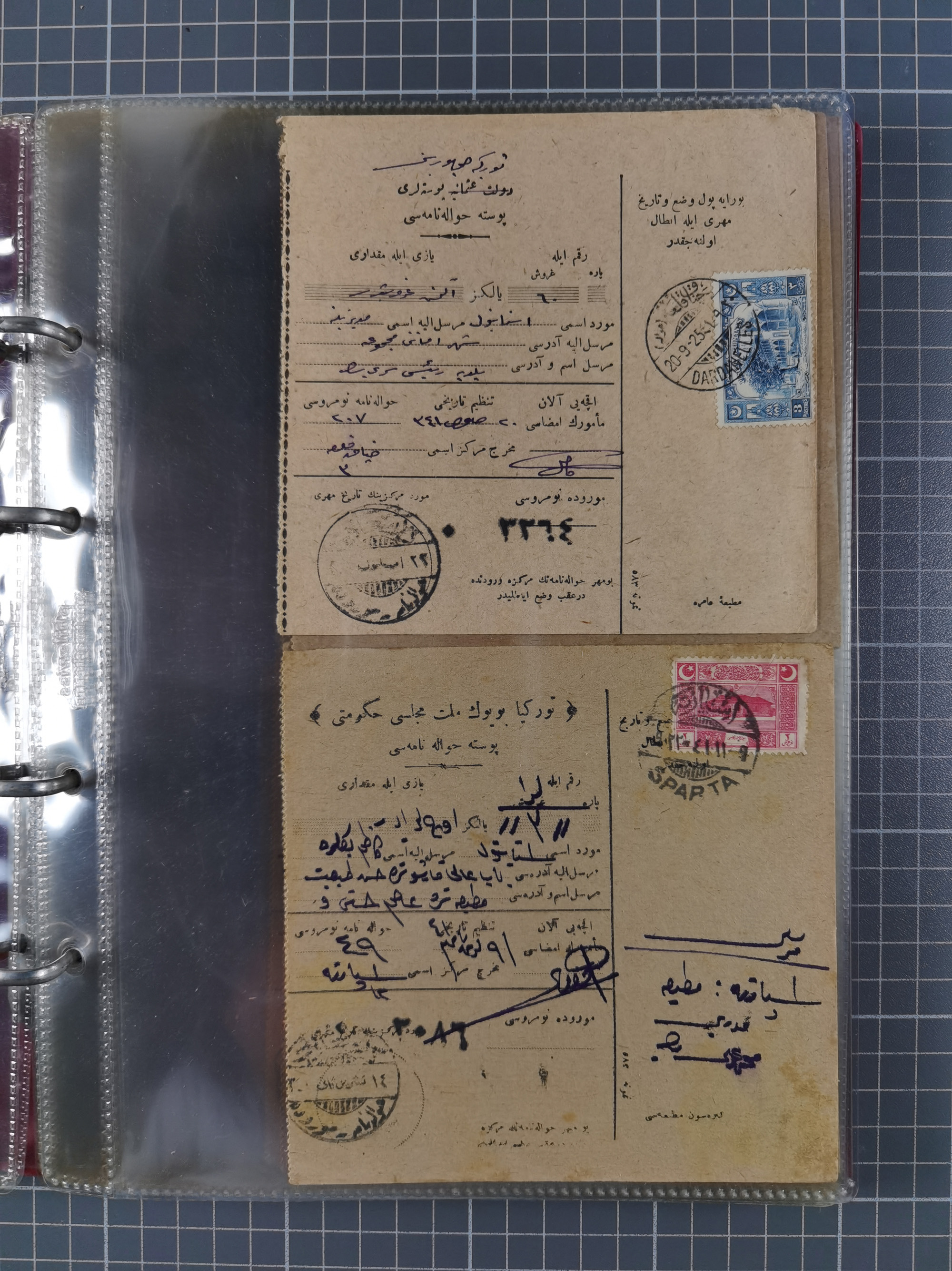 1917/25, 48 parcel cards and money transfers, mainly early republic, including 1917 order from Elvechre with bisect stamp to ministery of war, good cancellations of Dardanelles, Sparta, Chorlou, Tarsus, Manisa etc., some different, mainly fine.