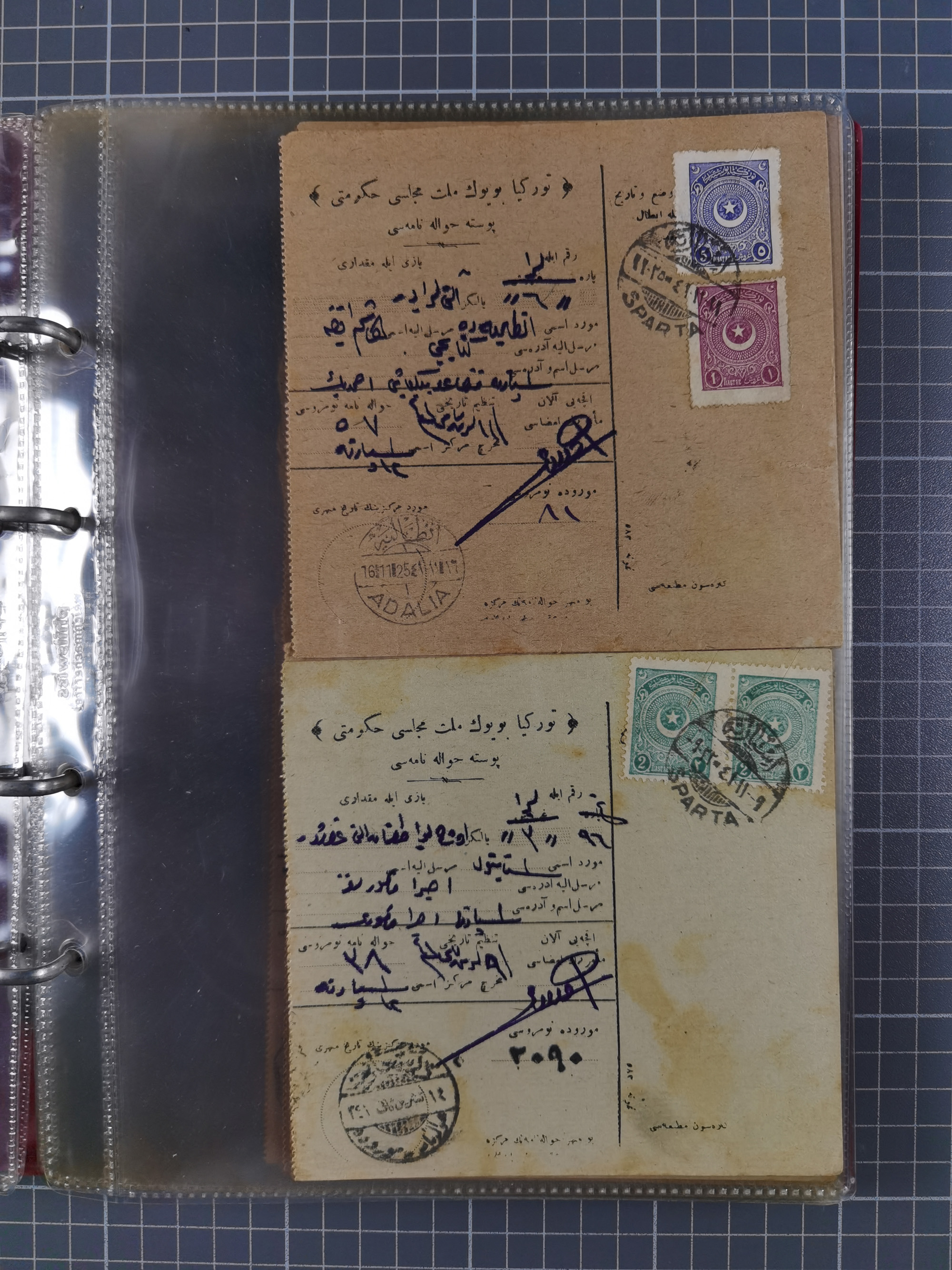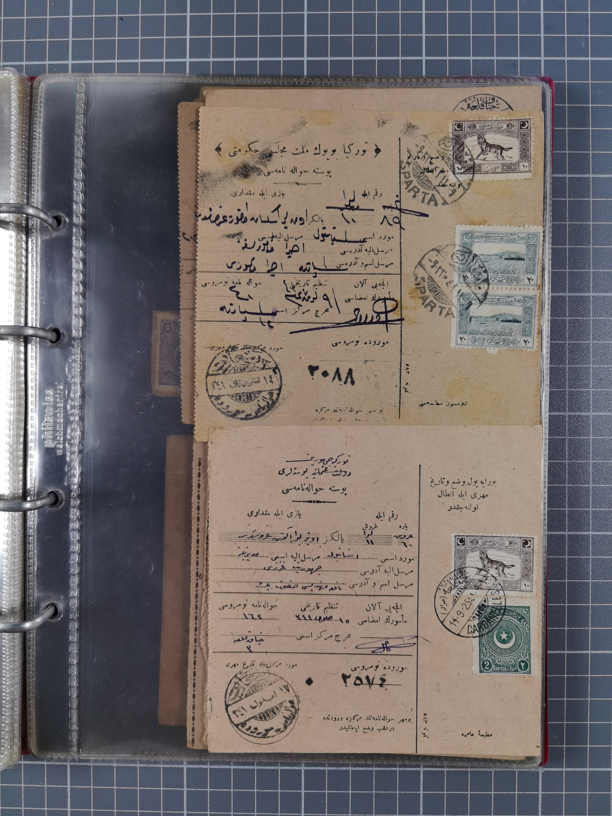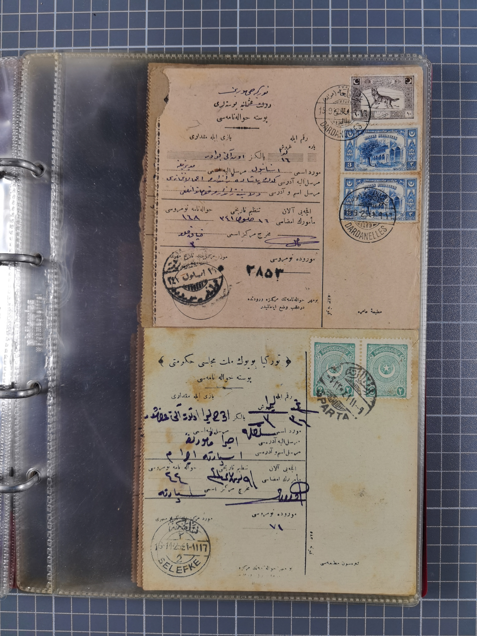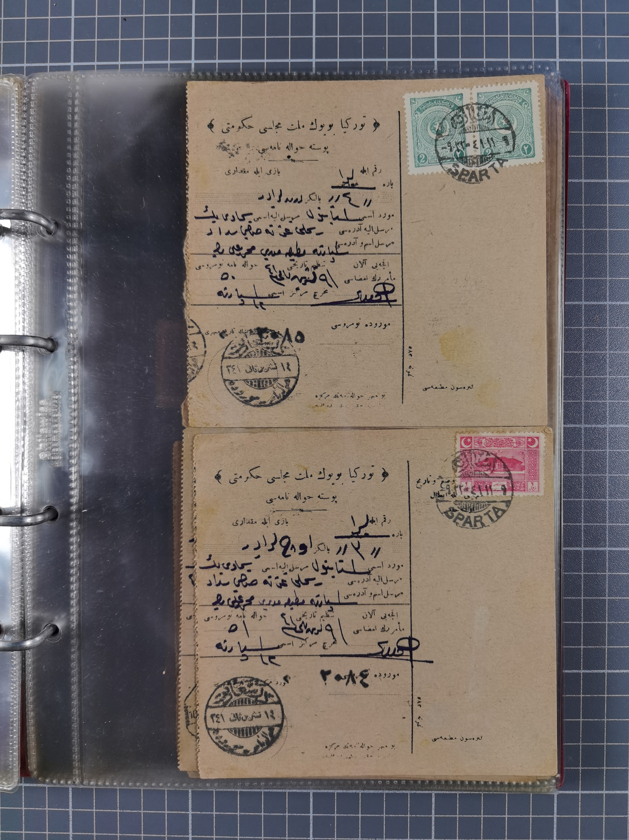 1917/25, 48 parcel cards and money transfers, mainly early republic, including 1917 order from Elvechre with bisect stamp to ministery of war, good cancellations of Dardanelles, Sparta, Chorlou, Tarsus, Manisa etc., some different, mainly fine.