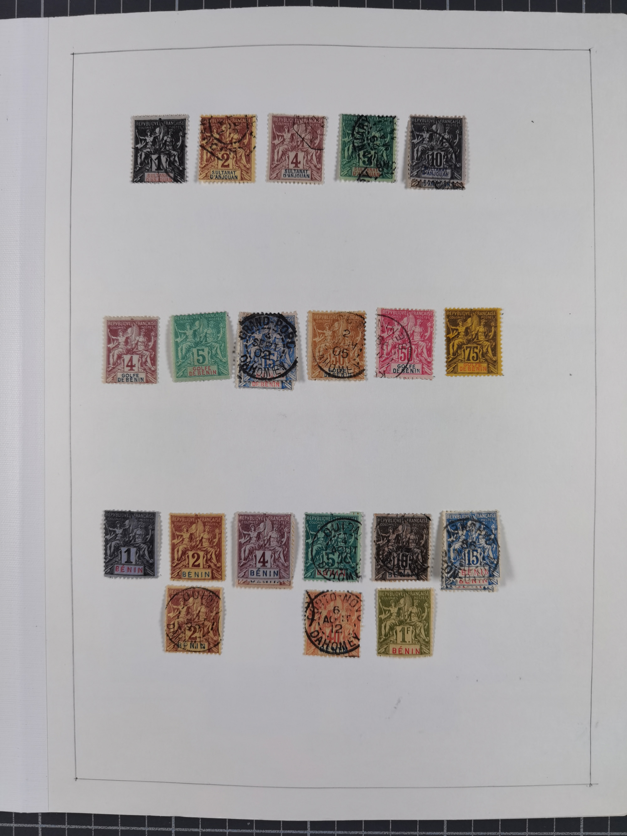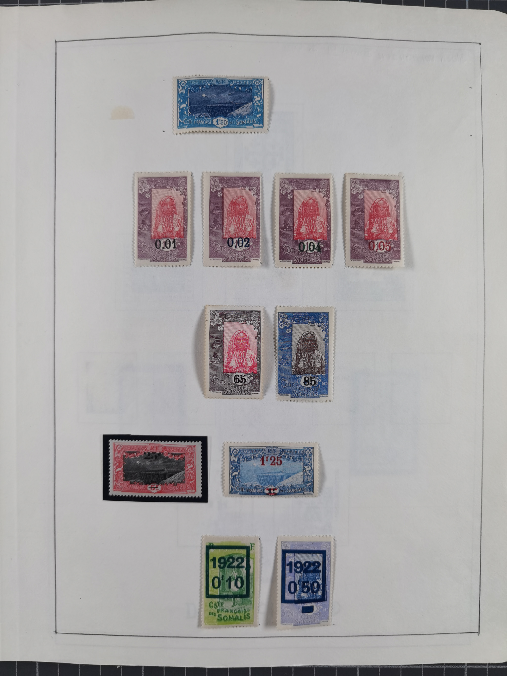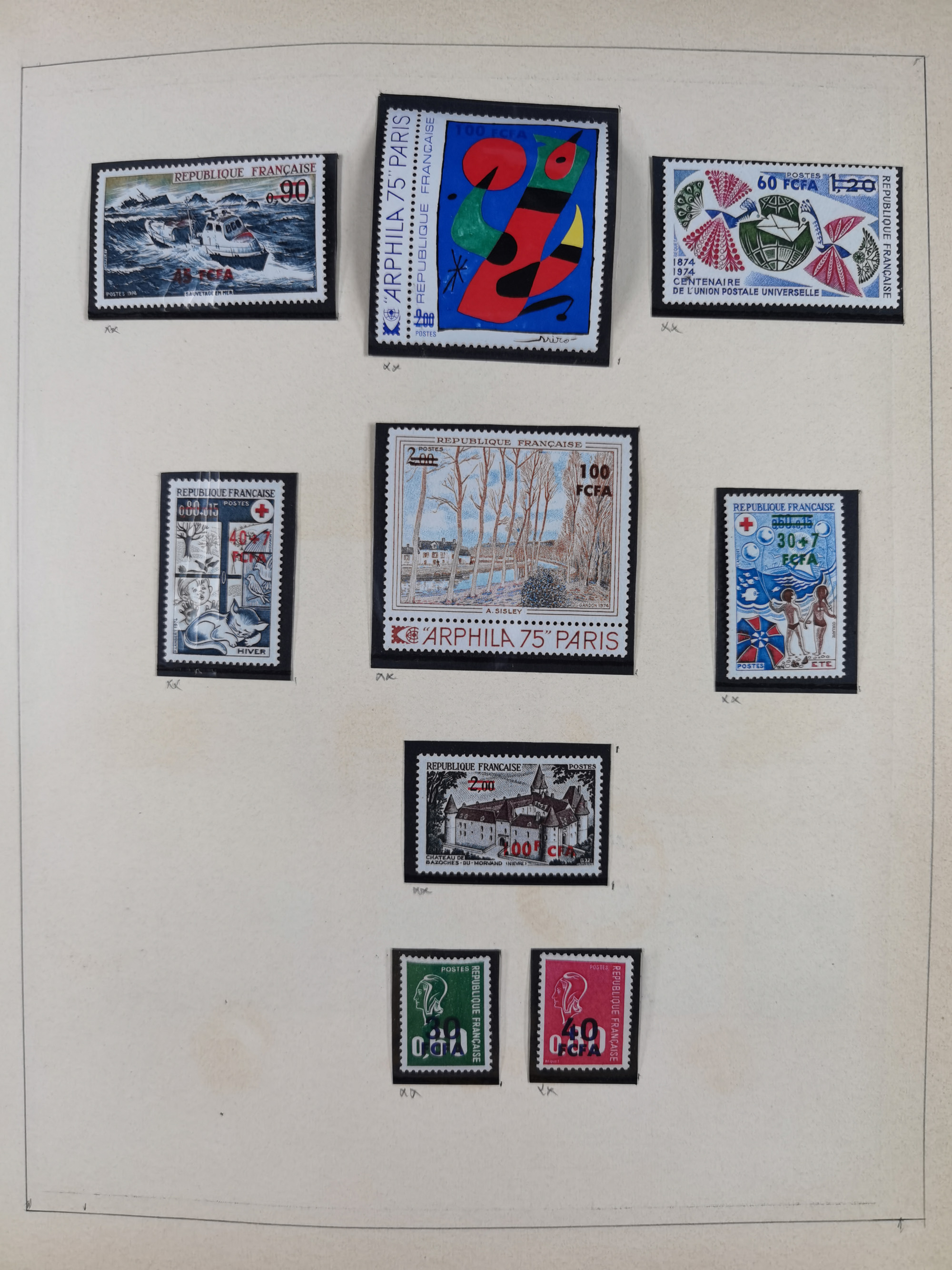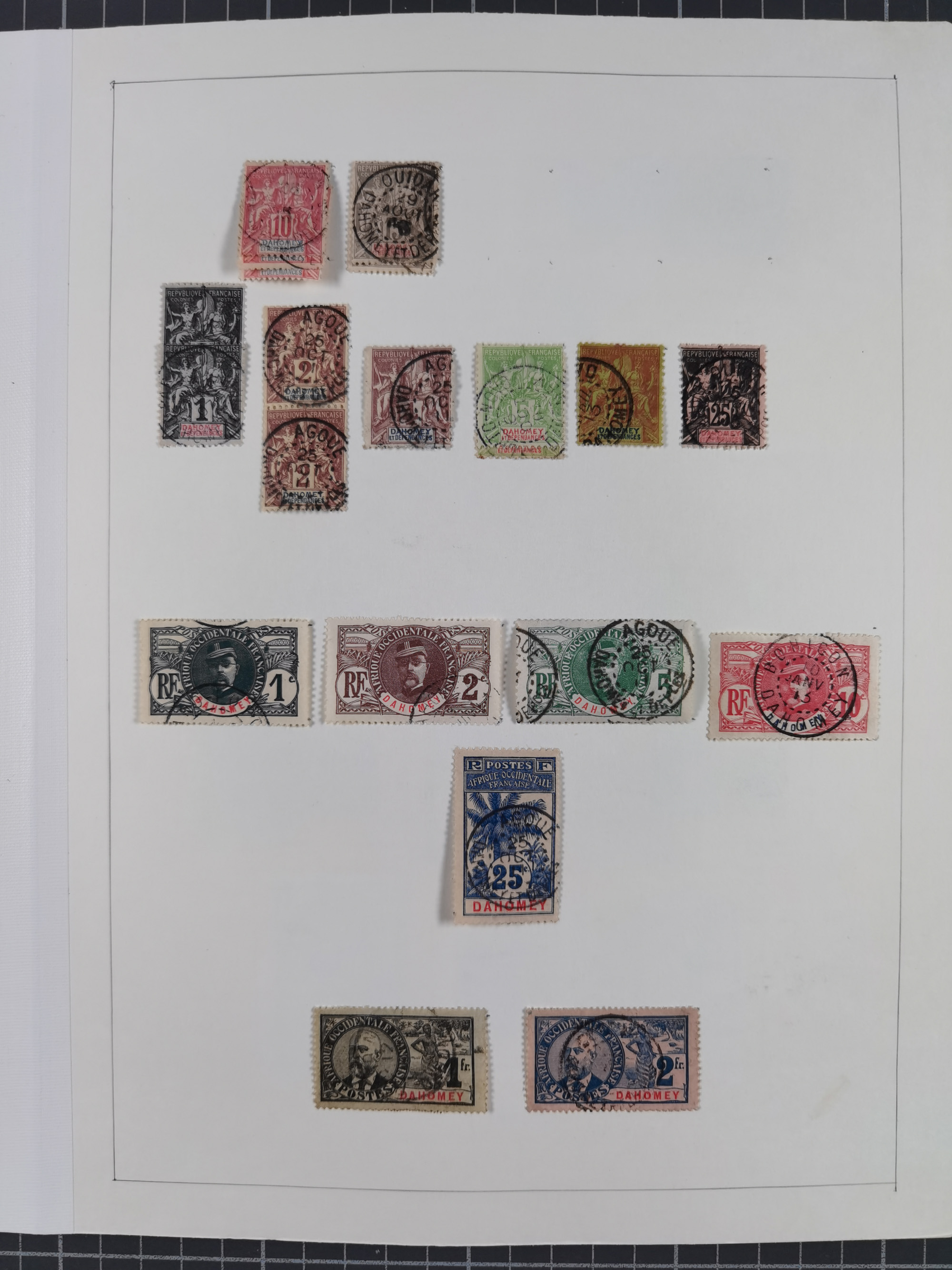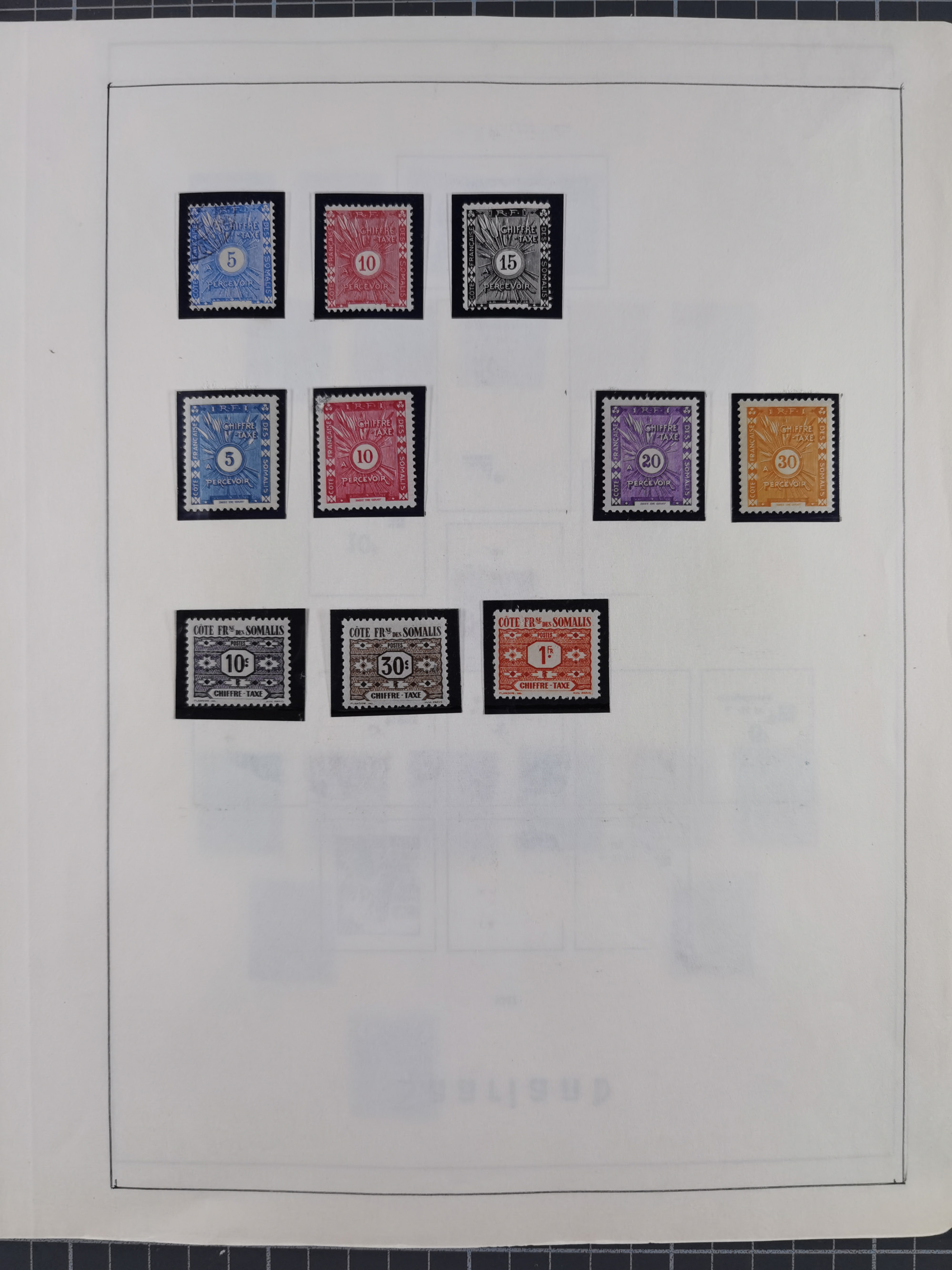 1895/1975 (ca)  unsued and used collection French Colonies and successor states, with stamps from a.o. Algeria, Dahomey, French Sudan, Obock, Gabon, Guinea, Cameroon, Madagascar with better overprint stamps, Réunion, Senegal, Somalia and Togo. Plus two page with the general issues 1859/86 incl. postage due, mostly in good condition