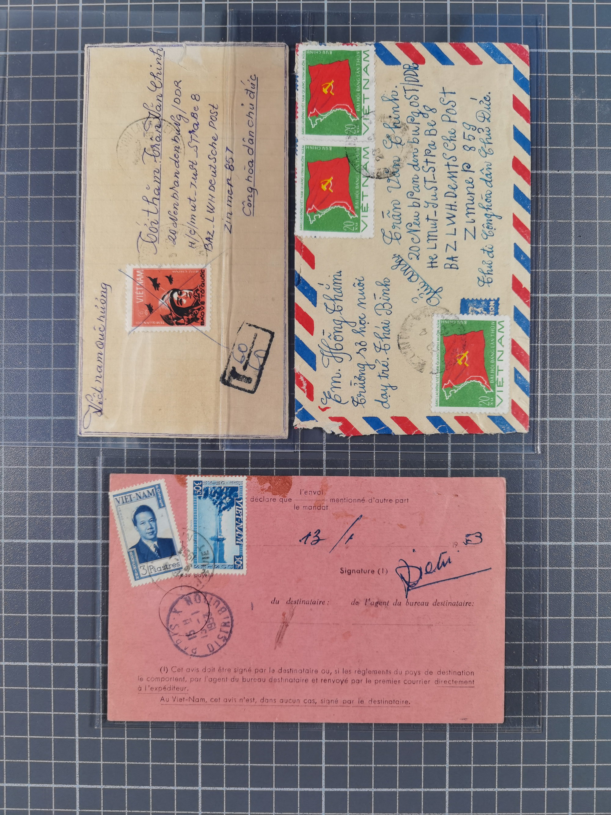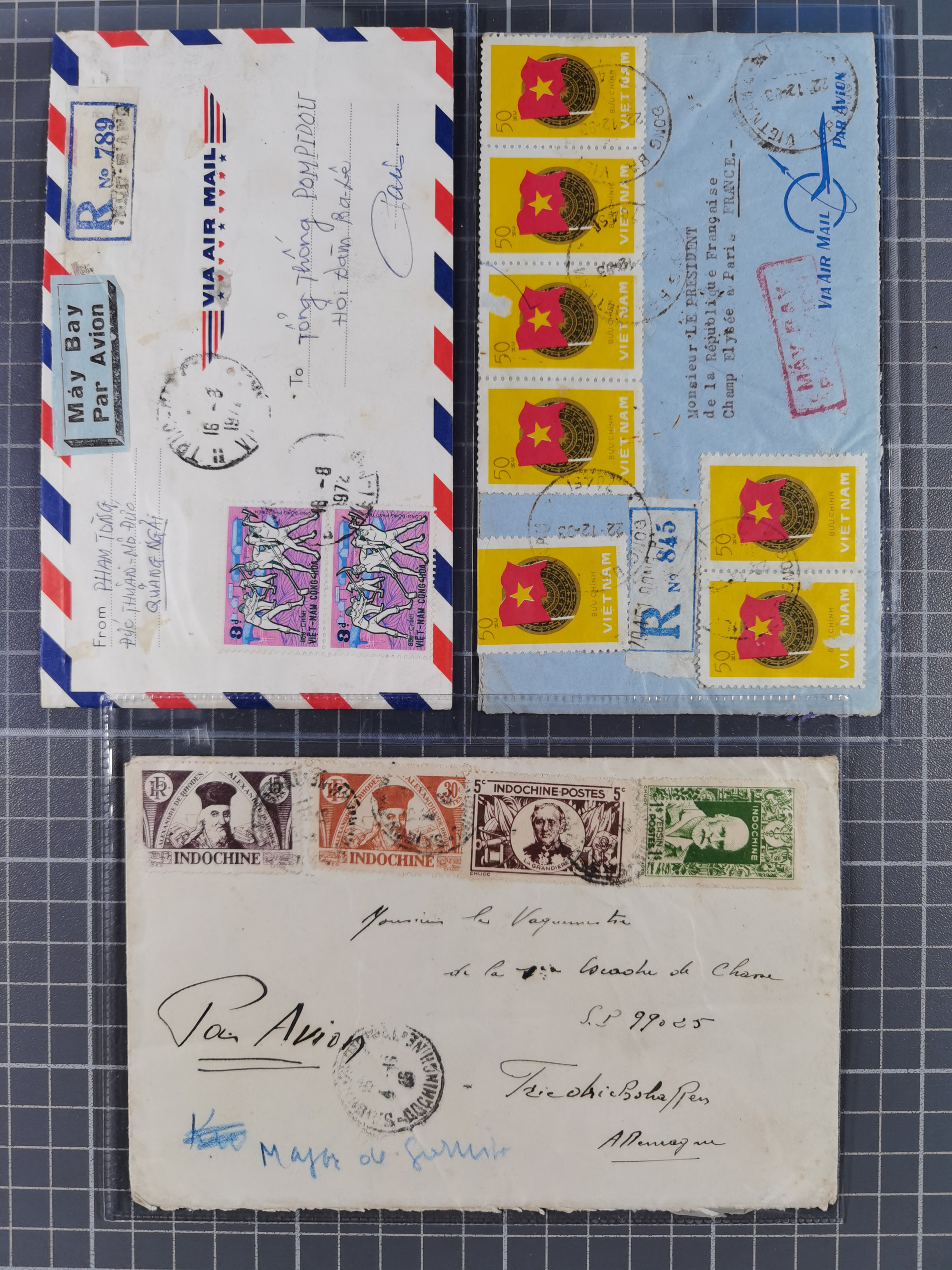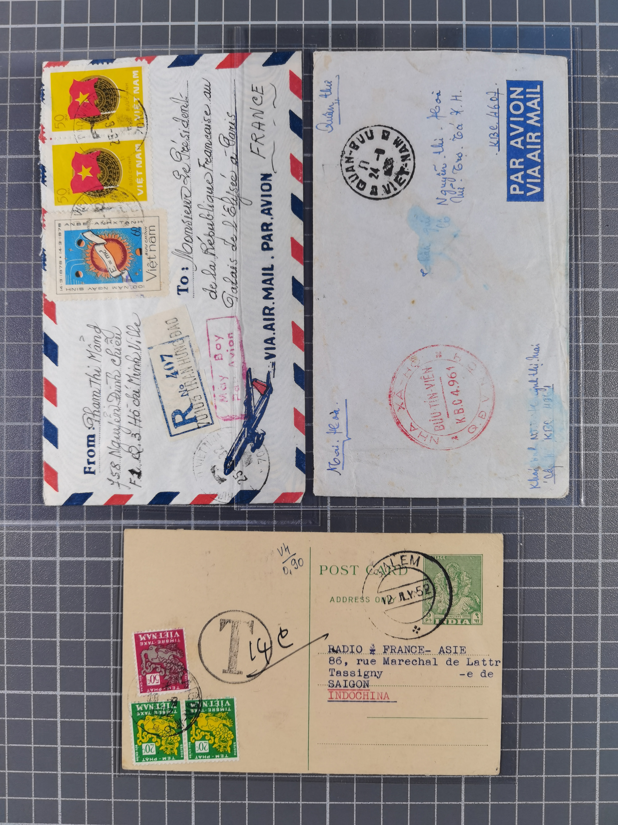 1944/82 (ca.), group of 18 covers and cards with various frankings and interesting usages form Indochina, Vietnam and Cambodia, noted military free frank envelope with large red “NHA XA-HO Q.D.V.N.C.H” (Nha Xa South Vietnam Military Forces), Indian incoming postal stationery card from “SALEM 12 JLY 52” to Saigon with additional postage dues applied on arrival, 1982 envelope from Vietnam addressed to the French Republic President in Paris, etc., overall in good condition