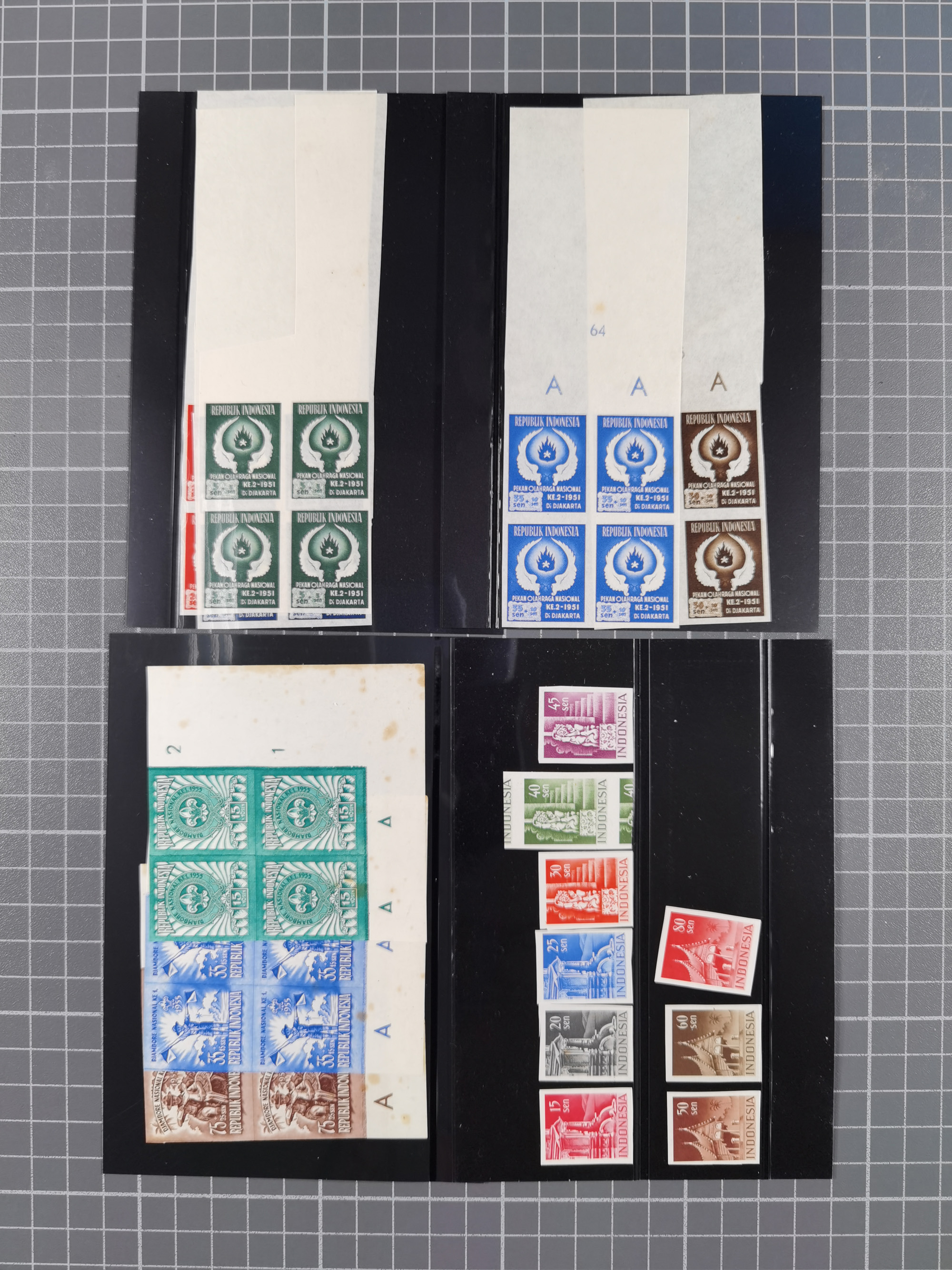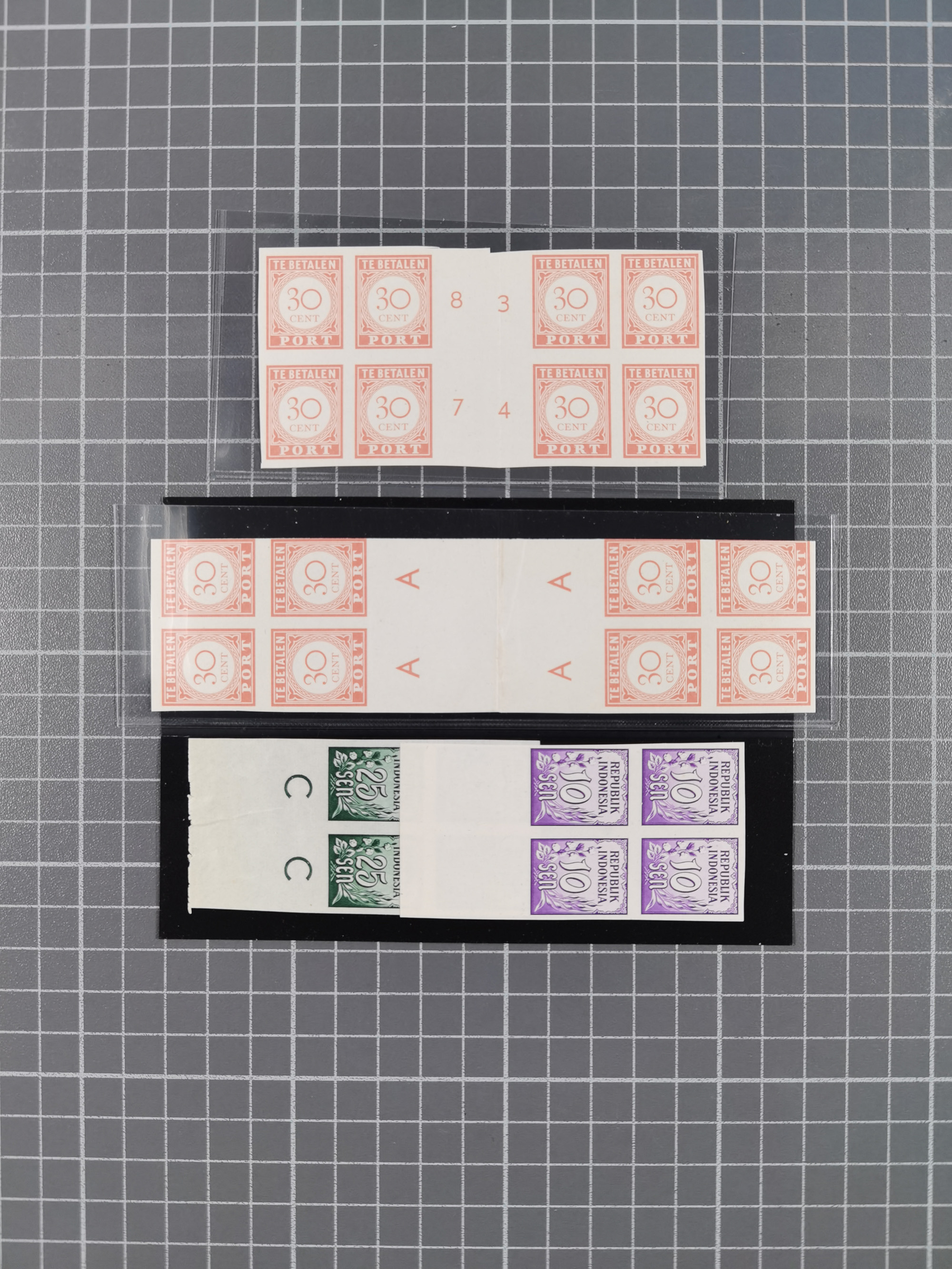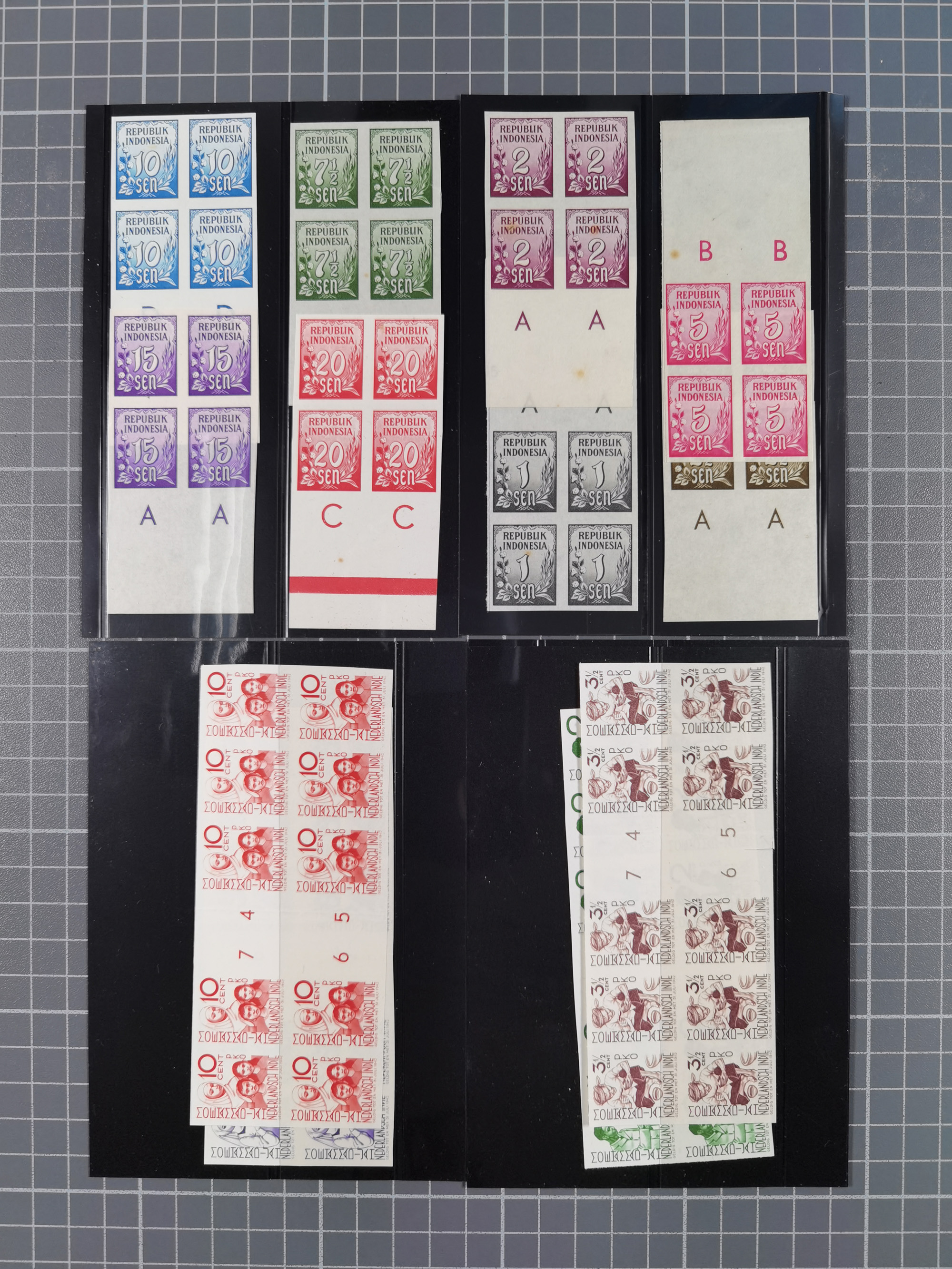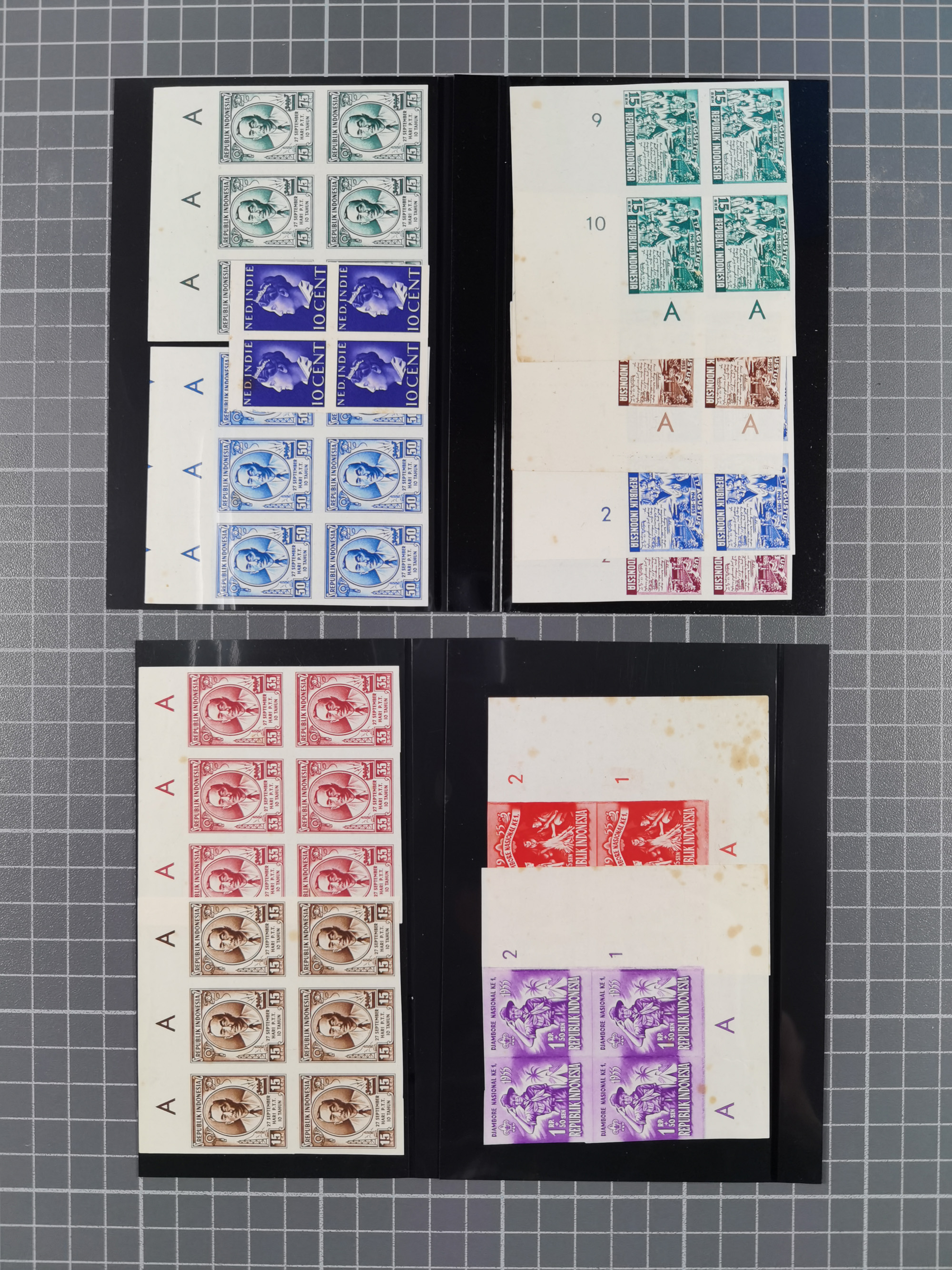 1948/49, Wilhelmina overprinted 50 c., imperforated proof in part double sheet of 170 stamps with 10 gutter pairs and errors 'small IN' on pos. 77 left sheet and 'NDONESIA' on pos 47 of right sheet. Most likely unique.