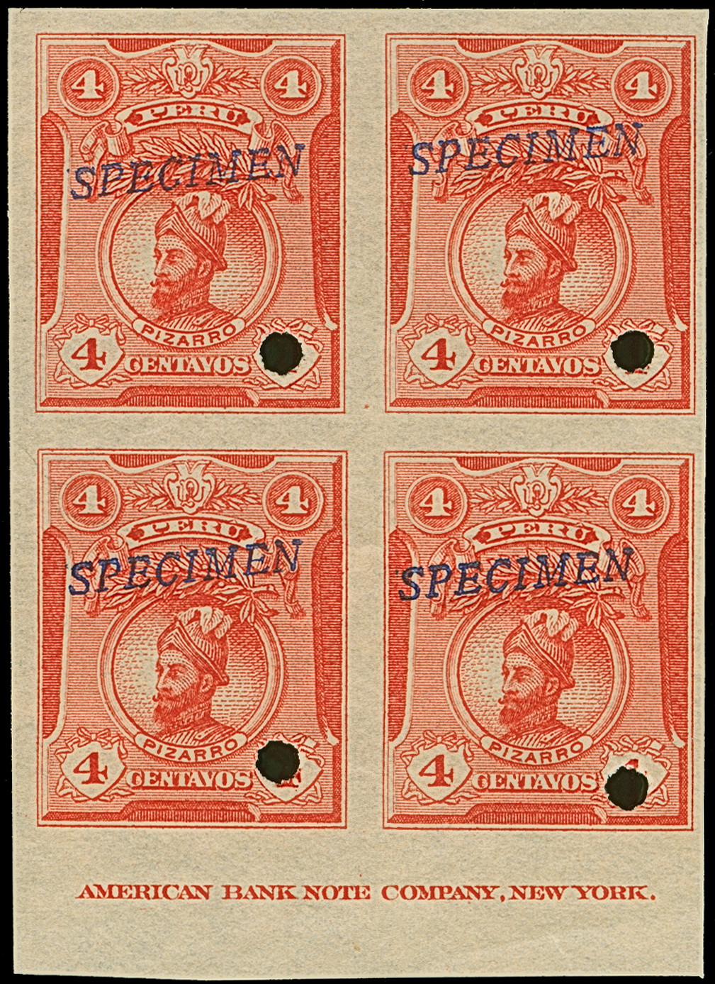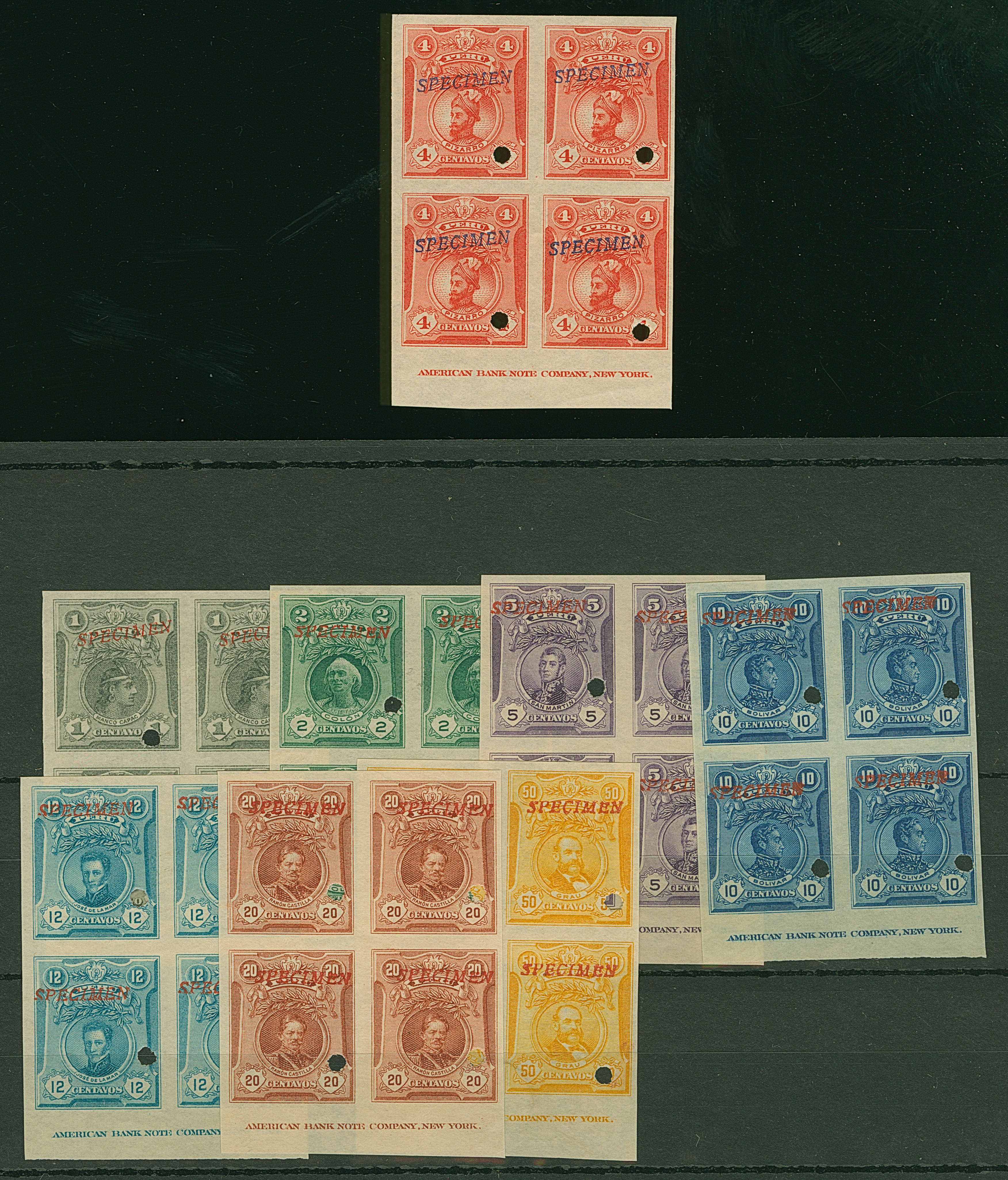 1909, Portrait Issue 1 c.-50 c. in imperforate blocks of four with lower sheet margin showing the American Ban Note Company imprint, each with security punch hole and overprint “SPECIMEN”, no gum, 12 c. light crease, otherwise fine