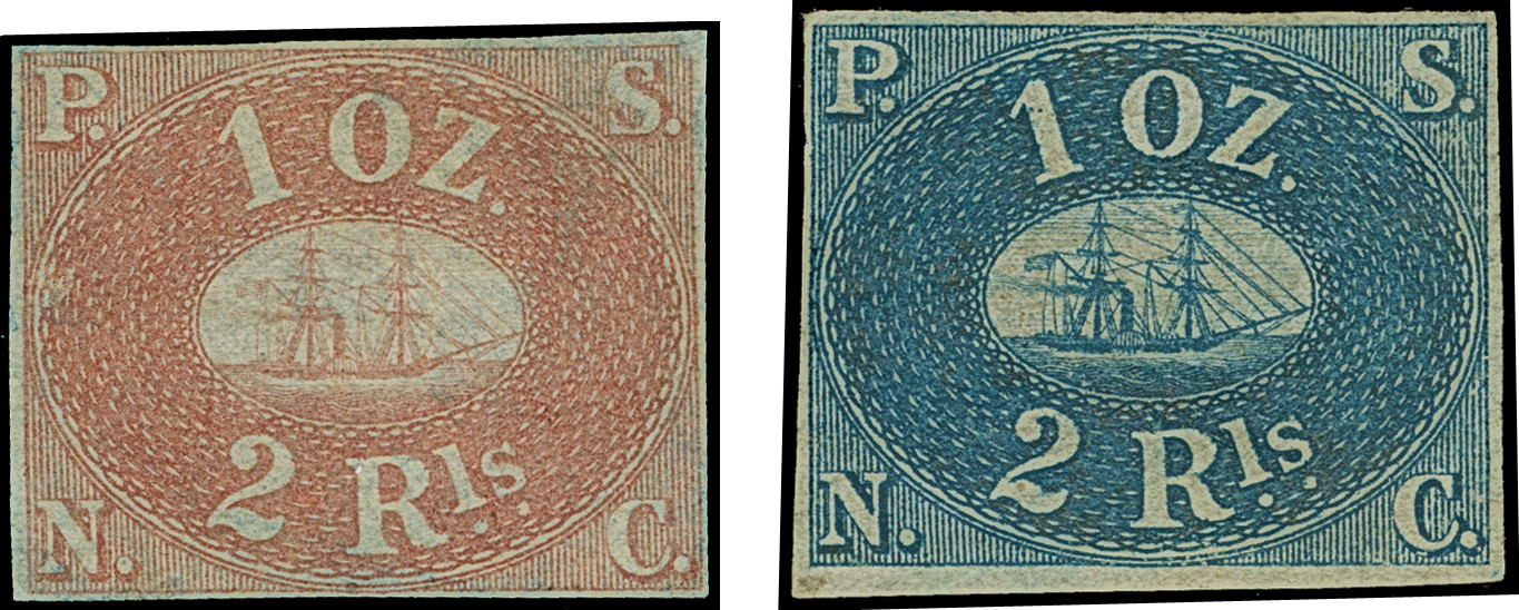 1863, Pacific steam navigation company 2 r. blue and carmine on white paper, reprints of 1863, one with full, the other with large margins on all sides, unused without gum. 2 r. with blued paper, to give the appearance of the issued stamp. Scarce. Certs. Samamé (2024) (Yvert 2A, 2C)