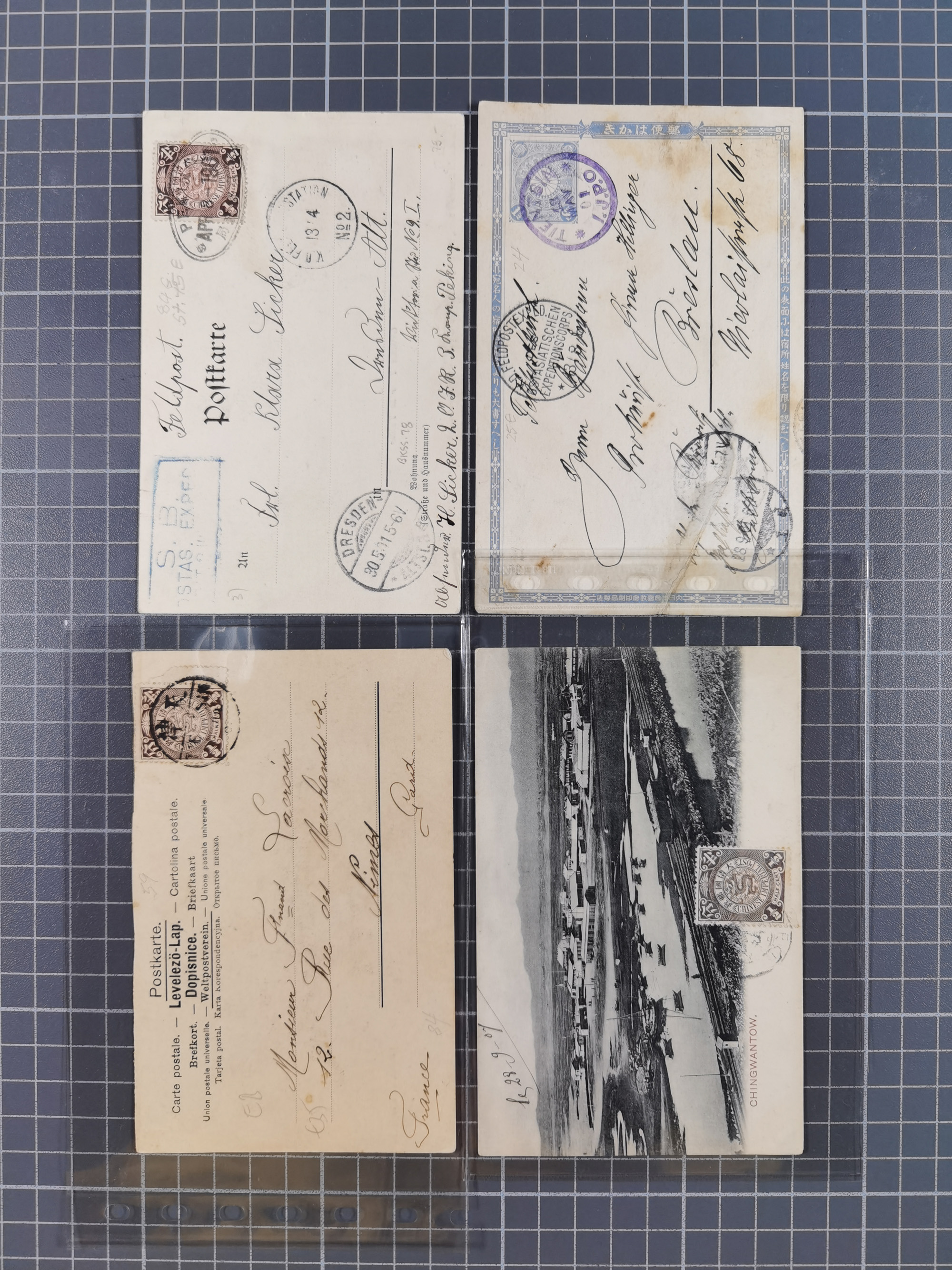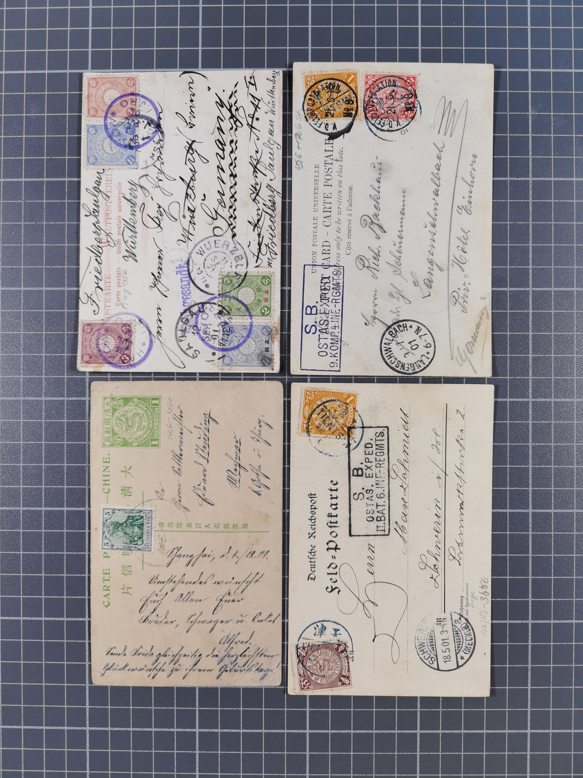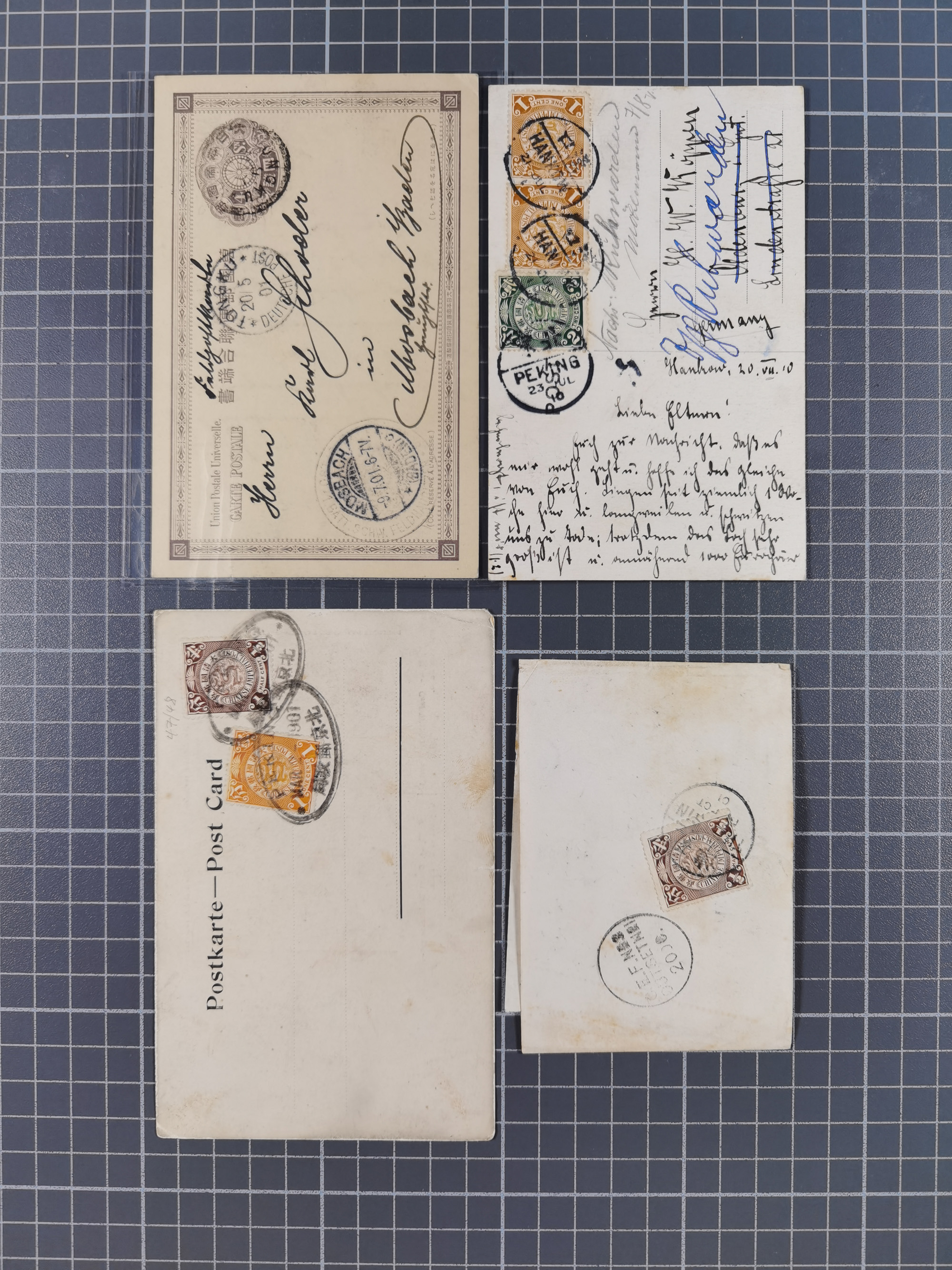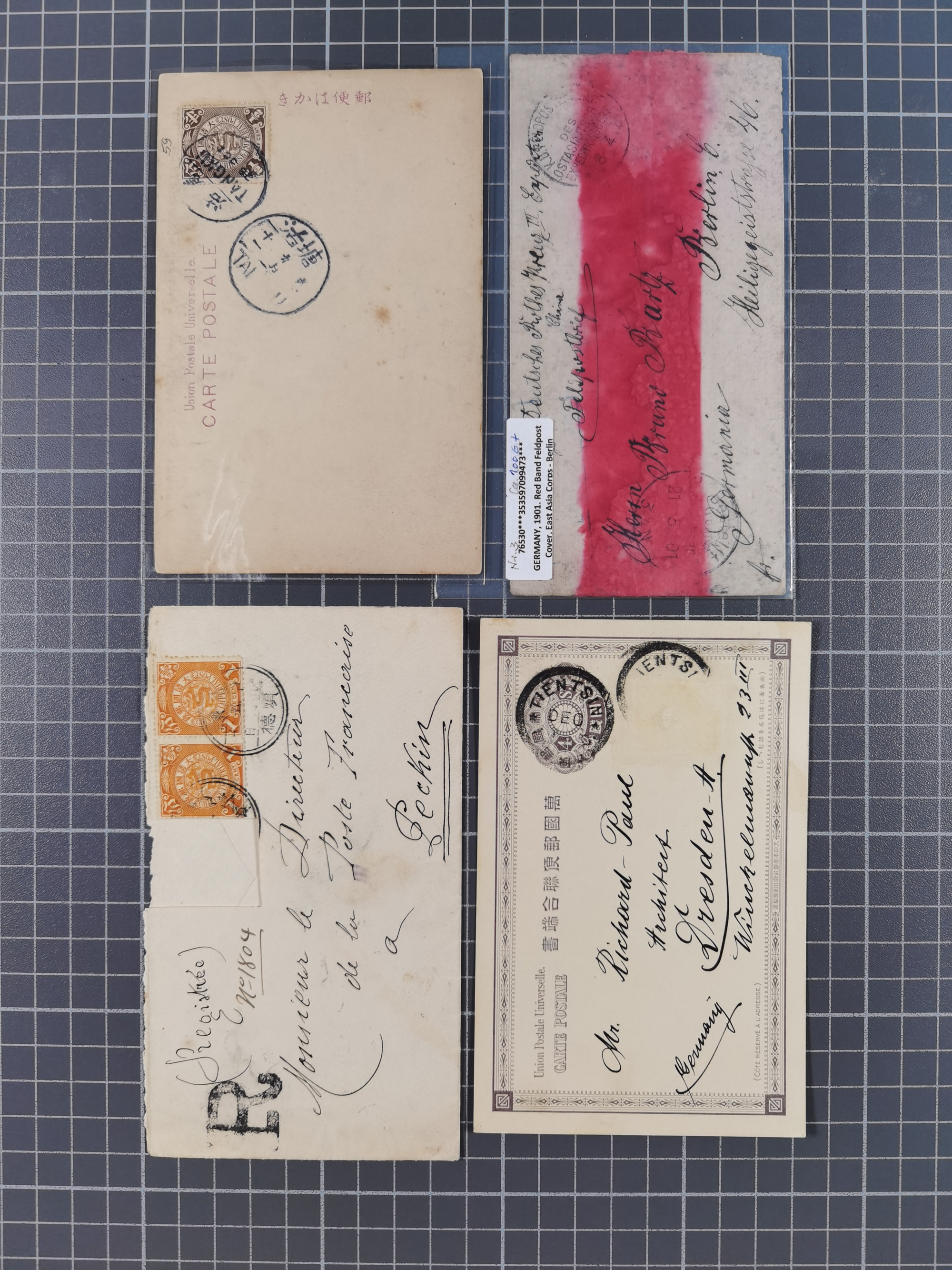 1900/11, postal history group of circa 65 covers and cards, mostly foreign destinations, many attractive and interesting usages including mixed frankings at the Treaty Ports, noted French, Japanese, German and Russian Offices, a fine part of German Fieldpost markings, together with an abundance of multicolour Coiled Dragons frankings, some postal stationeries, local post Cheefoo, etc., mixed condition. A delightful specialist lot