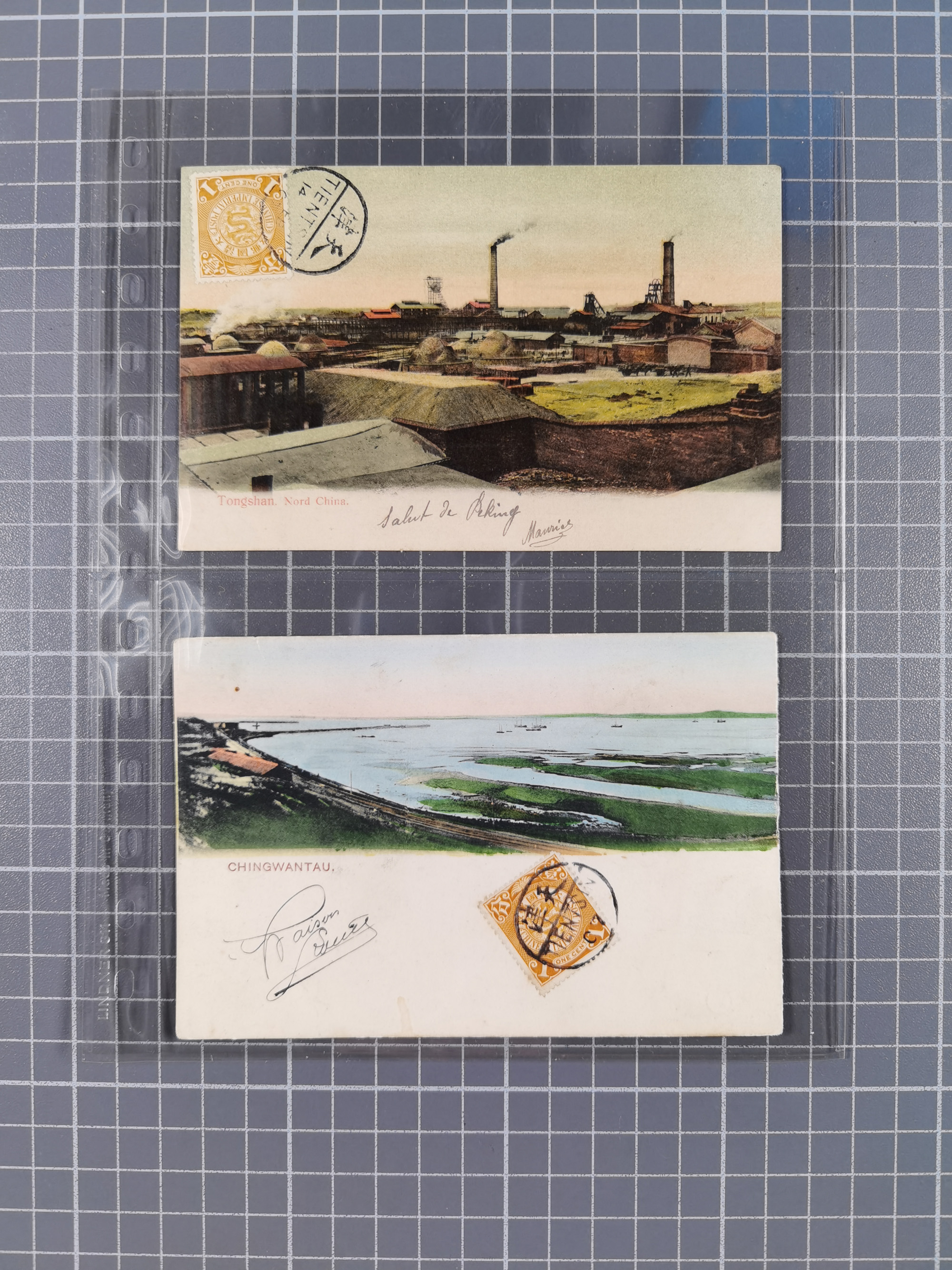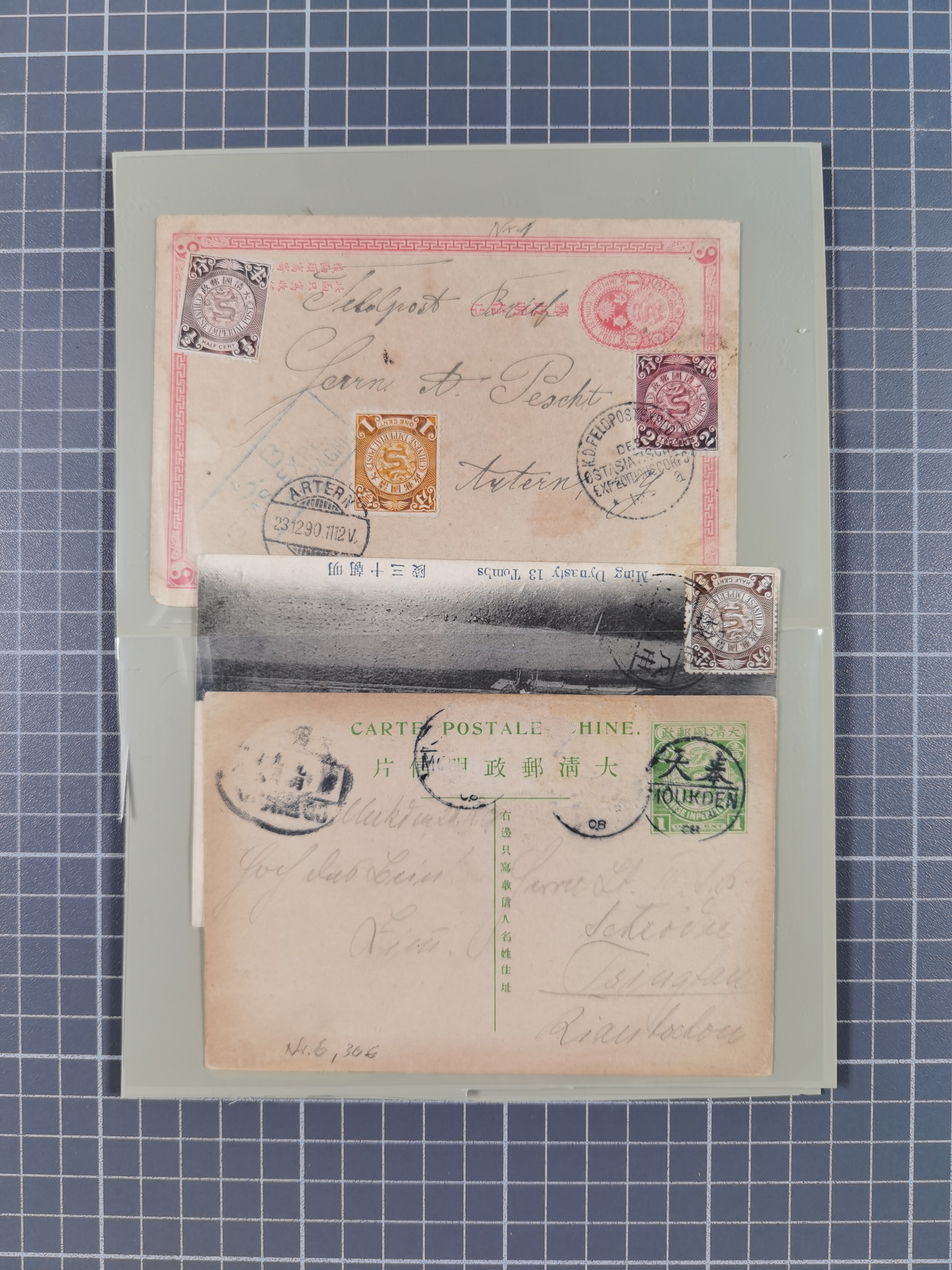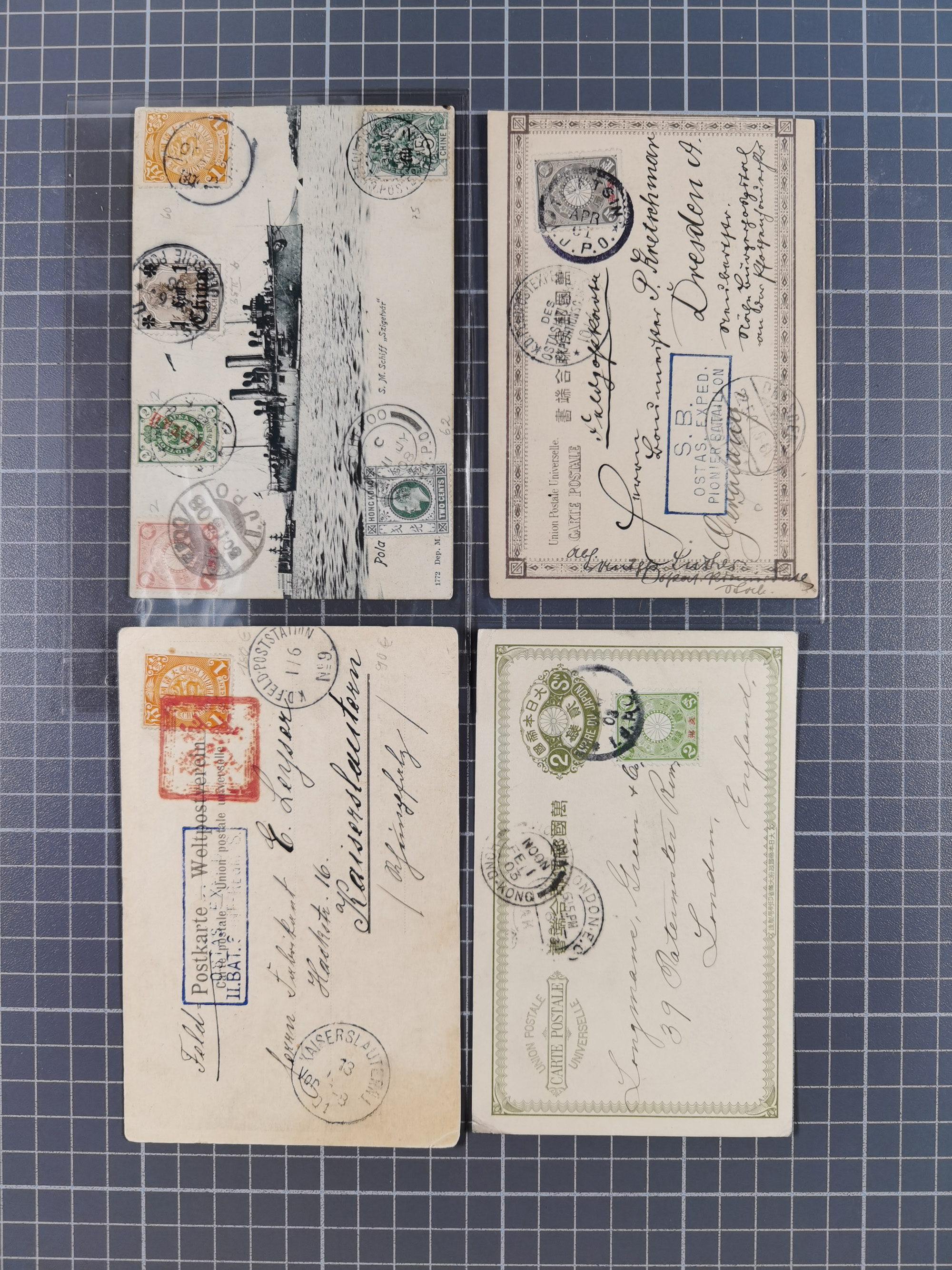 1900/11, postal history group of circa 65 covers and cards, mostly foreign destinations, many attractive and interesting usages including mixed frankings at the Treaty Ports, noted French, Japanese, German and Russian Offices, a fine part of German Fieldpost markings, together with an abundance of multicolour Coiled Dragons frankings, some postal stationeries, local post Cheefoo, etc., mixed condition. A delightful specialist lot