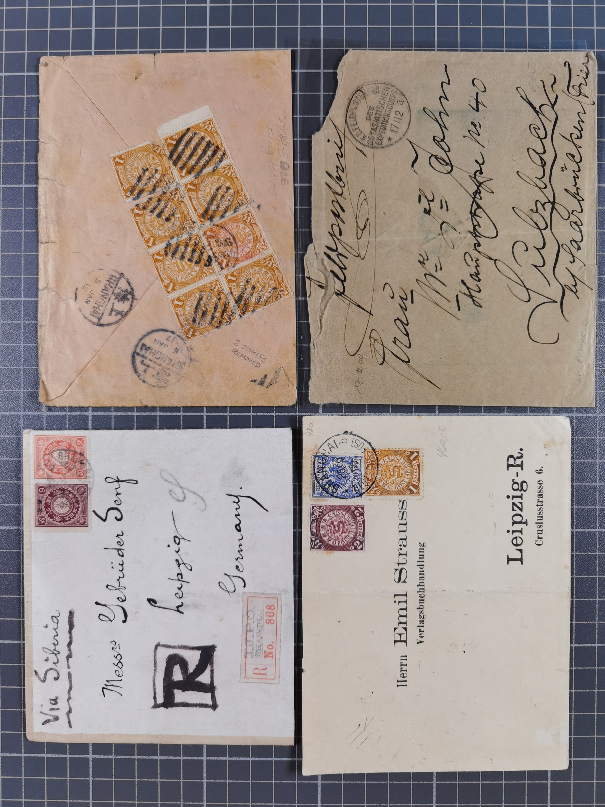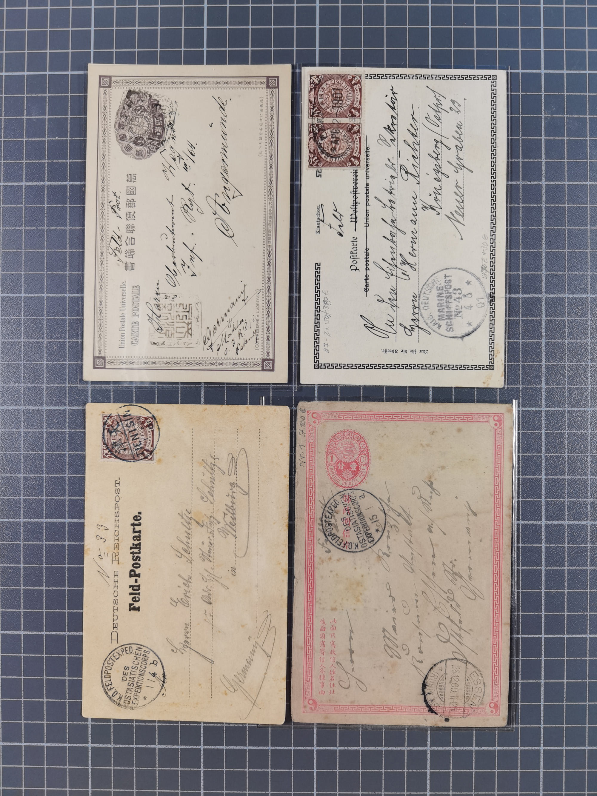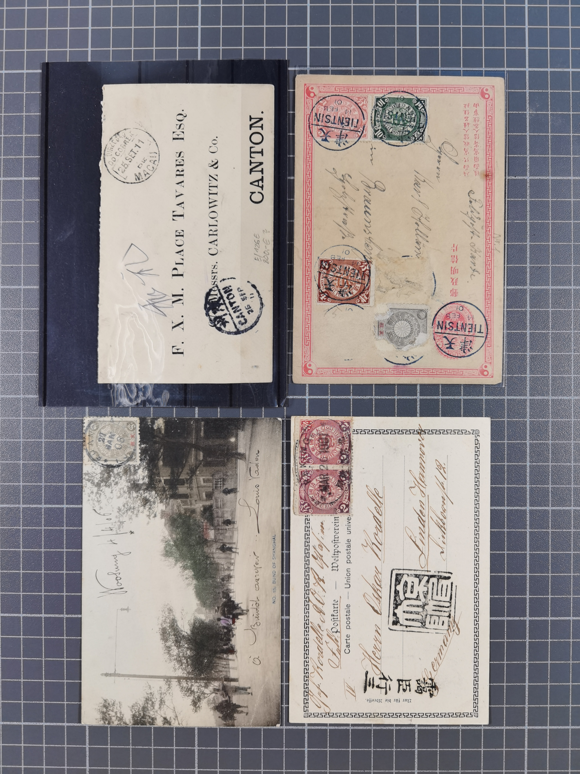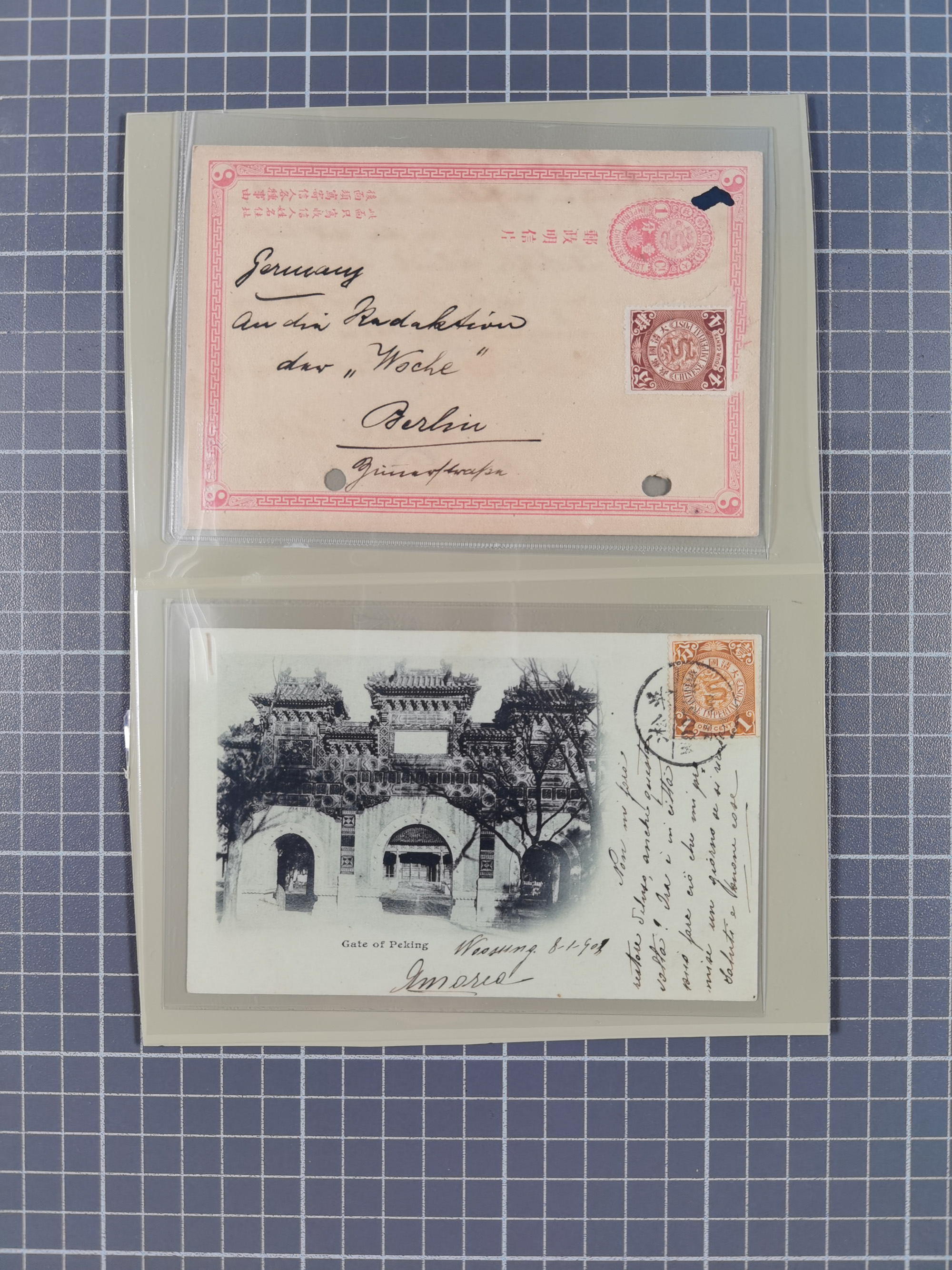 1900/11, postal history group of circa 65 covers and cards, mostly foreign destinations, many attractive and interesting usages including mixed frankings at the Treaty Ports, noted French, Japanese, German and Russian Offices, a fine part of German Fieldpost markings, together with an abundance of multicolour Coiled Dragons frankings, some postal stationeries, local post Cheefoo, etc., mixed condition. A delightful specialist lot