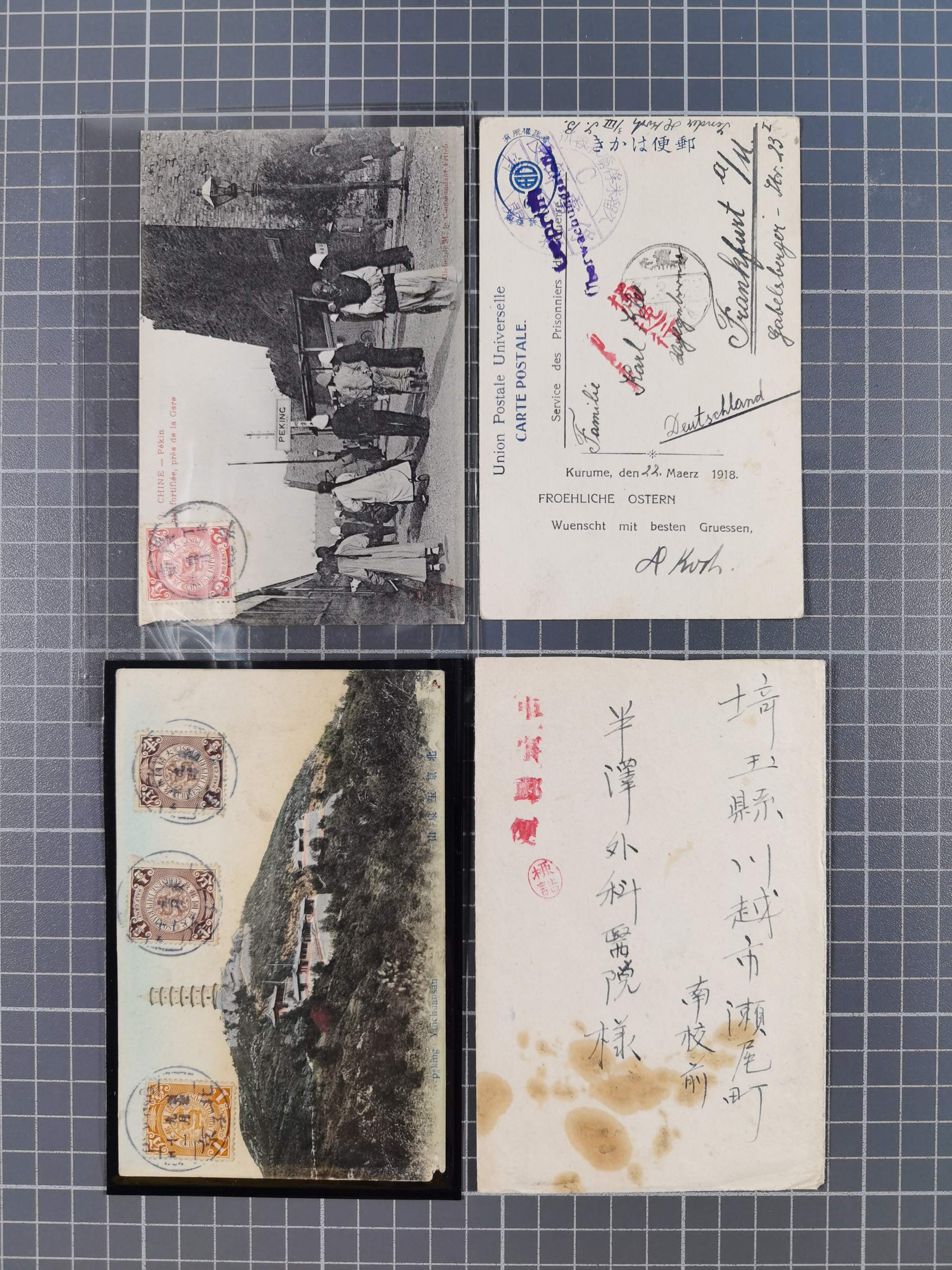 1912/20 (ca.), Chinese Republic early years, group of 13 covers and cards, noted 1 c. overprinted coiled dragon (x4) used with “PEKING” to 1913 postcard to Italy with unusual “ITALY = VIA SIBERIA” straight-line marking, also some stampless mail, printed matter, etc., together with 5 postcards franked with Japanese issues with cds. "TIENTSIN", “DAIREN”, etc., overall in good condition