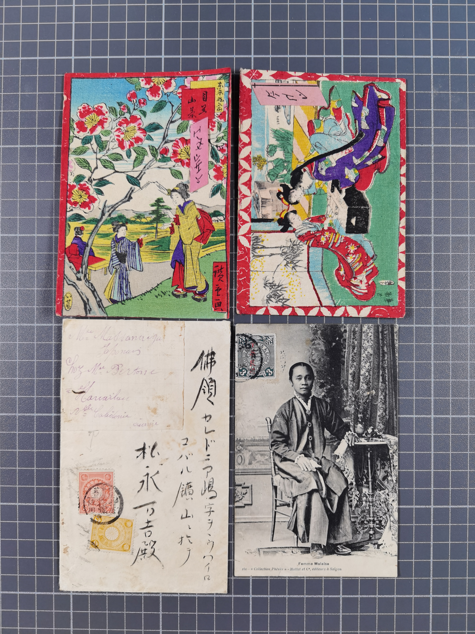 1 c. ocher, four singles neatly tied by cds “SHANGHAI 7 JUN 01” to postcard to Paris, France, handed over to the French Office with Sage 10 c. black/lilac tied in transit with cds “SHANGHAI CHINE 7 JUIN 01” repeated alongside; one 1 c. with negligible soiling at a corner, still very fine and attractive, certificate Haveman BPP (2024)