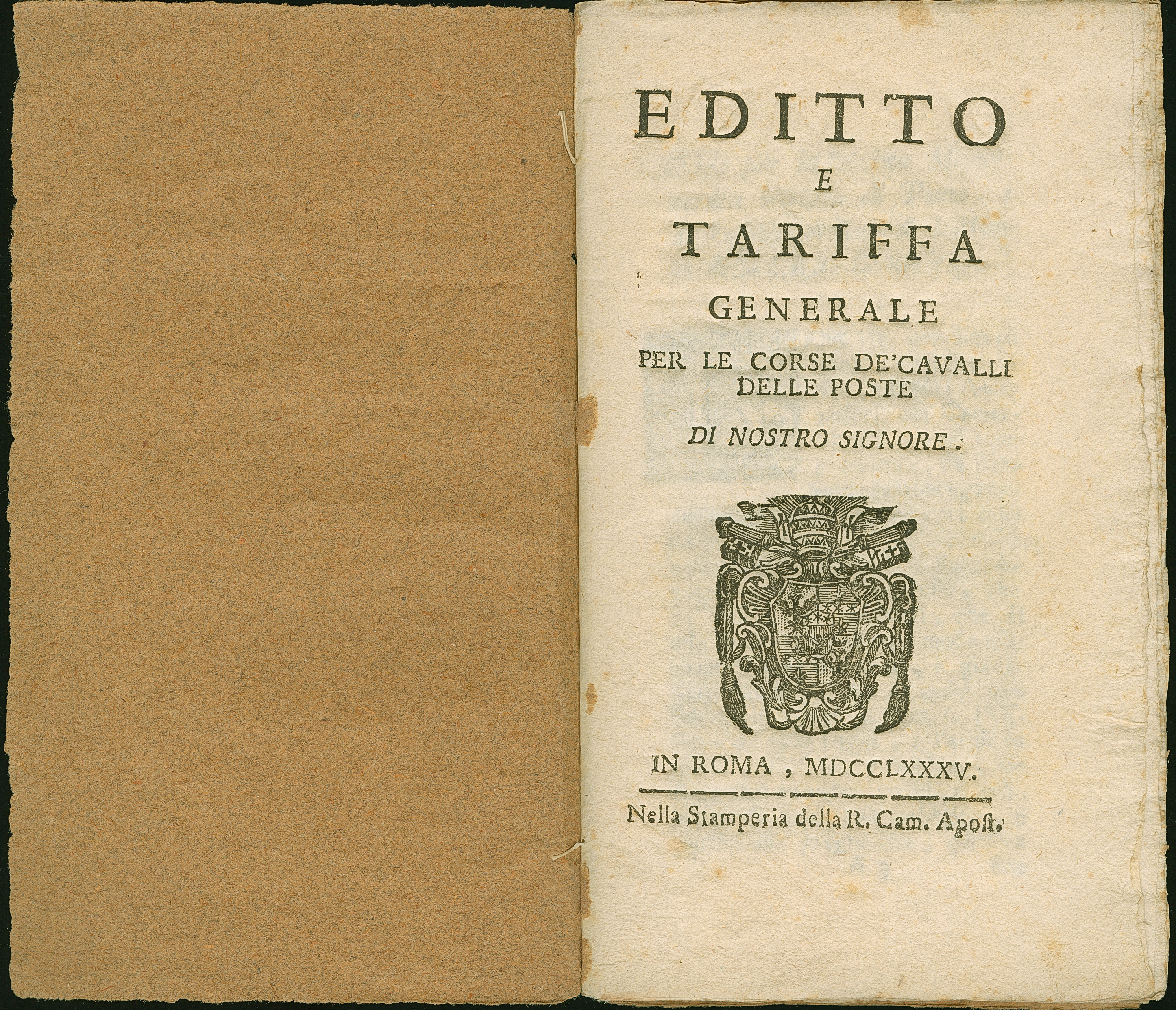 1785, “Editto e Tariffa Generale per le Corse de Cavalli delle Poste di Nostro Signore”, postage rates book, good condition, possibly unique