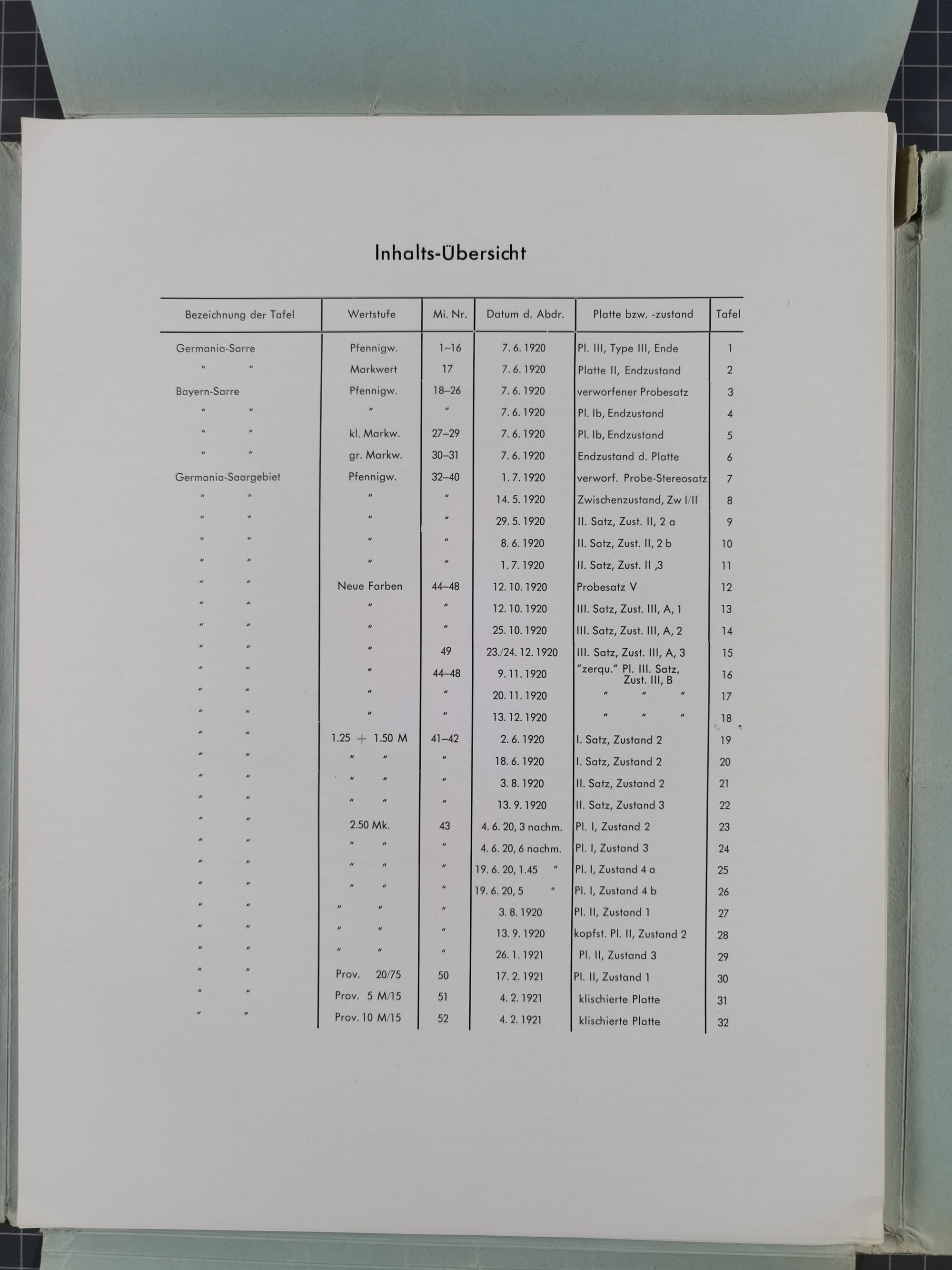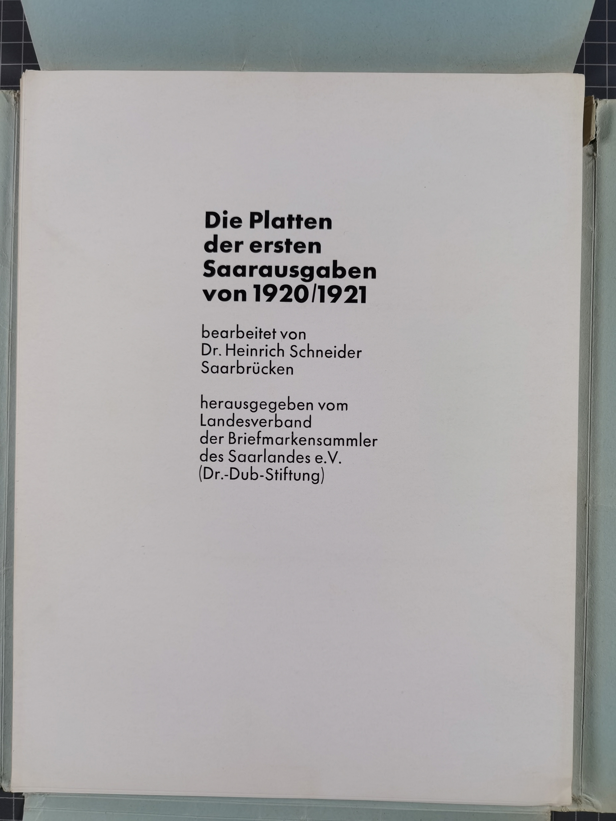 Dr. Heinrich Schneider: “Die Platten der ersten Saarausgaben von 1920/1921”, Tafelwerk mit 32 Tafeln sowie 2 Seiten Vorwort, in Schutzumschlag mit Einführungstext von P. Seguy. Dieser und die einzelnen Tafeln etwas bestoßen.