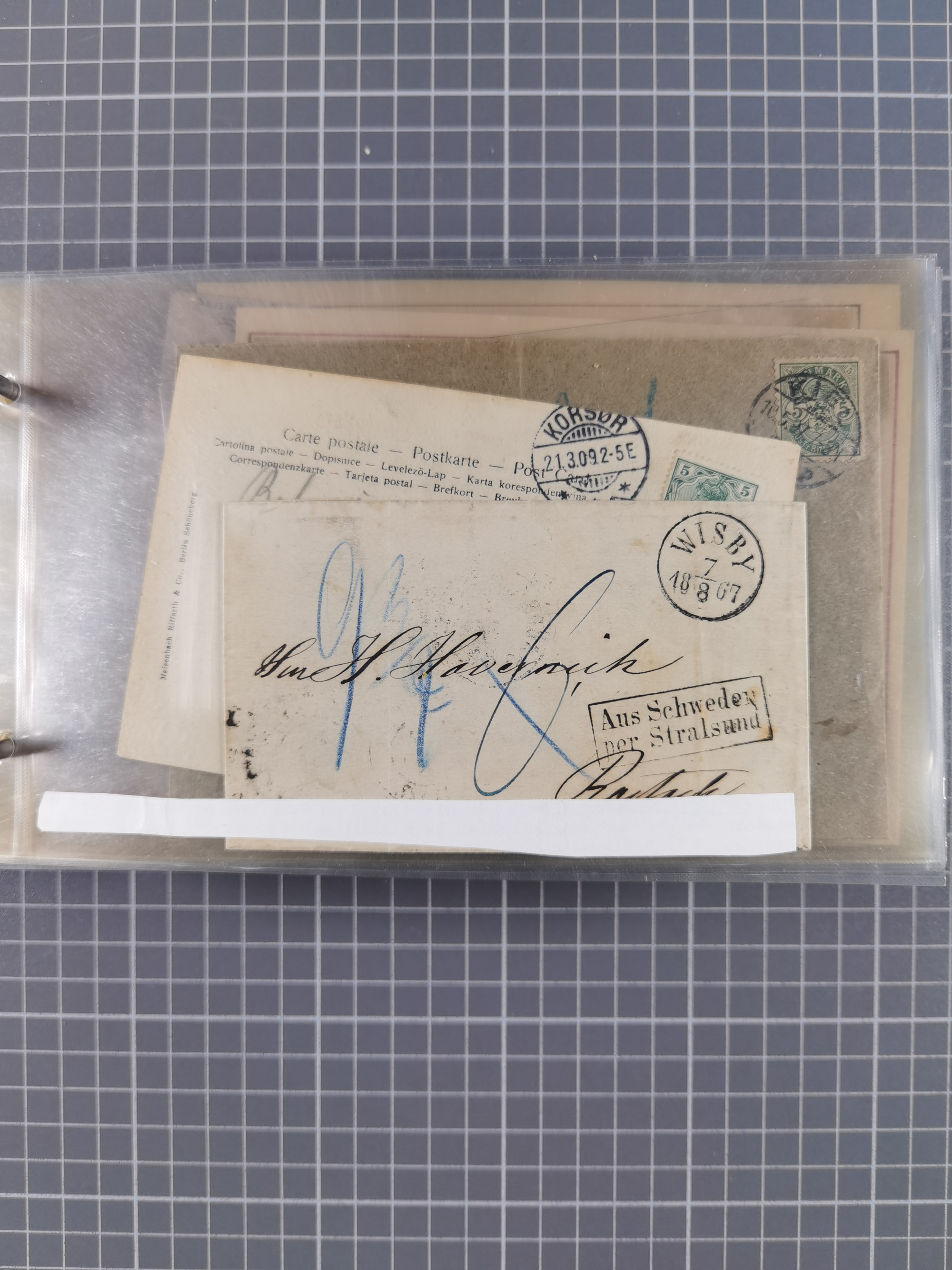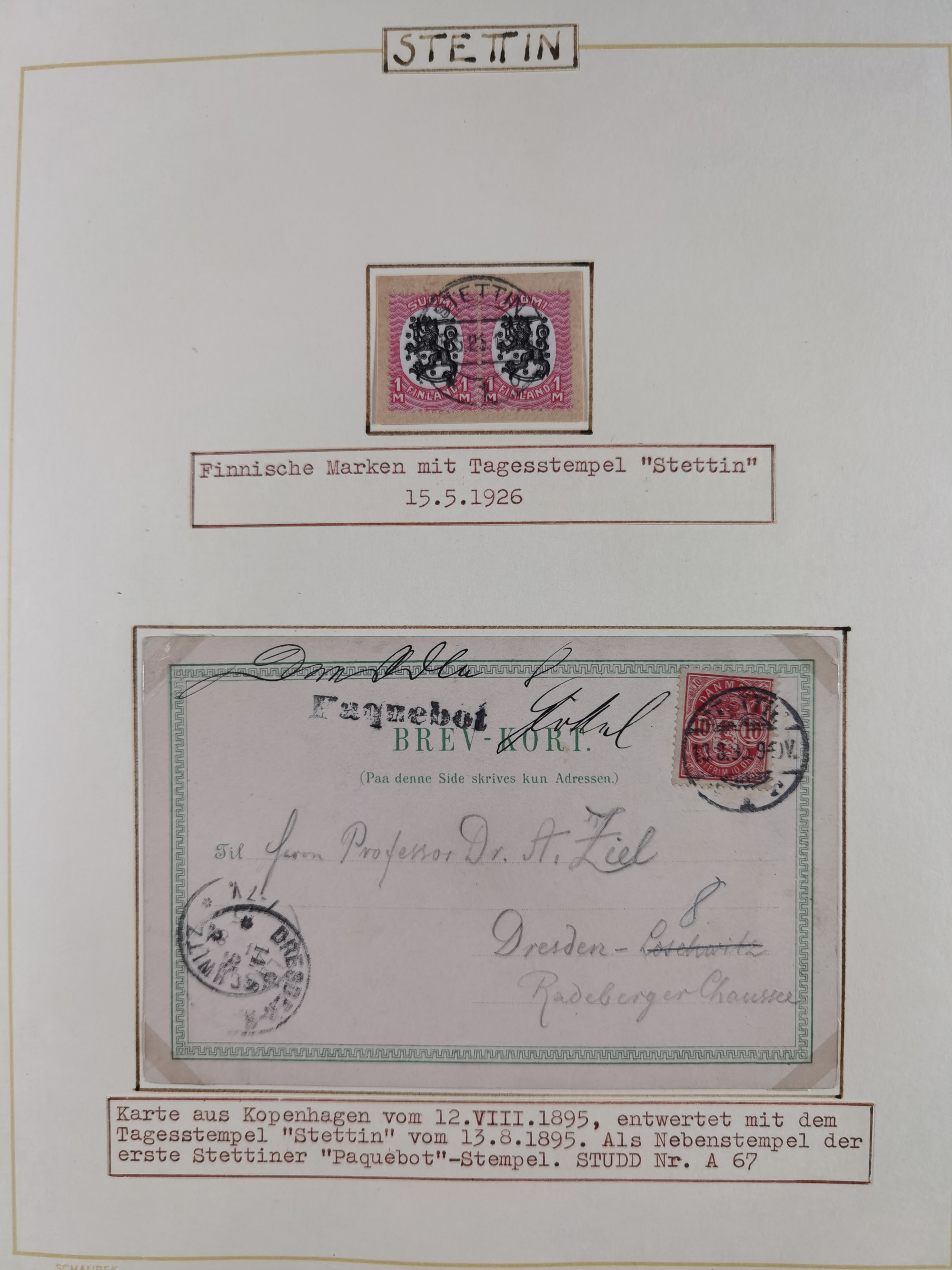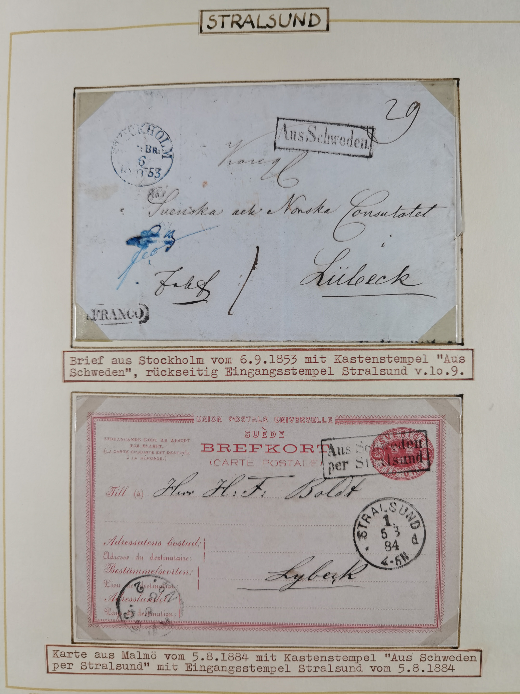 1853/1970 (ca.), interessante Sammlung “Schiffspost der Ostsee” mit Schwerpunkt bei den Anlandungsstempeln, ca 130 Briefe, Karten und GSK sowie einigen Briefstücken und losen Marken mit u.a. GSK 1874 mit Ra3 “AUS WOLLIN PER DAMPFSCHIFF 5.10.74”, GSK 1893 mit Ra2" Aus Schweden per Stralsund", Ansichtskarte 1909 mit Ra3 “KPSOR-KIEL…No. 4 20/3” und Brief aus Dänemark 1939 mit L1 “Fra Borholm”. Die Erhaltung ist zum Teil fehlerhaft, dabei viel Post aus dem Bedarf, ex Steinmeyer