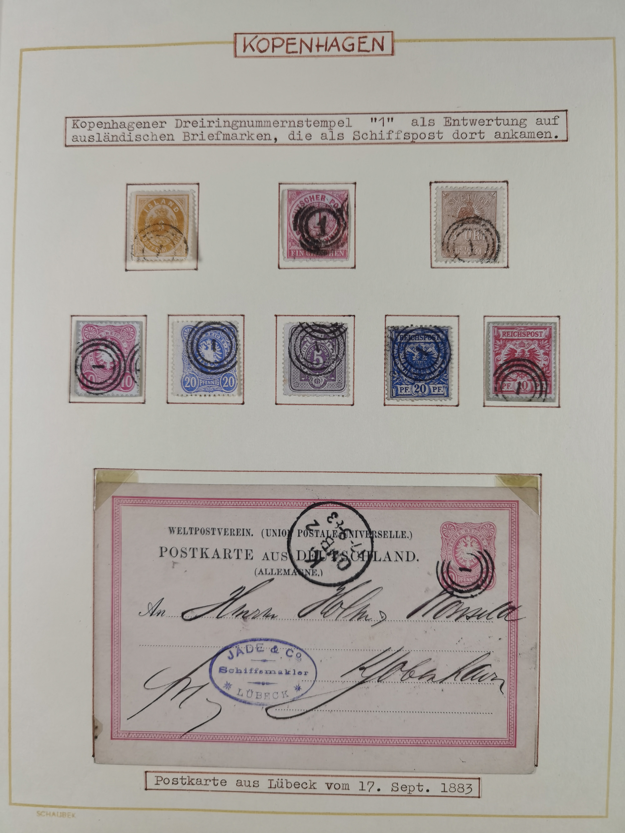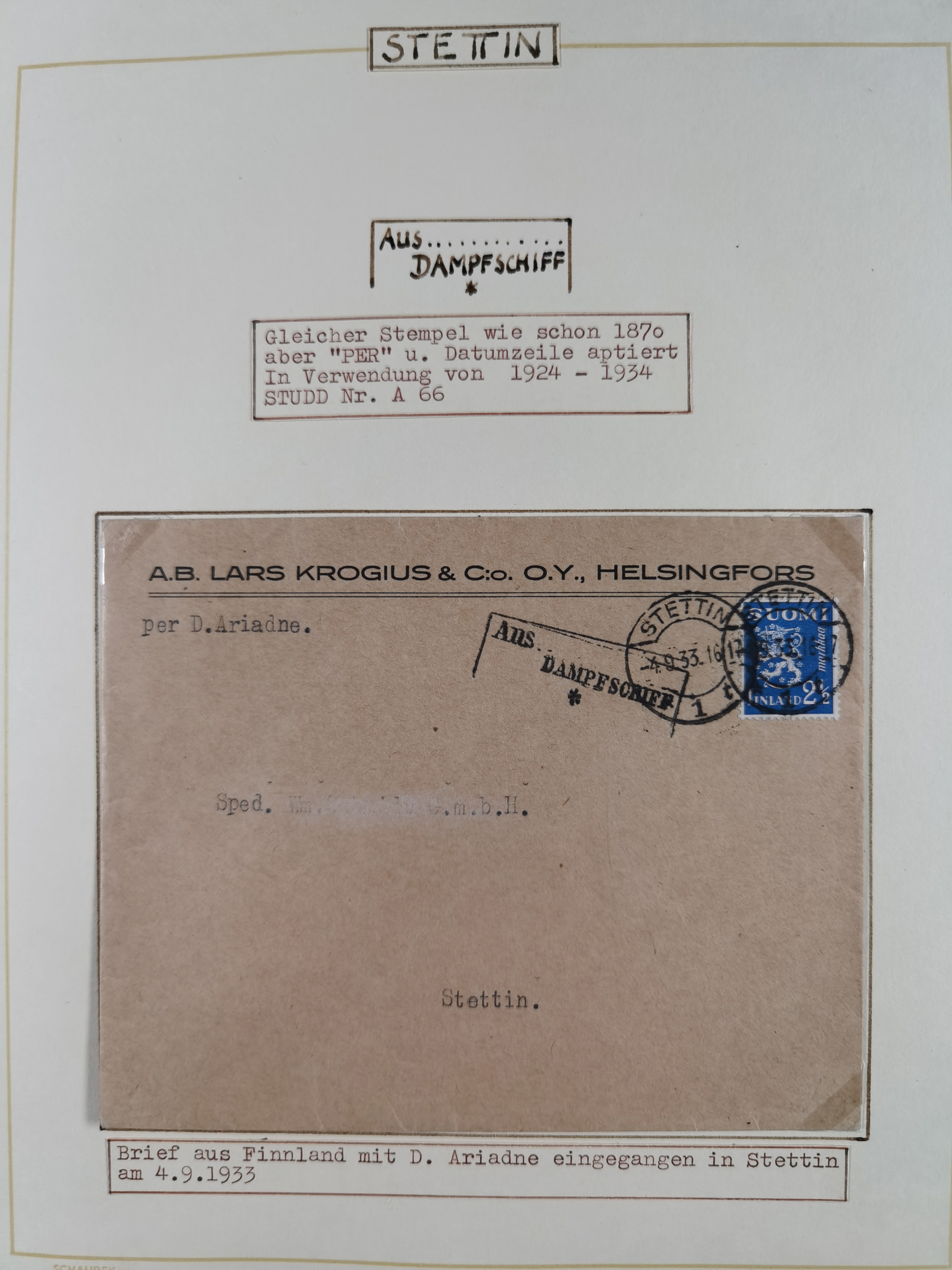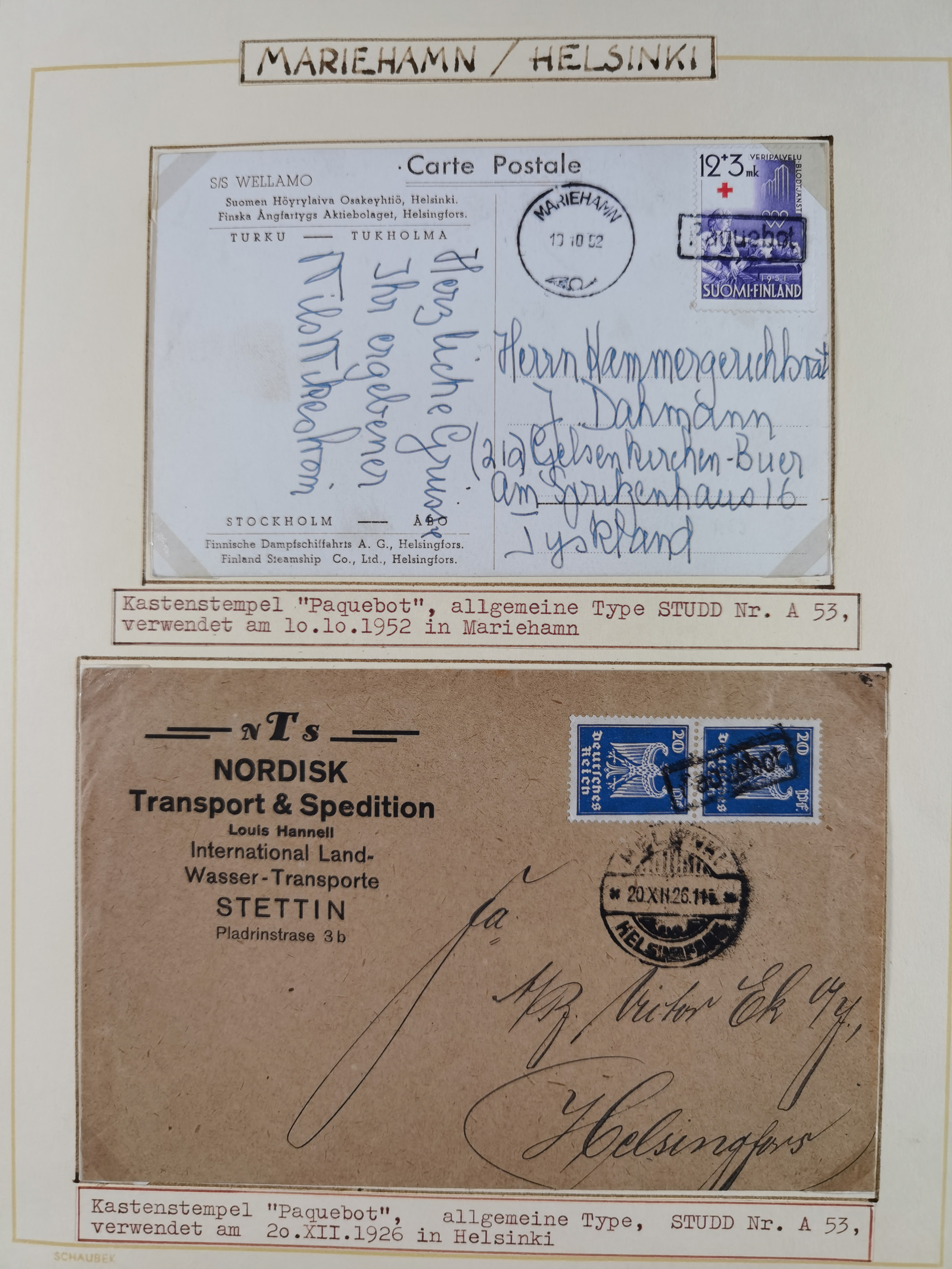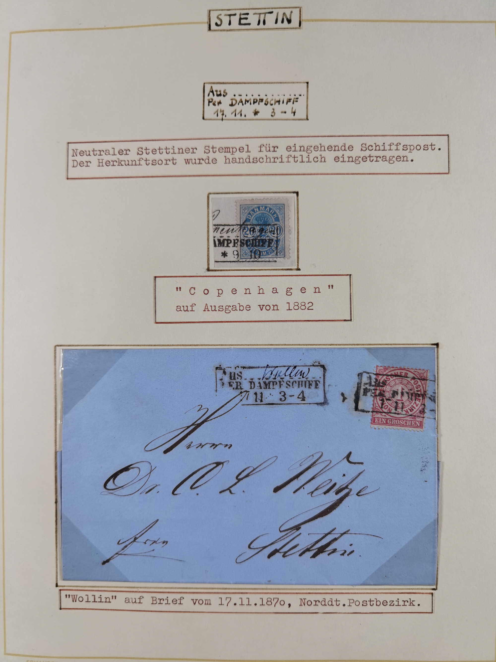 1853/1950, interessante Sammlung “Nordische Schiffspost” inkl. Transit- und Anlandungsstempeln mit fast 60 Briefen, Karten und GSK sowie einigen losen Marken und Briefstücken, dabei u.a. NDP-Faltbrief 1870 mit Ra3" AUS (Wollin) PER DAMPFSCHIFF….", markenloser Faltbrief 1871 mit Rahmenstempel “AUS STETTIN PER DAMPFSCHIFF”, dänischer Nummernstempel “1” auf D. Reich Ganzsachenkarte 10 Pfg,, frankierter Island-Brief mit Stempel “ABERDEEN 1933” und Ra1 “SHIPP LETTER" und einige Briefe mit schwedischen Sonderfahrten-Stempel der 30er-Jahre. Alles auf Albenblättern mit Beschriftung, ex Steinmeyer