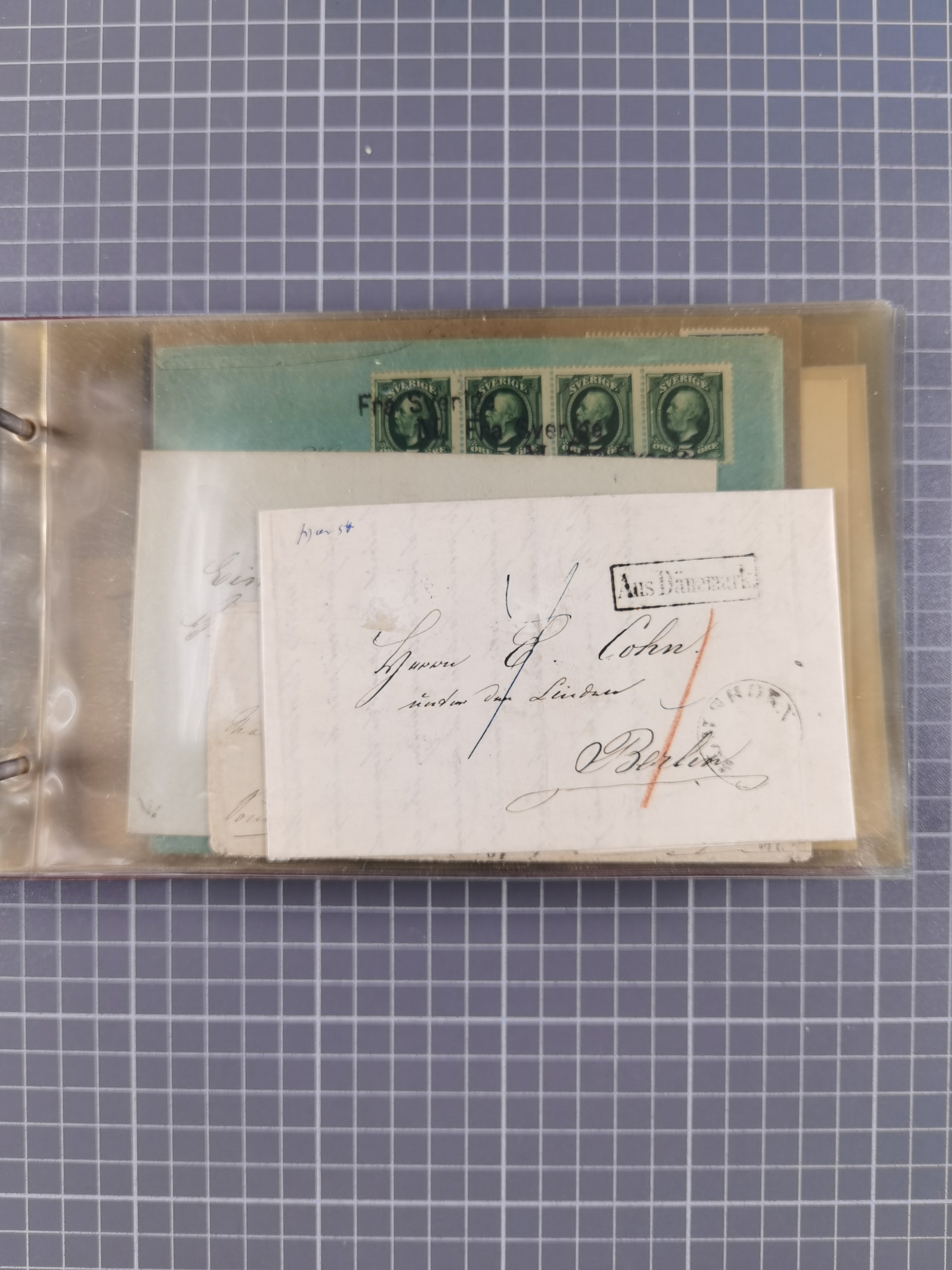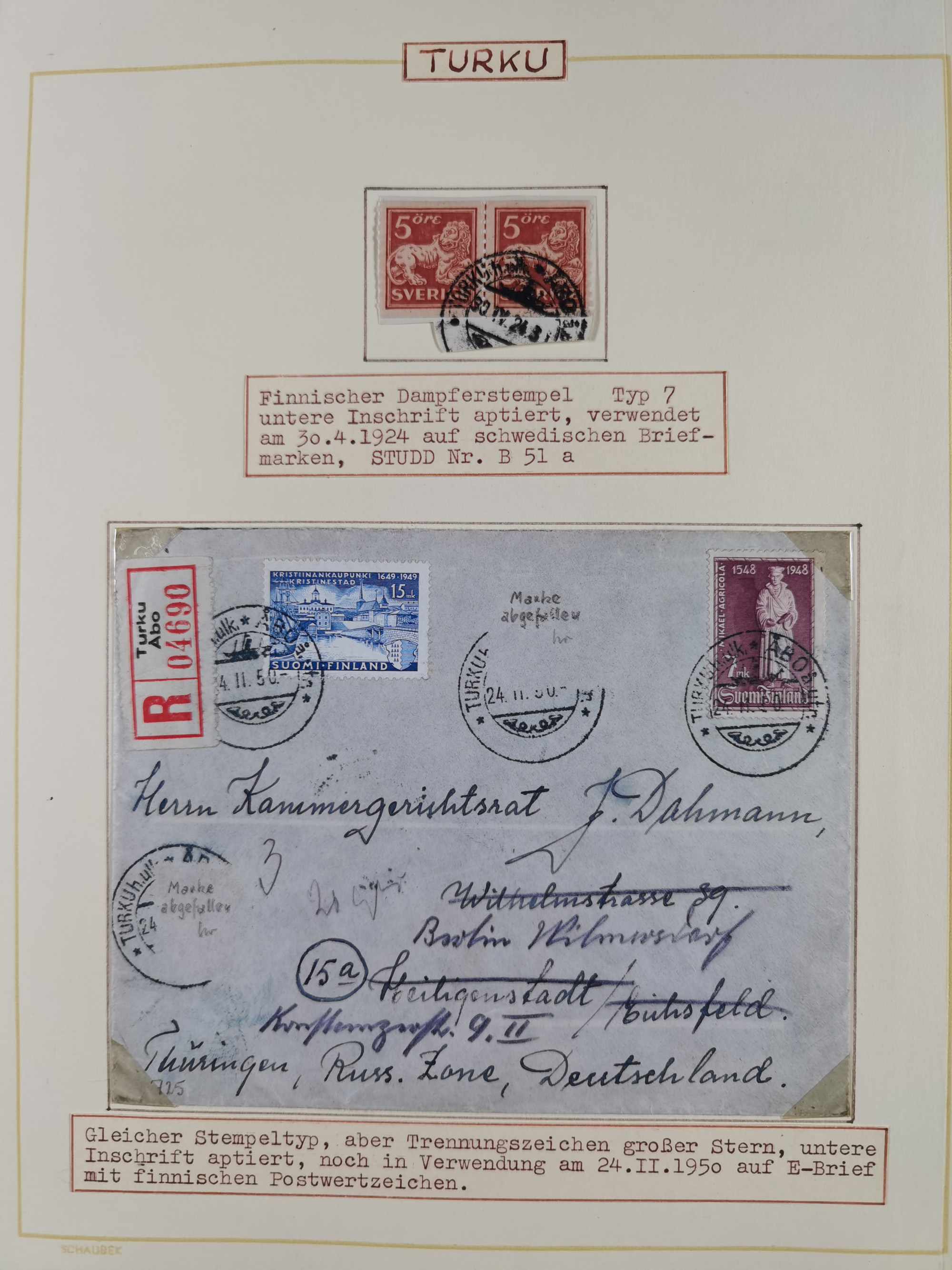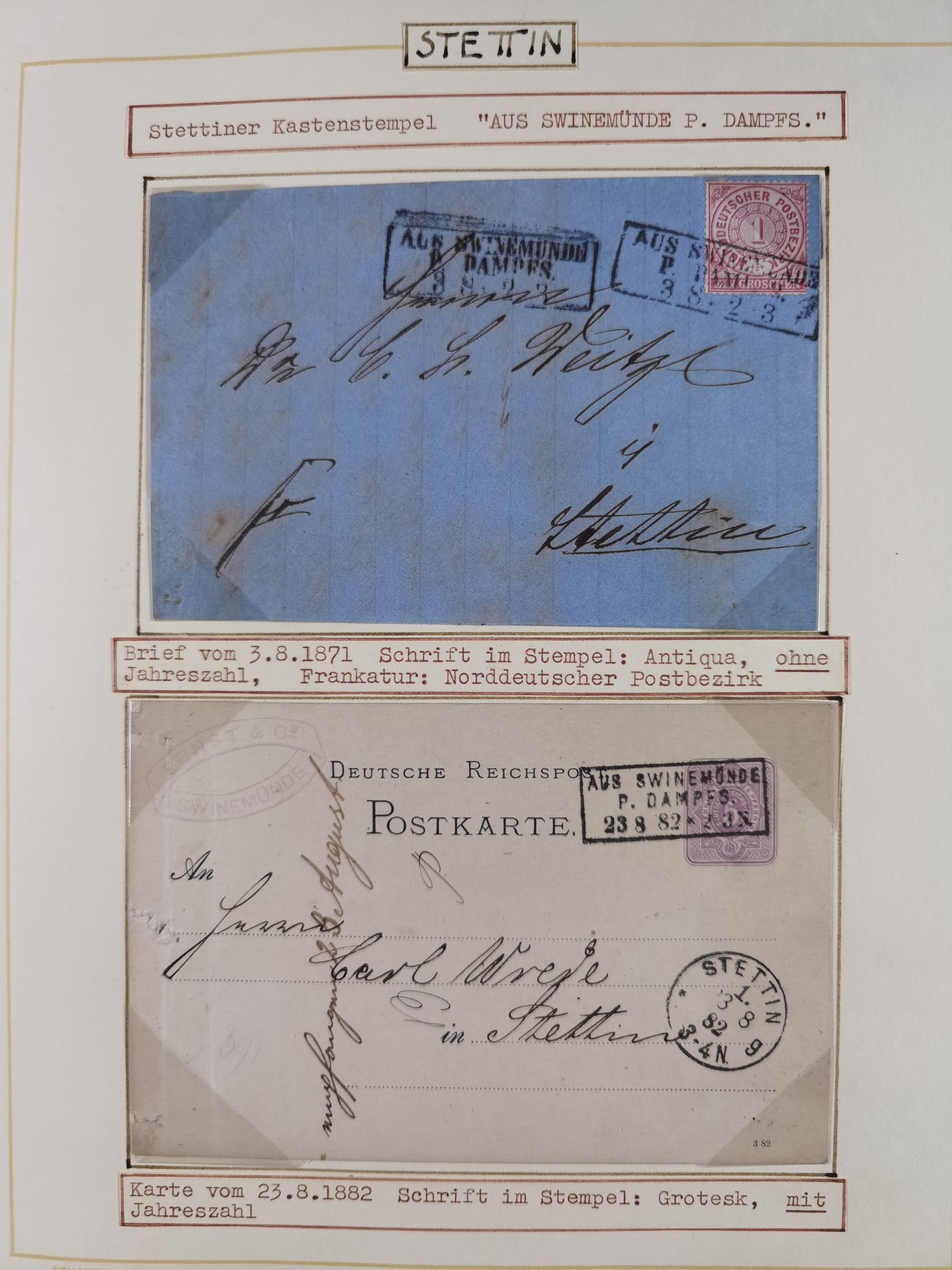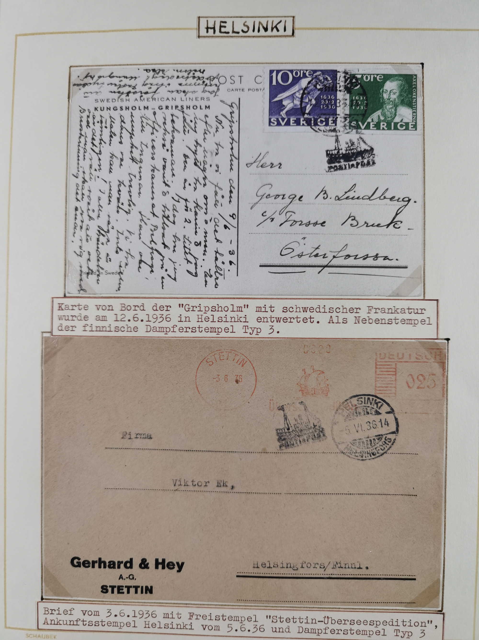 1853/1950, interessante Sammlung “Nordische Schiffspost” inkl. Transit- und Anlandungsstempeln mit fast 60 Briefen, Karten und GSK sowie einigen losen Marken und Briefstücken, dabei u.a. NDP-Faltbrief 1870 mit Ra3" AUS (Wollin) PER DAMPFSCHIFF….", markenloser Faltbrief 1871 mit Rahmenstempel “AUS STETTIN PER DAMPFSCHIFF”, dänischer Nummernstempel “1” auf D. Reich Ganzsachenkarte 10 Pfg,, frankierter Island-Brief mit Stempel “ABERDEEN 1933” und Ra1 “SHIPP LETTER" und einige Briefe mit schwedischen Sonderfahrten-Stempel der 30er-Jahre. Alles auf Albenblättern mit Beschriftung, ex Steinmeyer