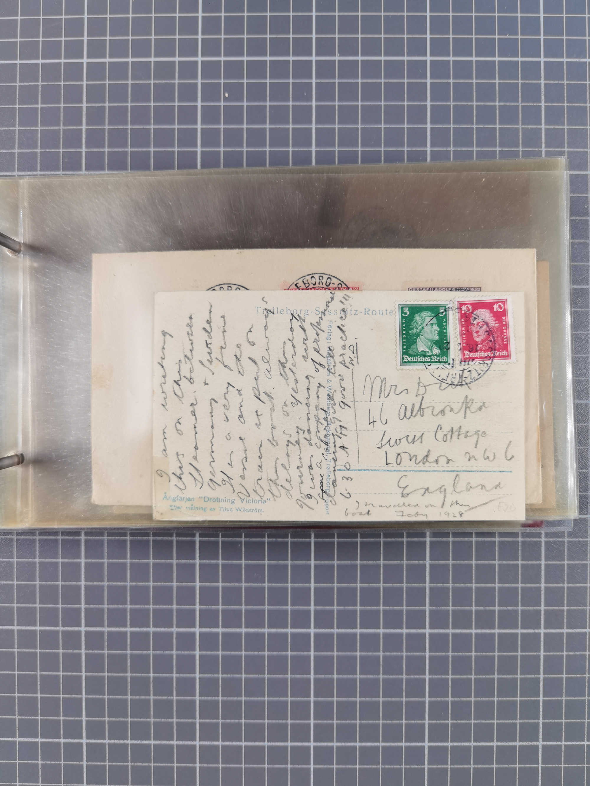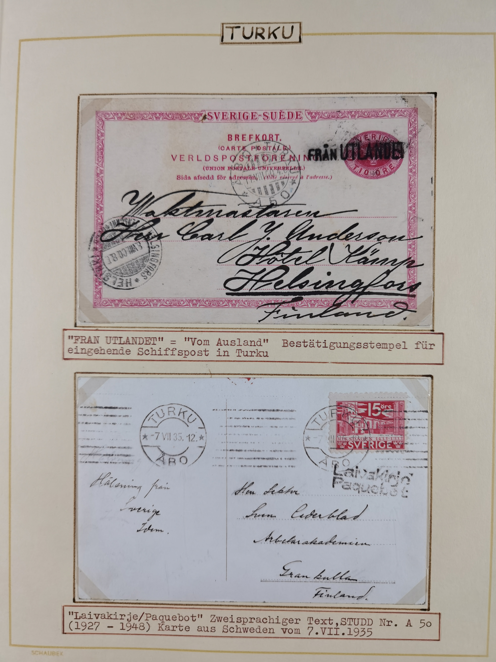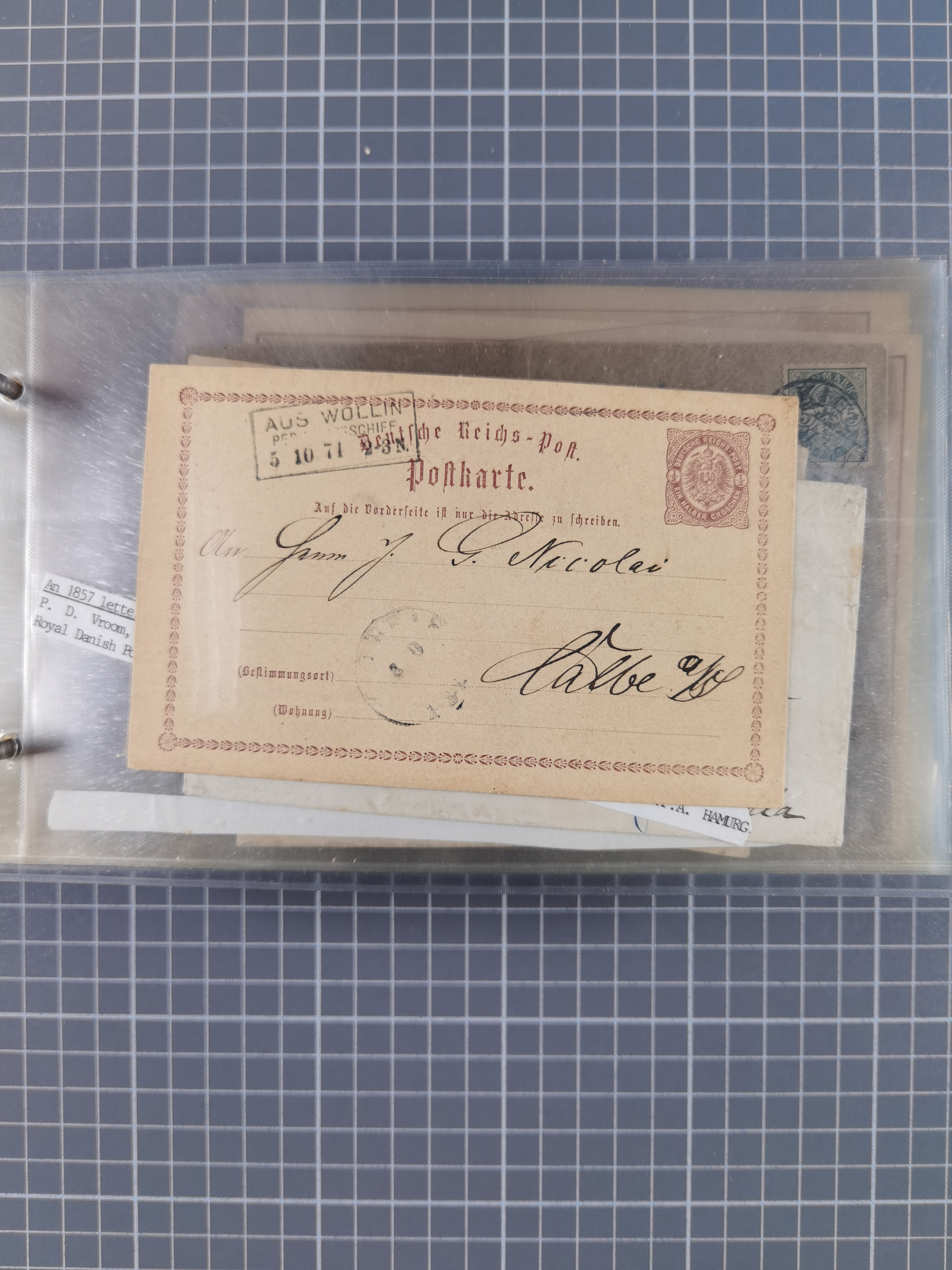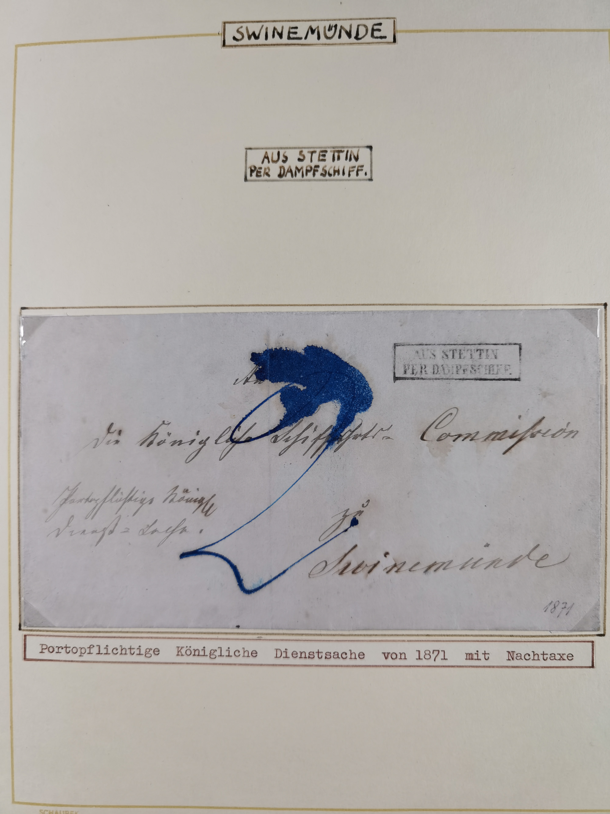 1853/1950, interessante Sammlung “Nordische Schiffspost” inkl. Transit- und Anlandungsstempeln mit fast 60 Briefen, Karten und GSK sowie einigen losen Marken und Briefstücken, dabei u.a. NDP-Faltbrief 1870 mit Ra3" AUS (Wollin) PER DAMPFSCHIFF….", markenloser Faltbrief 1871 mit Rahmenstempel “AUS STETTIN PER DAMPFSCHIFF”, dänischer Nummernstempel “1” auf D. Reich Ganzsachenkarte 10 Pfg,, frankierter Island-Brief mit Stempel “ABERDEEN 1933” und Ra1 “SHIPP LETTER" und einige Briefe mit schwedischen Sonderfahrten-Stempel der 30er-Jahre. Alles auf Albenblättern mit Beschriftung, ex Steinmeyer