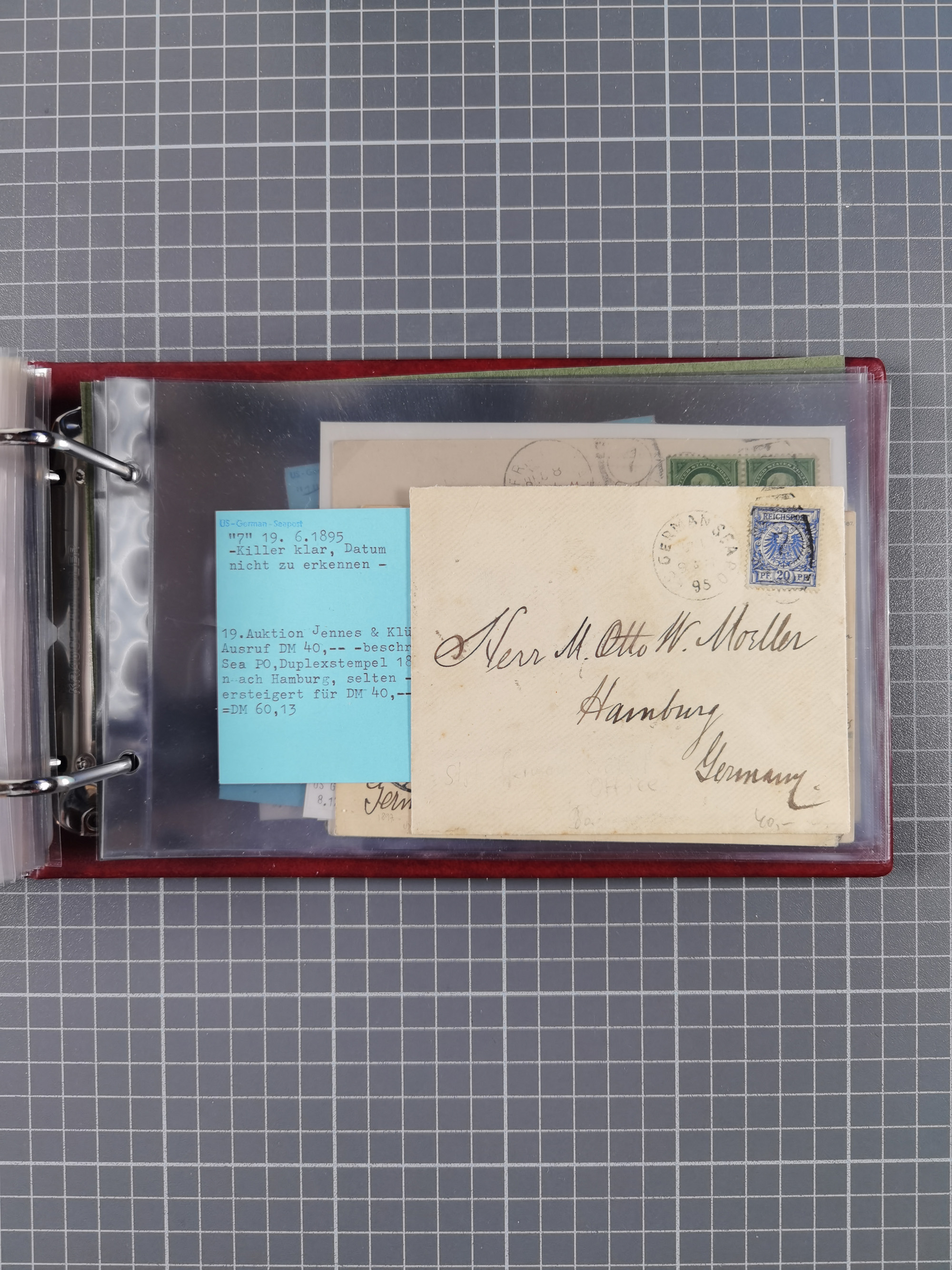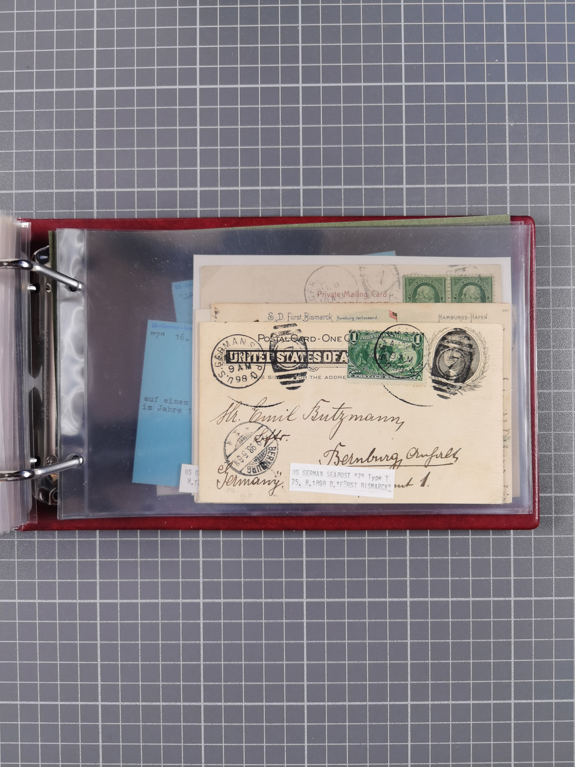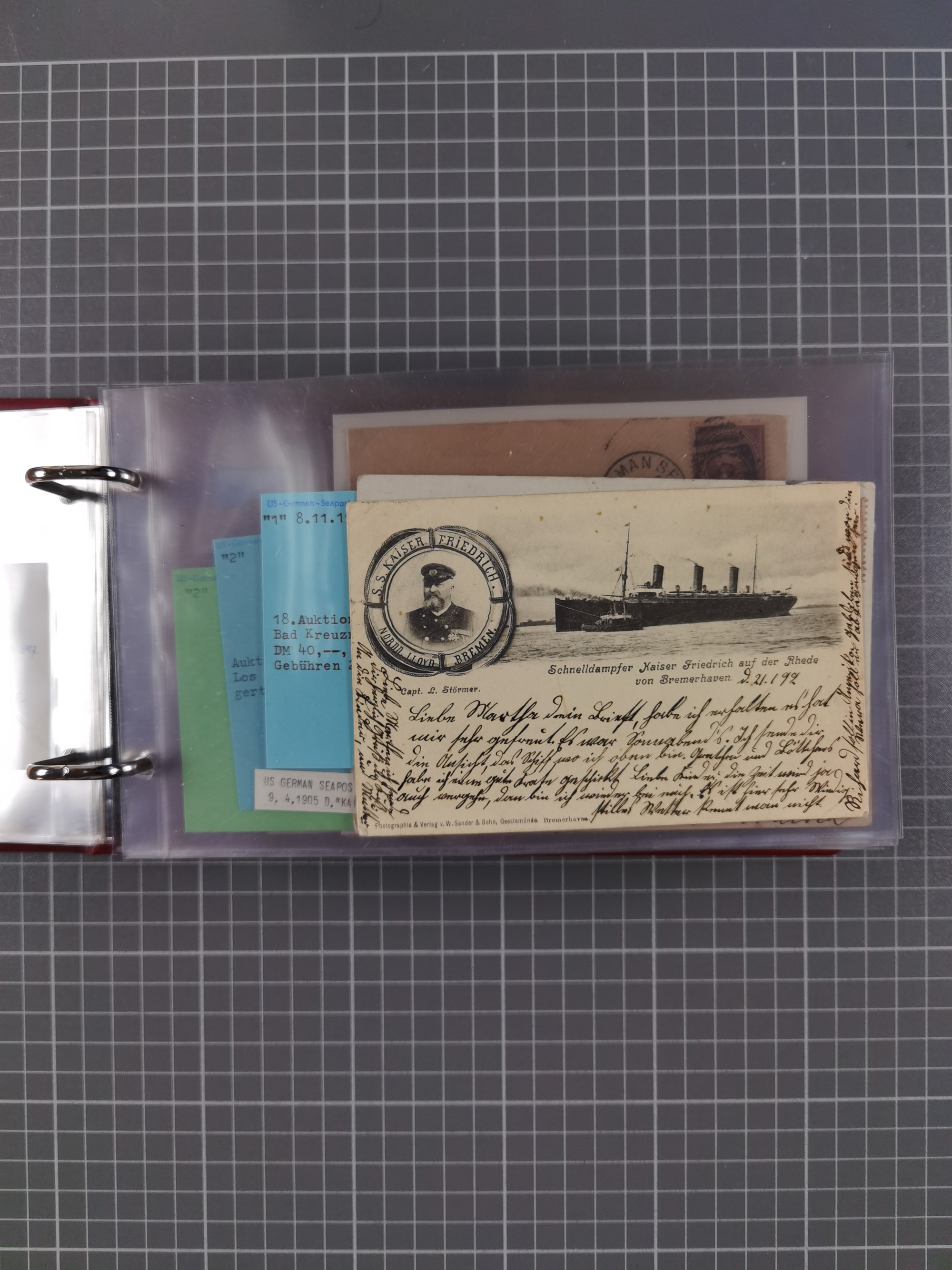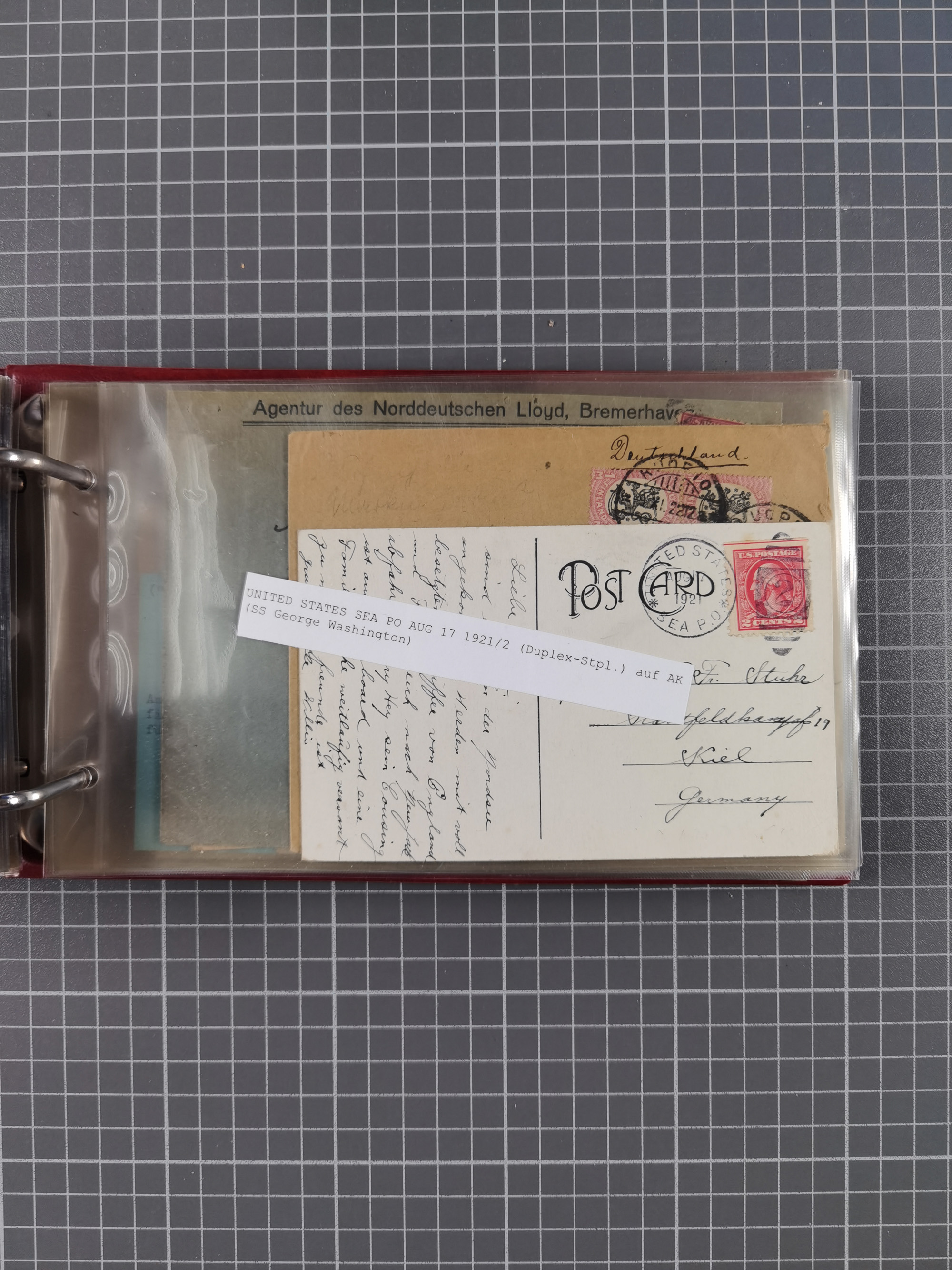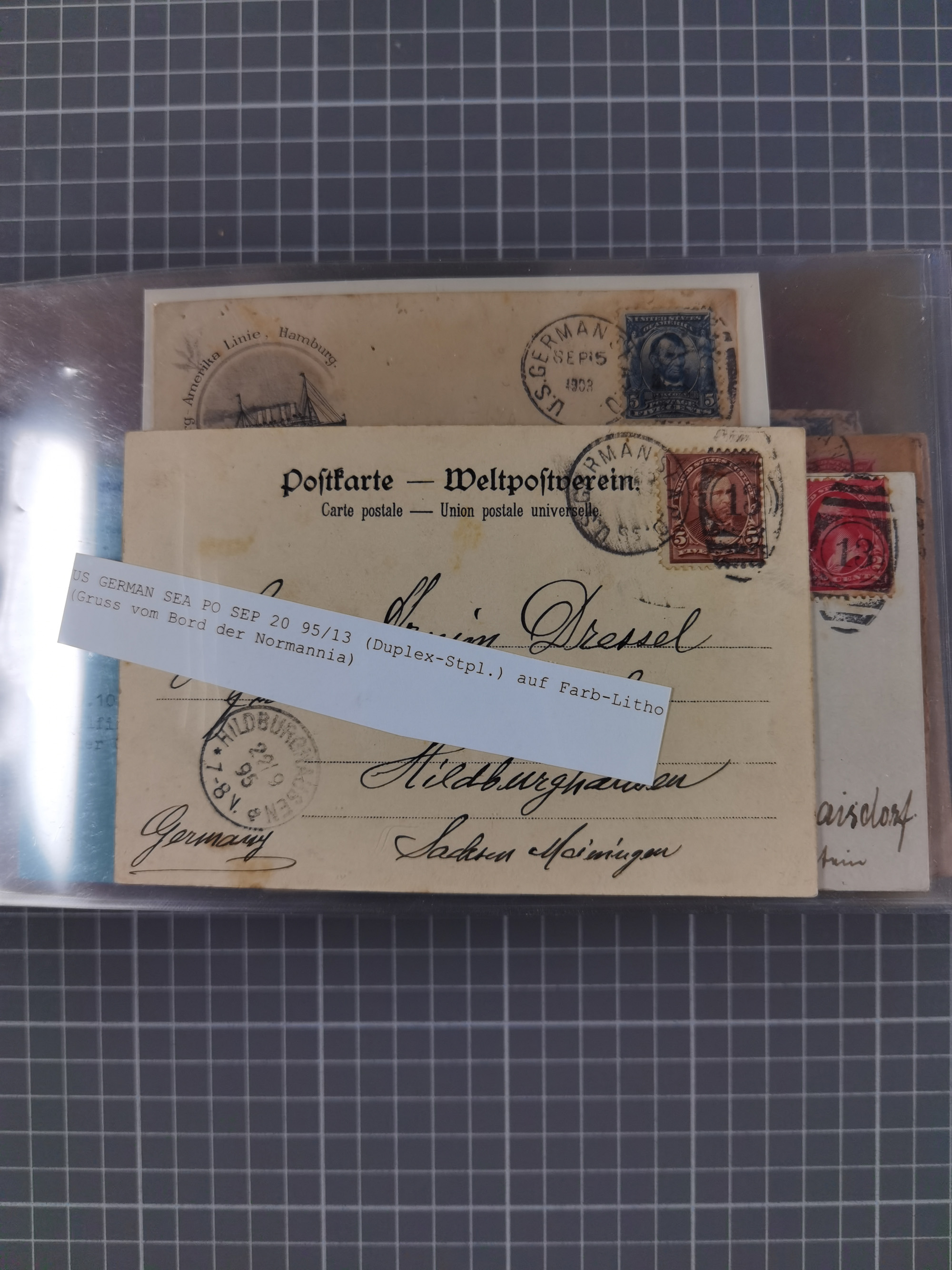 1892/1939, umfangreiche Sammlung “U.S. GERMAN SEA POST” mit ca. 400 Briefen, Karten und Ganzsachen, Schwerpunkt vor 1920 mit den Dublex-Stempeln mit Nr. 1-16, dabei verschiedene Verwendungen mit besseren (u.a. auf Briefen/Karten vom D. Reich), 1 R-GSU und weiteren Besonderheiten. Dazu noch einige Schiffs-Ansichtskarten, bei vielen Belegen mit Vermerken zu den Schiffen usw. und meist in guter Erhaltung. Eine in diesem Umfang seltene Sammlung in sechs Alben, ex Steinmeyer