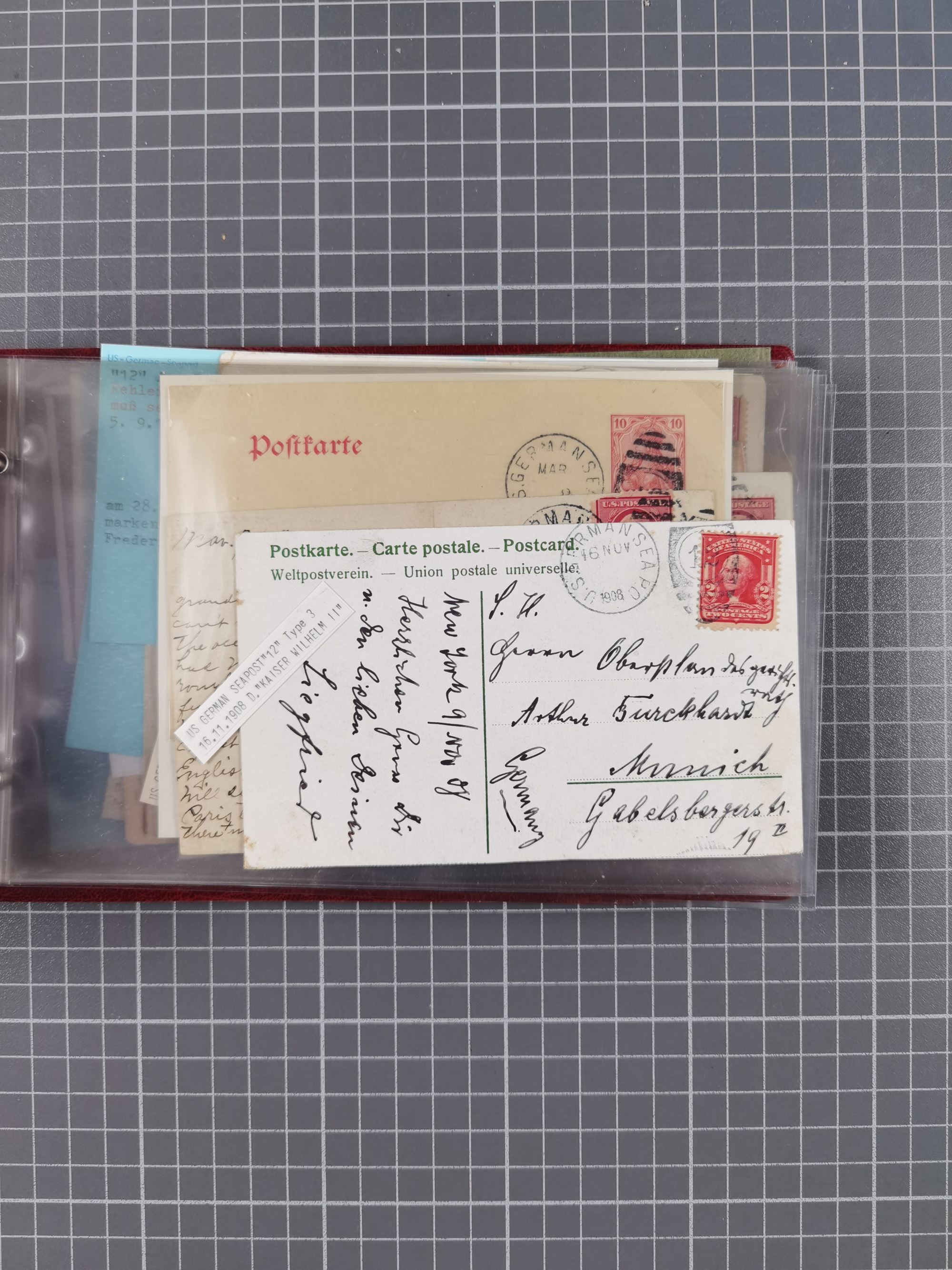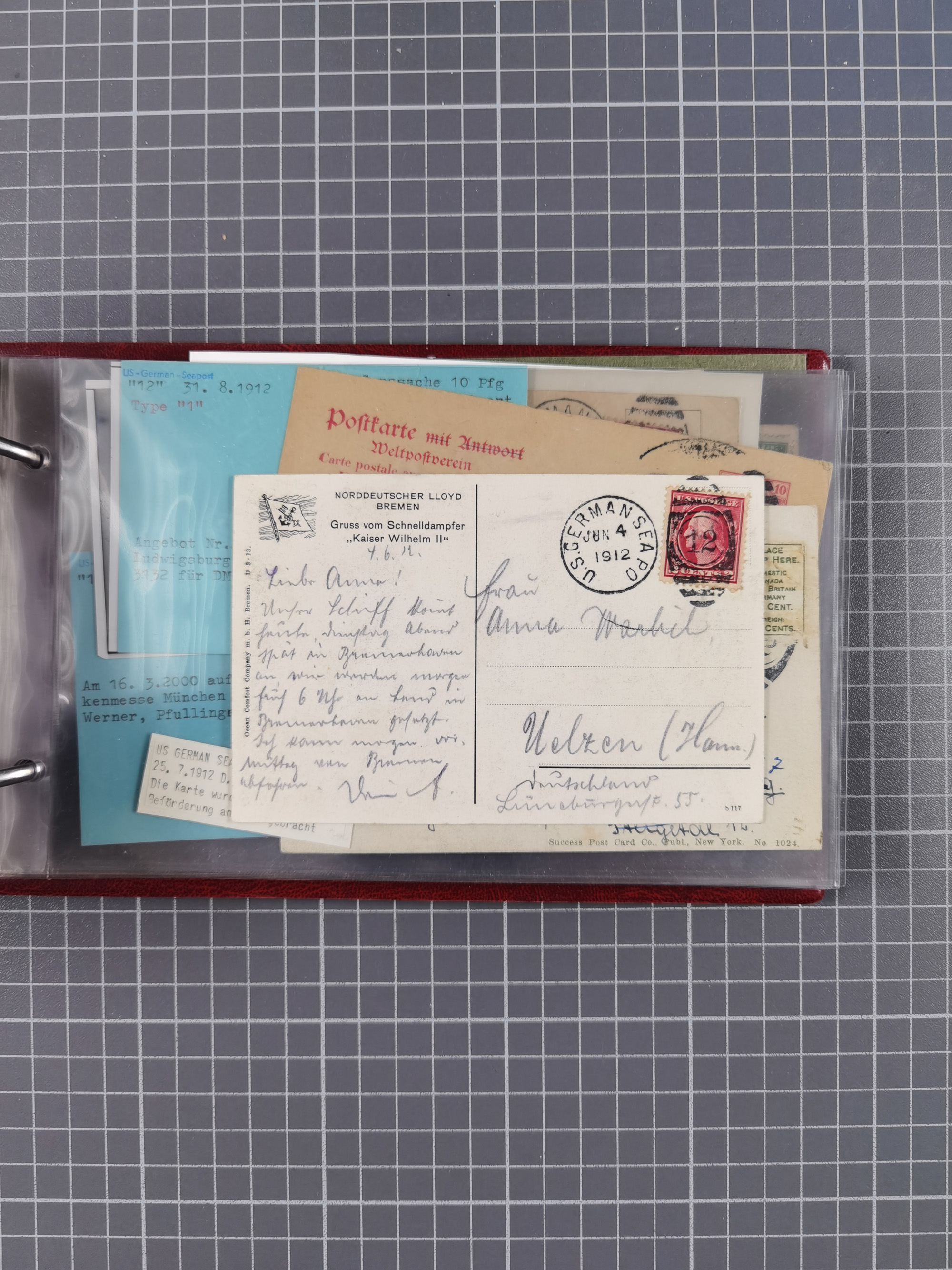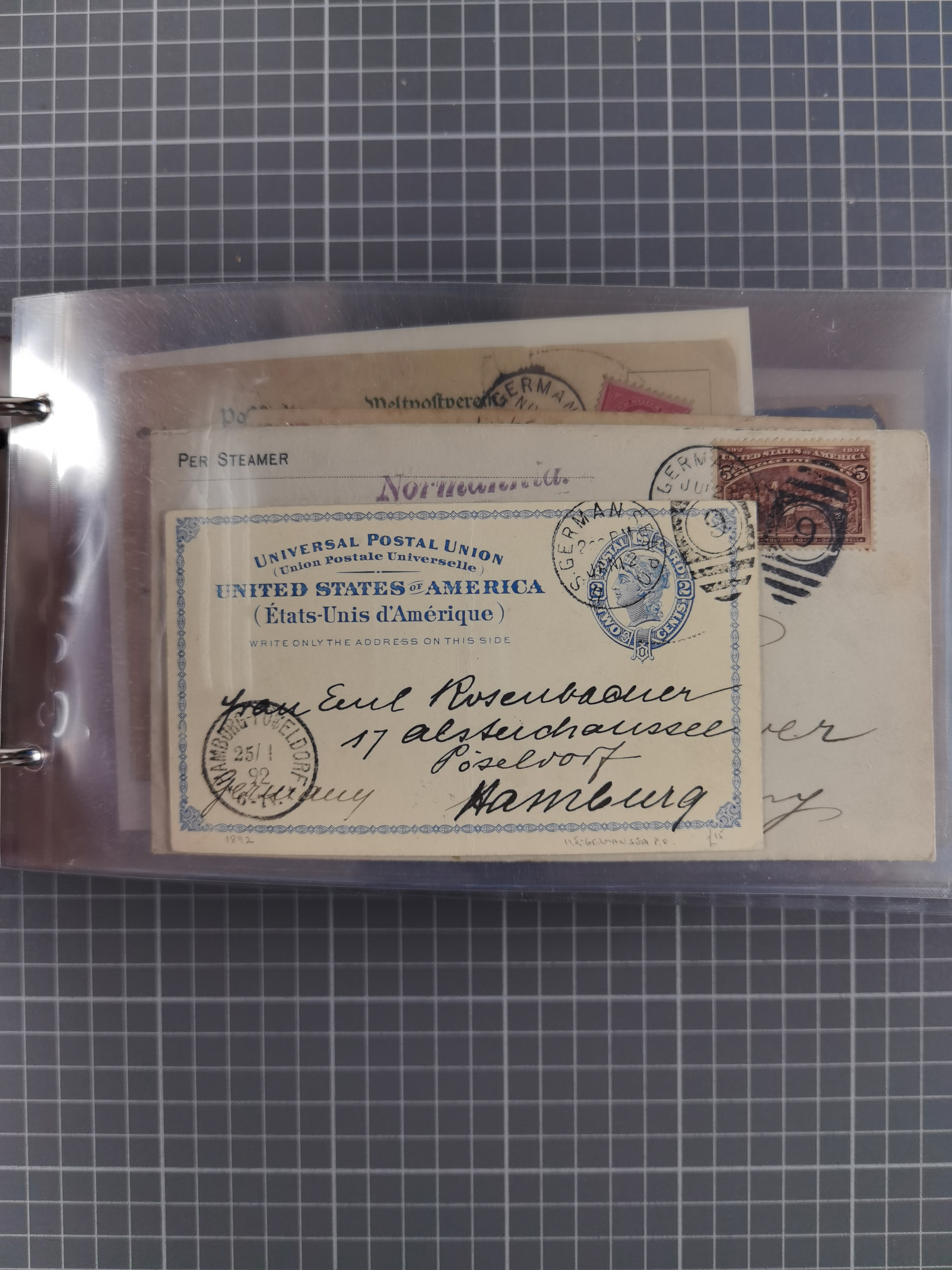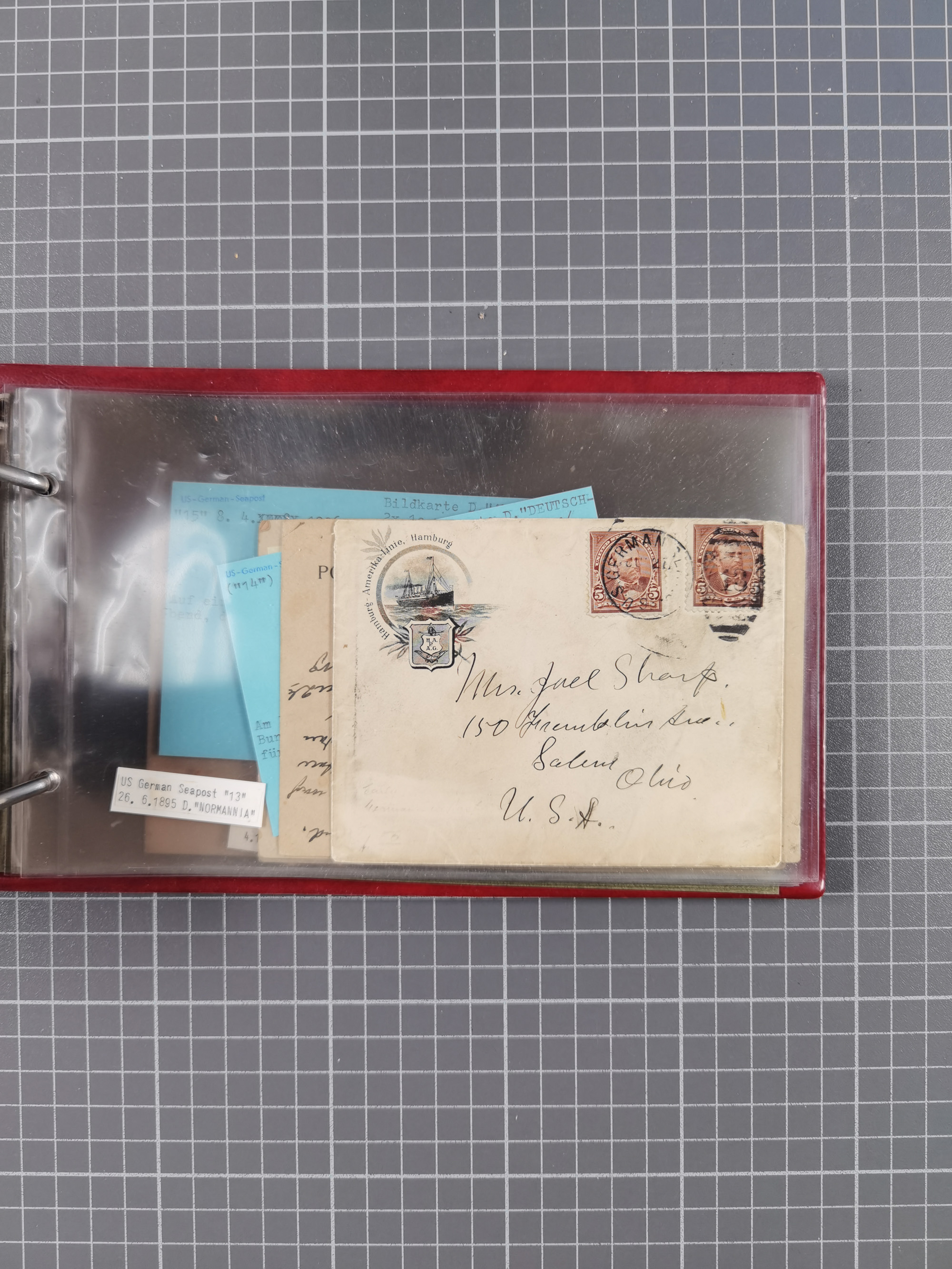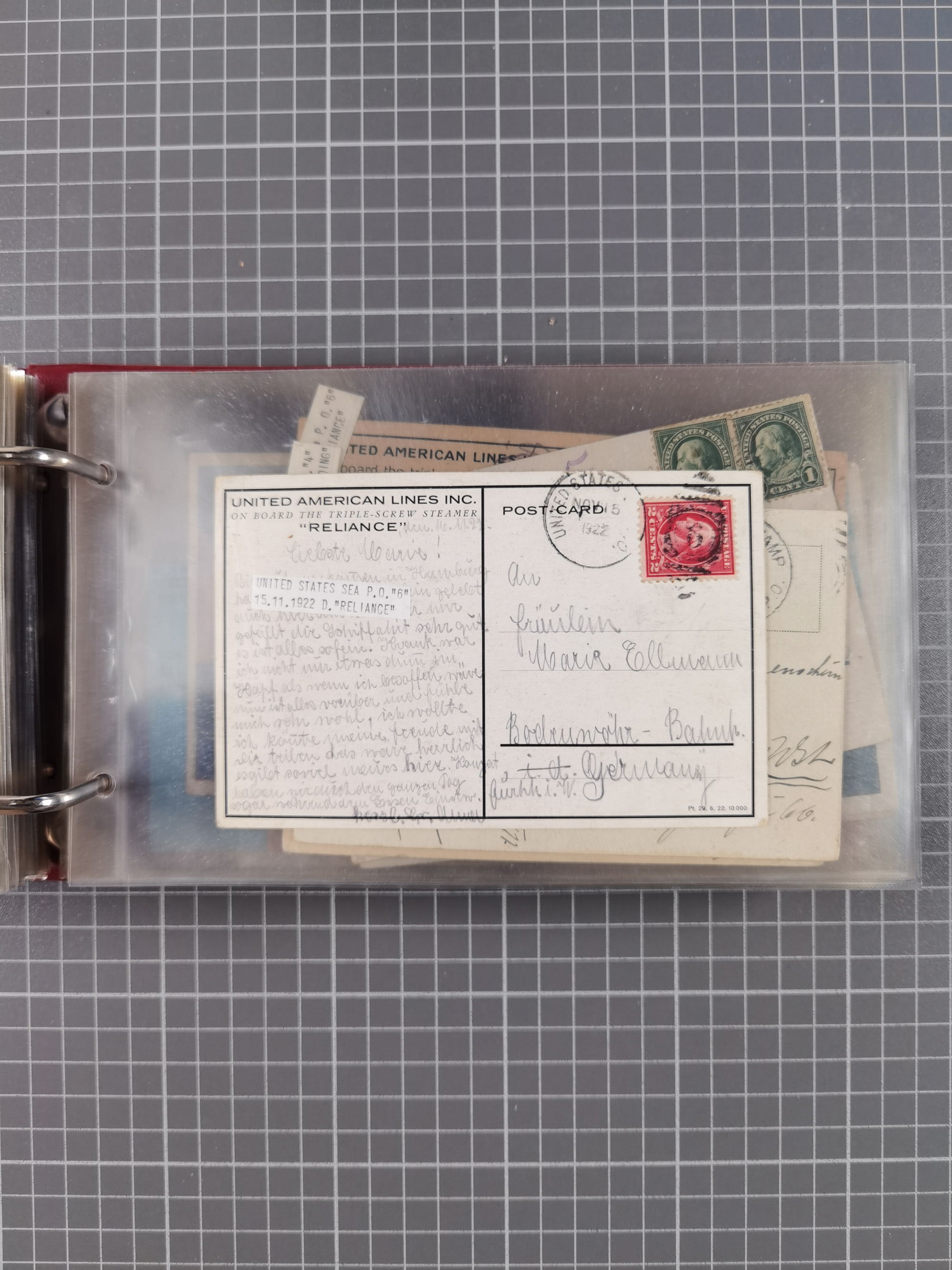 1892/1939, umfangreiche Sammlung “U.S. GERMAN SEA POST” mit ca. 400 Briefen, Karten und Ganzsachen, Schwerpunkt vor 1920 mit den Dublex-Stempeln mit Nr. 1-16, dabei verschiedene Verwendungen mit besseren (u.a. auf Briefen/Karten vom D. Reich), 1 R-GSU und weiteren Besonderheiten. Dazu noch einige Schiffs-Ansichtskarten, bei vielen Belegen mit Vermerken zu den Schiffen usw. und meist in guter Erhaltung. Eine in diesem Umfang seltene Sammlung in sechs Alben, ex Steinmeyer
