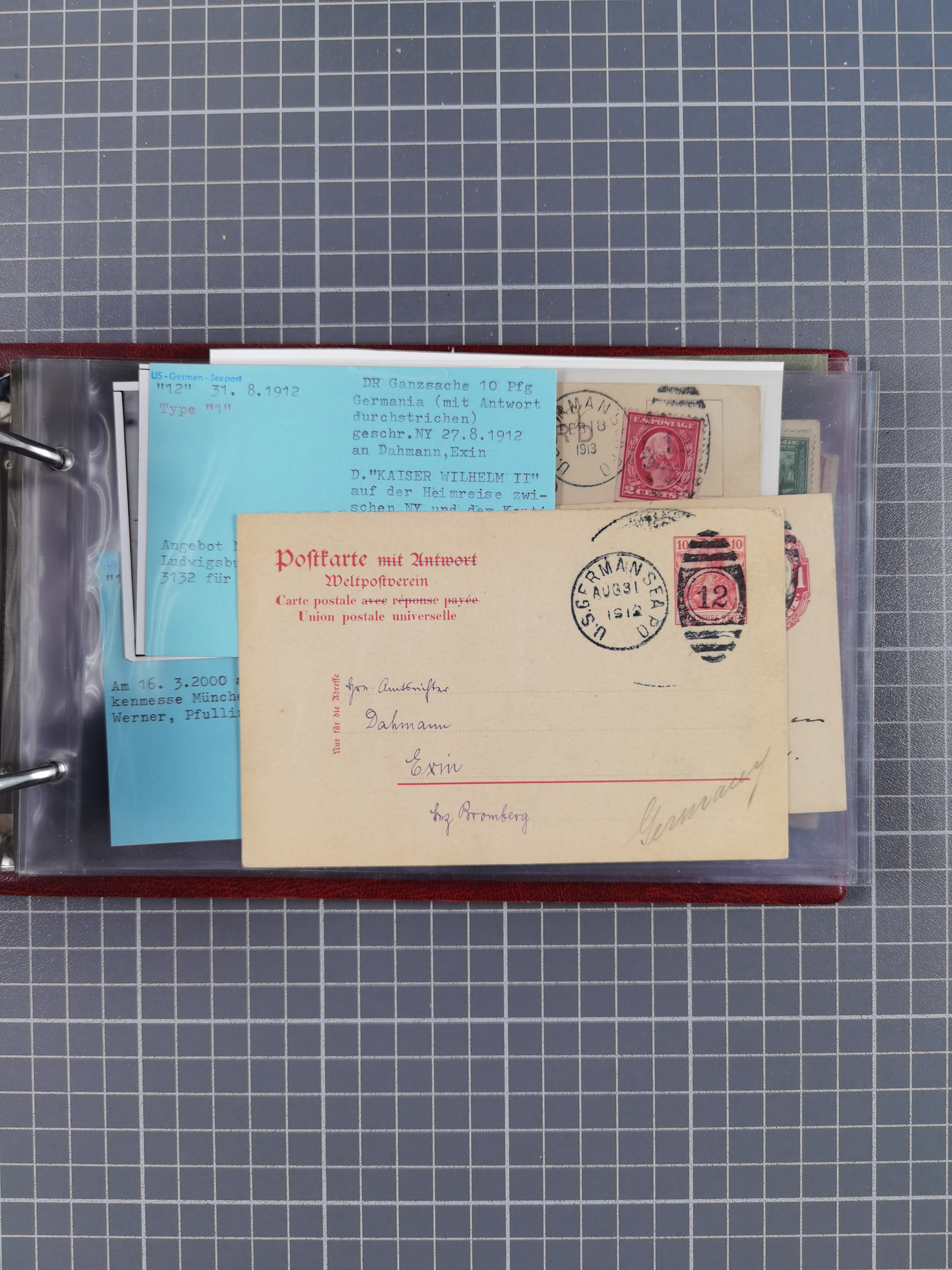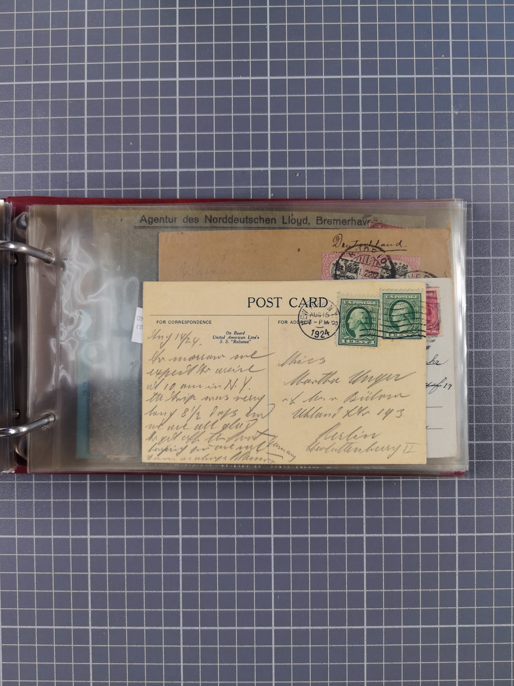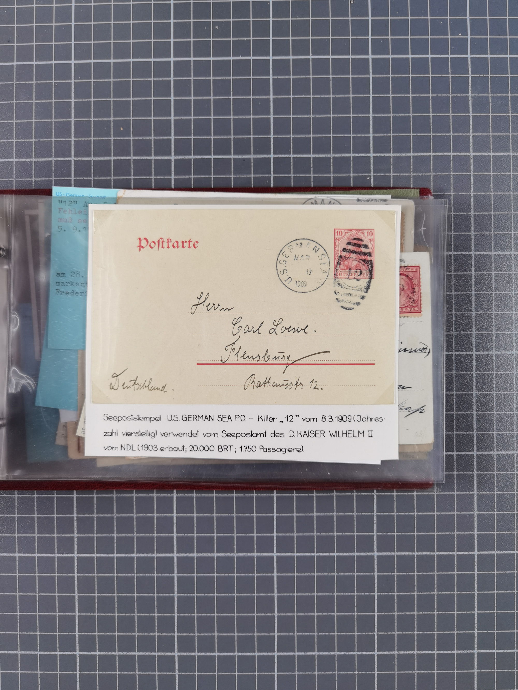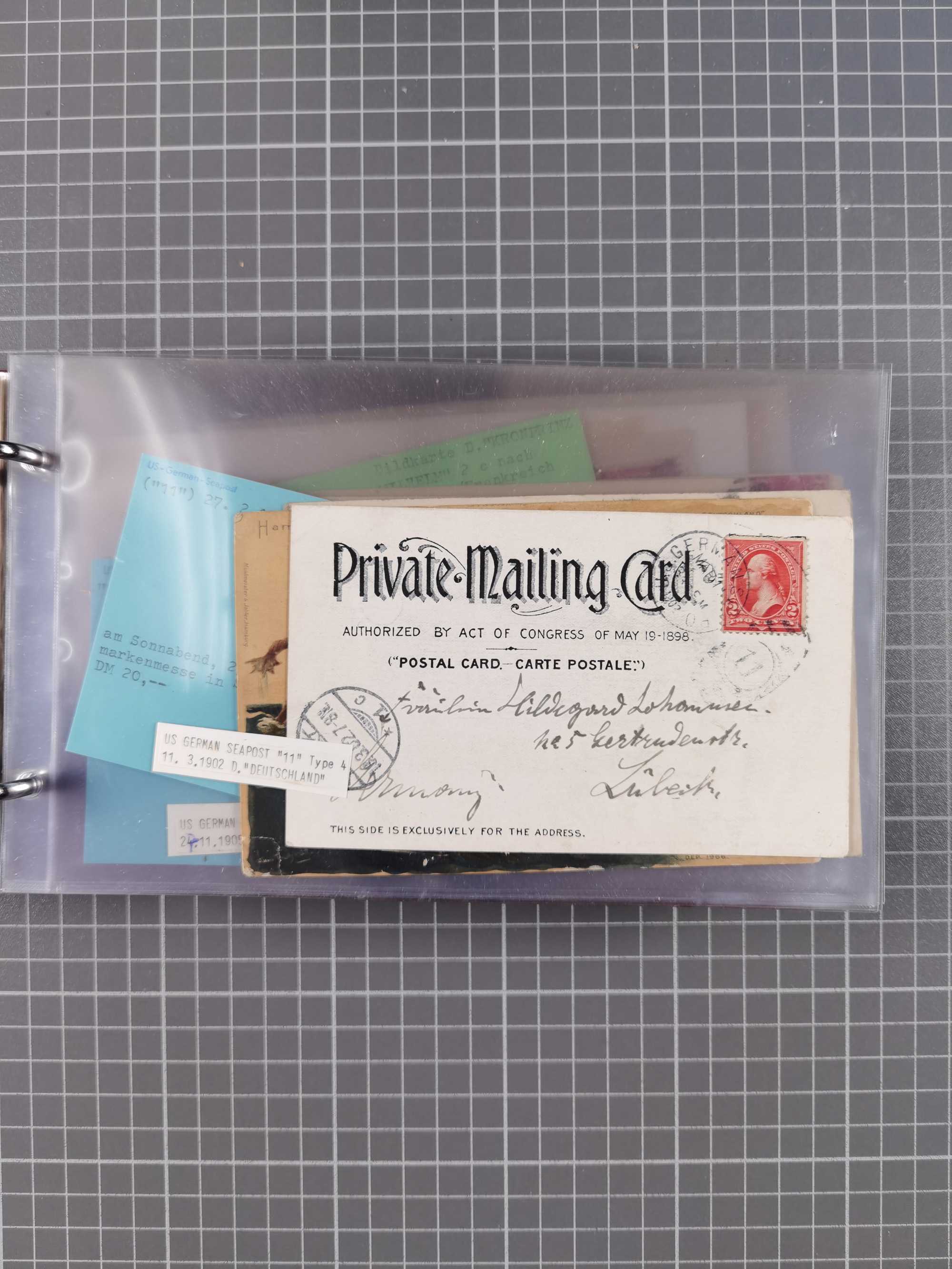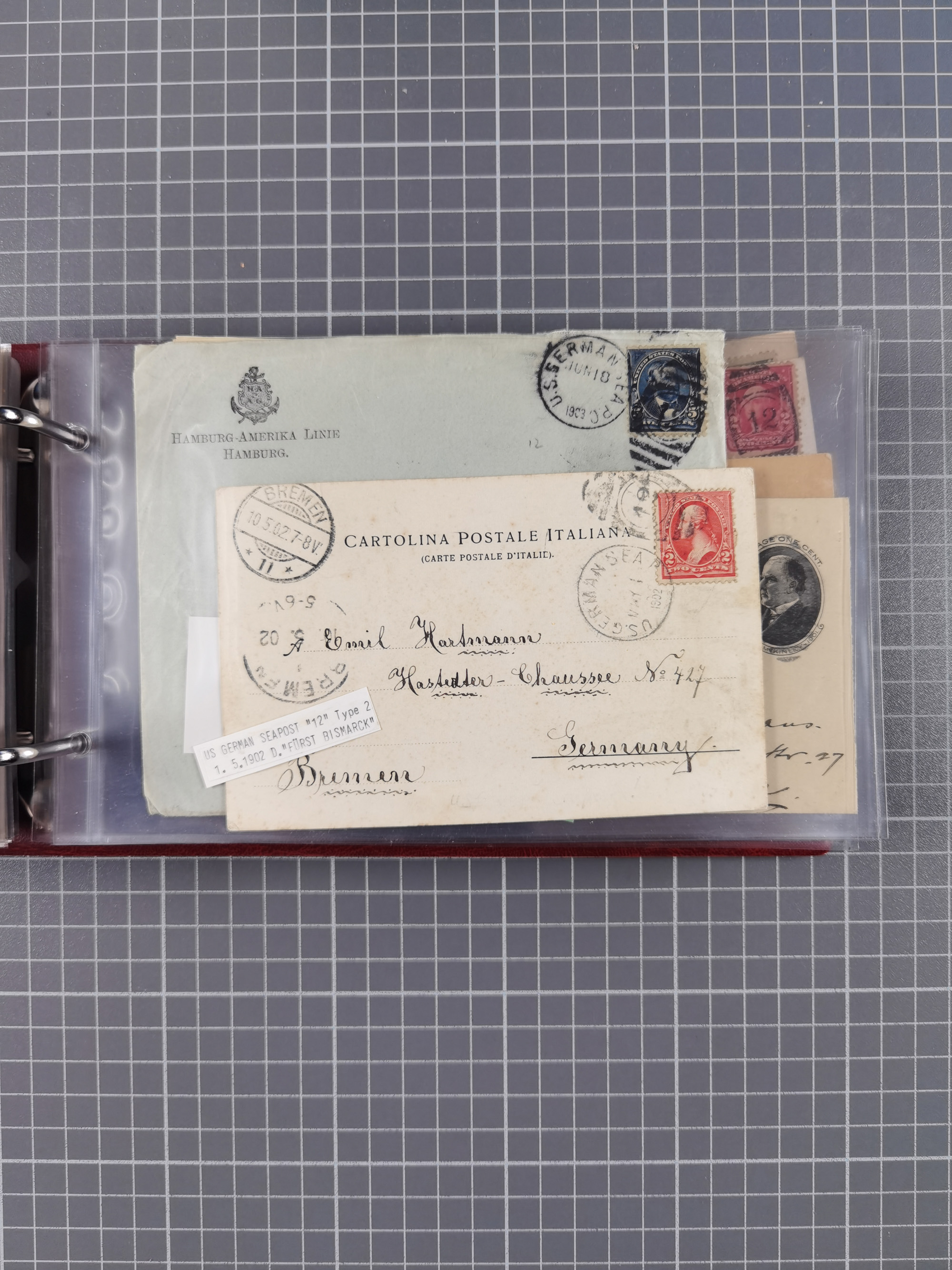 1892/1939, umfangreiche Sammlung “U.S. GERMAN SEA POST” mit ca. 400 Briefen, Karten und Ganzsachen, Schwerpunkt vor 1920 mit den Dublex-Stempeln mit Nr. 1-16, dabei verschiedene Verwendungen mit besseren (u.a. auf Briefen/Karten vom D. Reich), 1 R-GSU und weiteren Besonderheiten. Dazu noch einige Schiffs-Ansichtskarten, bei vielen Belegen mit Vermerken zu den Schiffen usw. und meist in guter Erhaltung. Eine in diesem Umfang seltene Sammlung in sechs Alben, ex Steinmeyer