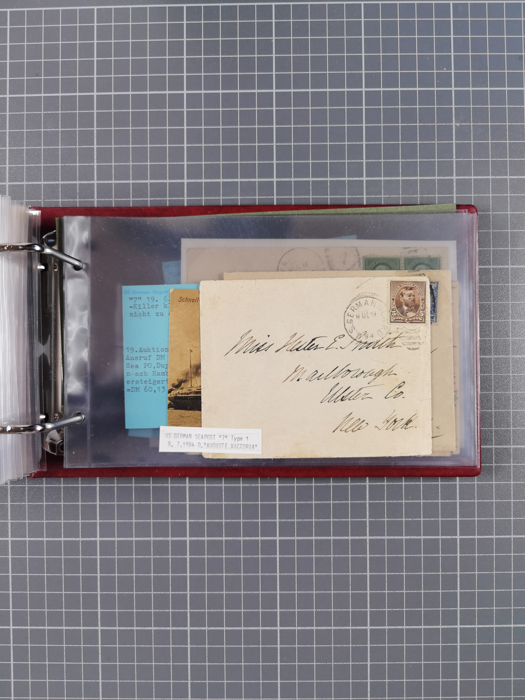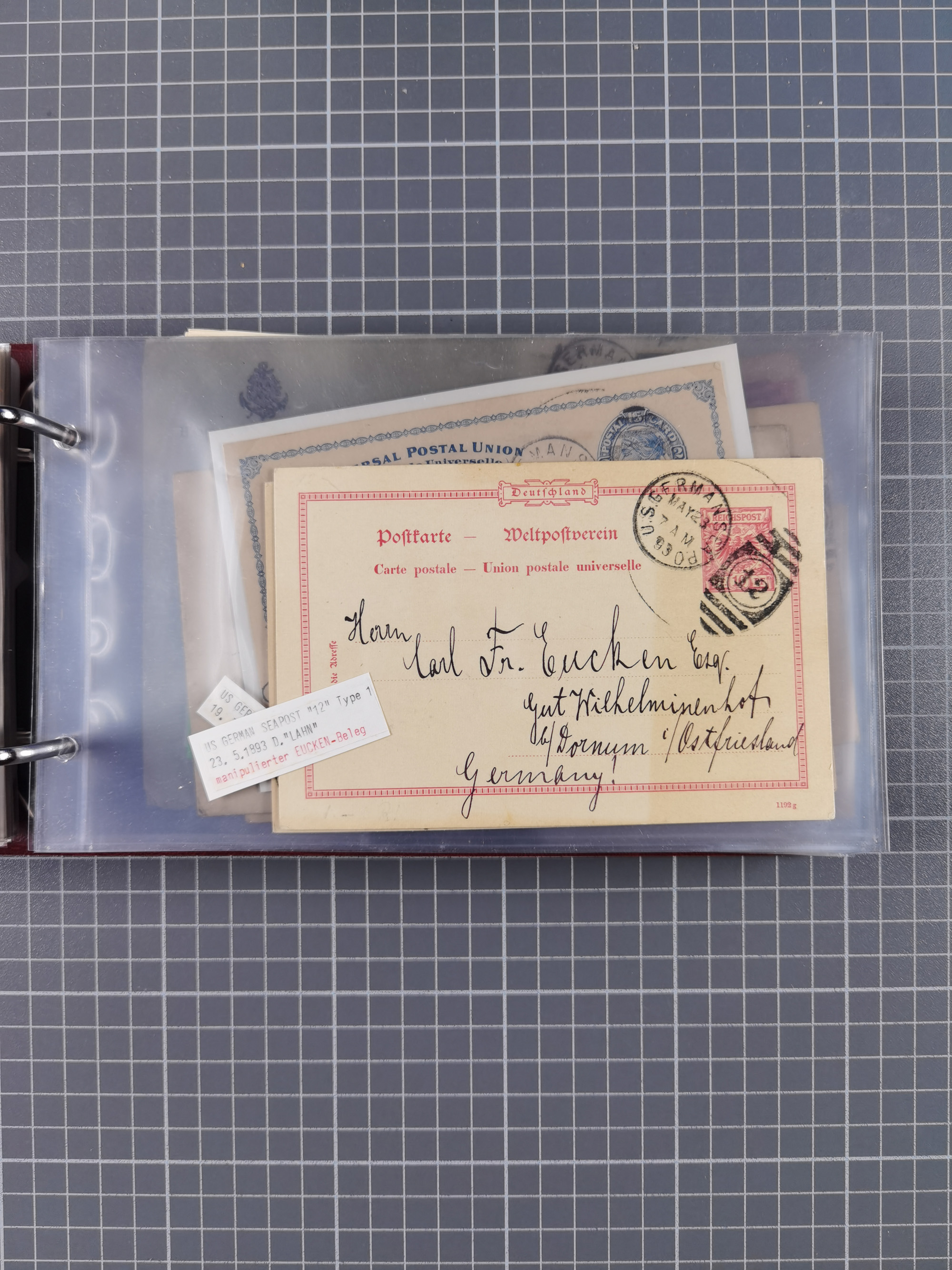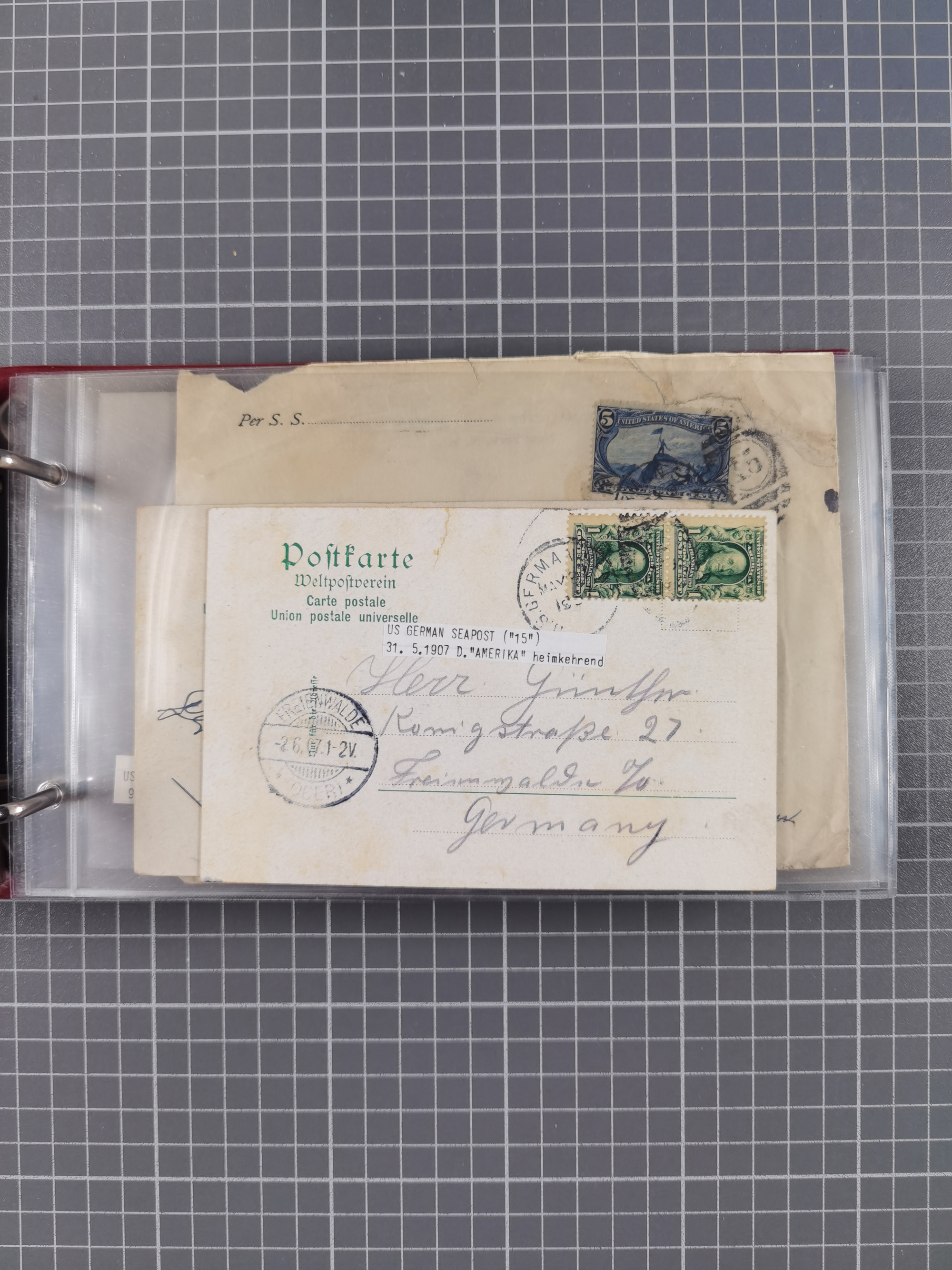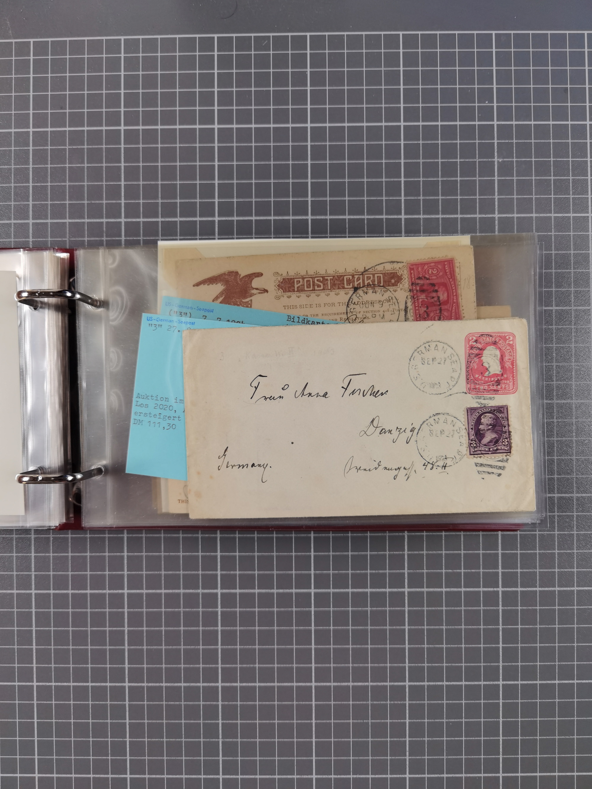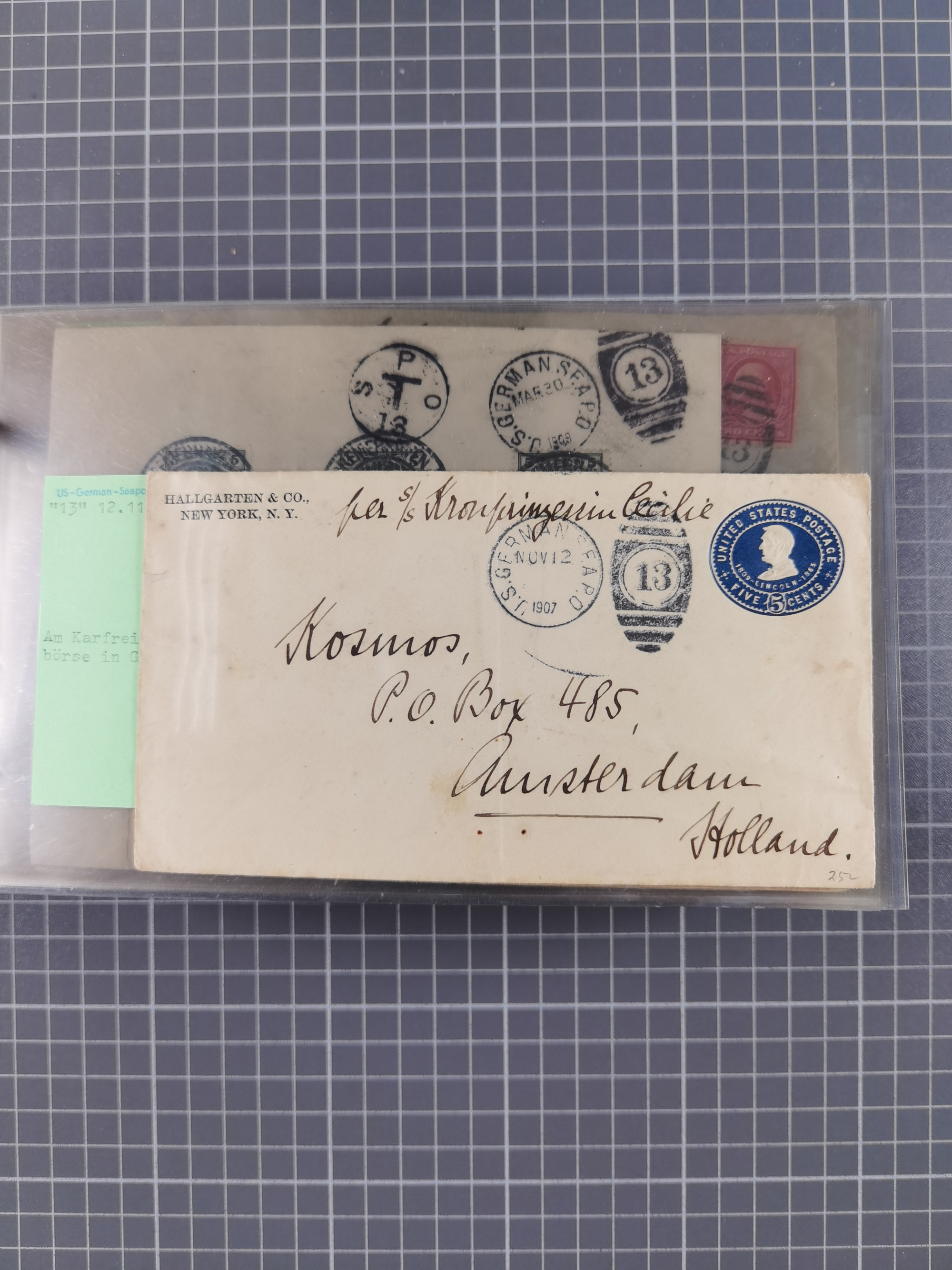 1892/1939, umfangreiche Sammlung “U.S. GERMAN SEA POST” mit ca. 400 Briefen, Karten und Ganzsachen, Schwerpunkt vor 1920 mit den Dublex-Stempeln mit Nr. 1-16, dabei verschiedene Verwendungen mit besseren (u.a. auf Briefen/Karten vom D. Reich), 1 R-GSU und weiteren Besonderheiten. Dazu noch einige Schiffs-Ansichtskarten, bei vielen Belegen mit Vermerken zu den Schiffen usw. und meist in guter Erhaltung. Eine in diesem Umfang seltene Sammlung in sechs Alben, ex Steinmeyer