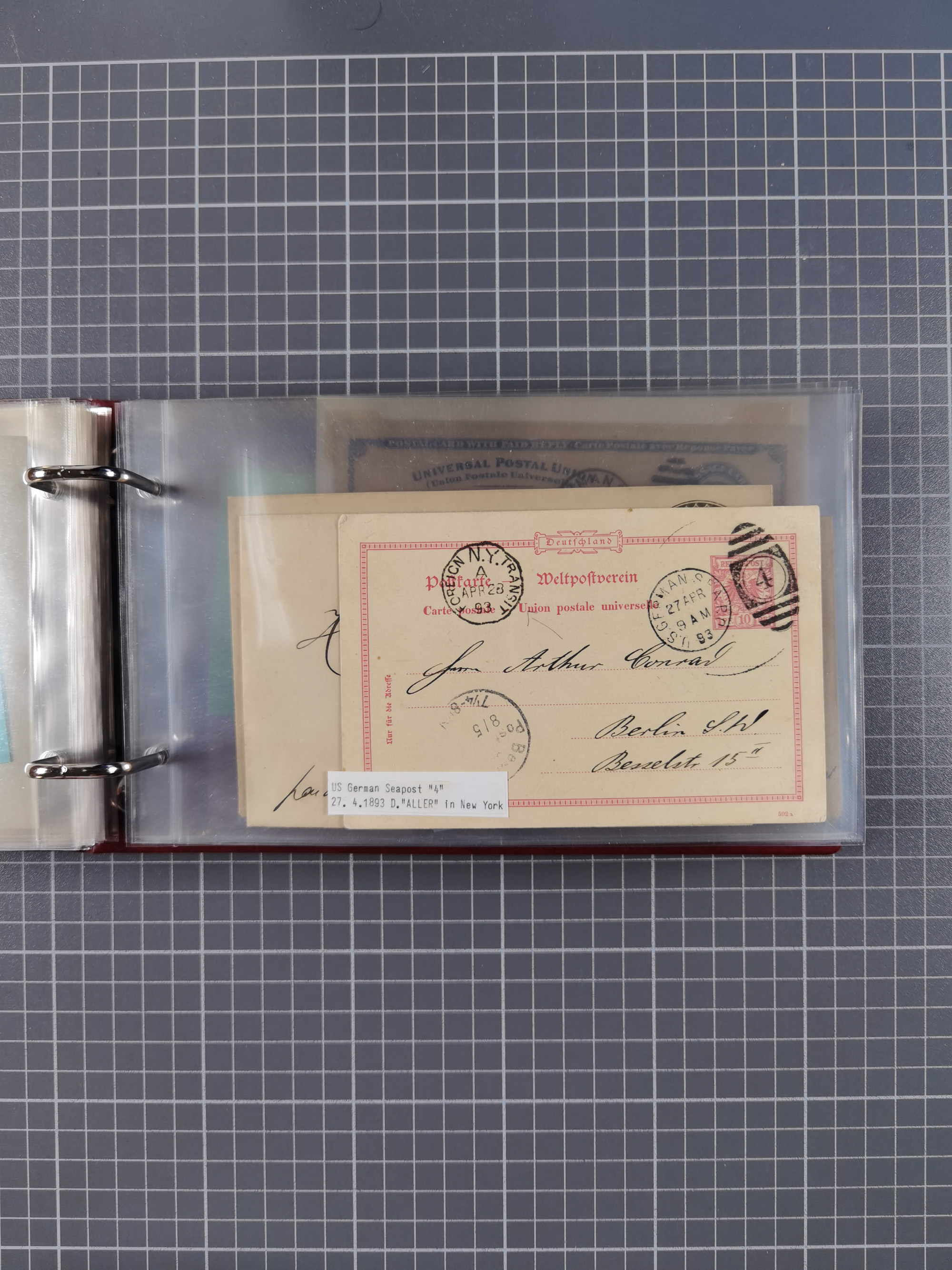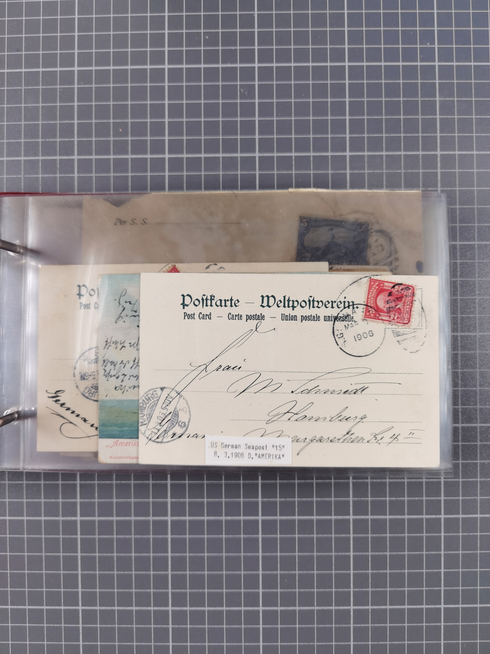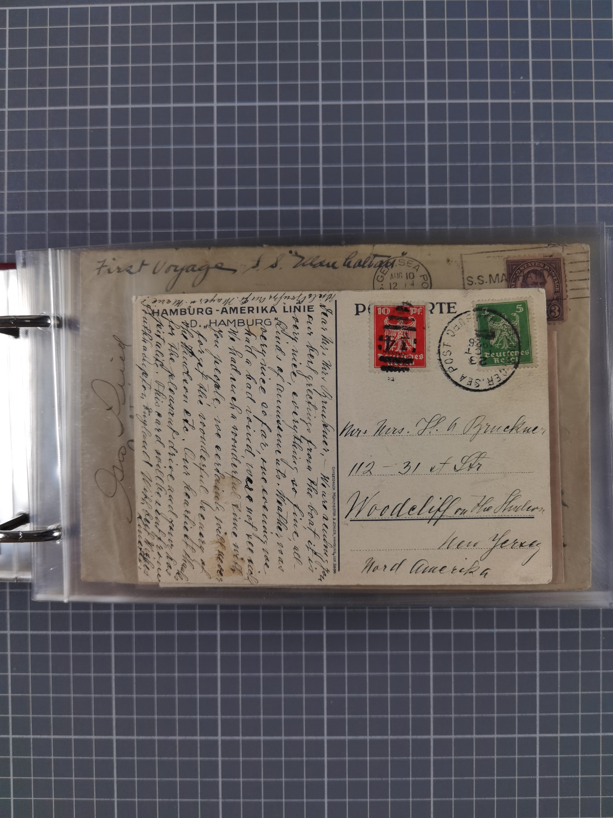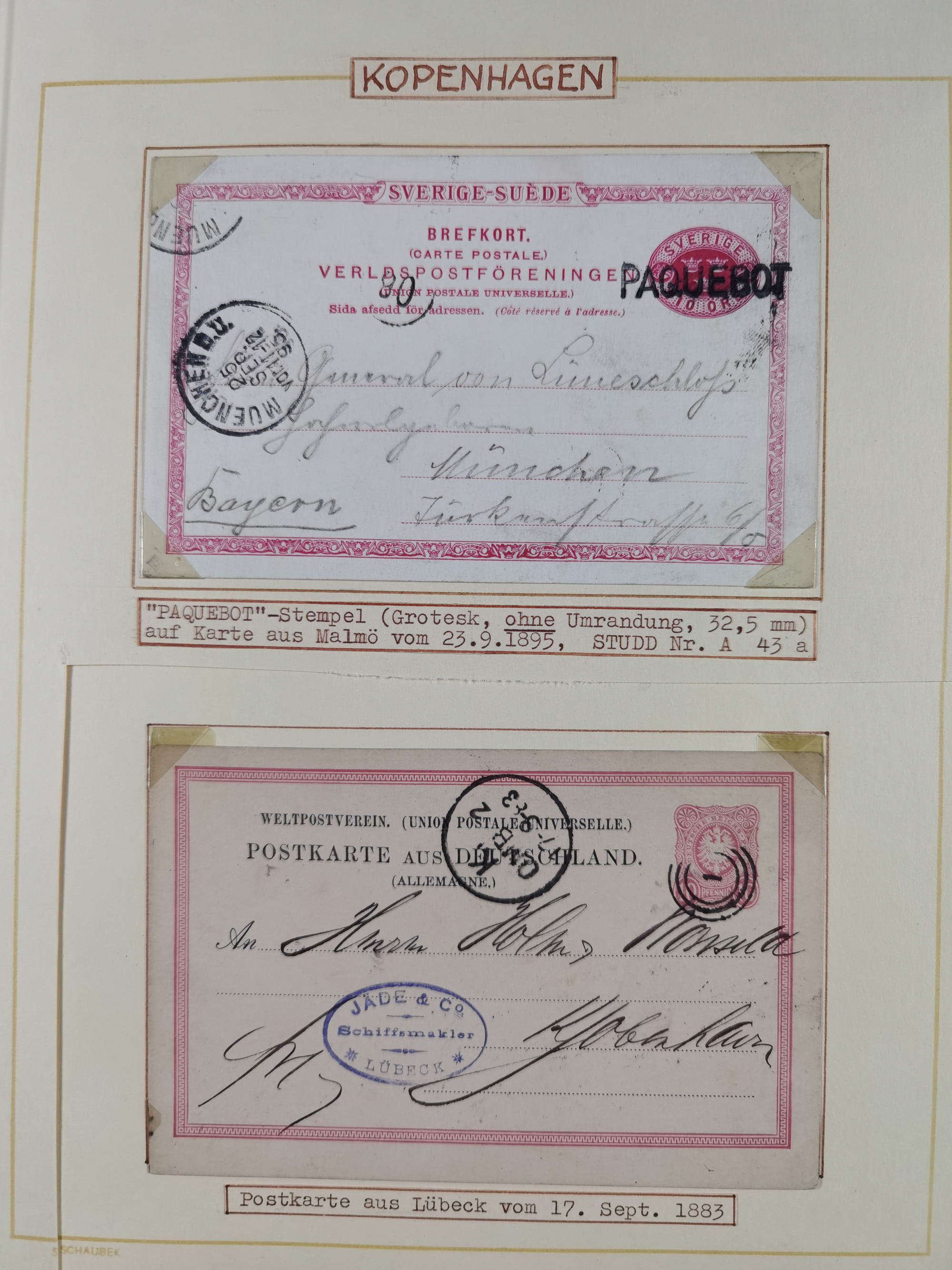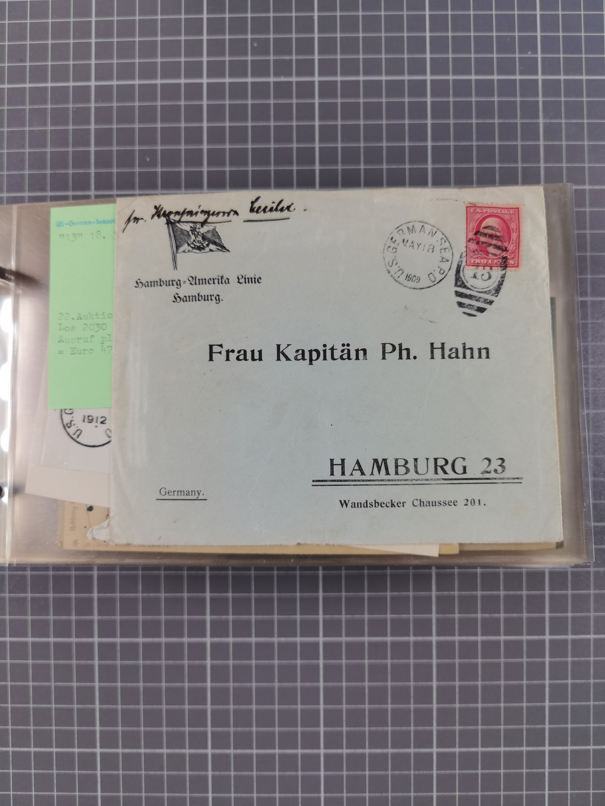 1892/1939, umfangreiche Sammlung “U.S. GERMAN SEA POST” mit ca. 400 Briefen, Karten und Ganzsachen, Schwerpunkt vor 1920 mit den Dublex-Stempeln mit Nr. 1-16, dabei verschiedene Verwendungen mit besseren (u.a. auf Briefen/Karten vom D. Reich), 1 R-GSU und weiteren Besonderheiten. Dazu noch einige Schiffs-Ansichtskarten, bei vielen Belegen mit Vermerken zu den Schiffen usw. und meist in guter Erhaltung. Eine in diesem Umfang seltene Sammlung in sechs Alben, ex Steinmeyer