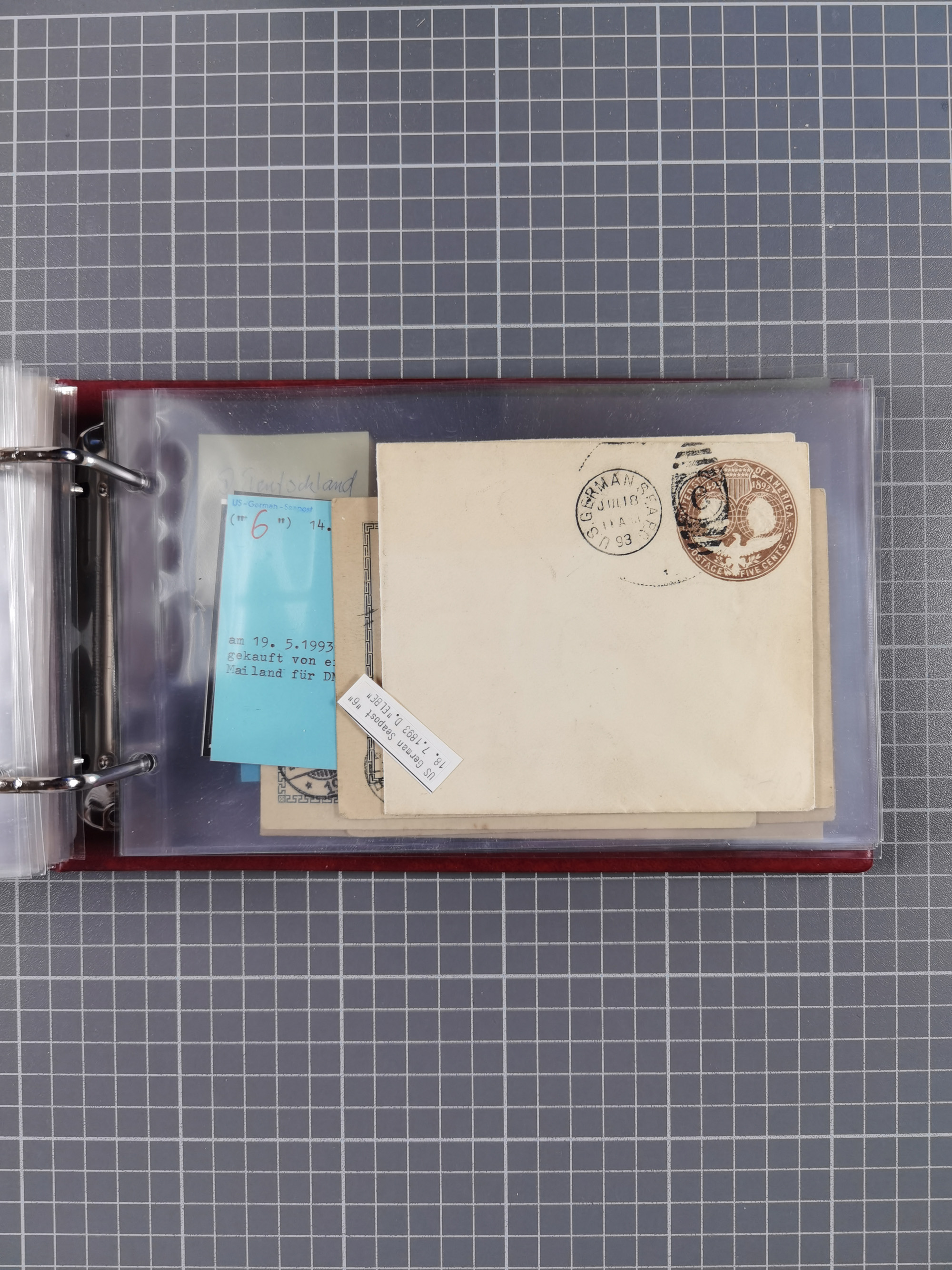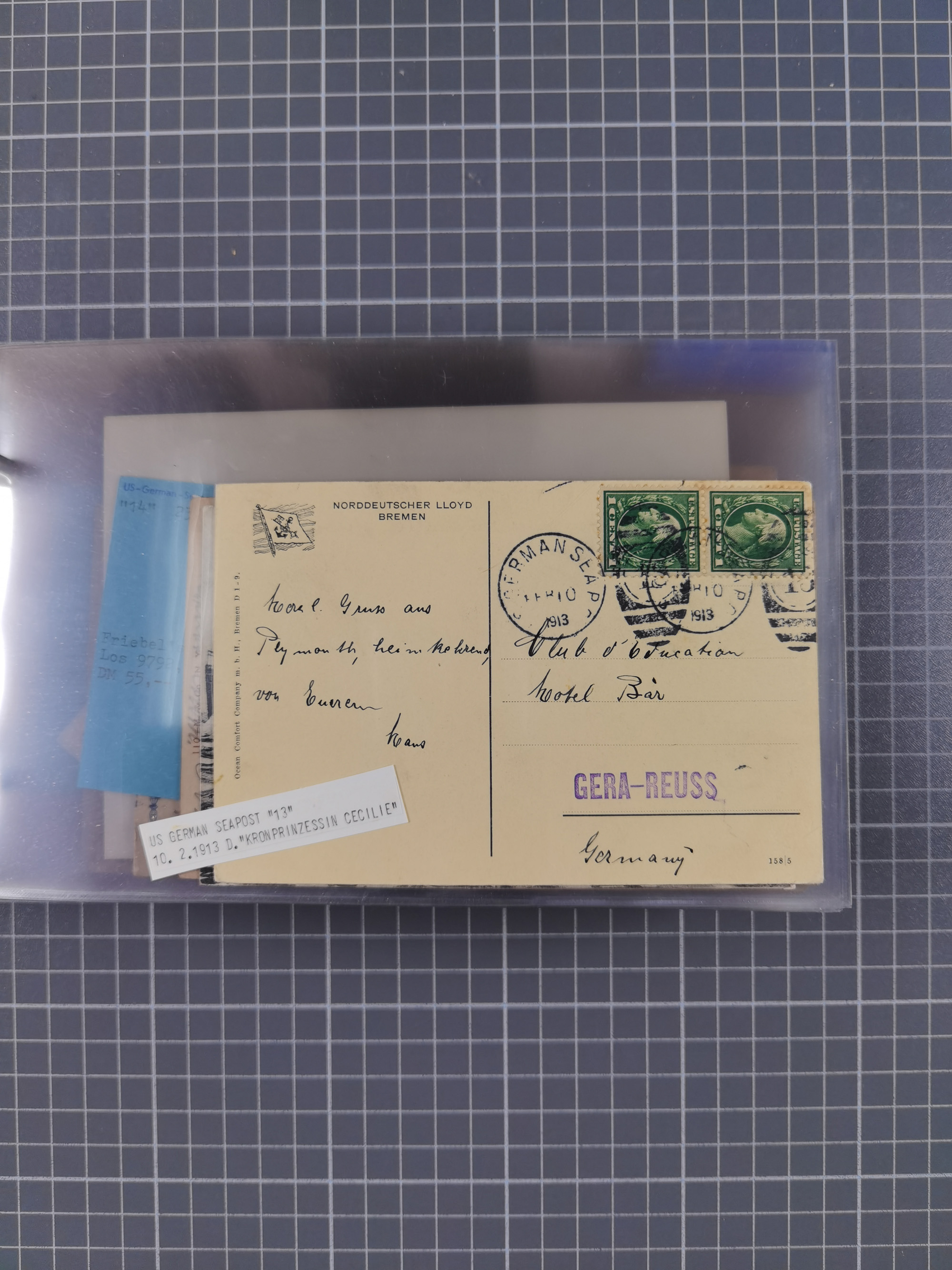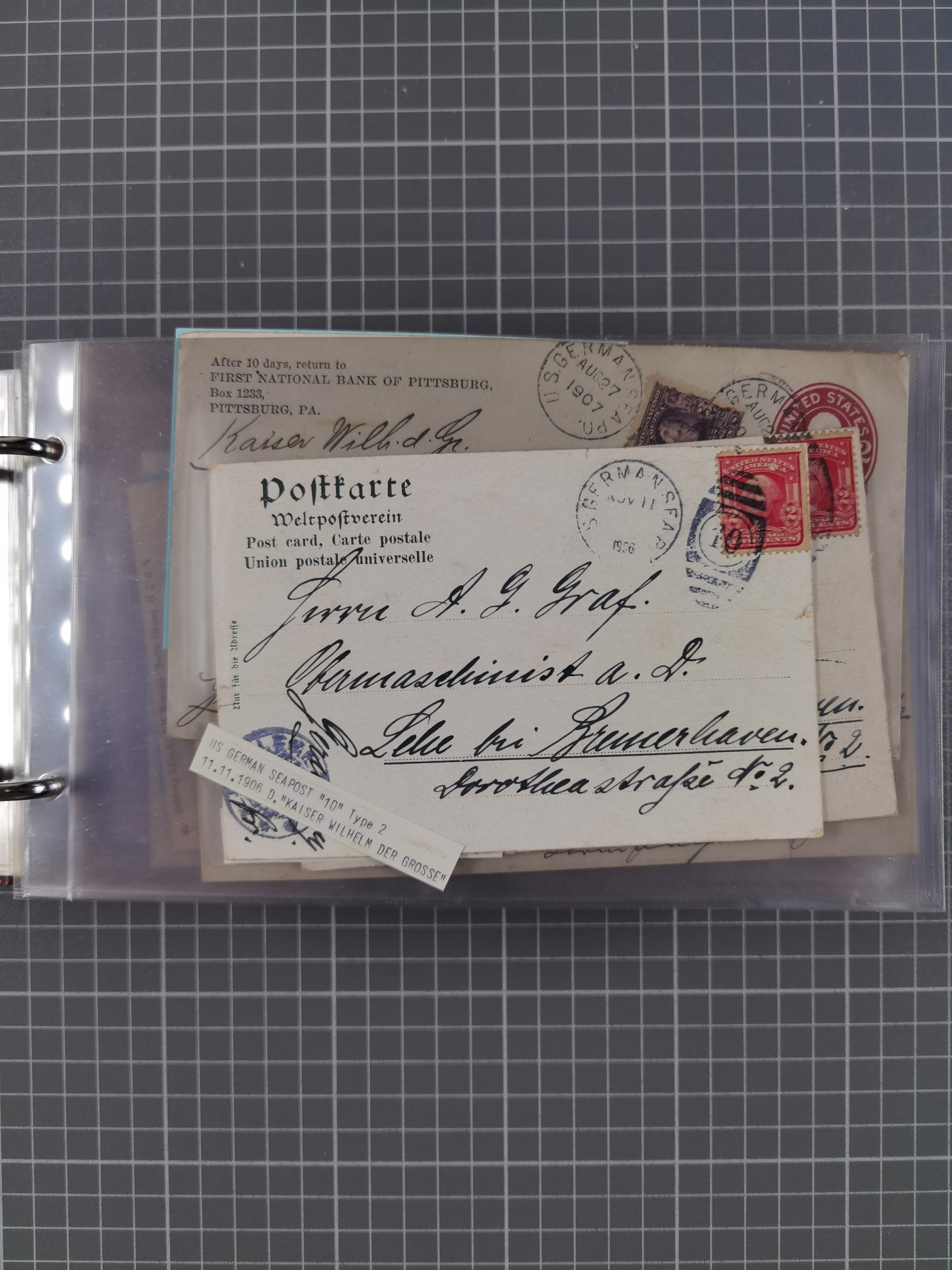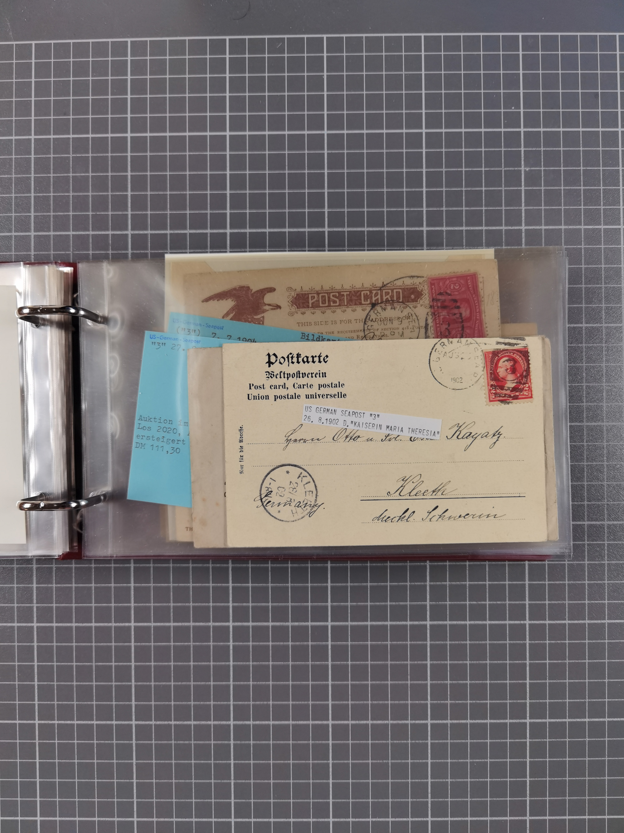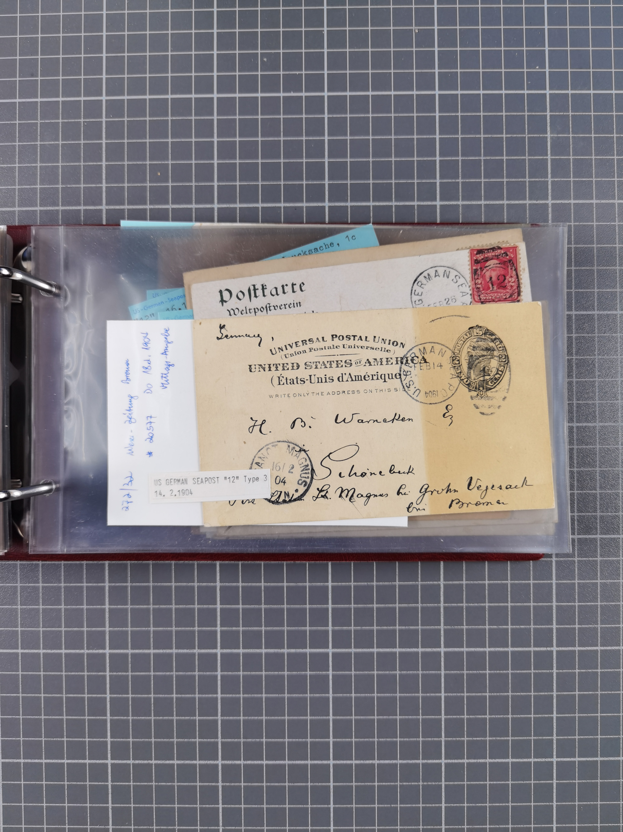1892/1939, umfangreiche Sammlung “U.S. GERMAN SEA POST” mit ca. 400 Briefen, Karten und Ganzsachen, Schwerpunkt vor 1920 mit den Dublex-Stempeln mit Nr. 1-16, dabei verschiedene Verwendungen mit besseren (u.a. auf Briefen/Karten vom D. Reich), 1 R-GSU und weiteren Besonderheiten. Dazu noch einige Schiffs-Ansichtskarten, bei vielen Belegen mit Vermerken zu den Schiffen usw. und meist in guter Erhaltung. Eine in diesem Umfang seltene Sammlung in sechs Alben, ex Steinmeyer