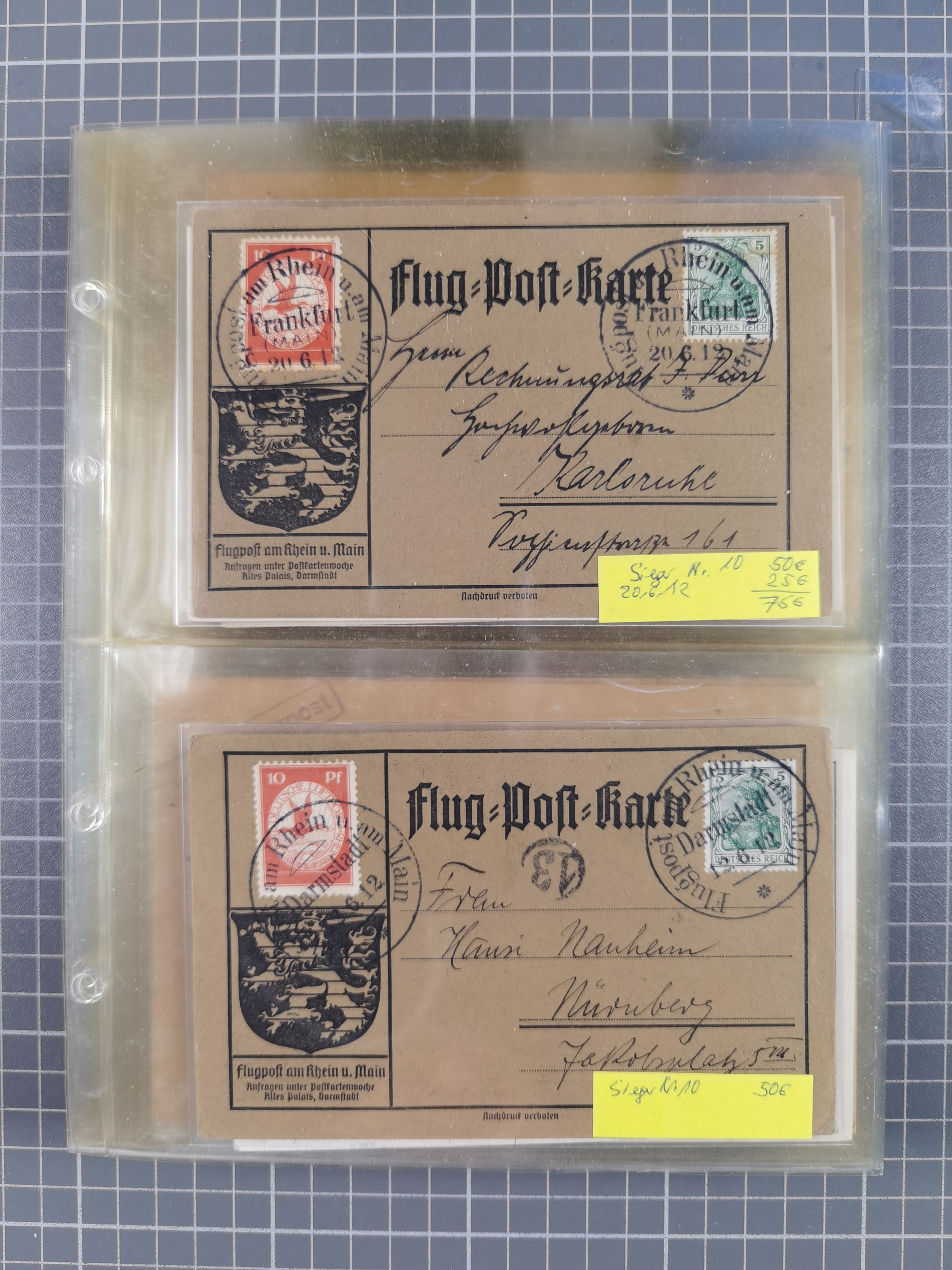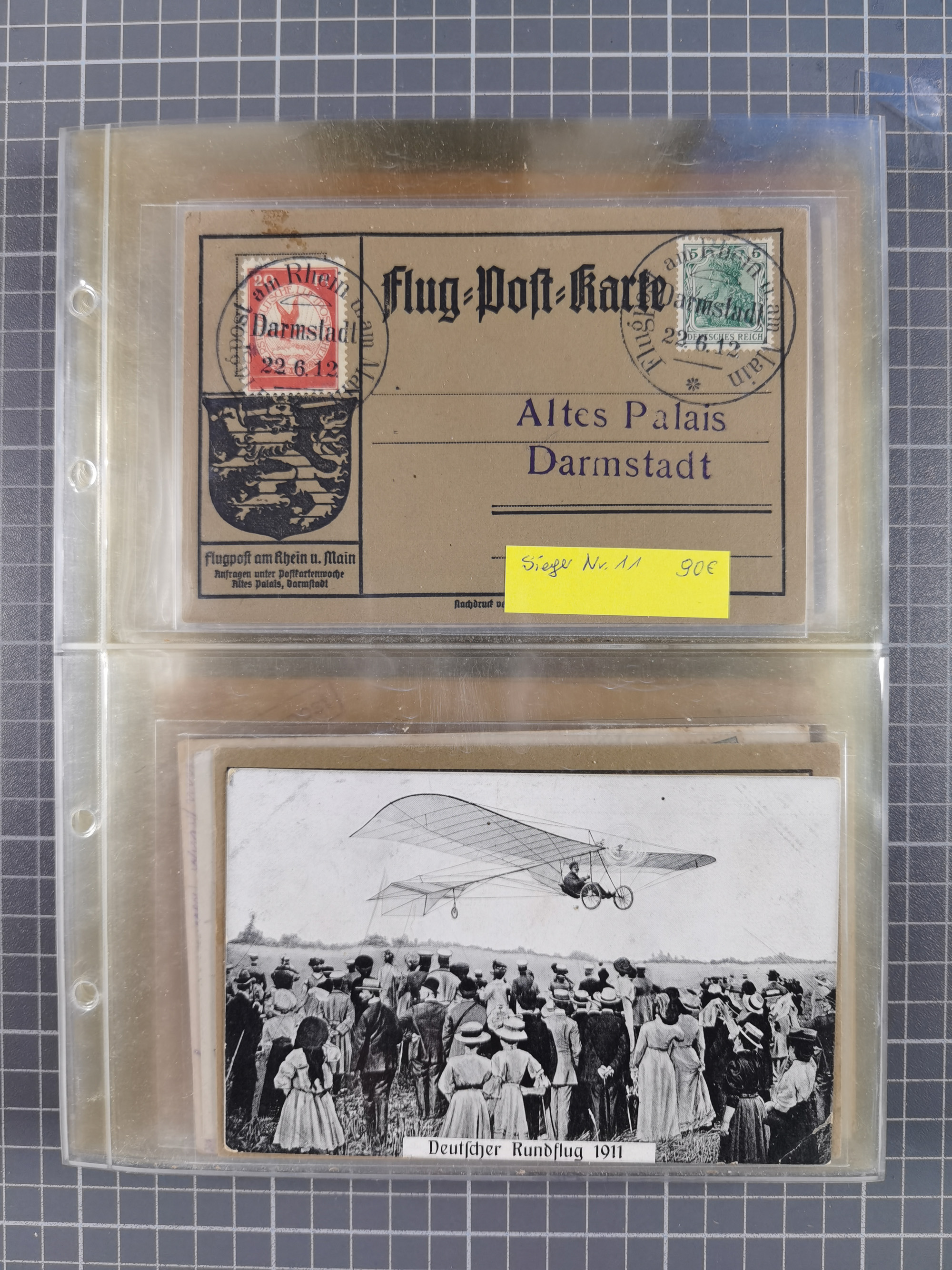 Rhein/Main: 1912, Gelber Hund 1 M., drei Einzelwerte und Germania 5 Pfg. je mit Flugstempel “Darmstadt 22.6.12” auf sogenannter “Roter Hund”-Karte. Die Karte oben mit kleinen Randbügen, ansonsten in einwandfreier Erhaltung (Sieger 13b)