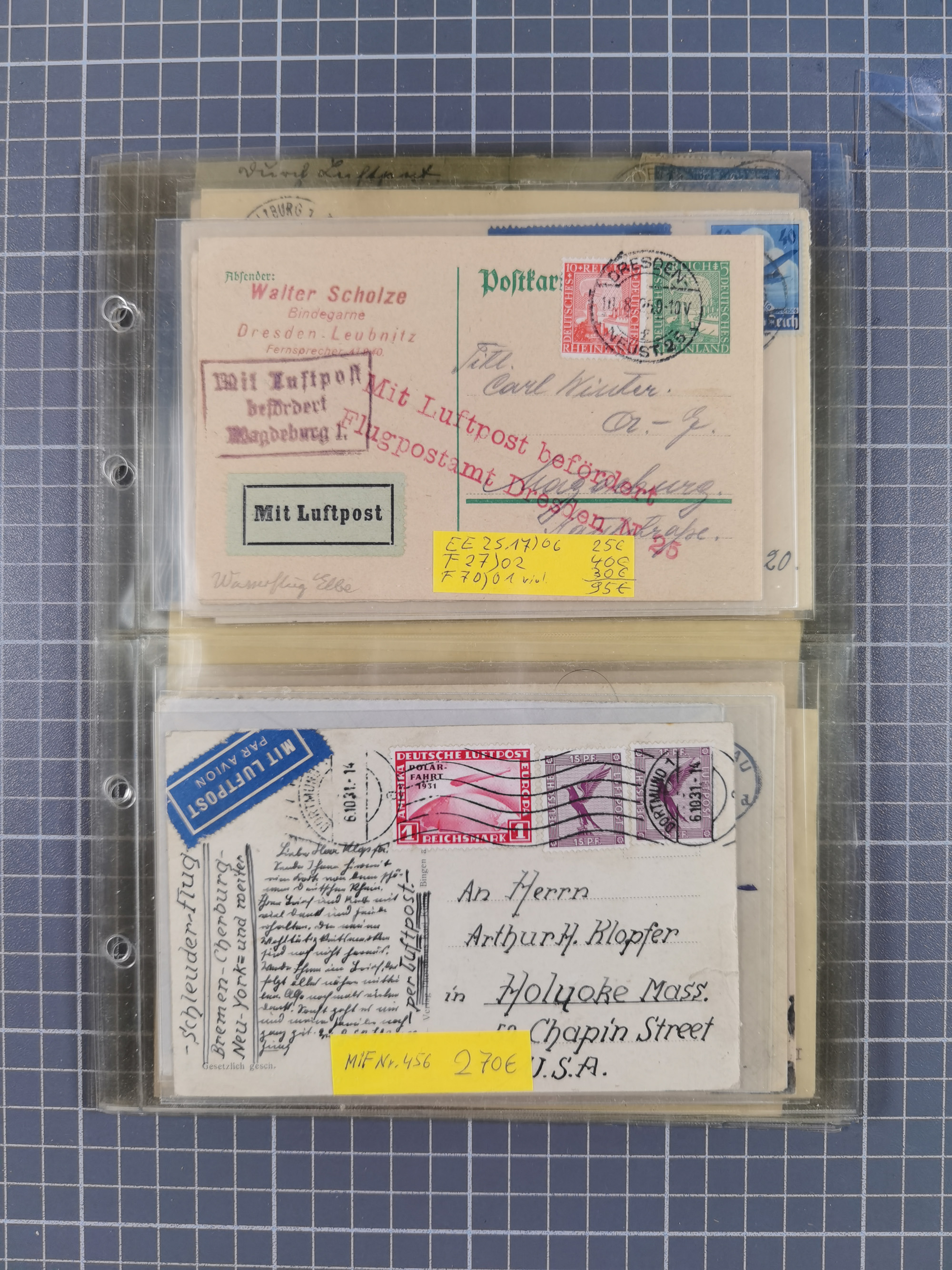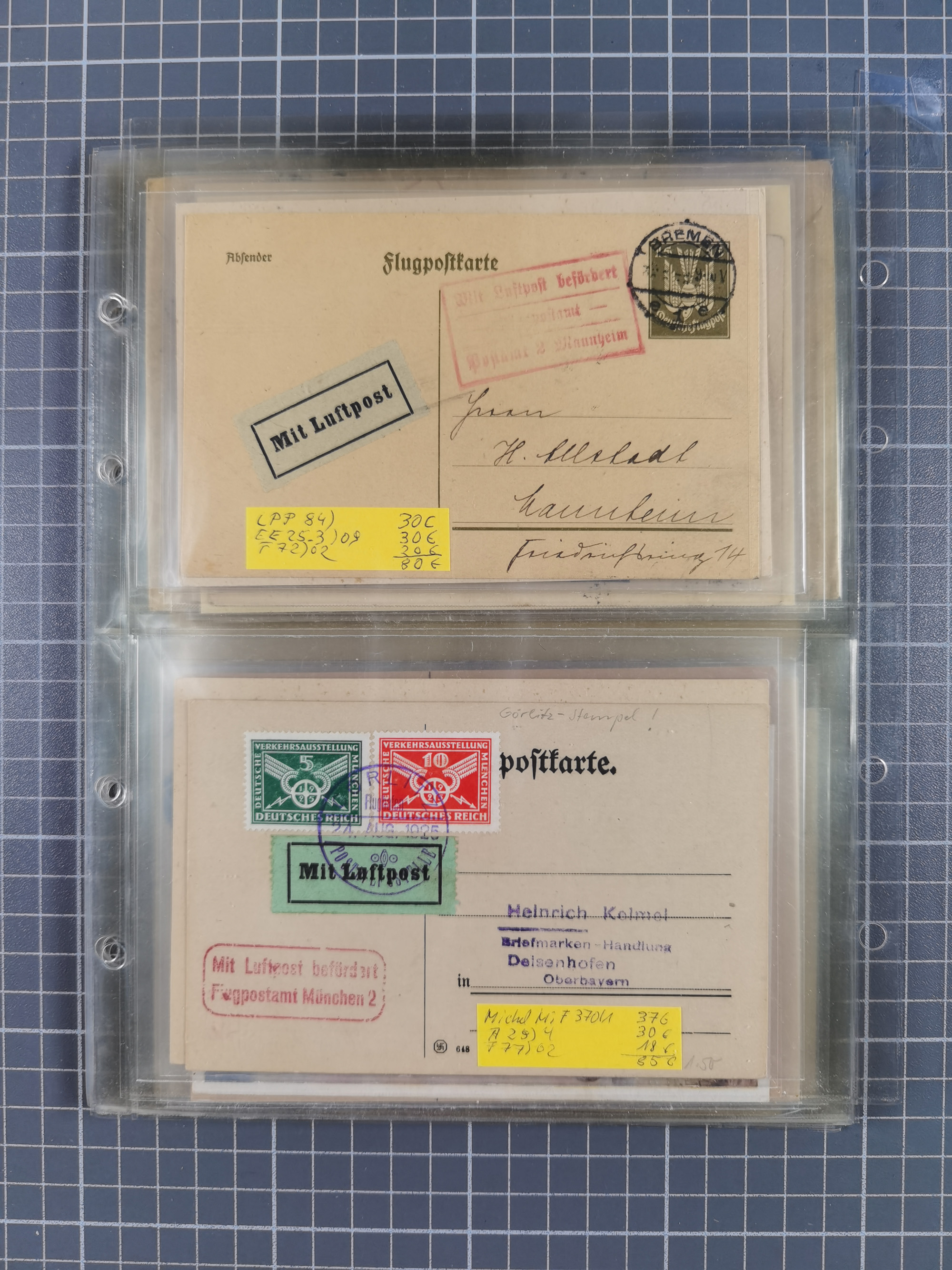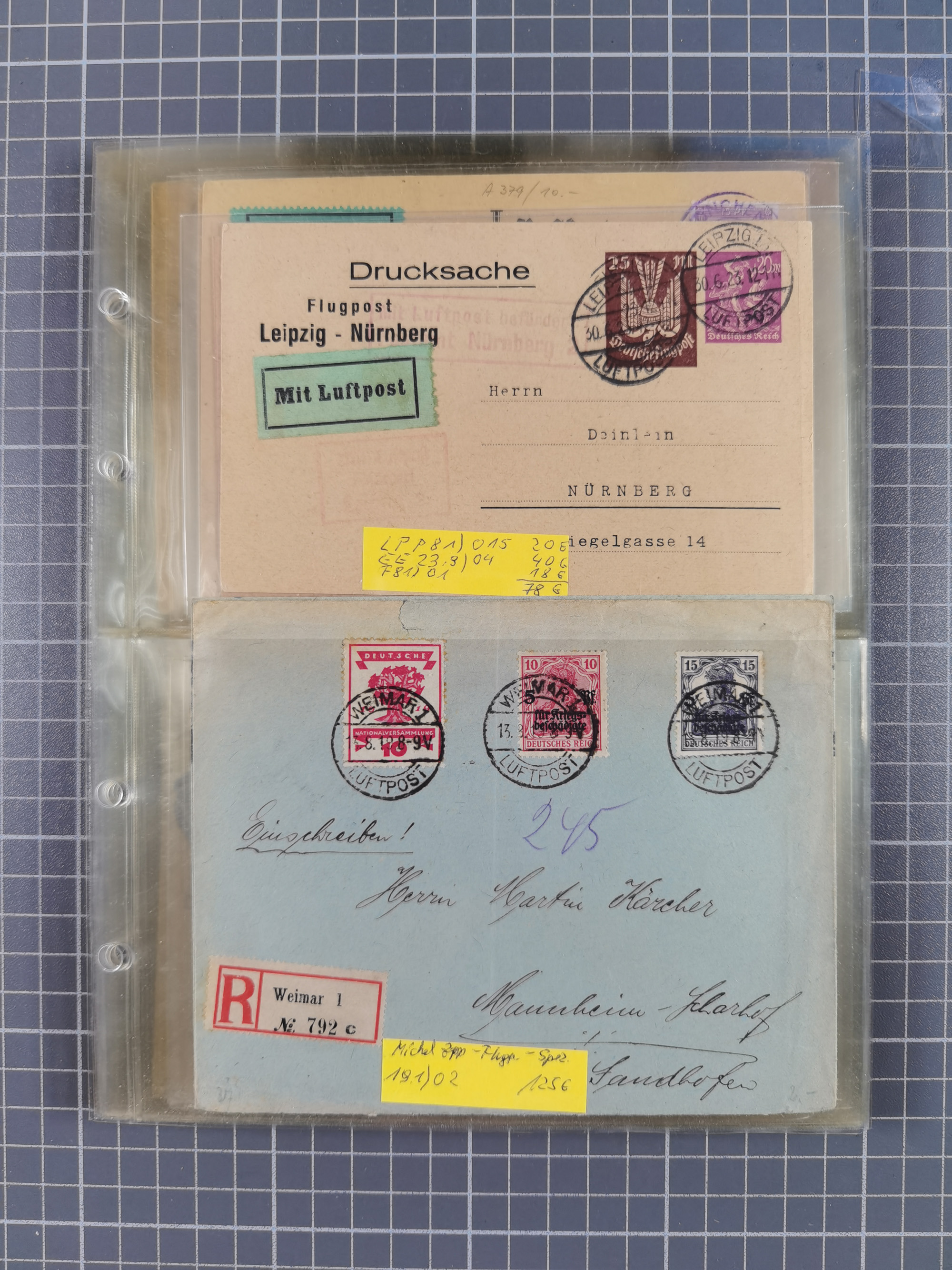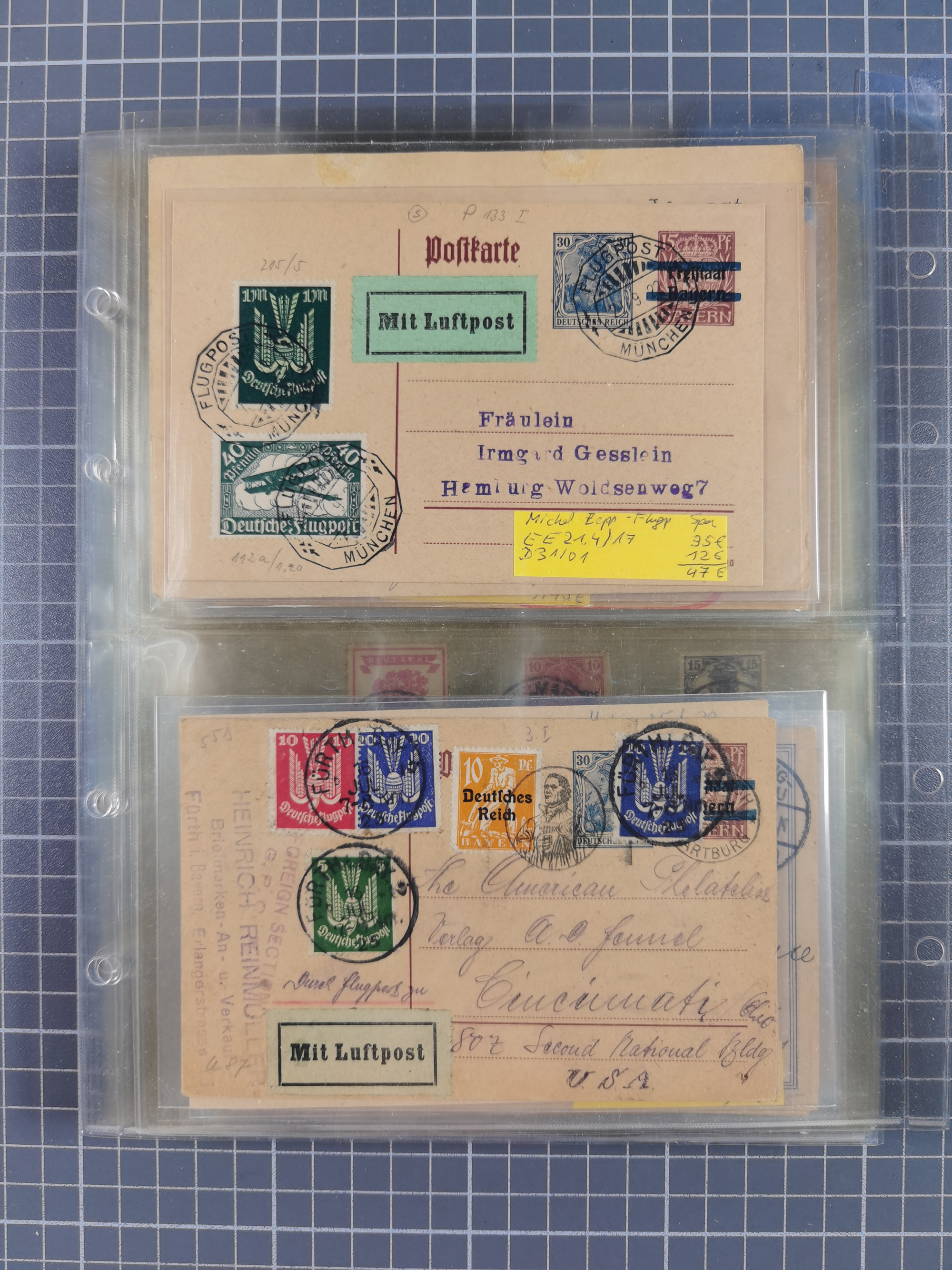 1910/45, Deutsche und internationale Flugpost, 2 Alben mit 430 Briefen, Karten, GZ, Ansichtskarten, dabei Deutsches Reich mit 88 Stück, mit vielen besseren Belegen, besonders zwischen 1919-1926, aber auch mit Bayern SFP 1/02 (1912) und 4 x Rhein-Main. Vom Einlieferer wurden 48 deutsche Flugbriefe/ Karten nach Michel Flugpost Spezial bewertet, diese über 4.600 €, darunter Flugkarte mit 2 RM Polarfahrt. Dabei auch gute und attraktive Flugpostbelege von Europa, Übersee und USA z.B. 2 x Flugpost Lemberg-Wien 1918, viele Erstflüge (besonders USA) und Sonderkarten, meist gute Erhaltung