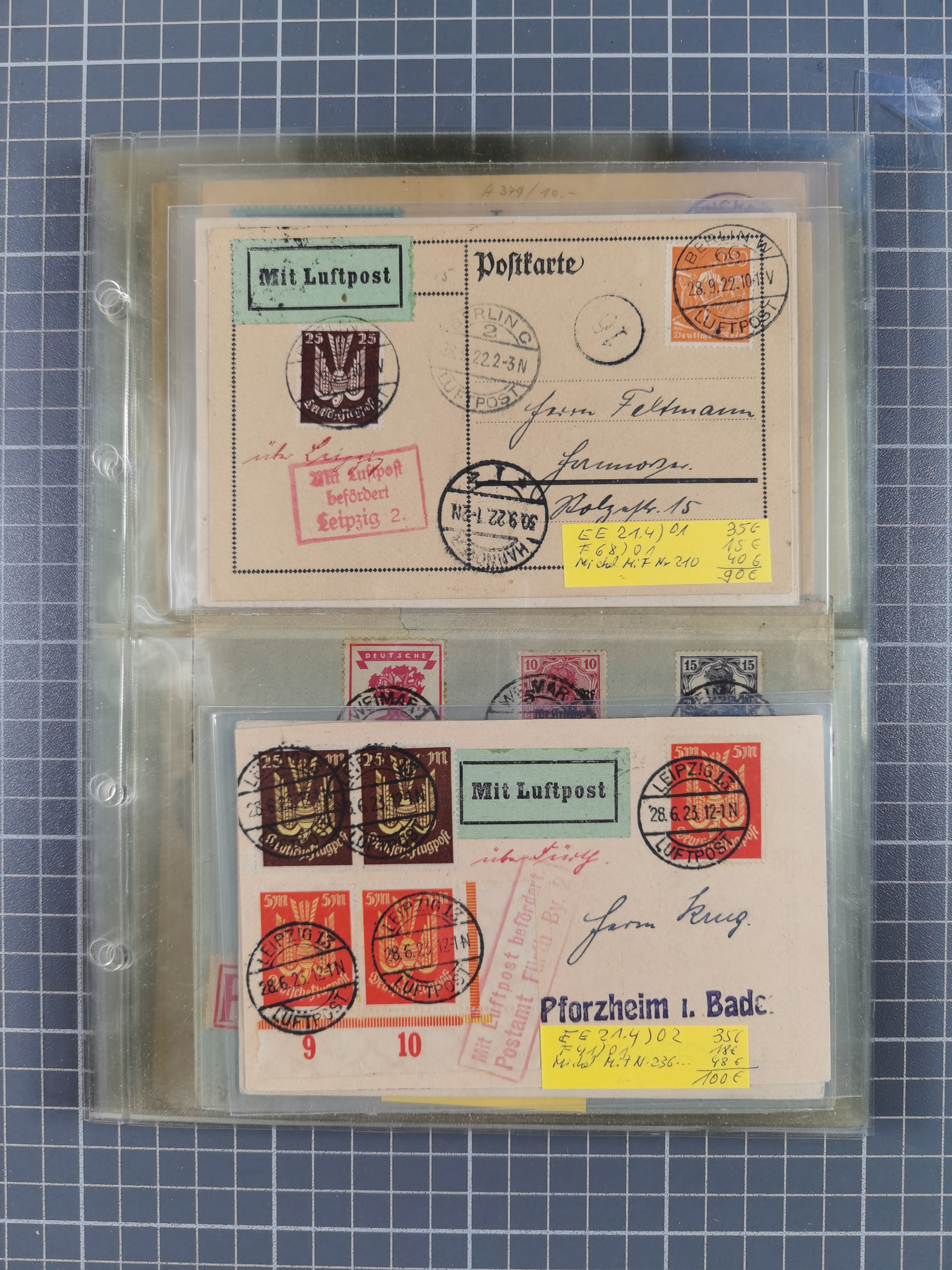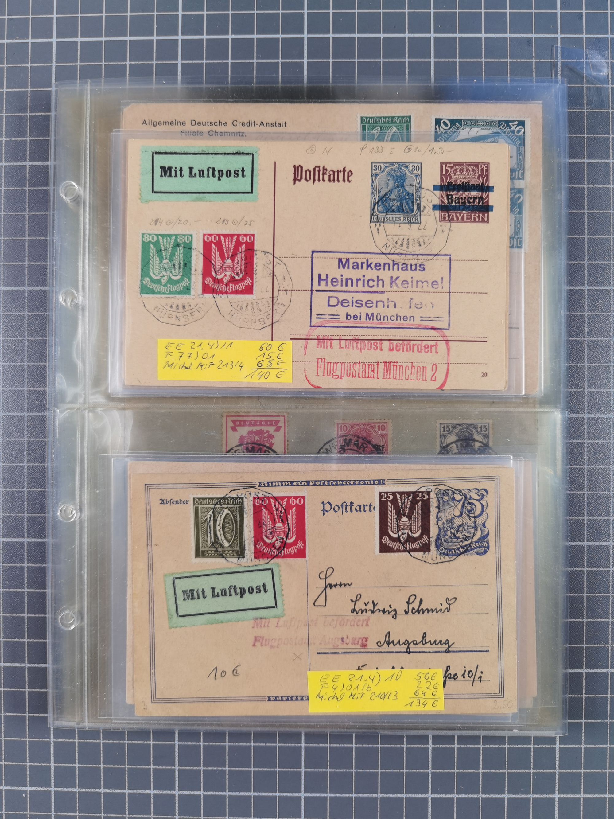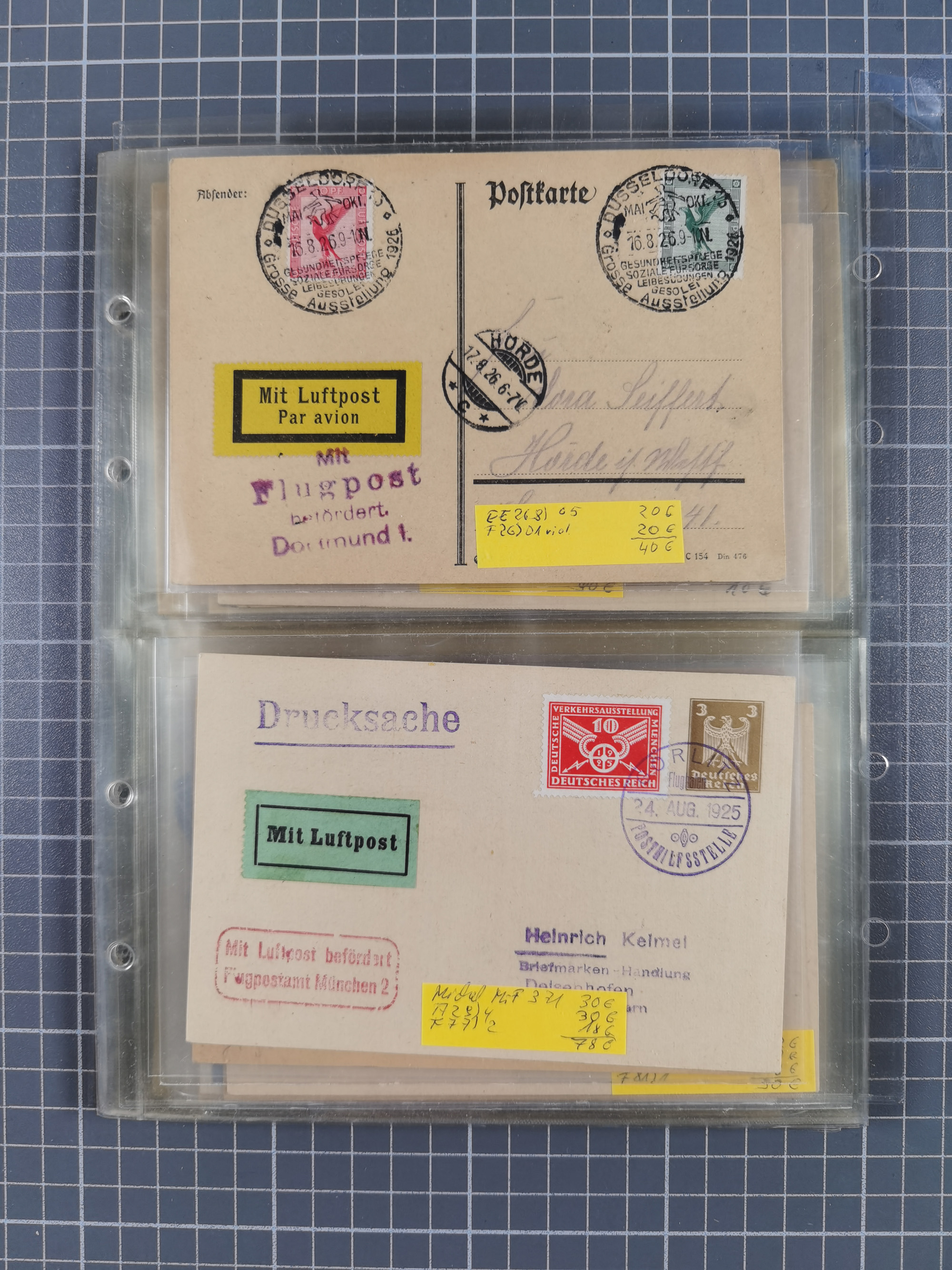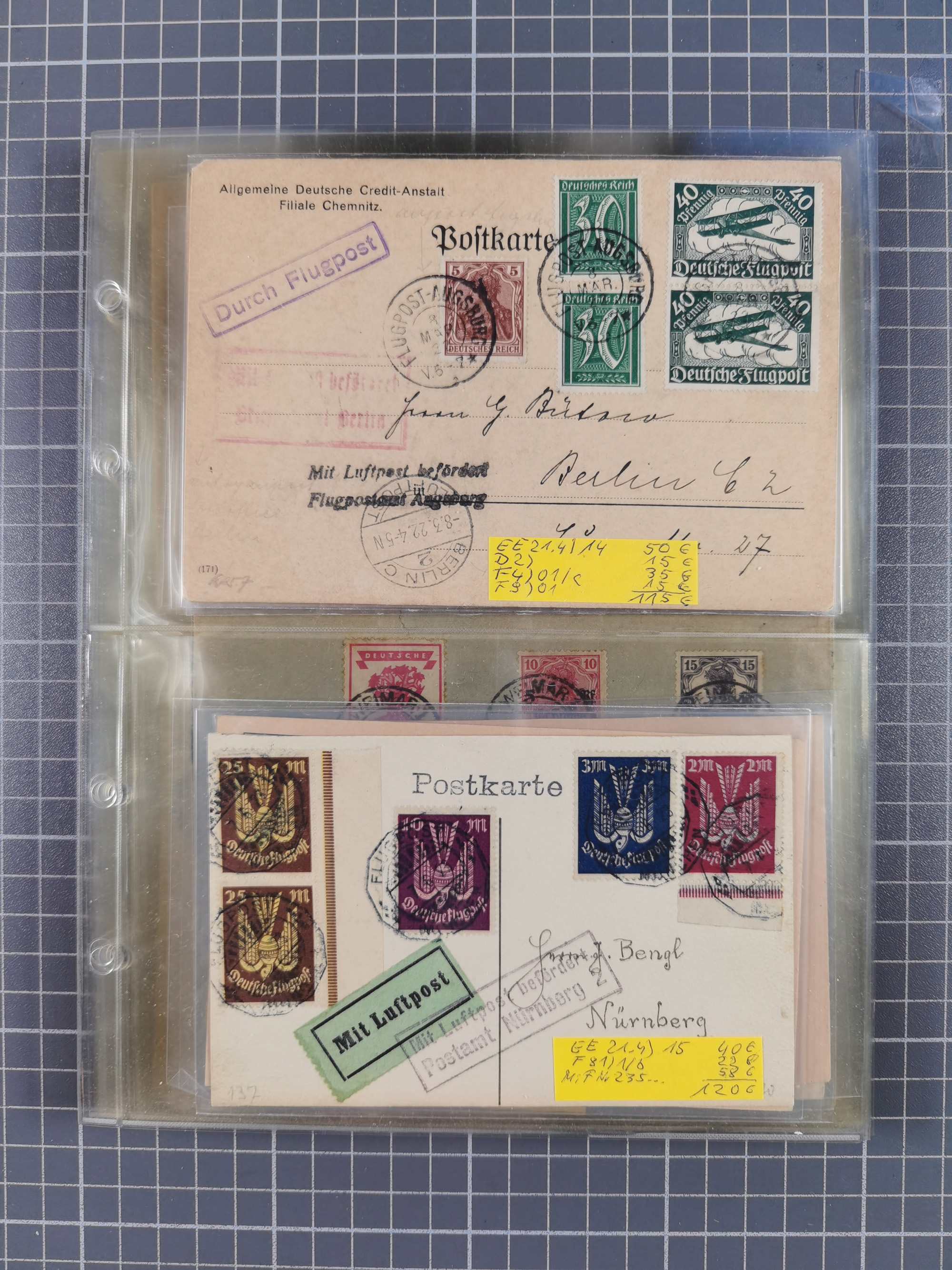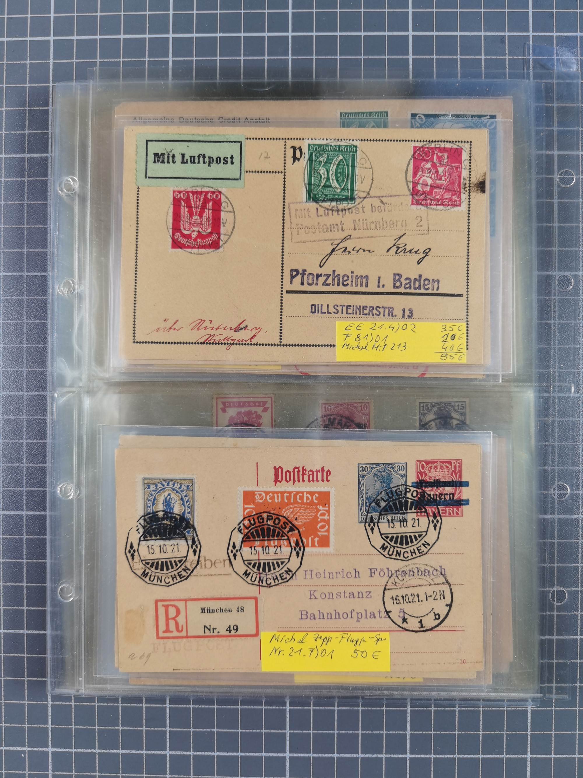 1910/45, Deutsche und internationale Flugpost, 2 Alben mit 430 Briefen, Karten, GZ, Ansichtskarten, dabei Deutsches Reich mit 88 Stück, mit vielen besseren Belegen, besonders zwischen 1919-1926, aber auch mit Bayern SFP 1/02 (1912) und 4 x Rhein-Main. Vom Einlieferer wurden 48 deutsche Flugbriefe/ Karten nach Michel Flugpost Spezial bewertet, diese über 4.600 €, darunter Flugkarte mit 2 RM Polarfahrt. Dabei auch gute und attraktive Flugpostbelege von Europa, Übersee und USA z.B. 2 x Flugpost Lemberg-Wien 1918, viele Erstflüge (besonders USA) und Sonderkarten, meist gute Erhaltung