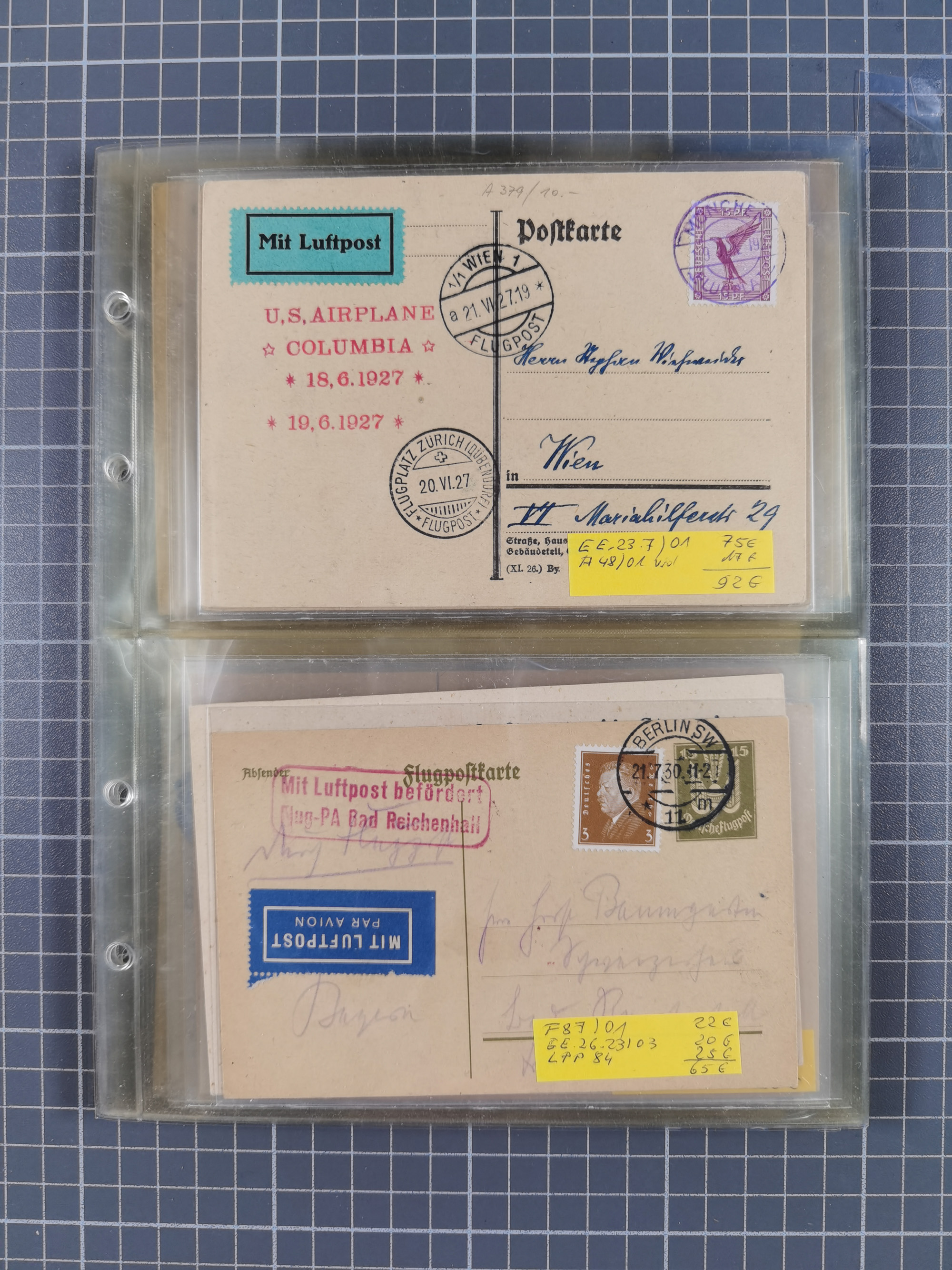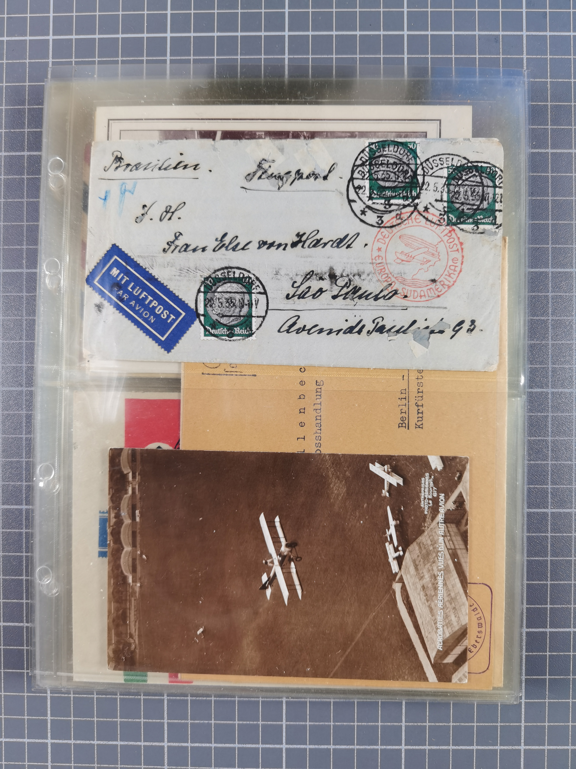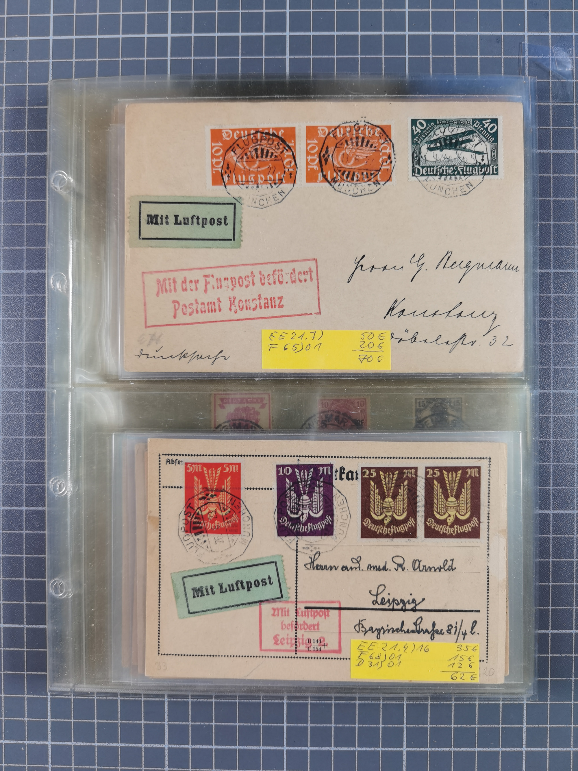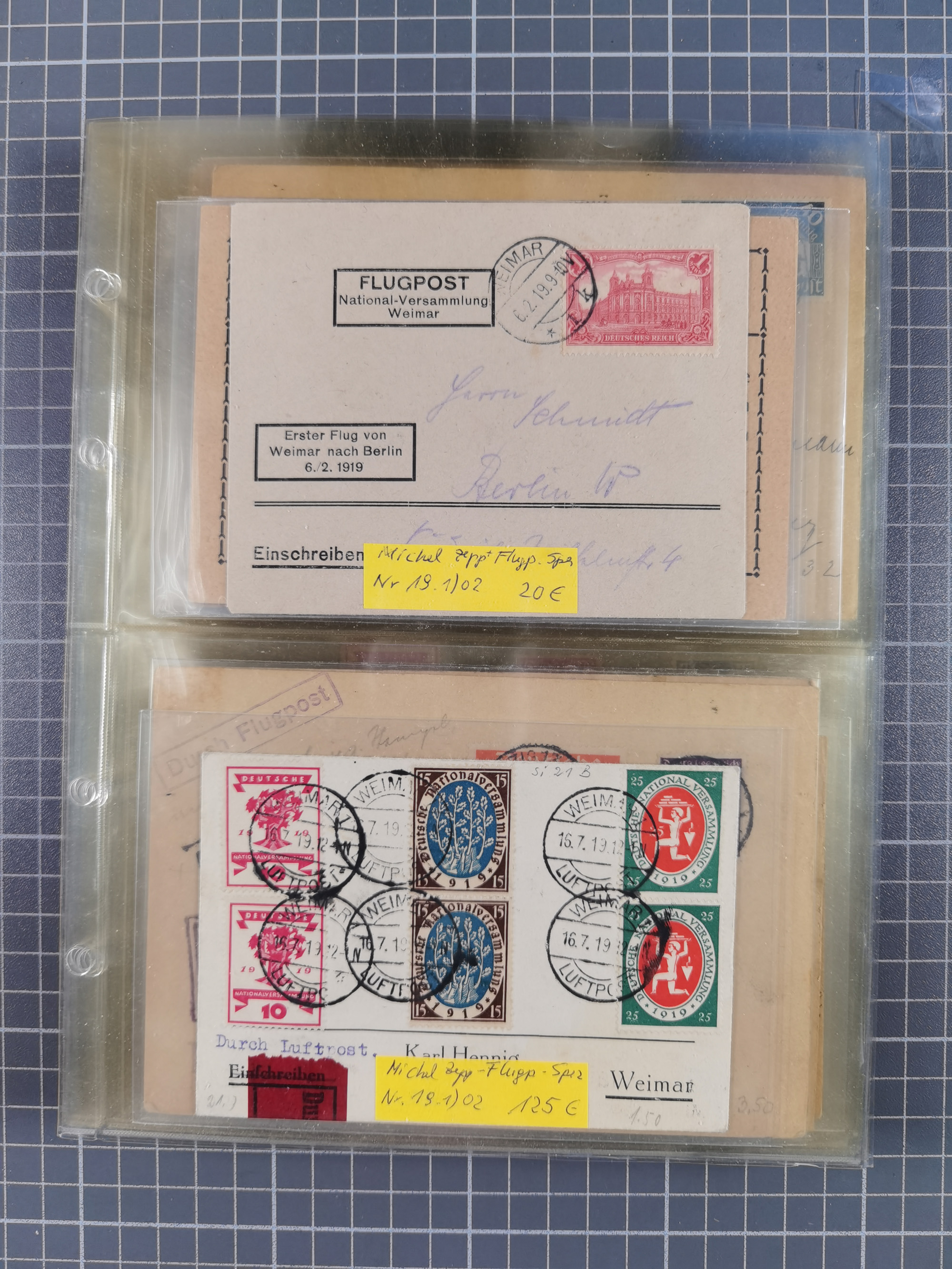 1910/45, Deutsche und internationale Flugpost, 2 Alben mit 430 Briefen, Karten, GZ, Ansichtskarten, dabei Deutsches Reich mit 88 Stück, mit vielen besseren Belegen, besonders zwischen 1919-1926, aber auch mit Bayern SFP 1/02 (1912) und 4 x Rhein-Main. Vom Einlieferer wurden 48 deutsche Flugbriefe/ Karten nach Michel Flugpost Spezial bewertet, diese über 4.600 €, darunter Flugkarte mit 2 RM Polarfahrt. Dabei auch gute und attraktive Flugpostbelege von Europa, Übersee und USA z.B. 2 x Flugpost Lemberg-Wien 1918, viele Erstflüge (besonders USA) und Sonderkarten, meist gute Erhaltung
