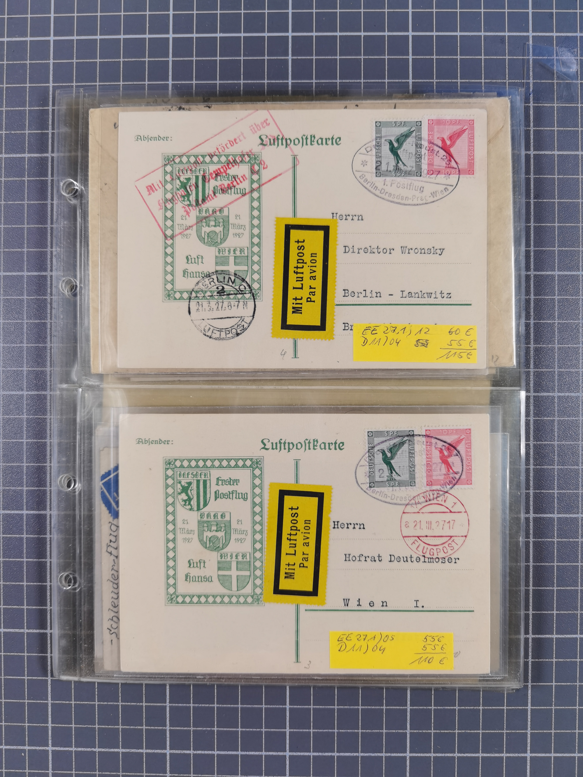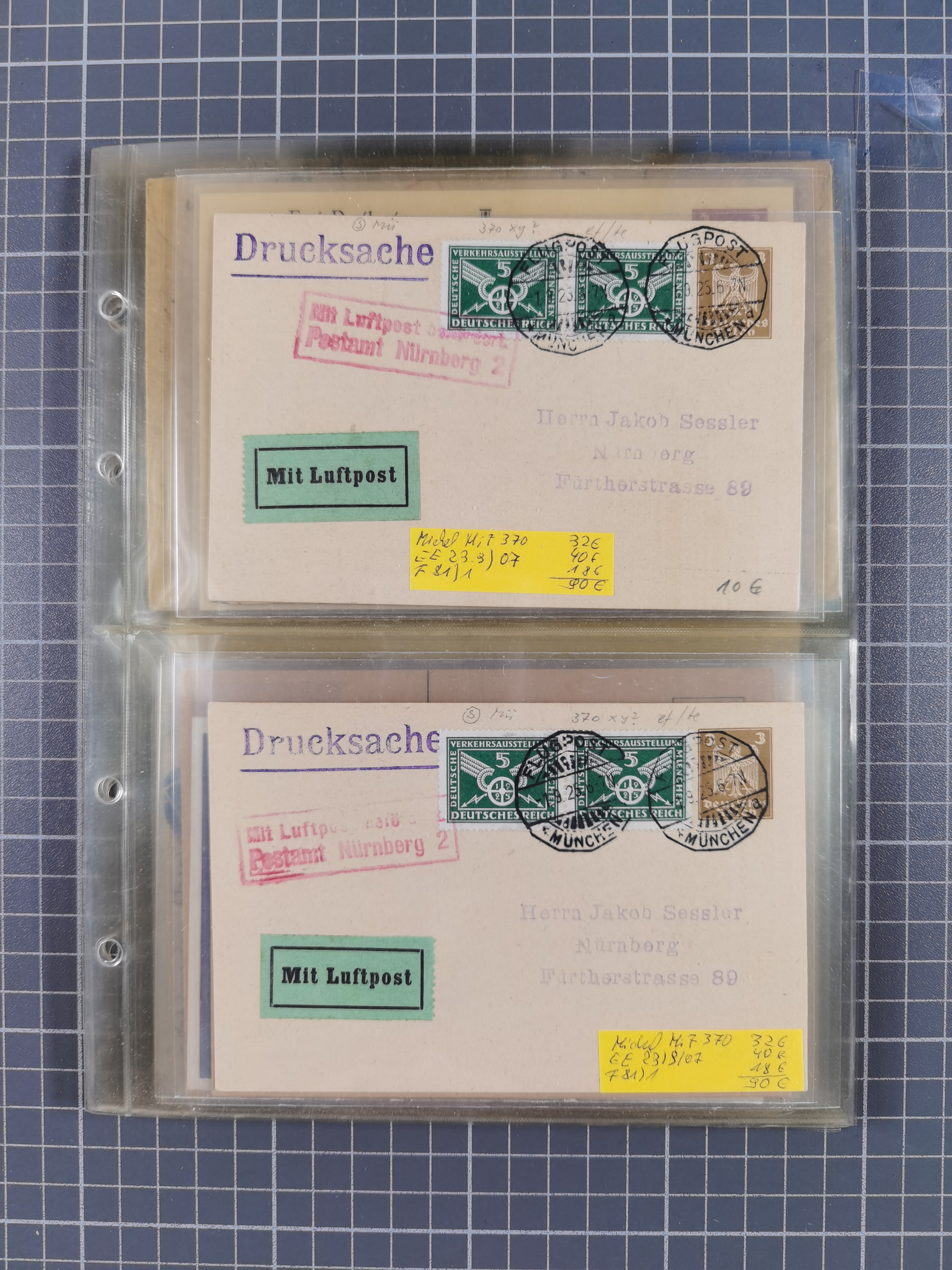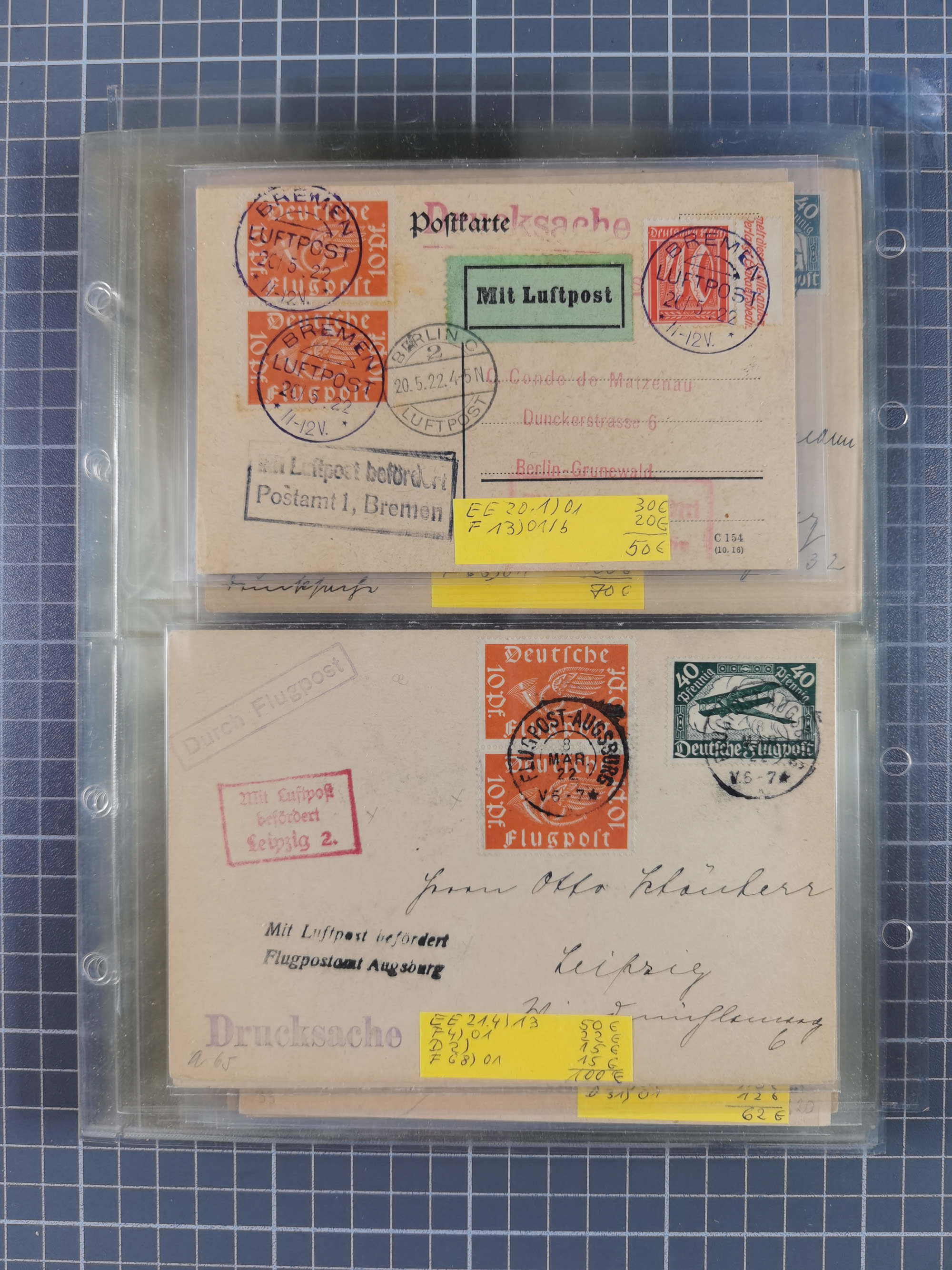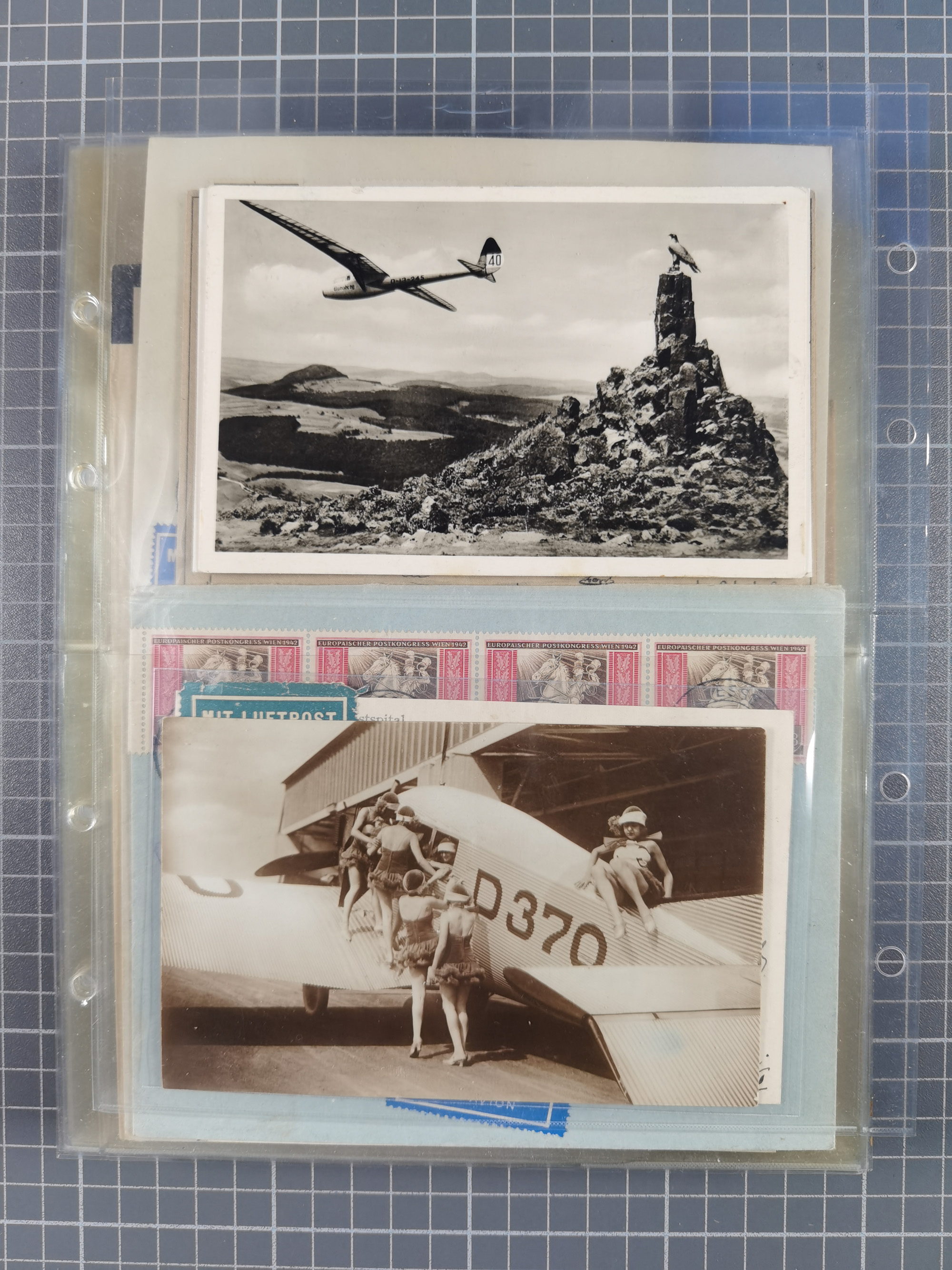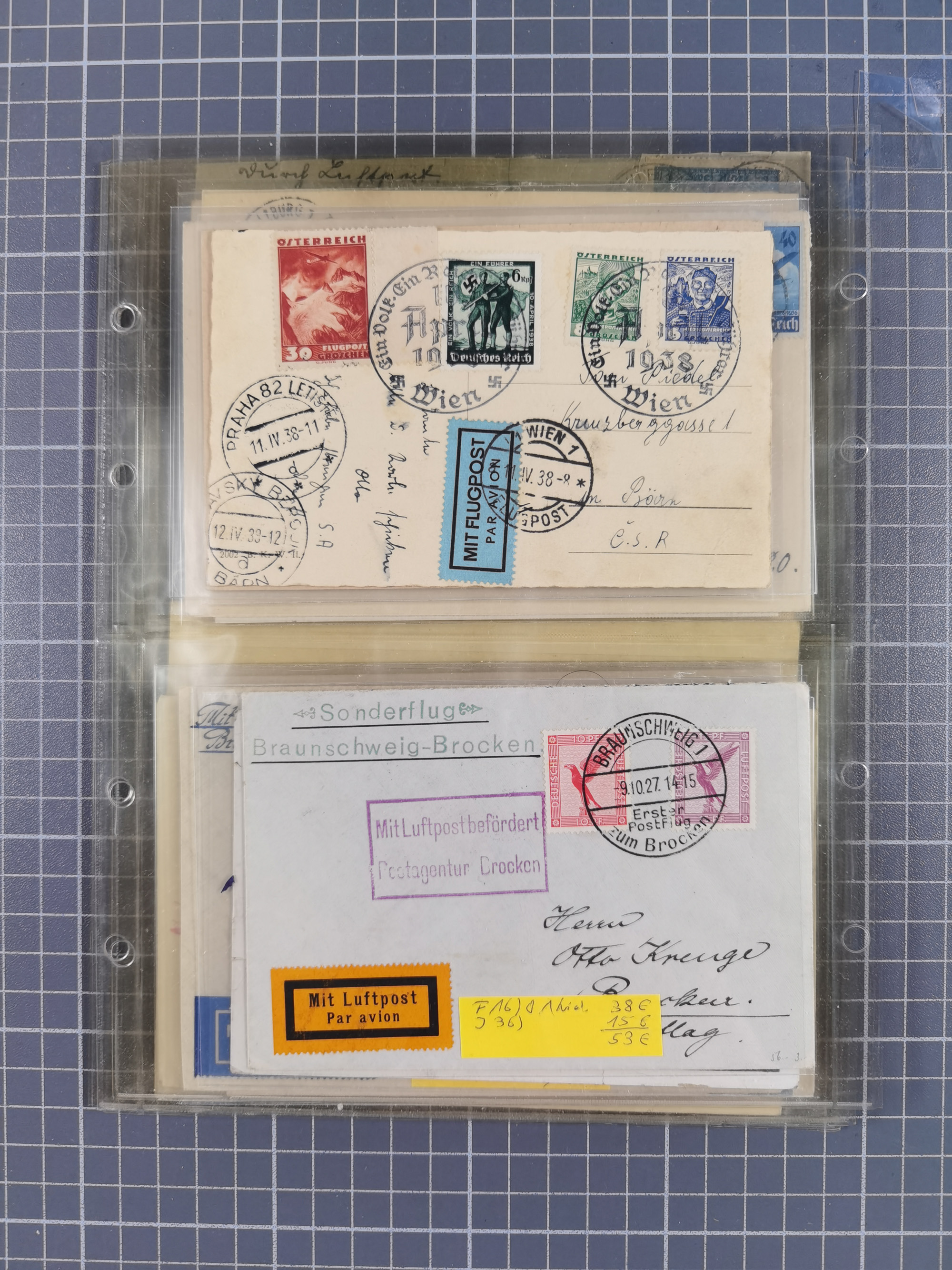 1910/45, Deutsche und internationale Flugpost, 2 Alben mit 430 Briefen, Karten, GZ, Ansichtskarten, dabei Deutsches Reich mit 88 Stück, mit vielen besseren Belegen, besonders zwischen 1919-1926, aber auch mit Bayern SFP 1/02 (1912) und 4 x Rhein-Main. Vom Einlieferer wurden 48 deutsche Flugbriefe/ Karten nach Michel Flugpost Spezial bewertet, diese über 4.600 €, darunter Flugkarte mit 2 RM Polarfahrt. Dabei auch gute und attraktive Flugpostbelege von Europa, Übersee und USA z.B. 2 x Flugpost Lemberg-Wien 1918, viele Erstflüge (besonders USA) und Sonderkarten, meist gute Erhaltung