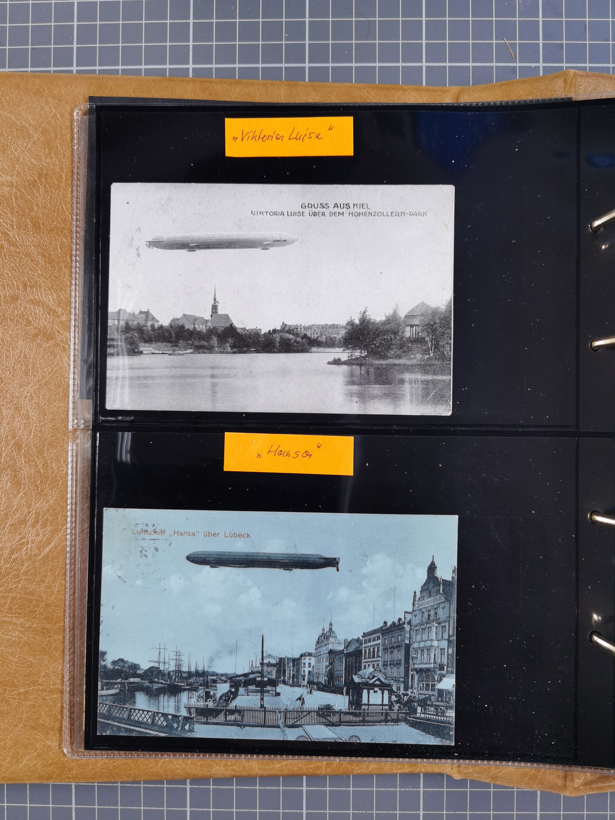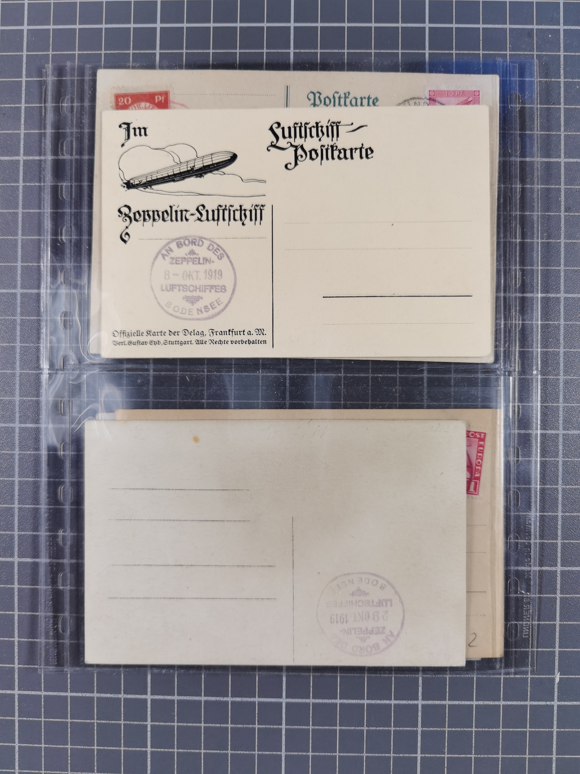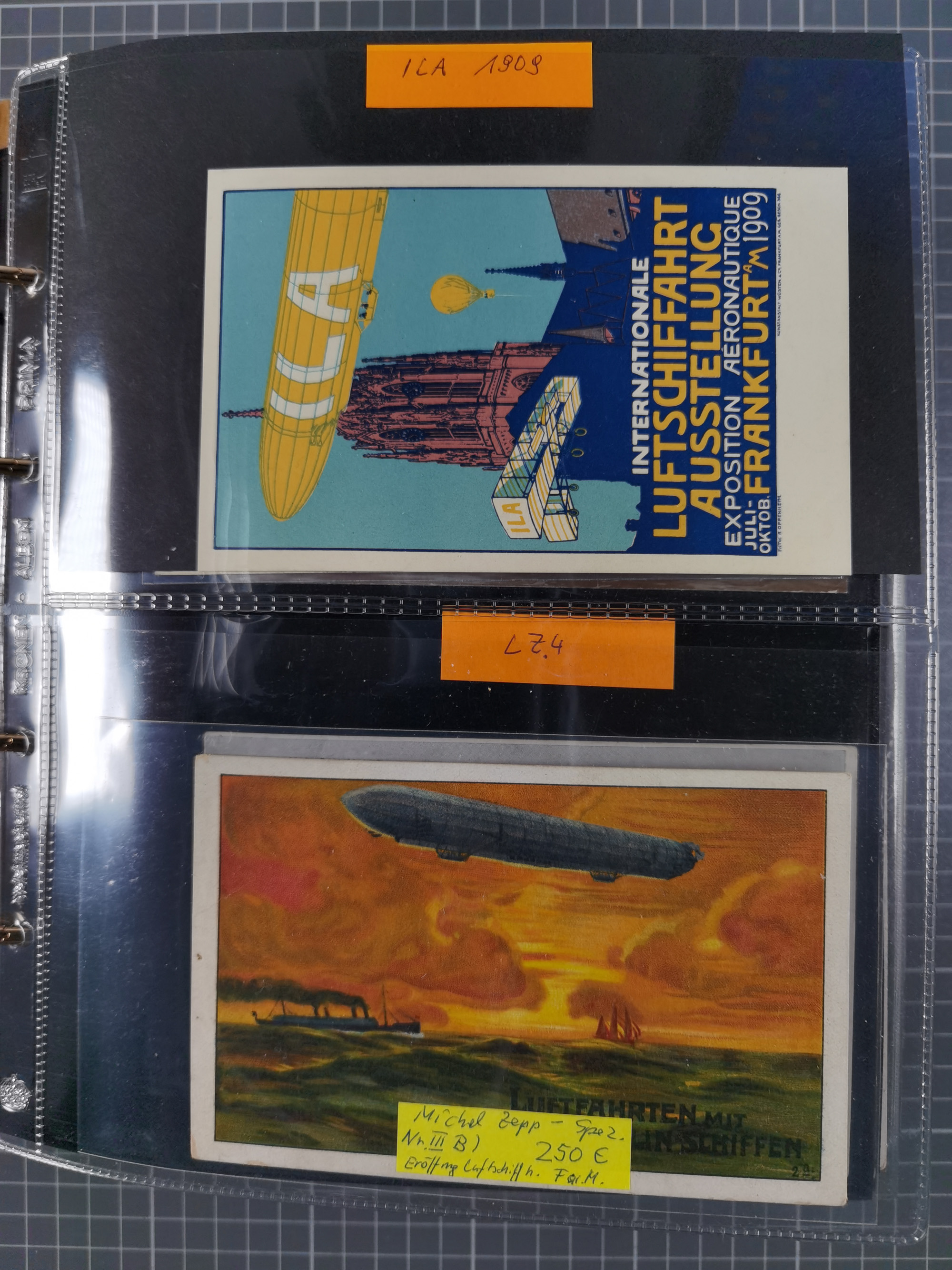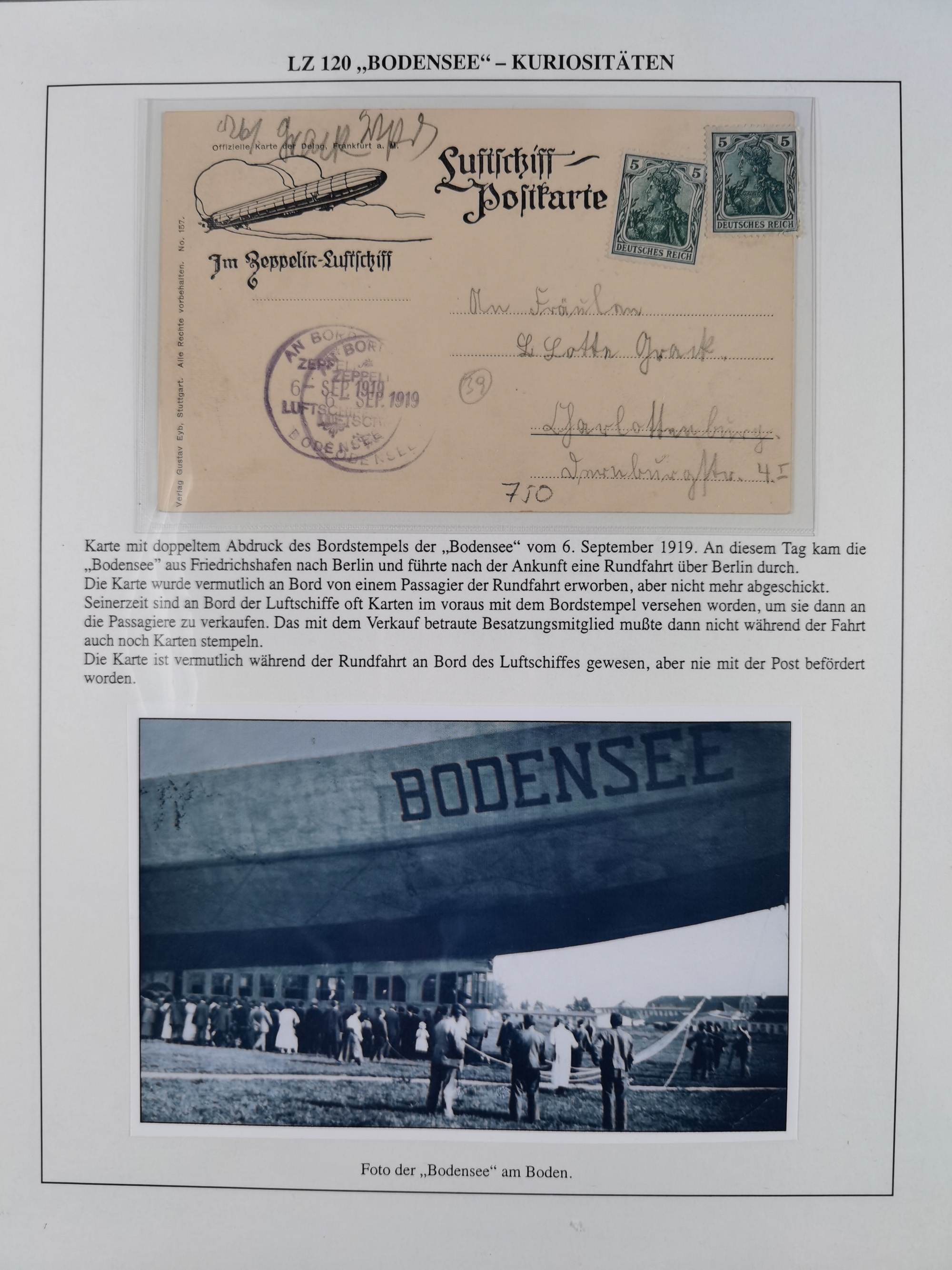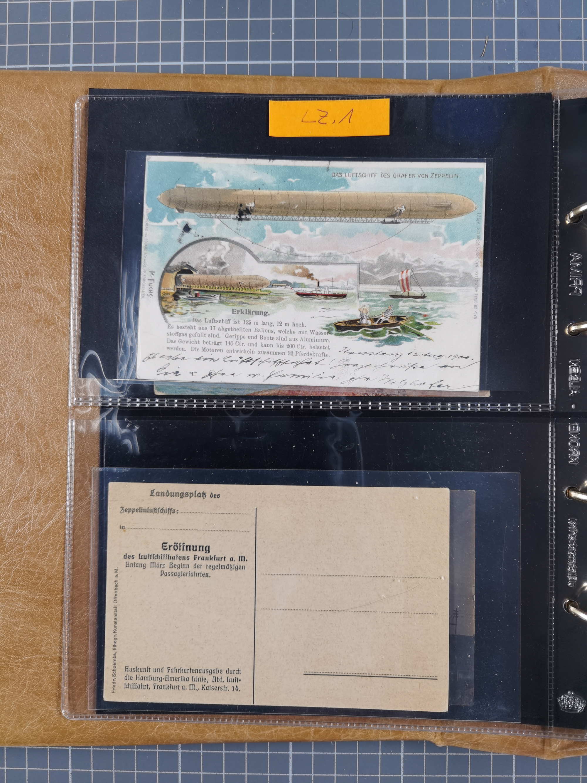 1912, “Deutsche Luftschiffahrts-Aktien violetter Kreisstempel auf Passier-Karte zum Luftschiffhafen Frankfurt mit Originalfoto einer Halle von innen und zwei ungebraucht/gebraucht Ansichtskarten mit Abbildung der „Victoria Louise”. Dazu “Wein-Karte” der Restauration Luftschiff-Halle mit acht eingeklebten Fotos, u.a. von der Victoria Luise