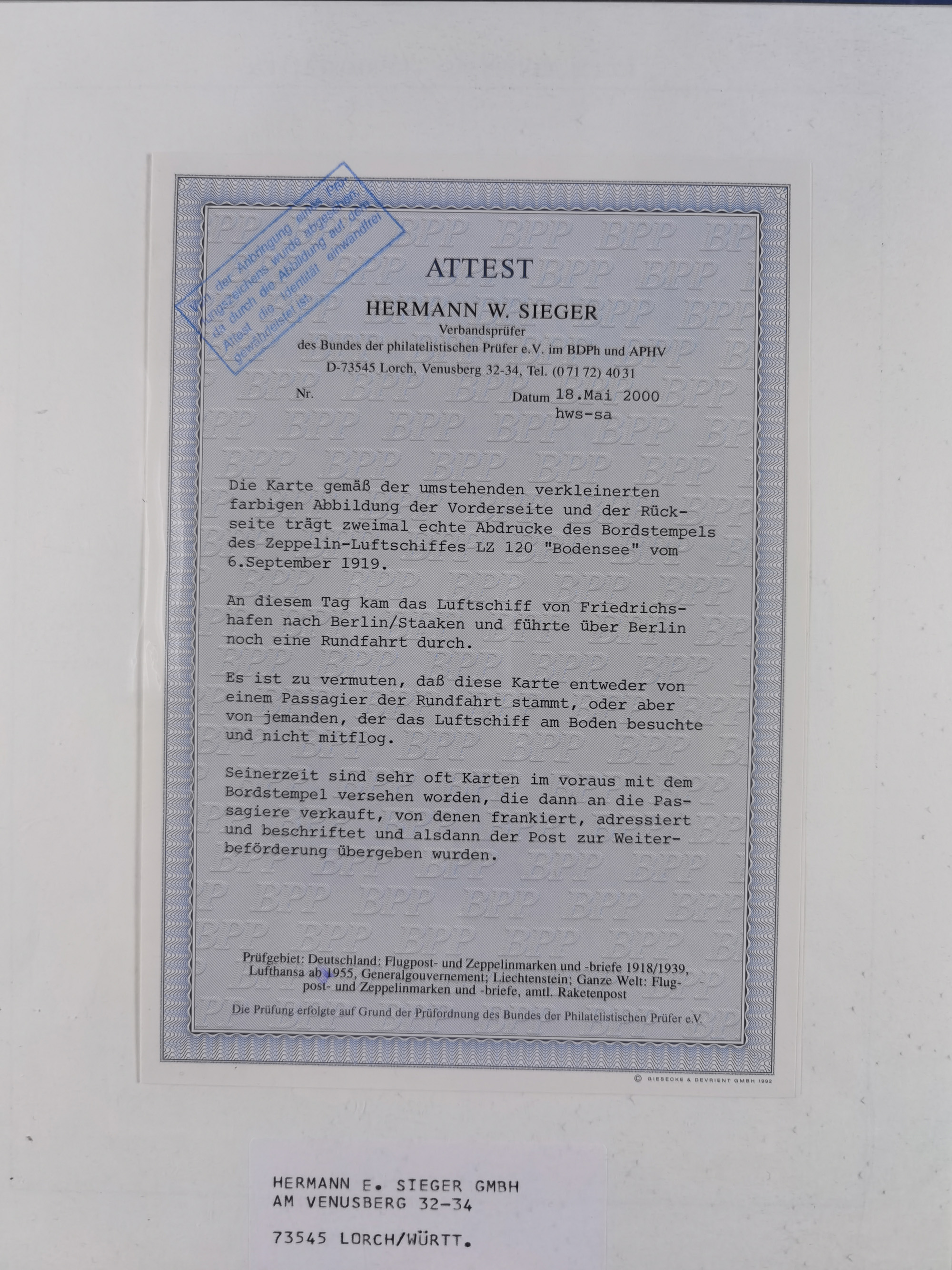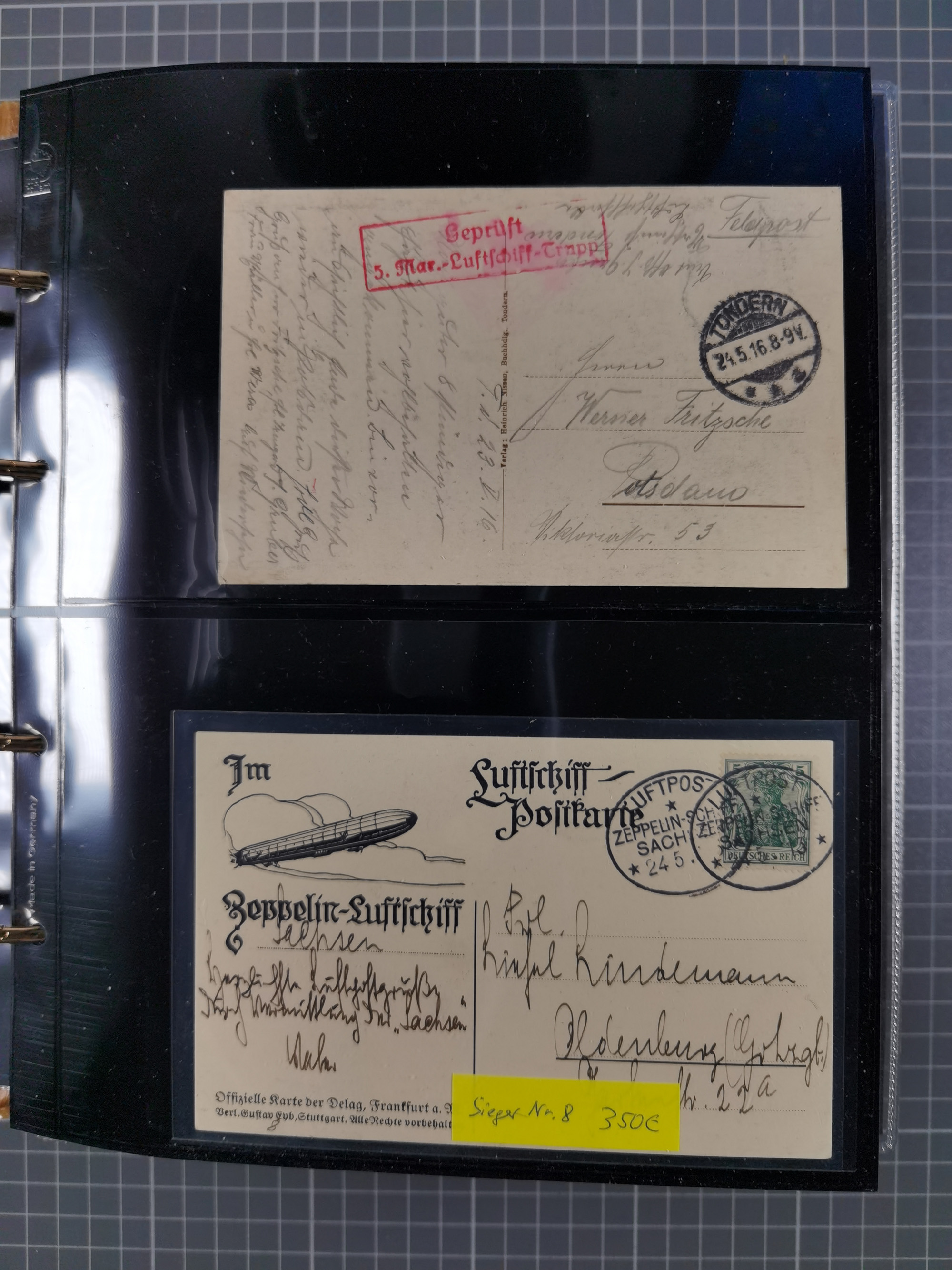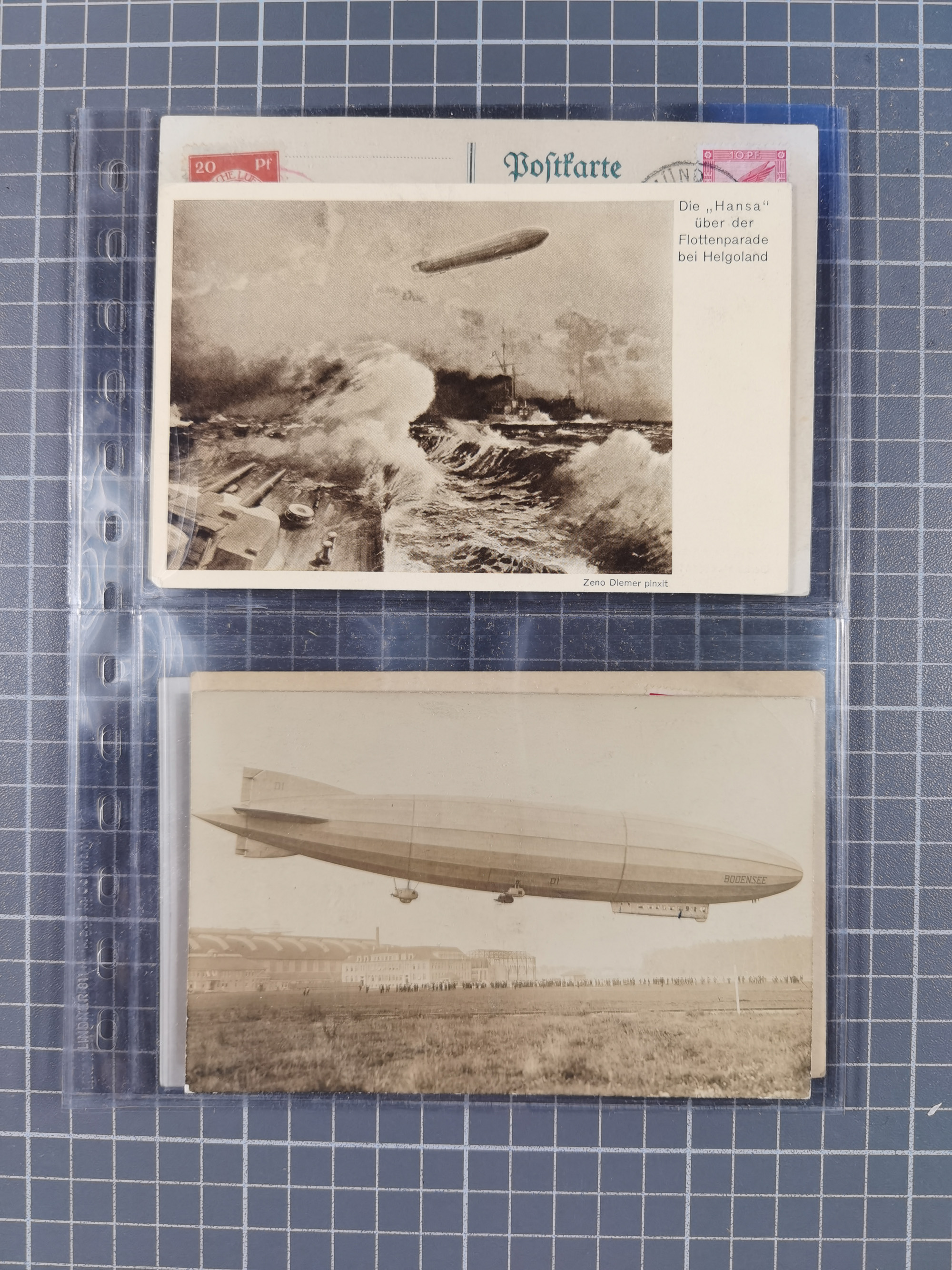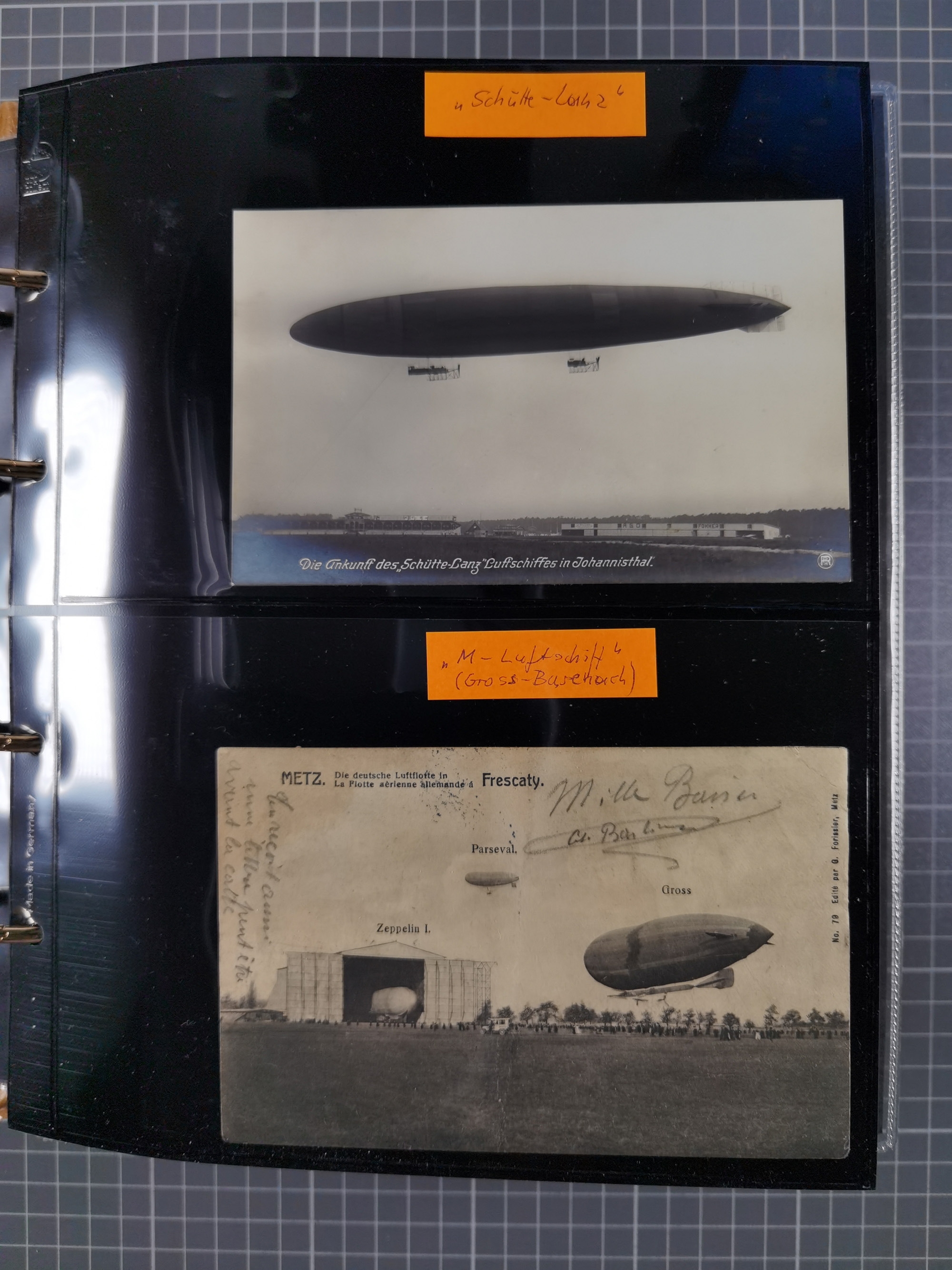 1912, “Deutsche Luftschiffahrts-Aktien violetter Kreisstempel auf Passier-Karte zum Luftschiffhafen Frankfurt mit Originalfoto einer Halle von innen und zwei ungebraucht/gebraucht Ansichtskarten mit Abbildung der „Victoria Louise”. Dazu “Wein-Karte” der Restauration Luftschiff-Halle mit acht eingeklebten Fotos, u.a. von der Victoria Luise