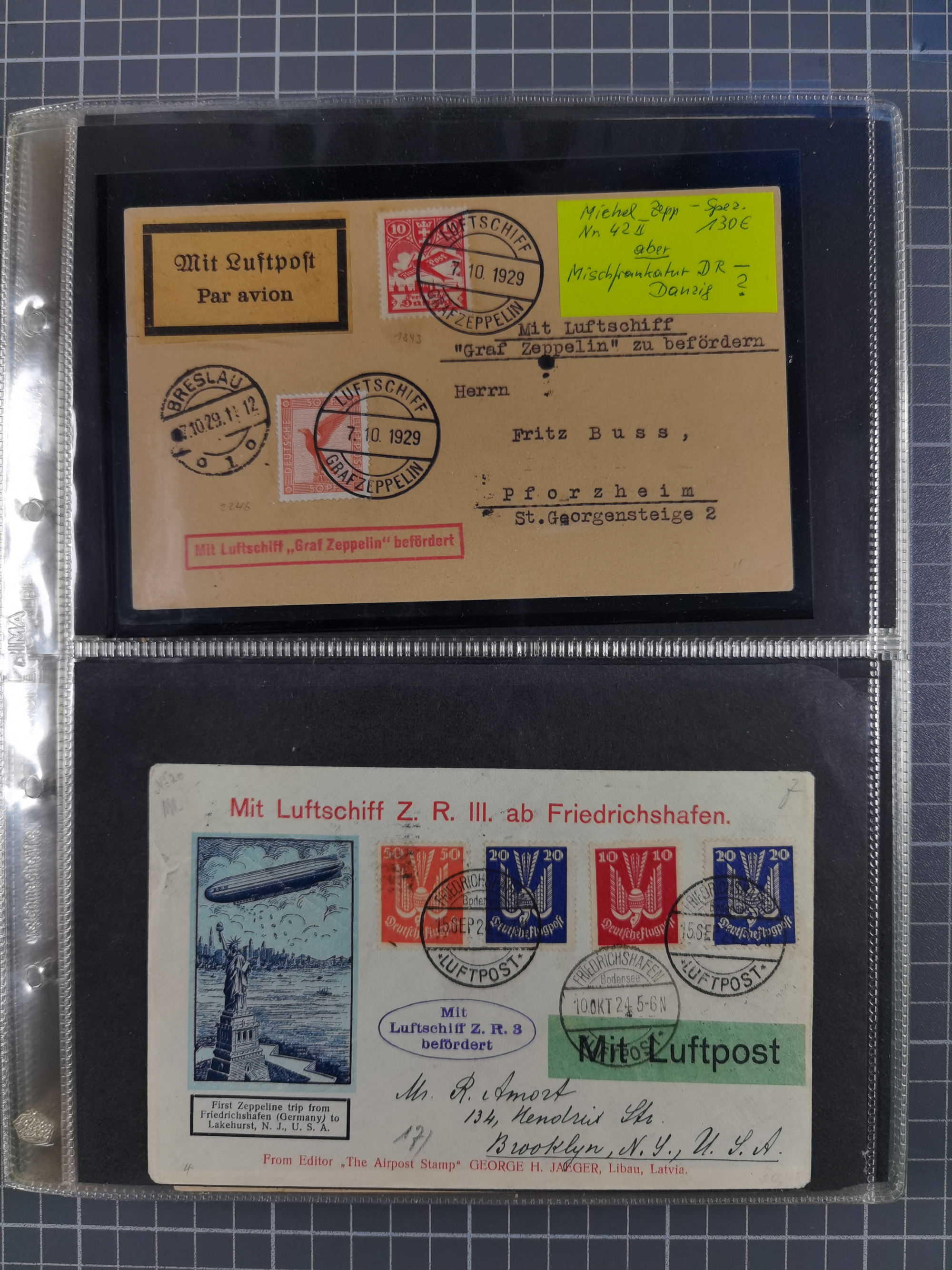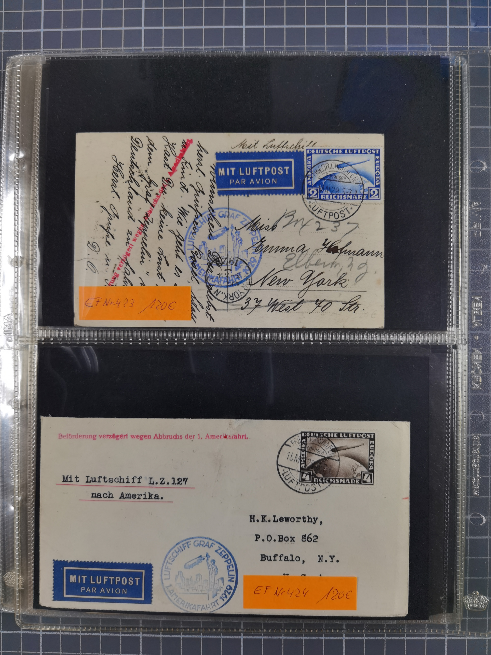 1929, 1. Amerikafahrt, Brief mit Sondermarke 4 M. und Tagesstempel “FRIEDRICHSHAFEN 16.MAI.29” sowie Verzögerungsstempel in Rot, später befördert mit Ankunftsstempel vom 5.8.1929. Dann neu aufgegeben mit amerikanischer Frankatur und Poststempel “NEW YORK 9.5.1929” für die Rückfahrt “Lakehurst - Friedrichshafen” mit amerikanischem Sonderbestätigungsstempel der Weltrundfahrt und Ankunftstempel vom 10.8.1929, adressiert nach Deggendorf. Interessante Kombination mit der Rückfahrt auf einem Brief