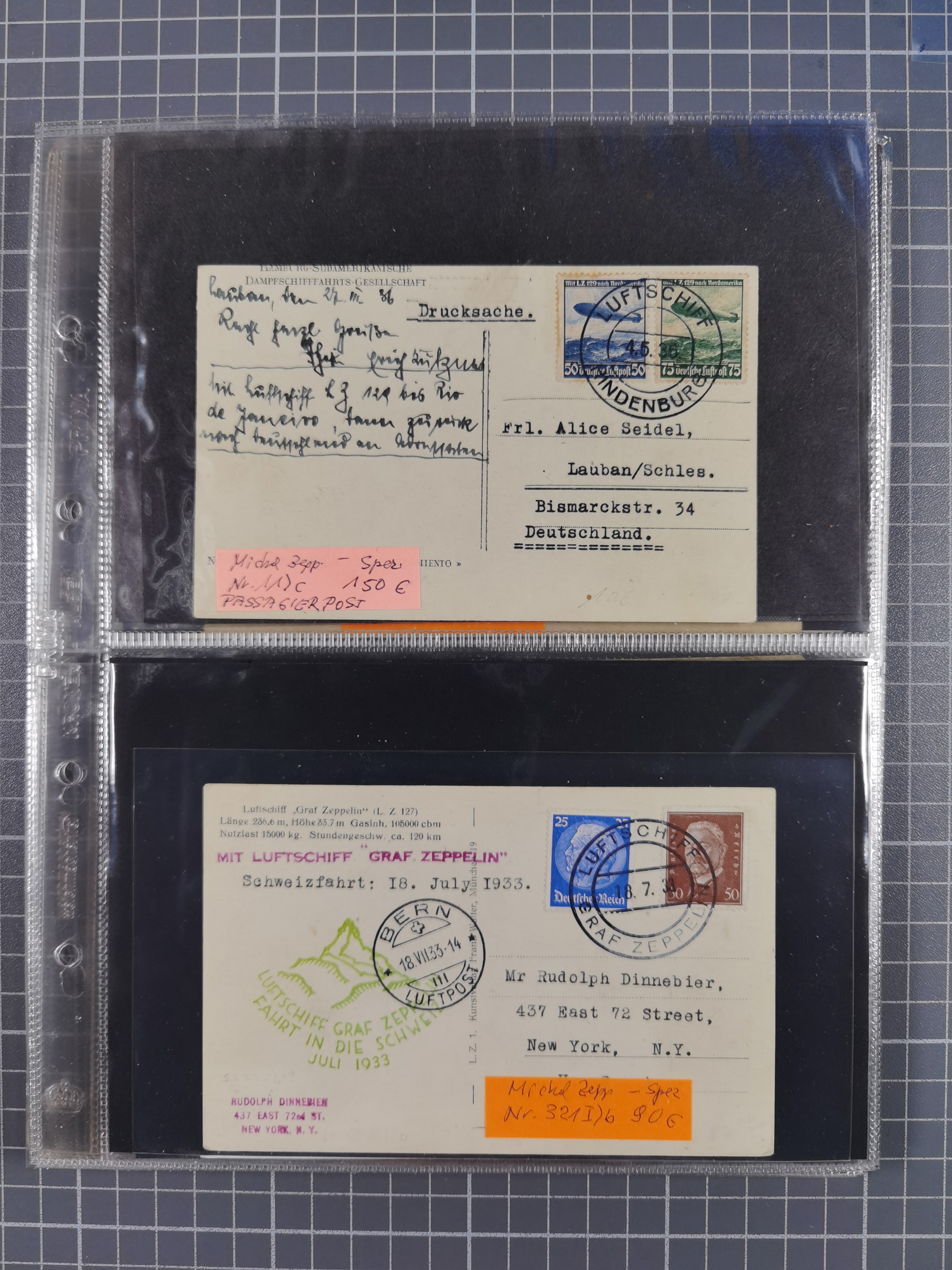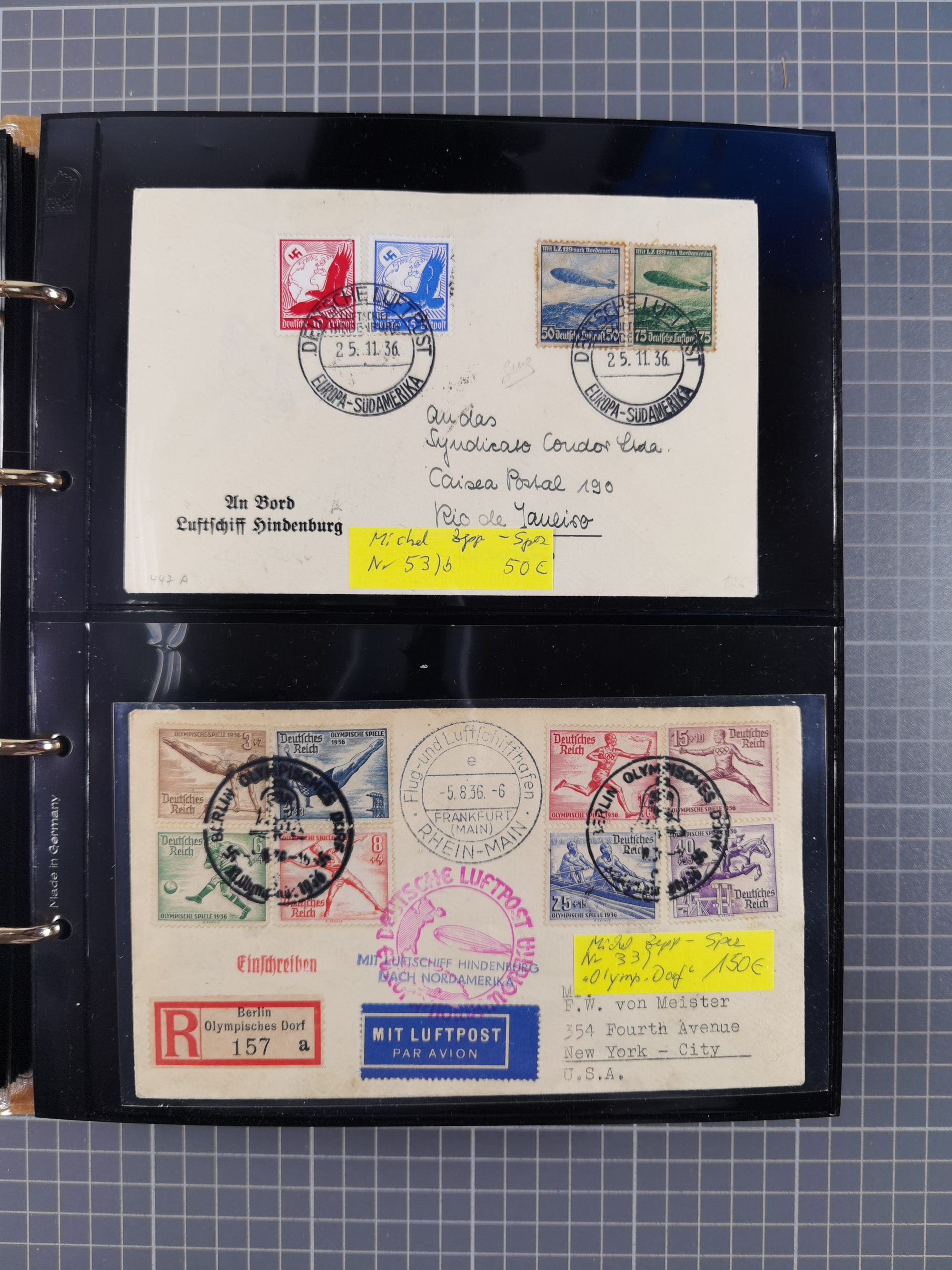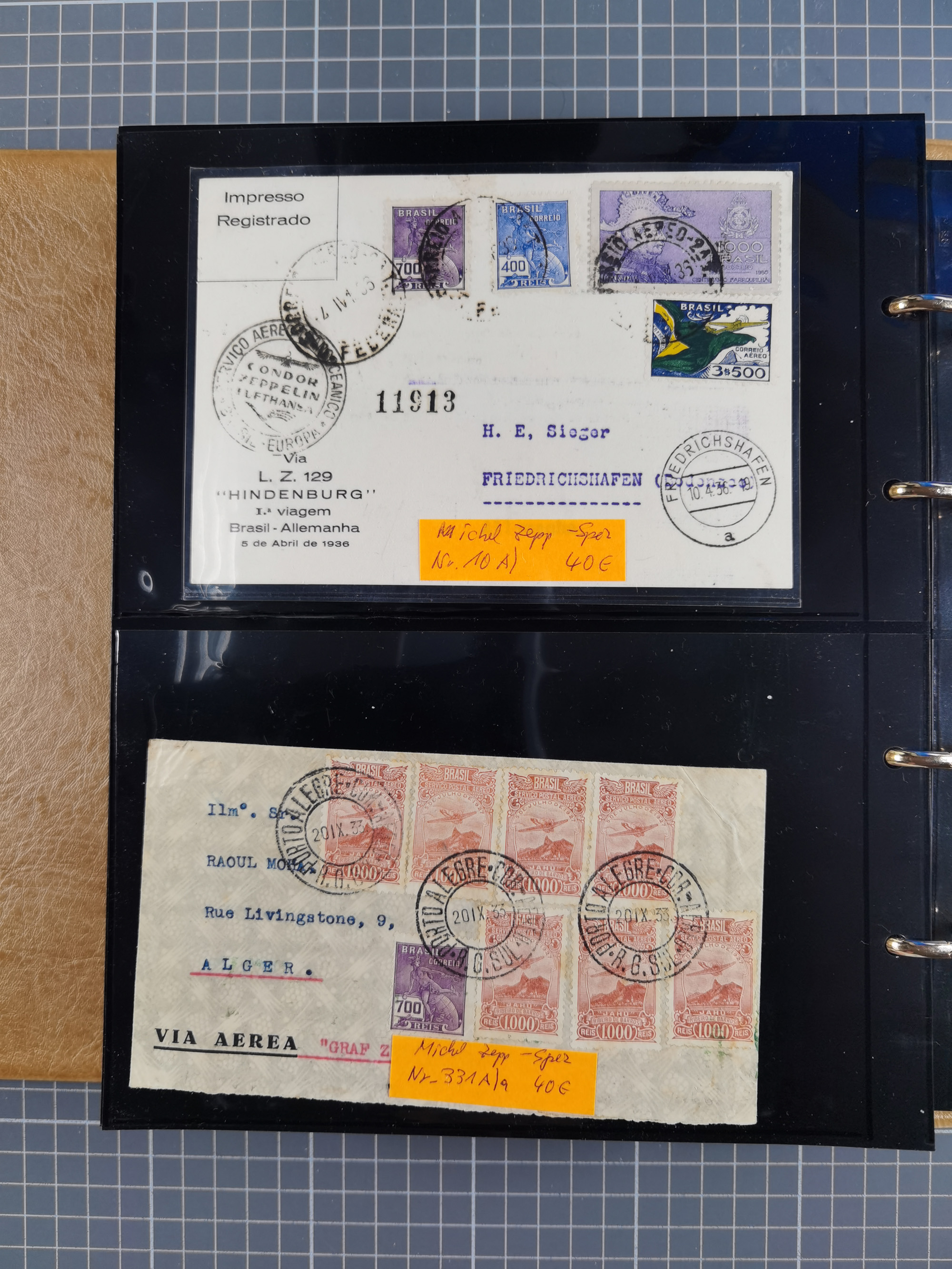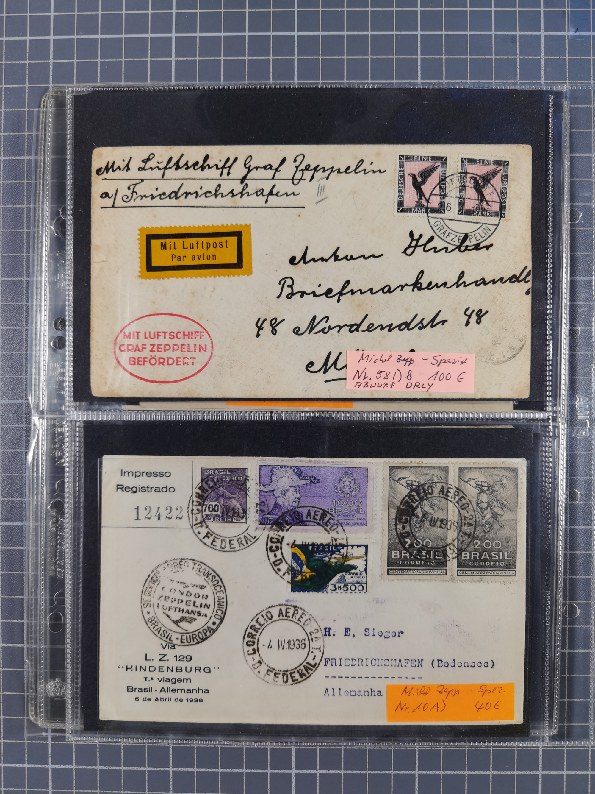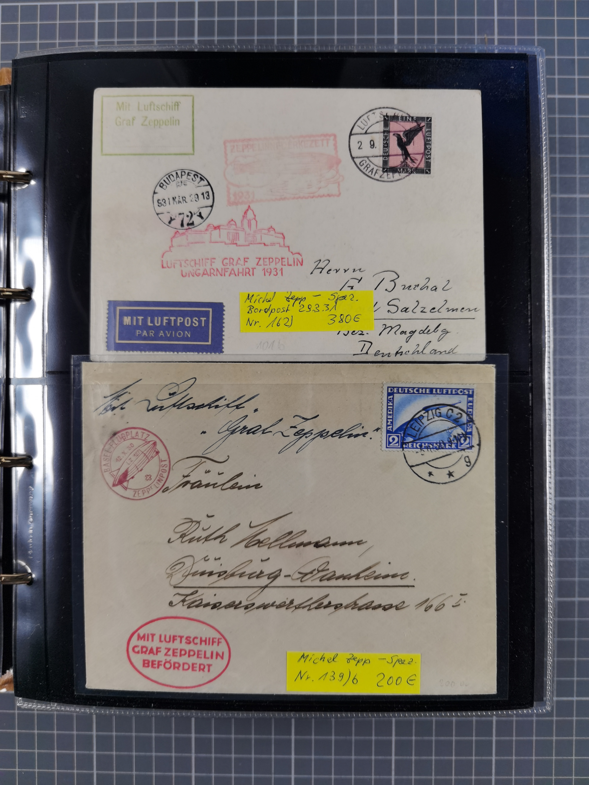 1913/36, Album mit 55 Zeppelinbriefen -Karten, (51 St. DR) dabei viele bessere Belege, u.a. DR großes Telegramm Luftschiff Hindenburg. Zeppelinkarte Viktoria Luise" und Hansa" (Sieger Nr. 4 und 6 II) Zeppelinbrief mit 1 und 2 RM Chicagofahrt!, Zeppelinkarte Nordpolarfahrt Zuleitung Niederlande. 2. SAF 1933, Zuleitung franz. Andorra, Zeppelin-Karte mit 2. SAF 1931 Hin- und Rückfahrt mit brasilianischer und deutscher Frankatur (2 x 1 RM Zeppelin) 10 Zeppelinbriefe/Karten mit 1.2 und 4 RM Zeppelin, meist gute Erhaltung