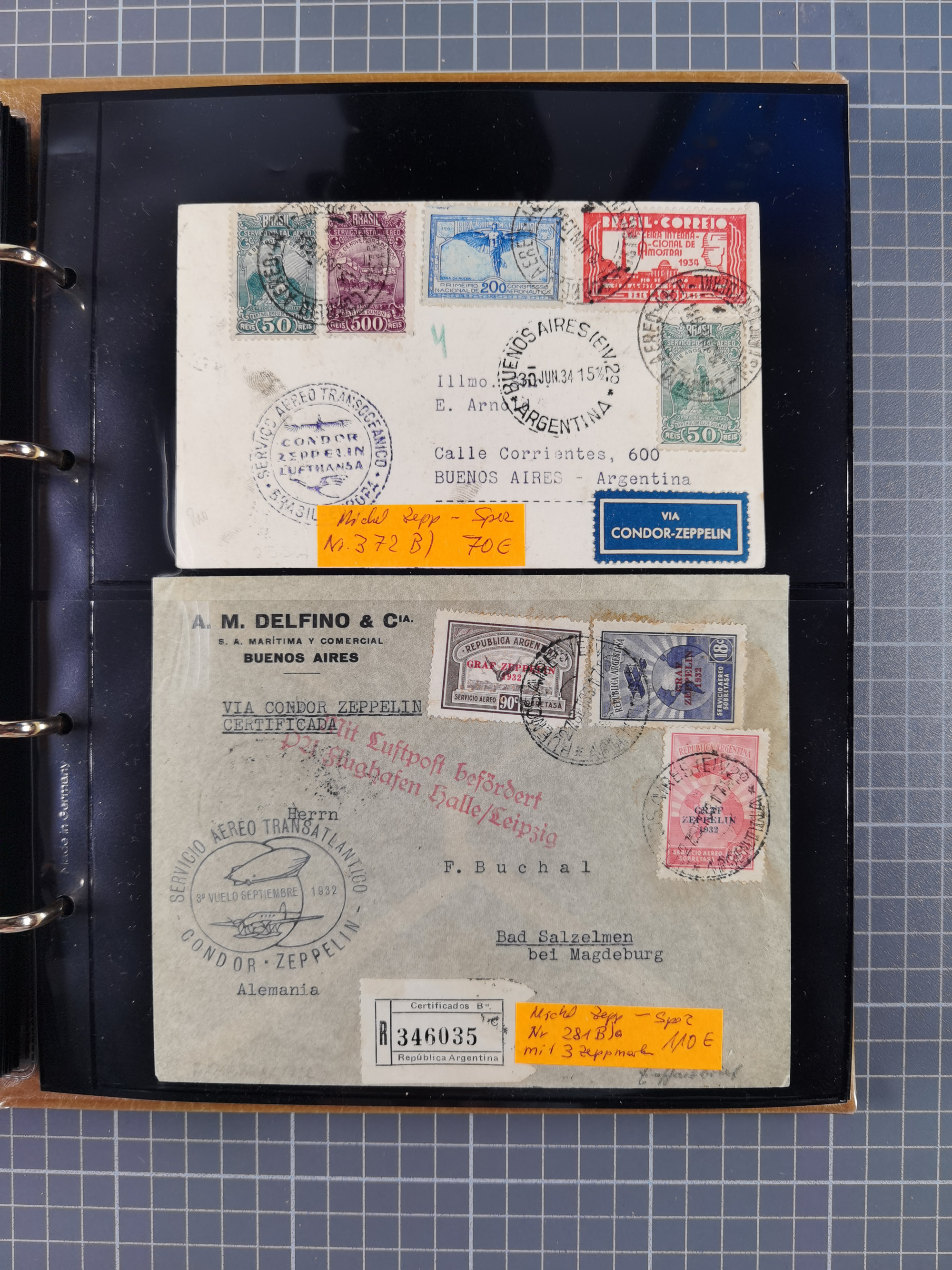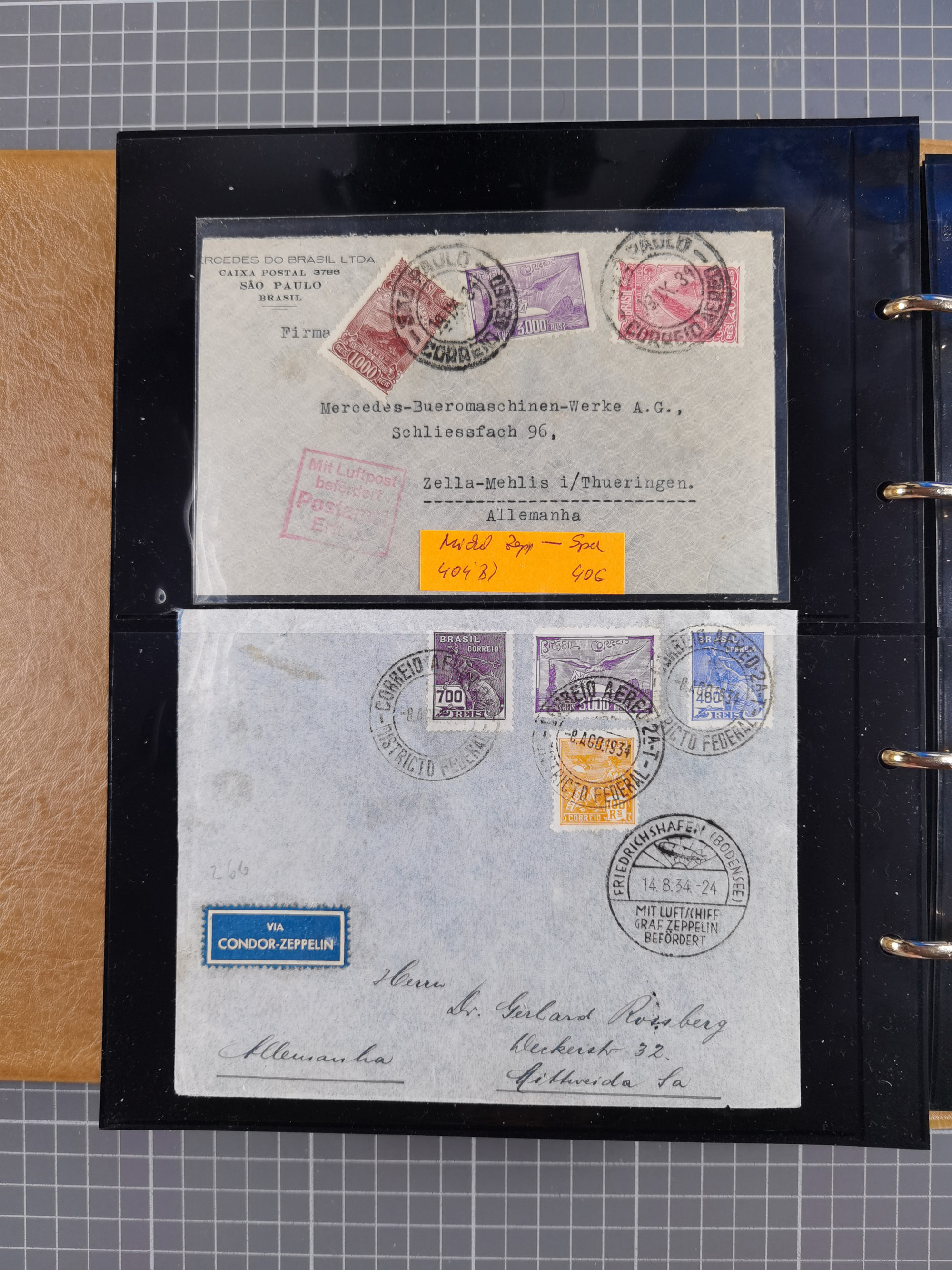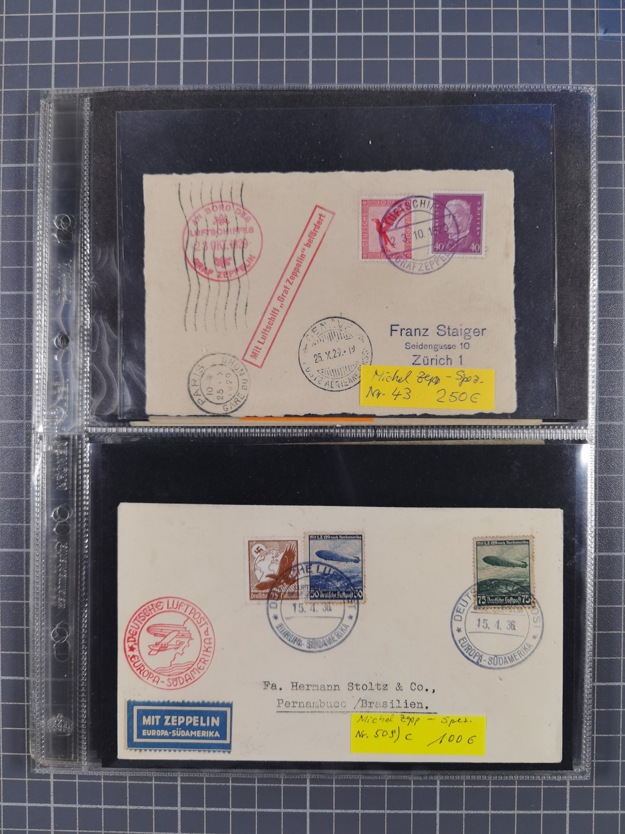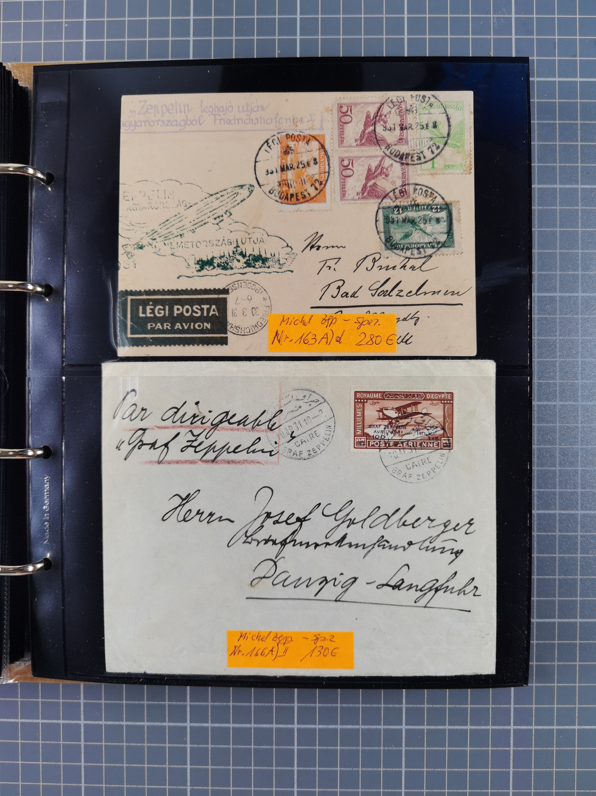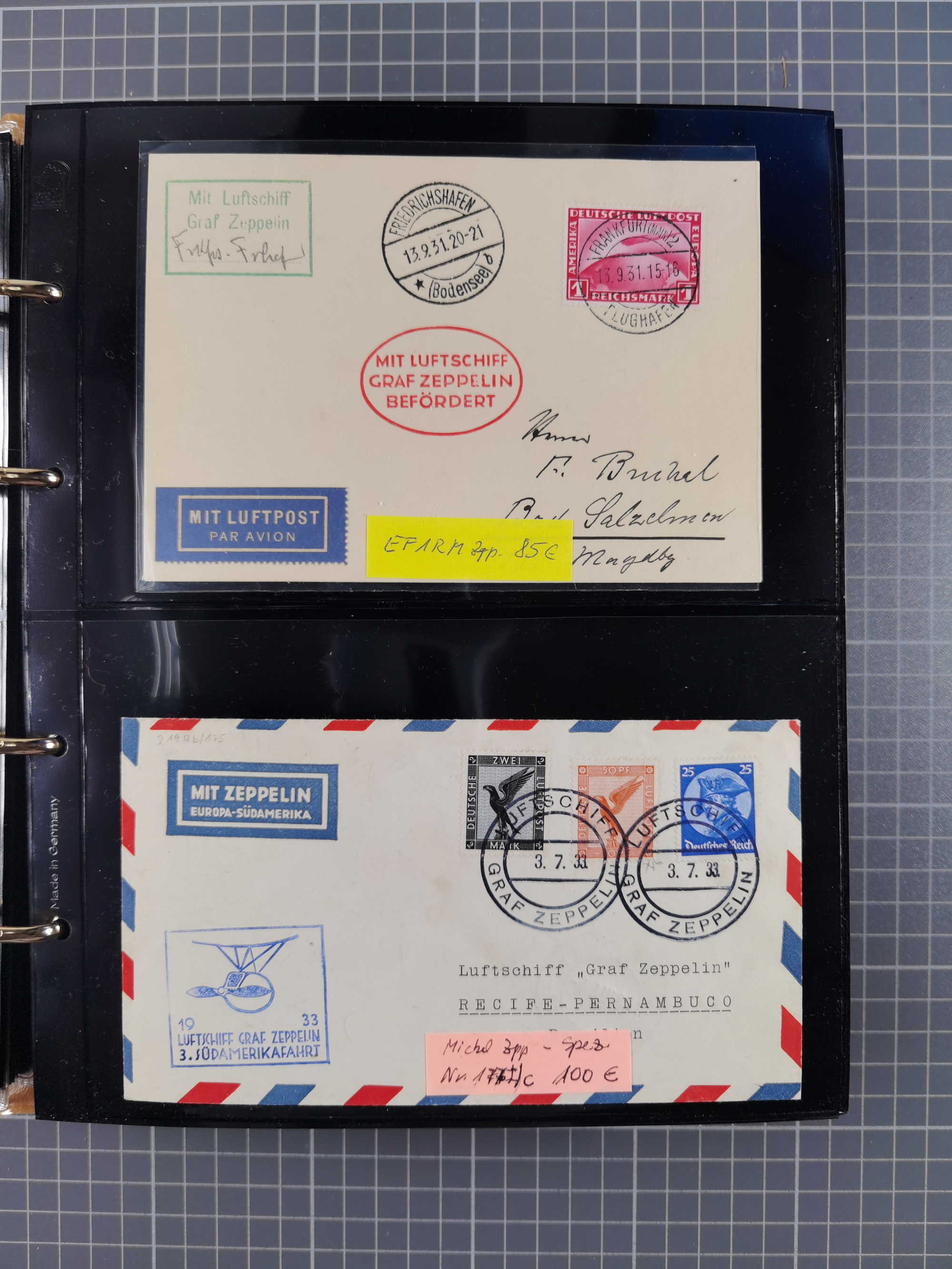 1913/36, Album mit 55 Zeppelinbriefen -Karten, (51 St. DR) dabei viele bessere Belege, u.a. DR großes Telegramm Luftschiff Hindenburg. Zeppelinkarte Viktoria Luise" und Hansa" (Sieger Nr. 4 und 6 II) Zeppelinbrief mit 1 und 2 RM Chicagofahrt!, Zeppelinkarte Nordpolarfahrt Zuleitung Niederlande. 2. SAF 1933, Zuleitung franz. Andorra, Zeppelin-Karte mit 2. SAF 1931 Hin- und Rückfahrt mit brasilianischer und deutscher Frankatur (2 x 1 RM Zeppelin) 10 Zeppelinbriefe/Karten mit 1.2 und 4 RM Zeppelin, meist gute Erhaltung