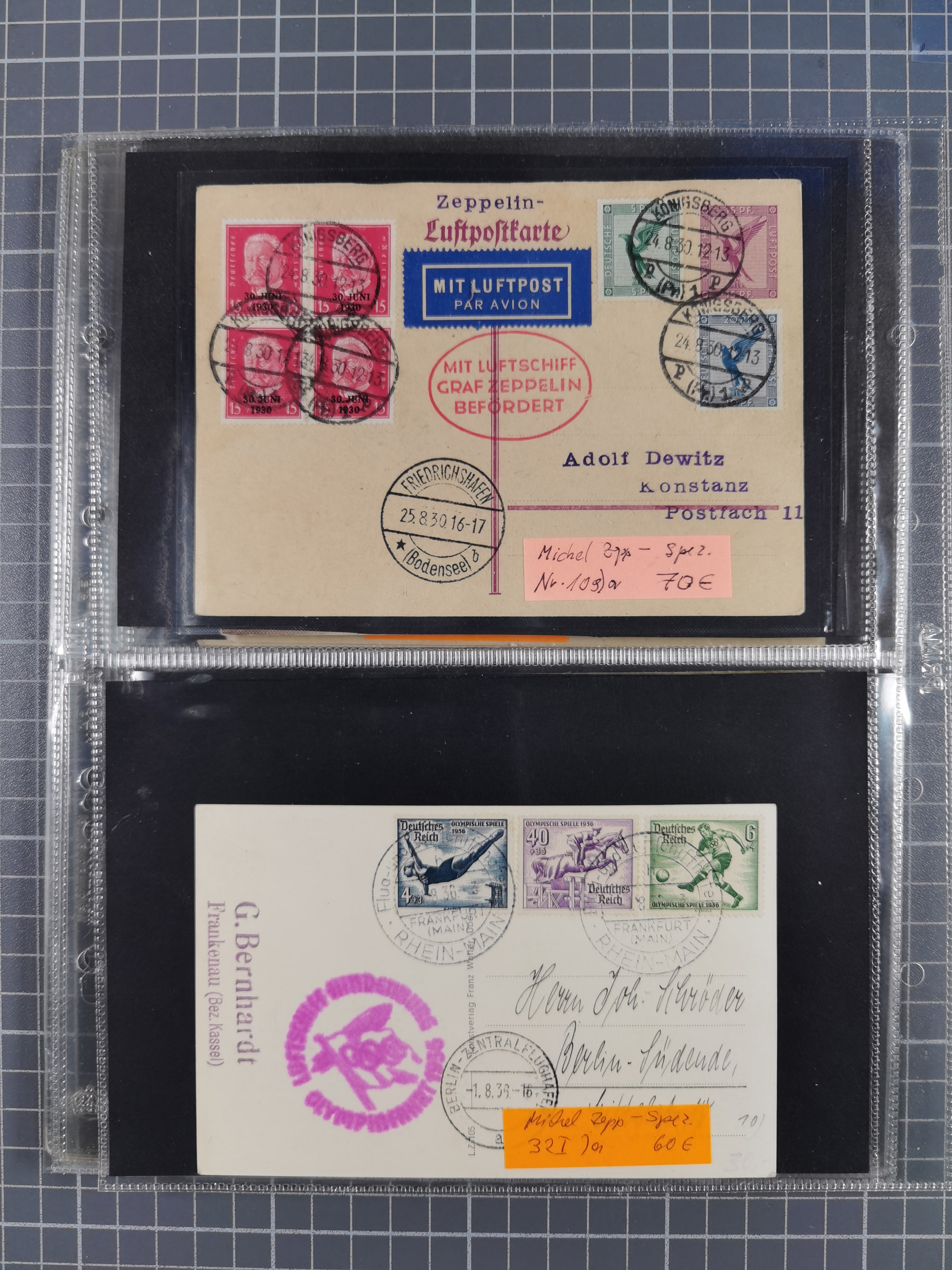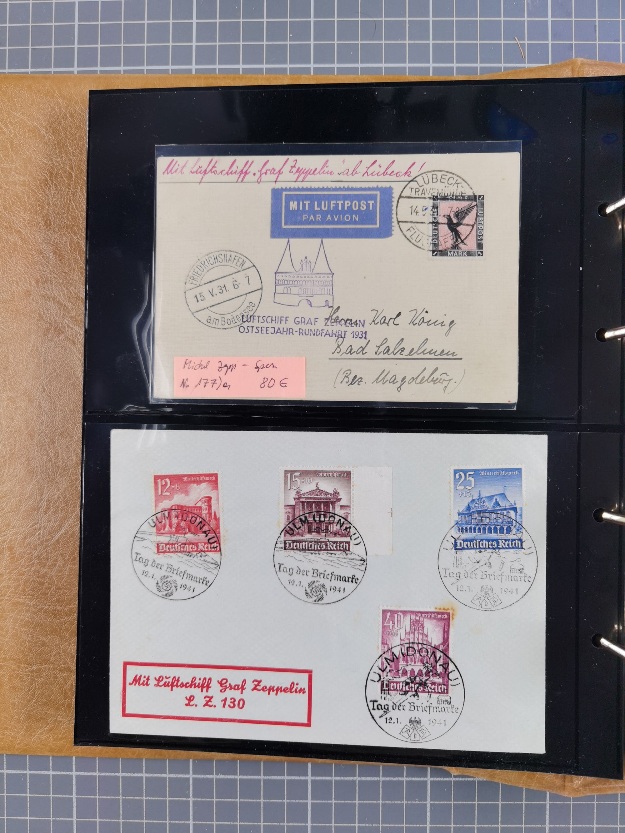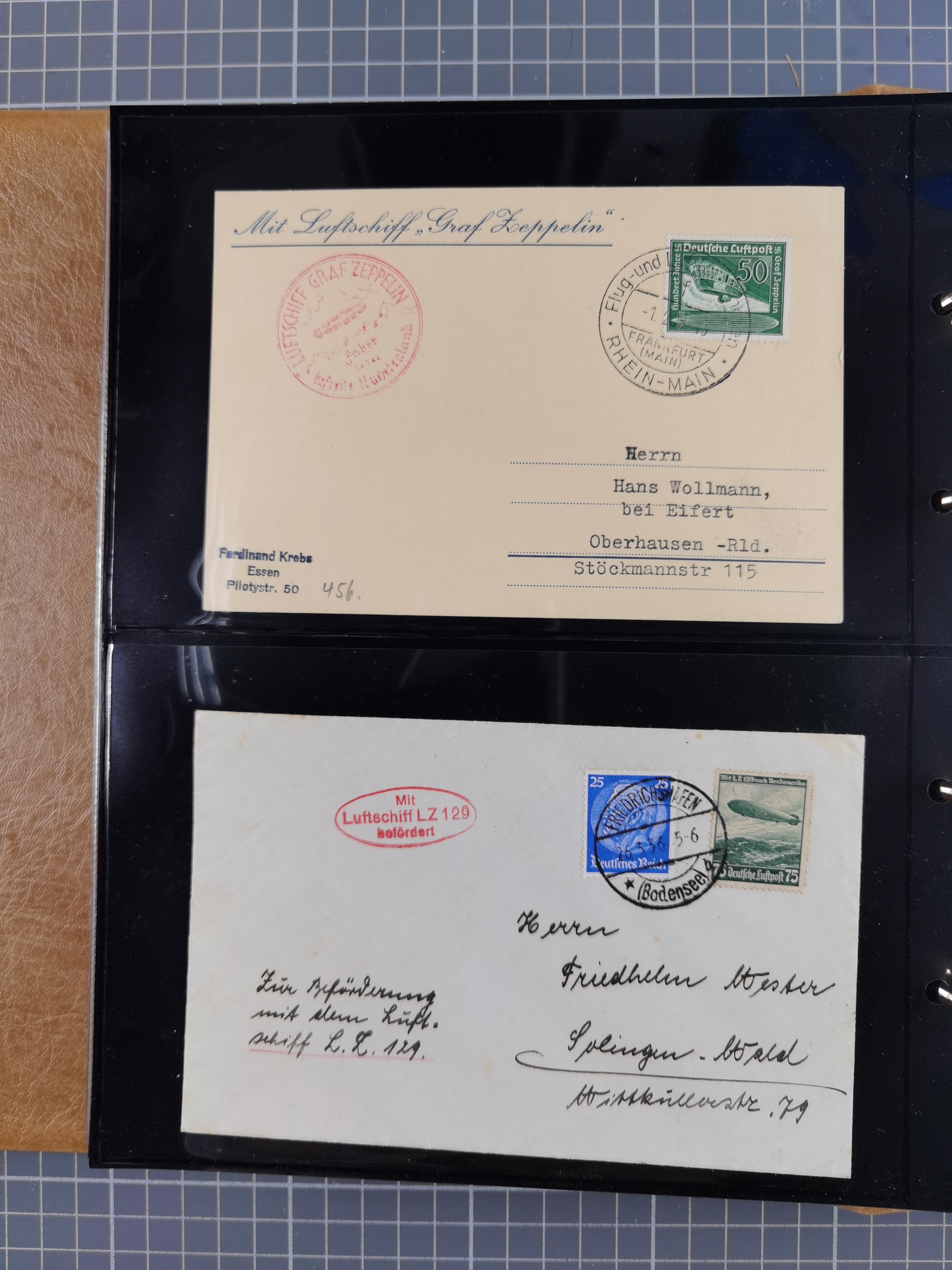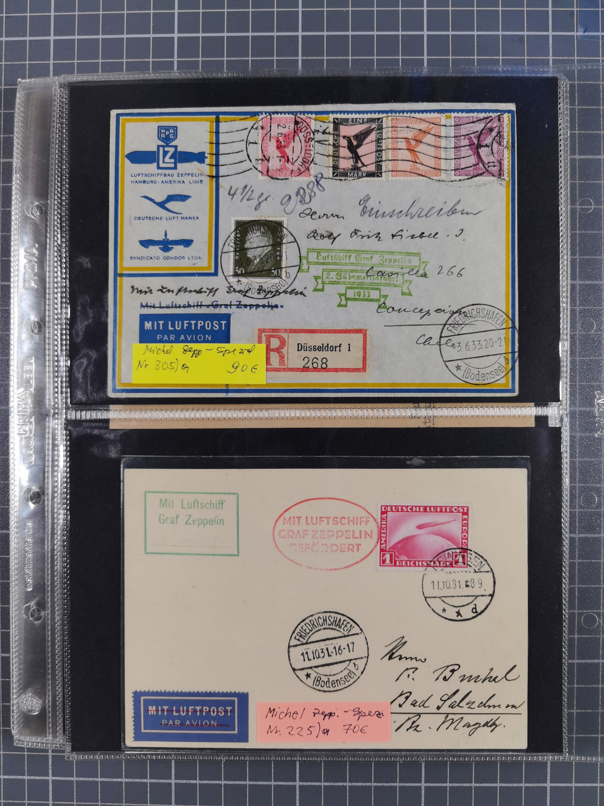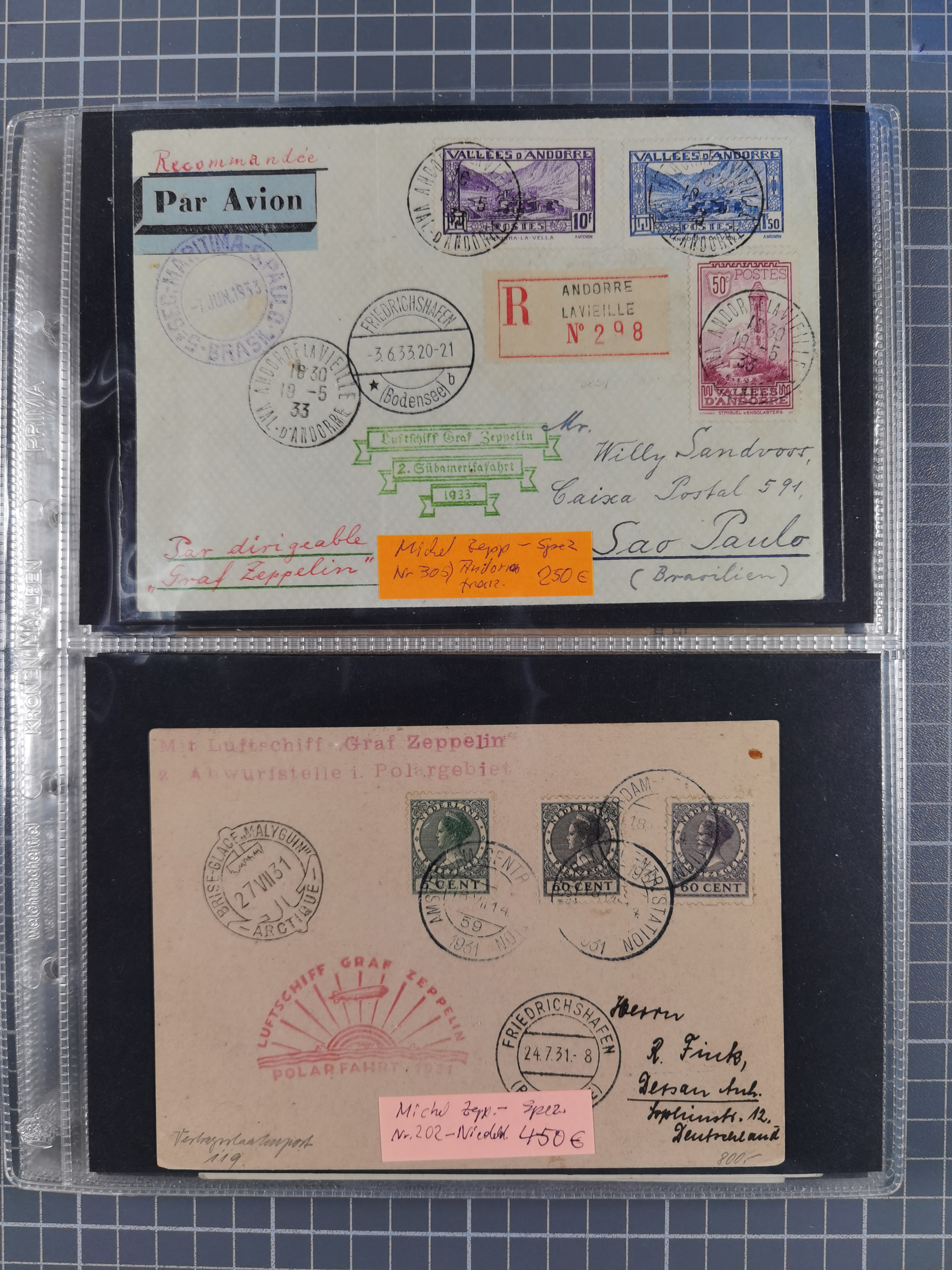 1913/36, Album mit 55 Zeppelinbriefen -Karten, (51 St. DR) dabei viele bessere Belege, u.a. DR großes Telegramm Luftschiff Hindenburg. Zeppelinkarte Viktoria Luise" und Hansa" (Sieger Nr. 4 und 6 II) Zeppelinbrief mit 1 und 2 RM Chicagofahrt!, Zeppelinkarte Nordpolarfahrt Zuleitung Niederlande. 2. SAF 1933, Zuleitung franz. Andorra, Zeppelin-Karte mit 2. SAF 1931 Hin- und Rückfahrt mit brasilianischer und deutscher Frankatur (2 x 1 RM Zeppelin) 10 Zeppelinbriefe/Karten mit 1.2 und 4 RM Zeppelin, meist gute Erhaltung