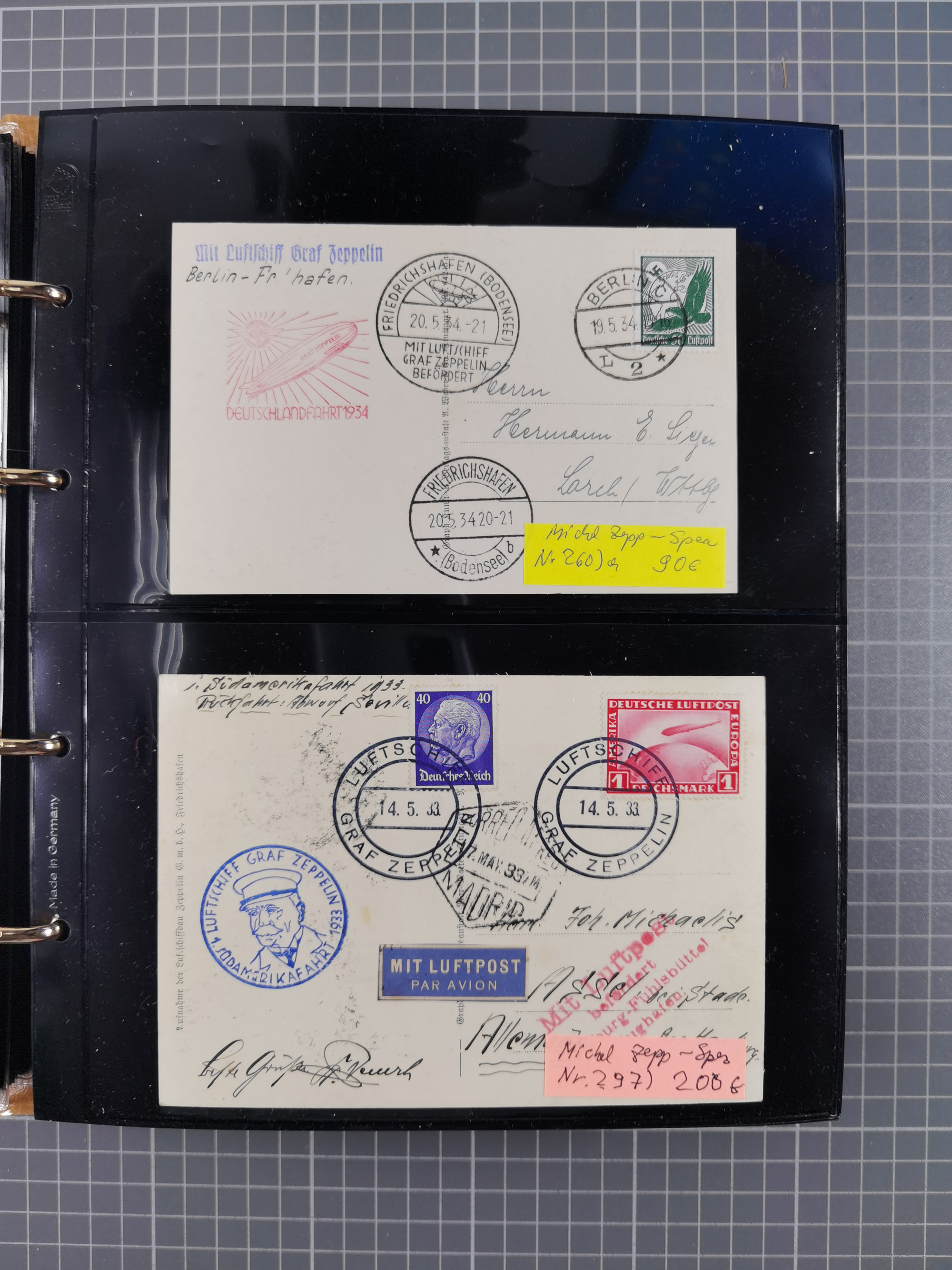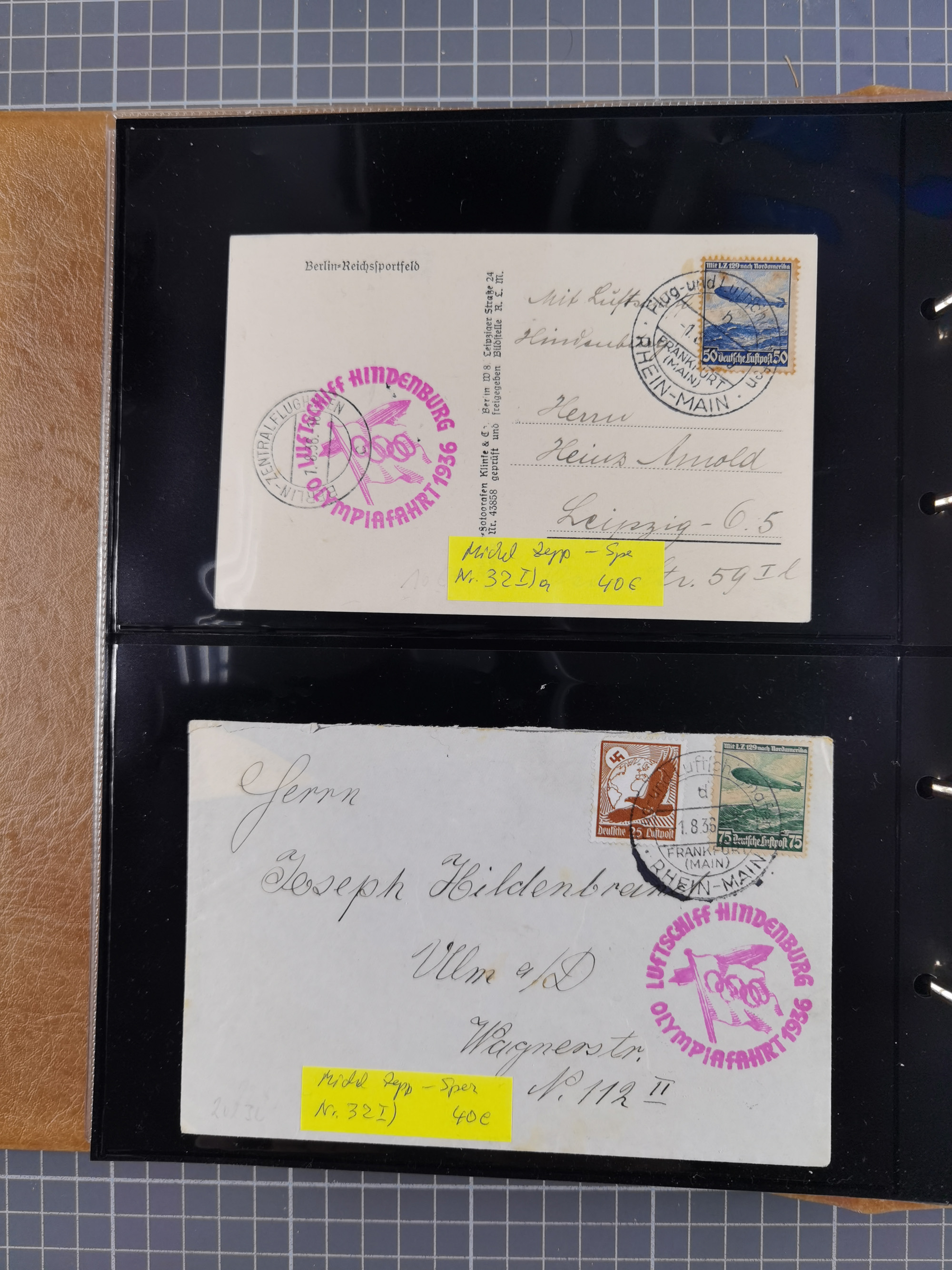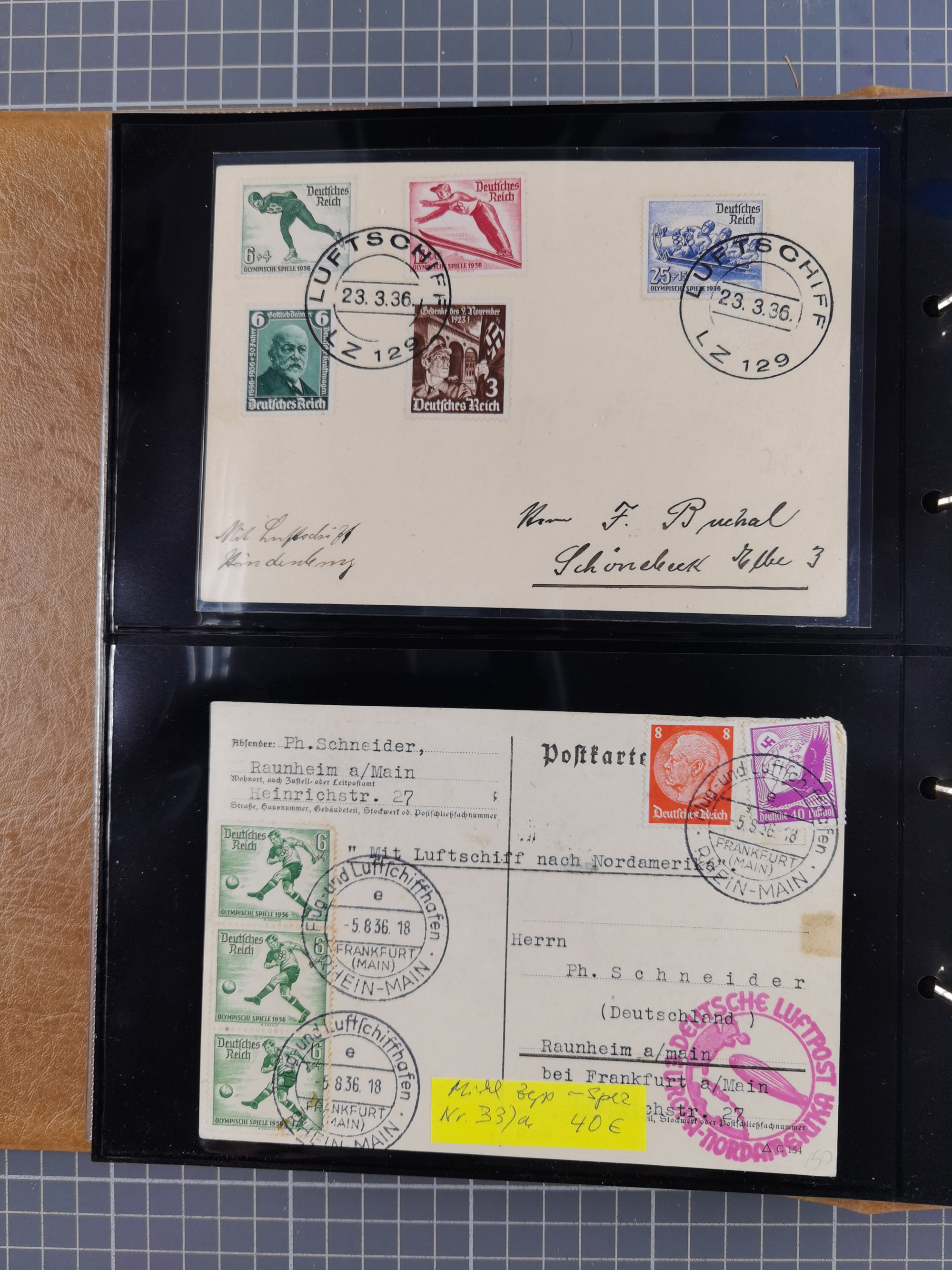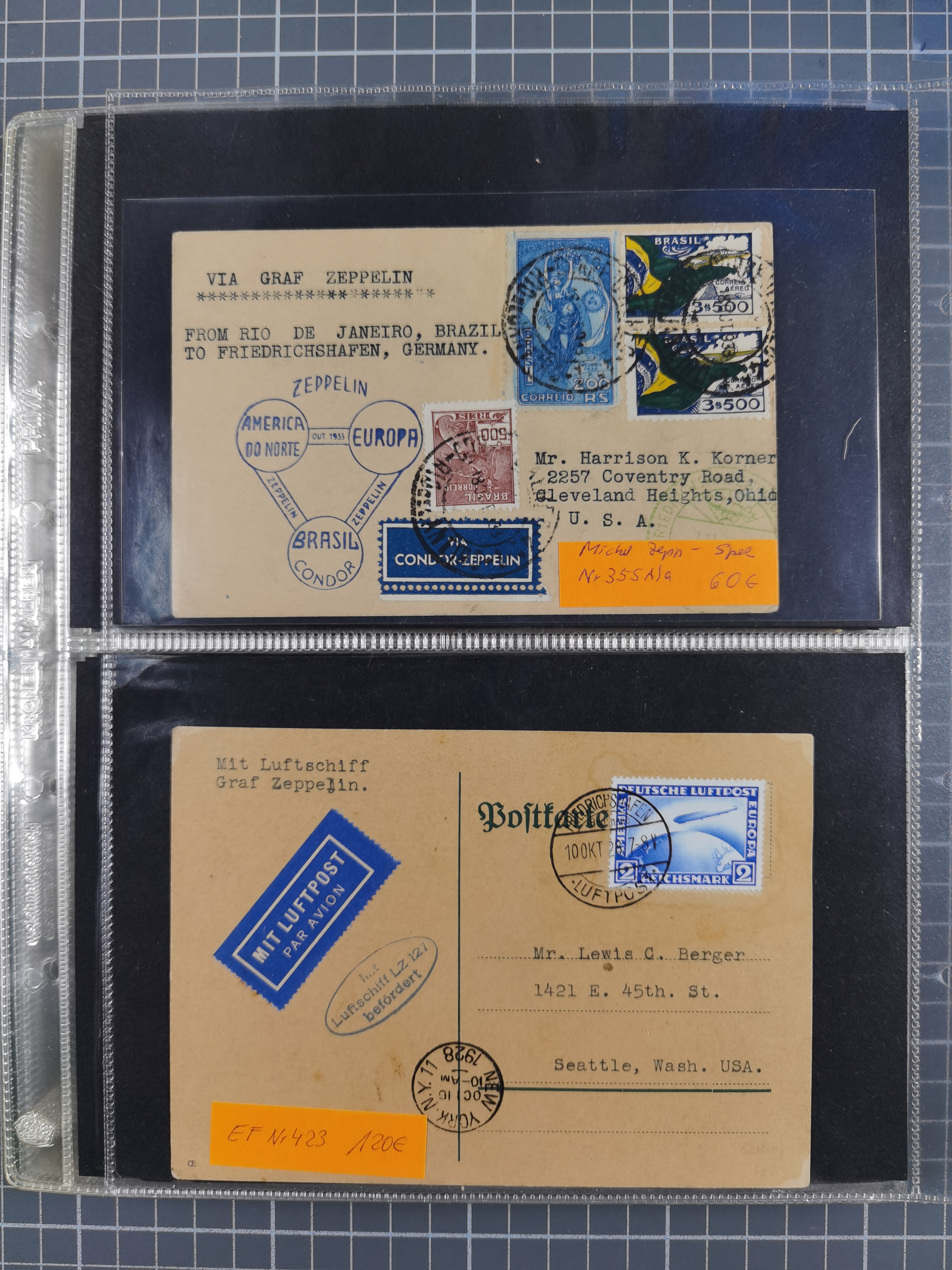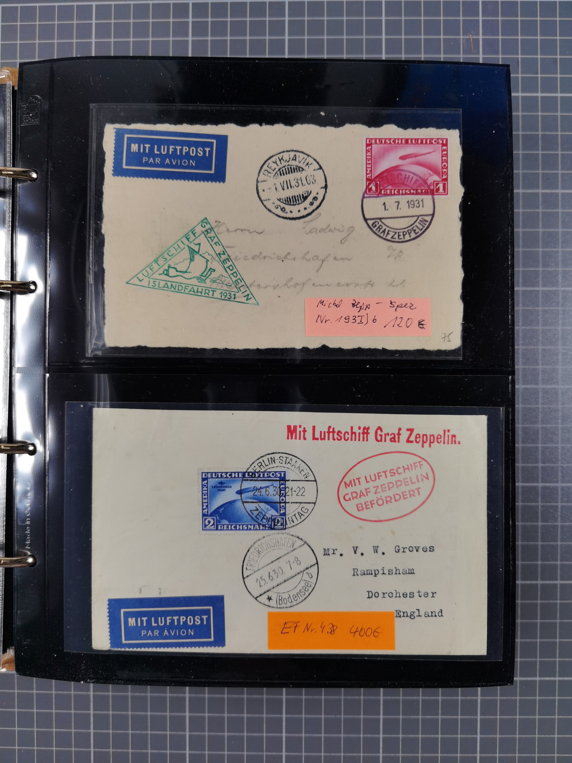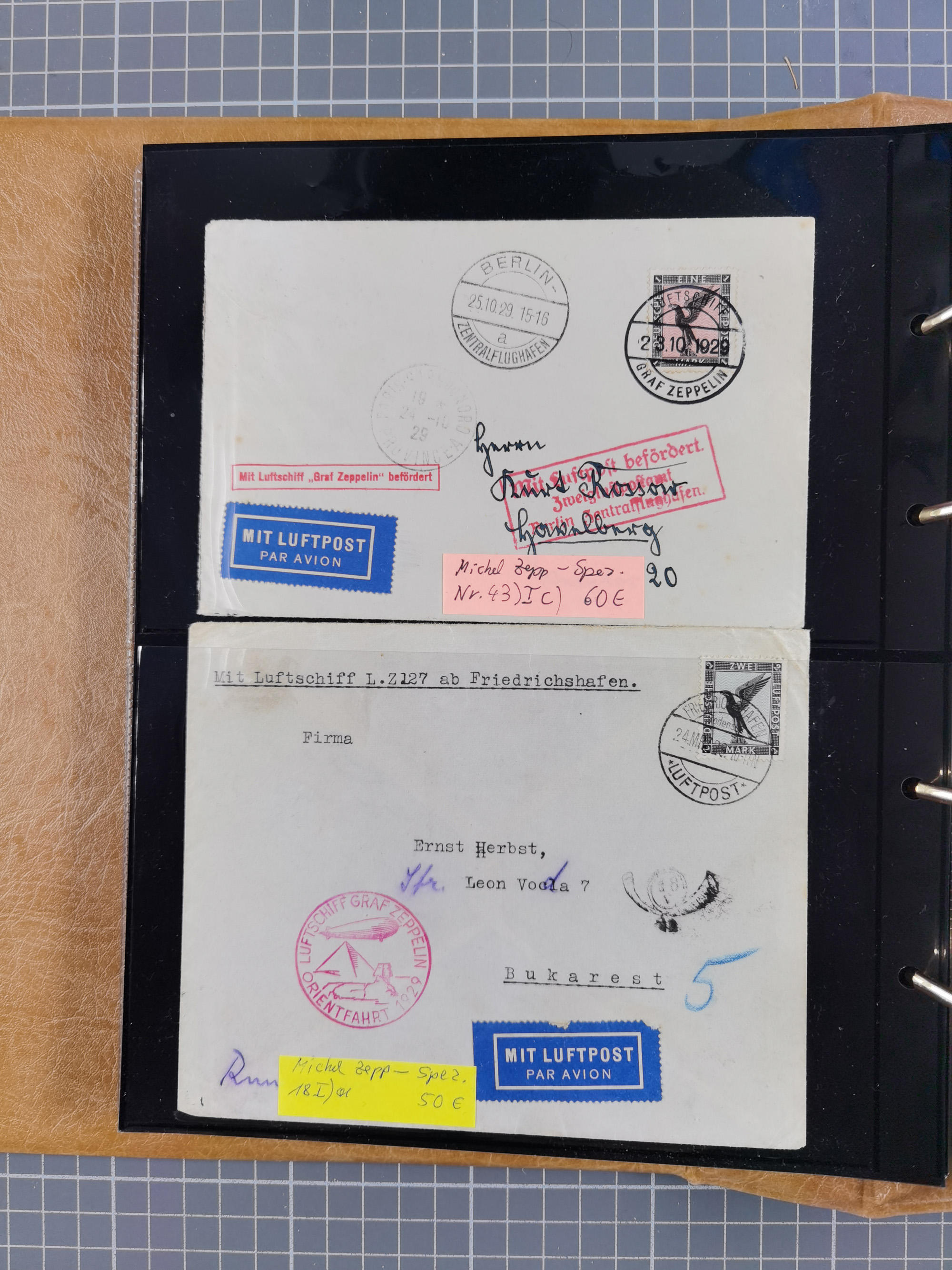 1913/36, Album mit 55 Zeppelinbriefen -Karten, (51 St. DR) dabei viele bessere Belege, u.a. DR großes Telegramm Luftschiff Hindenburg. Zeppelinkarte Viktoria Luise" und Hansa" (Sieger Nr. 4 und 6 II) Zeppelinbrief mit 1 und 2 RM Chicagofahrt!, Zeppelinkarte Nordpolarfahrt Zuleitung Niederlande. 2. SAF 1933, Zuleitung franz. Andorra, Zeppelin-Karte mit 2. SAF 1931 Hin- und Rückfahrt mit brasilianischer und deutscher Frankatur (2 x 1 RM Zeppelin) 10 Zeppelinbriefe/Karten mit 1.2 und 4 RM Zeppelin, meist gute Erhaltung