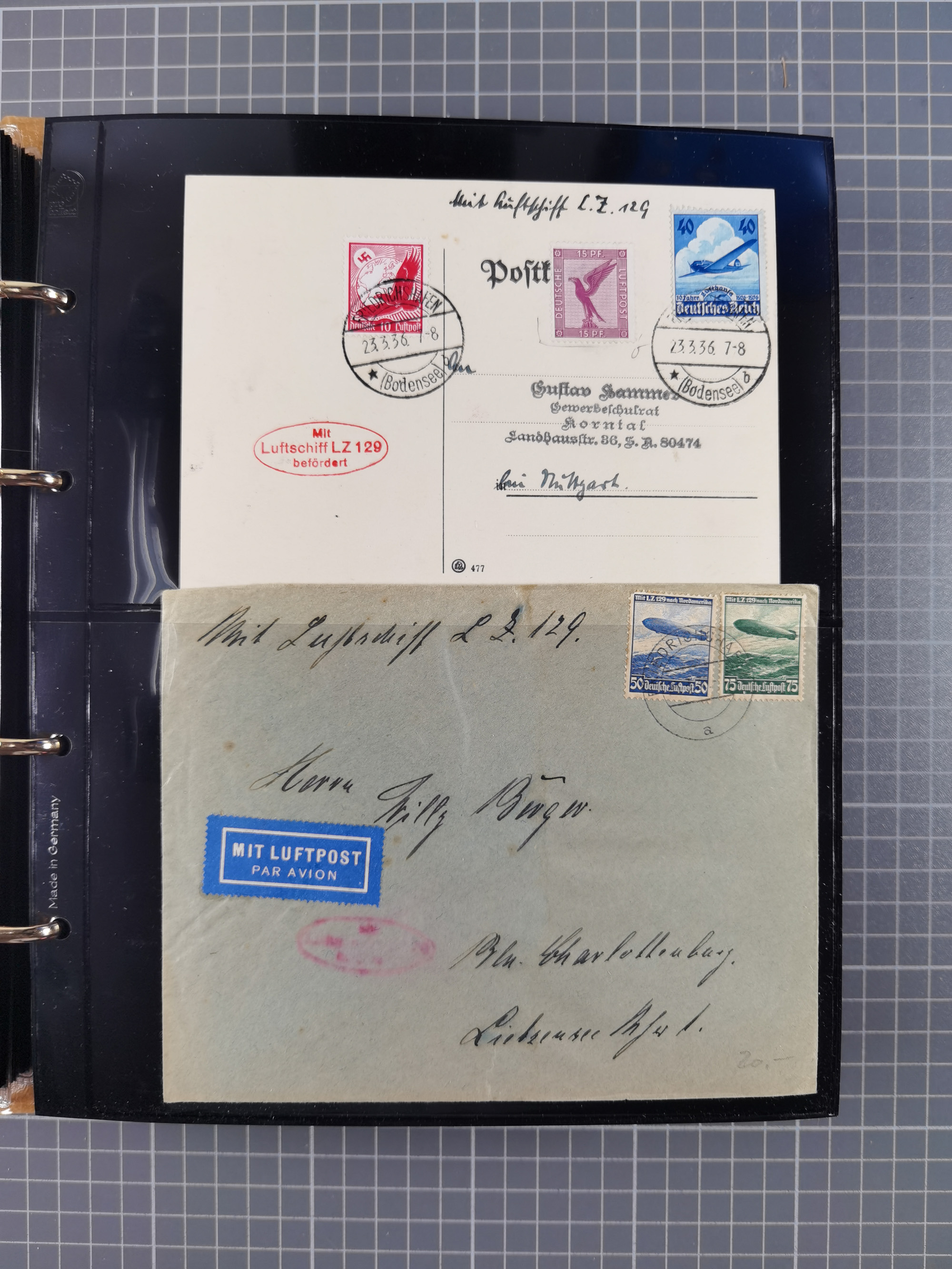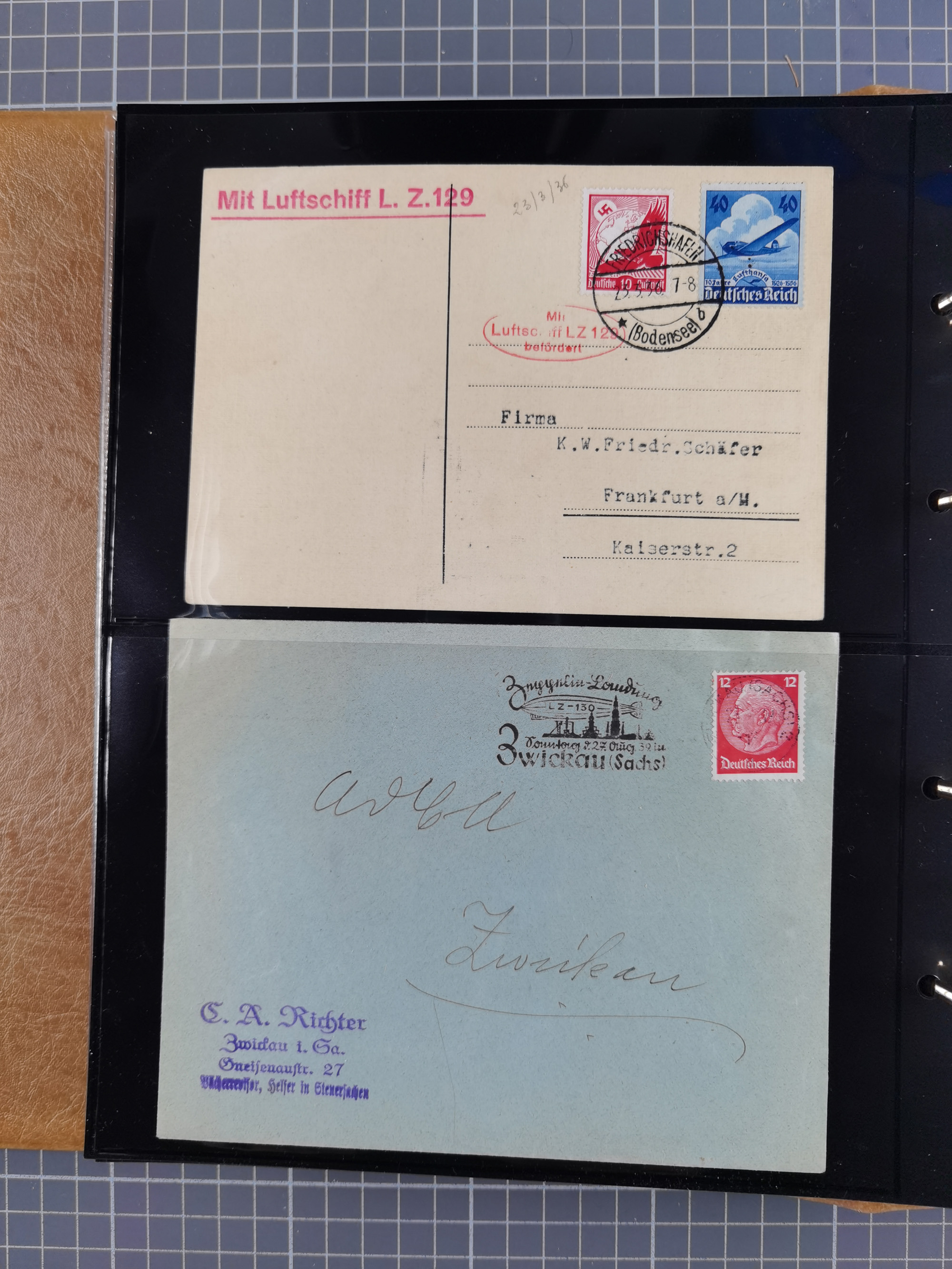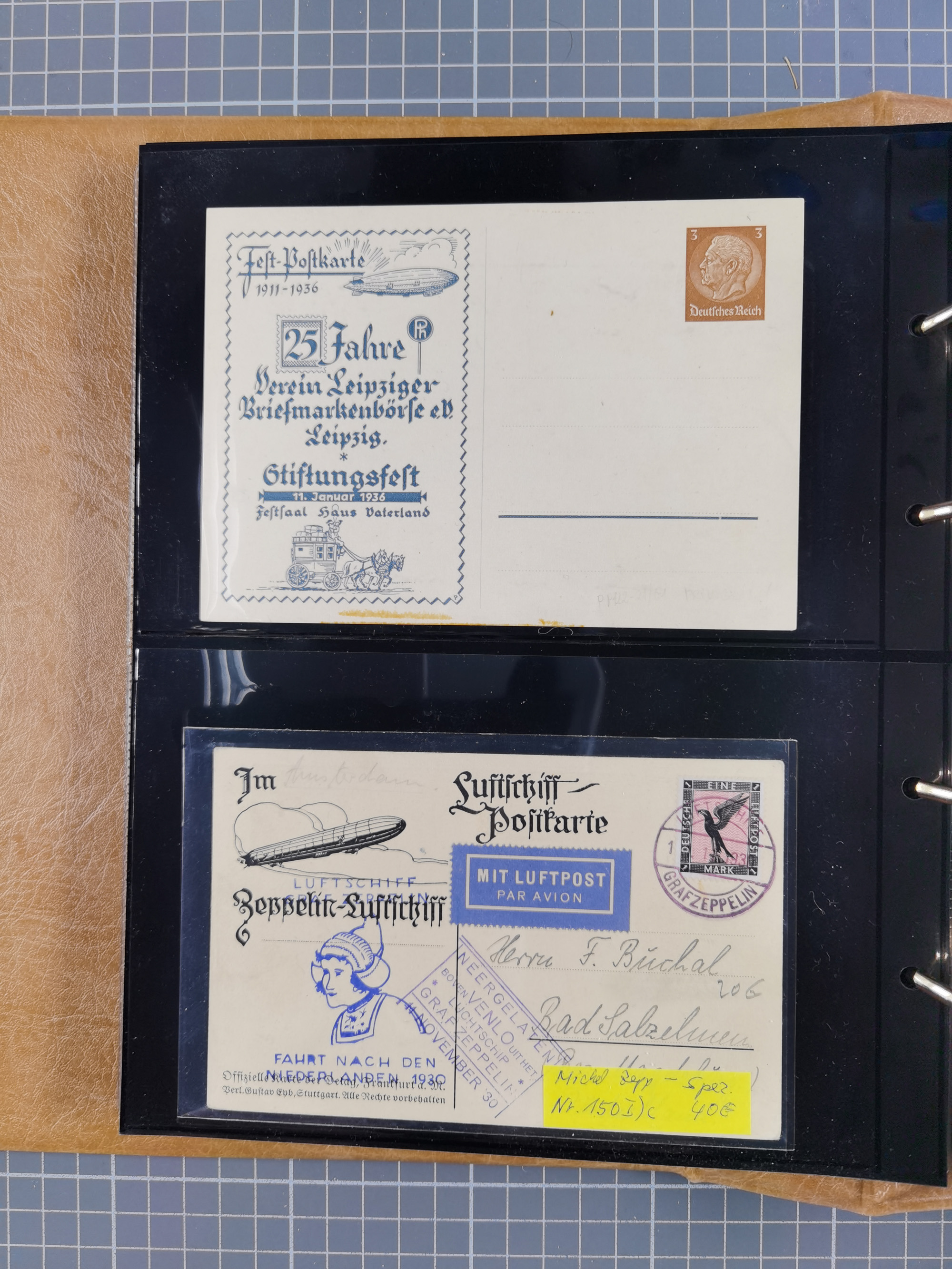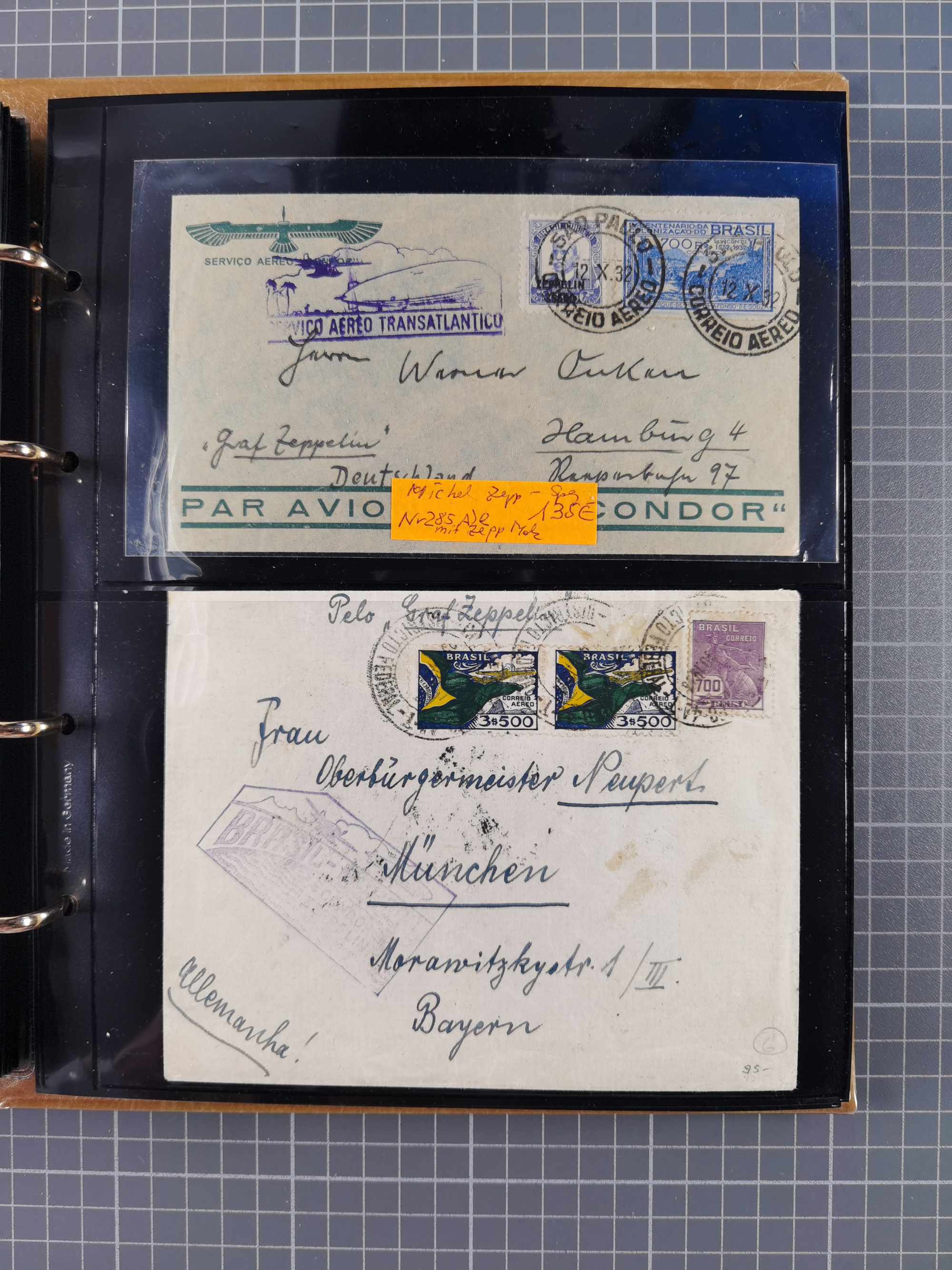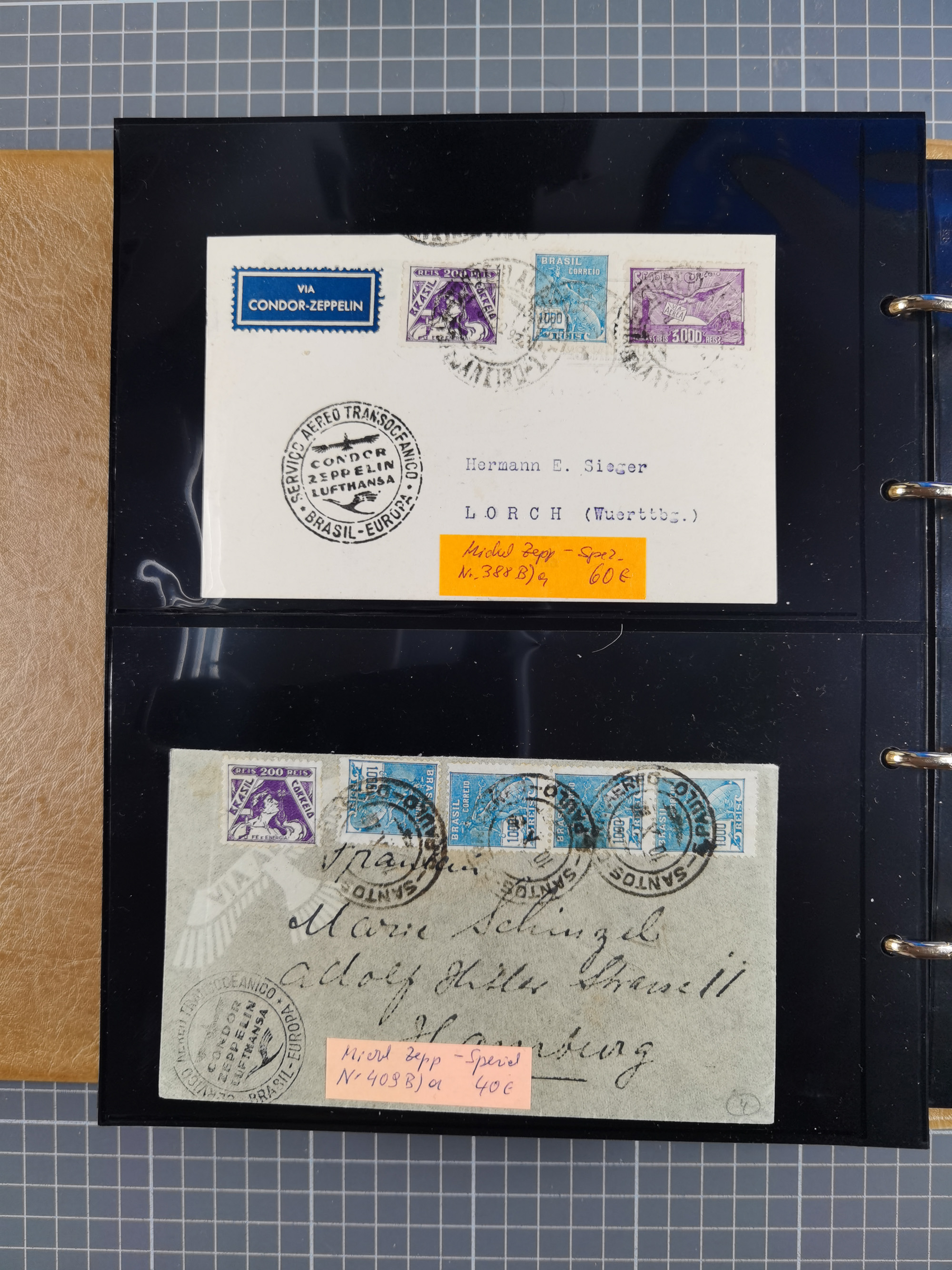 1913/36, Album mit 55 Zeppelinbriefen -Karten, (51 St. DR) dabei viele bessere Belege, u.a. DR großes Telegramm Luftschiff Hindenburg. Zeppelinkarte Viktoria Luise" und Hansa" (Sieger Nr. 4 und 6 II) Zeppelinbrief mit 1 und 2 RM Chicagofahrt!, Zeppelinkarte Nordpolarfahrt Zuleitung Niederlande. 2. SAF 1933, Zuleitung franz. Andorra, Zeppelin-Karte mit 2. SAF 1931 Hin- und Rückfahrt mit brasilianischer und deutscher Frankatur (2 x 1 RM Zeppelin) 10 Zeppelinbriefe/Karten mit 1.2 und 4 RM Zeppelin, meist gute Erhaltung