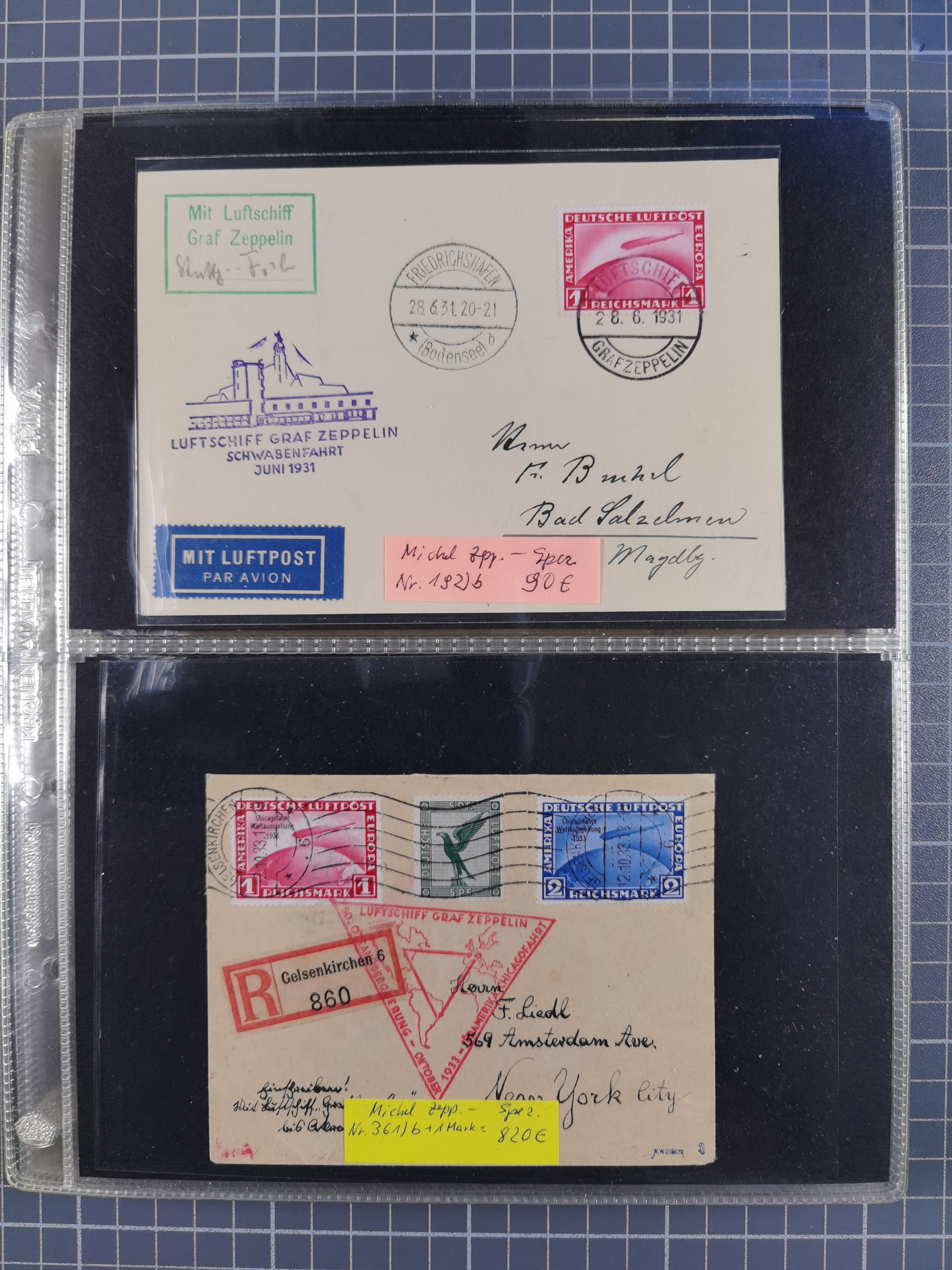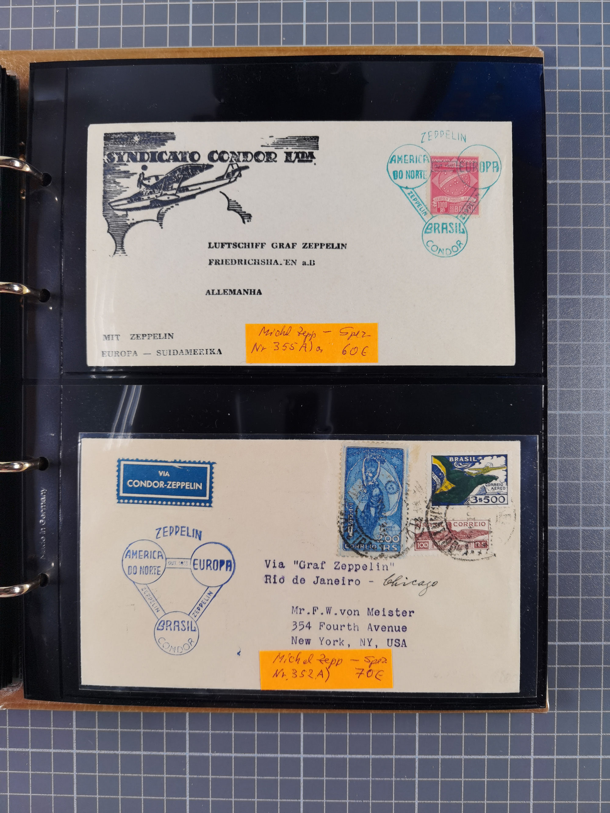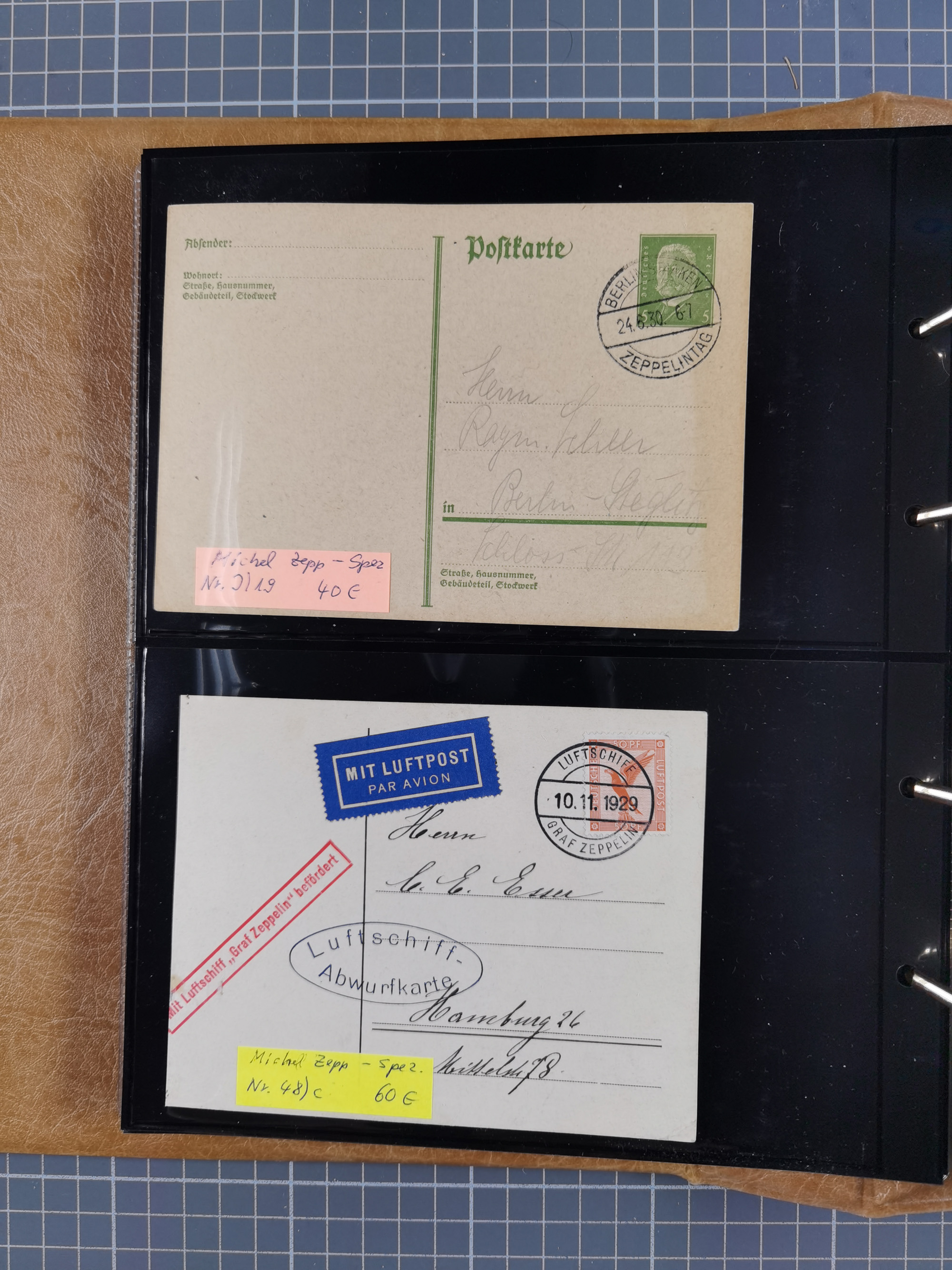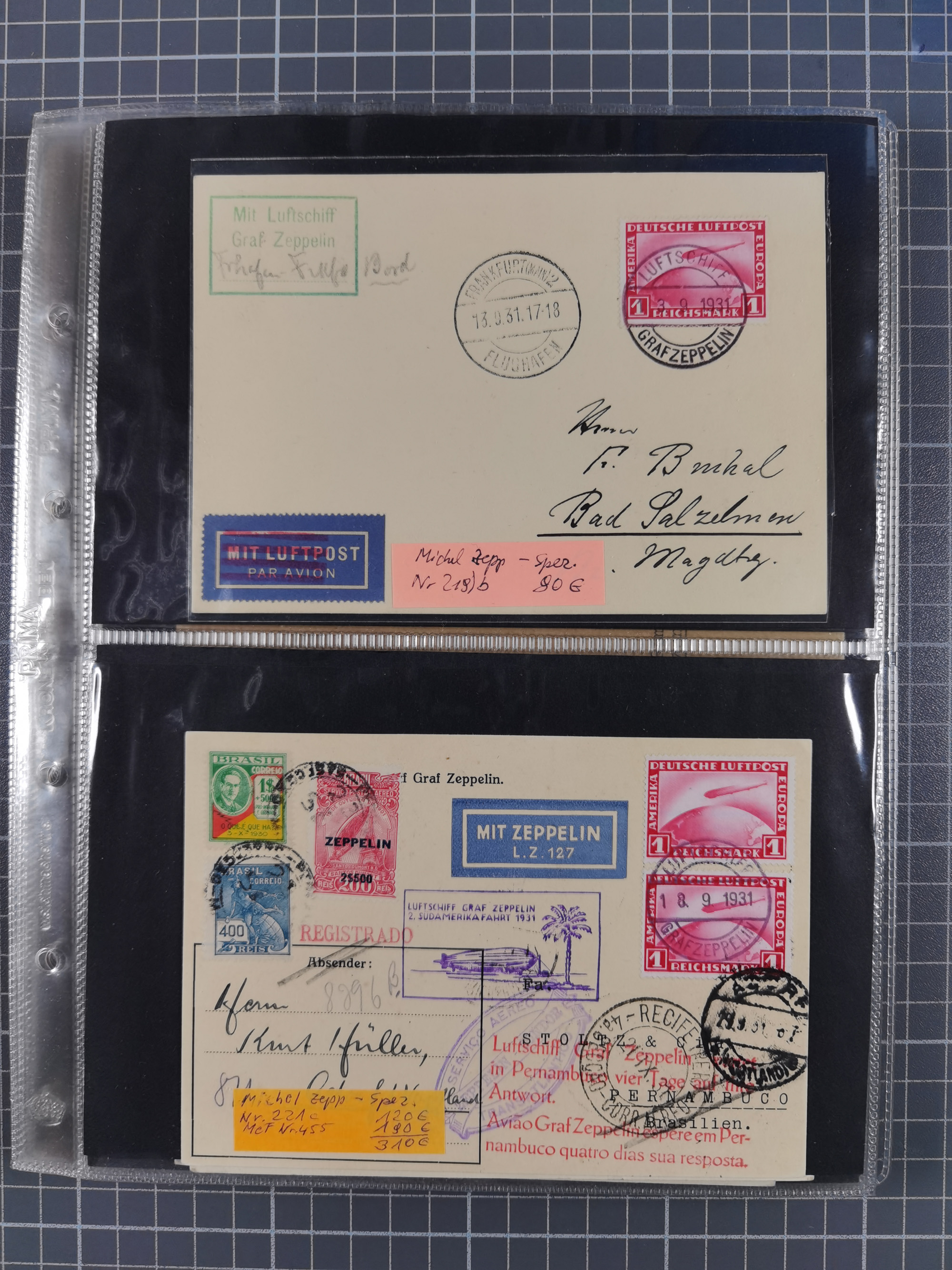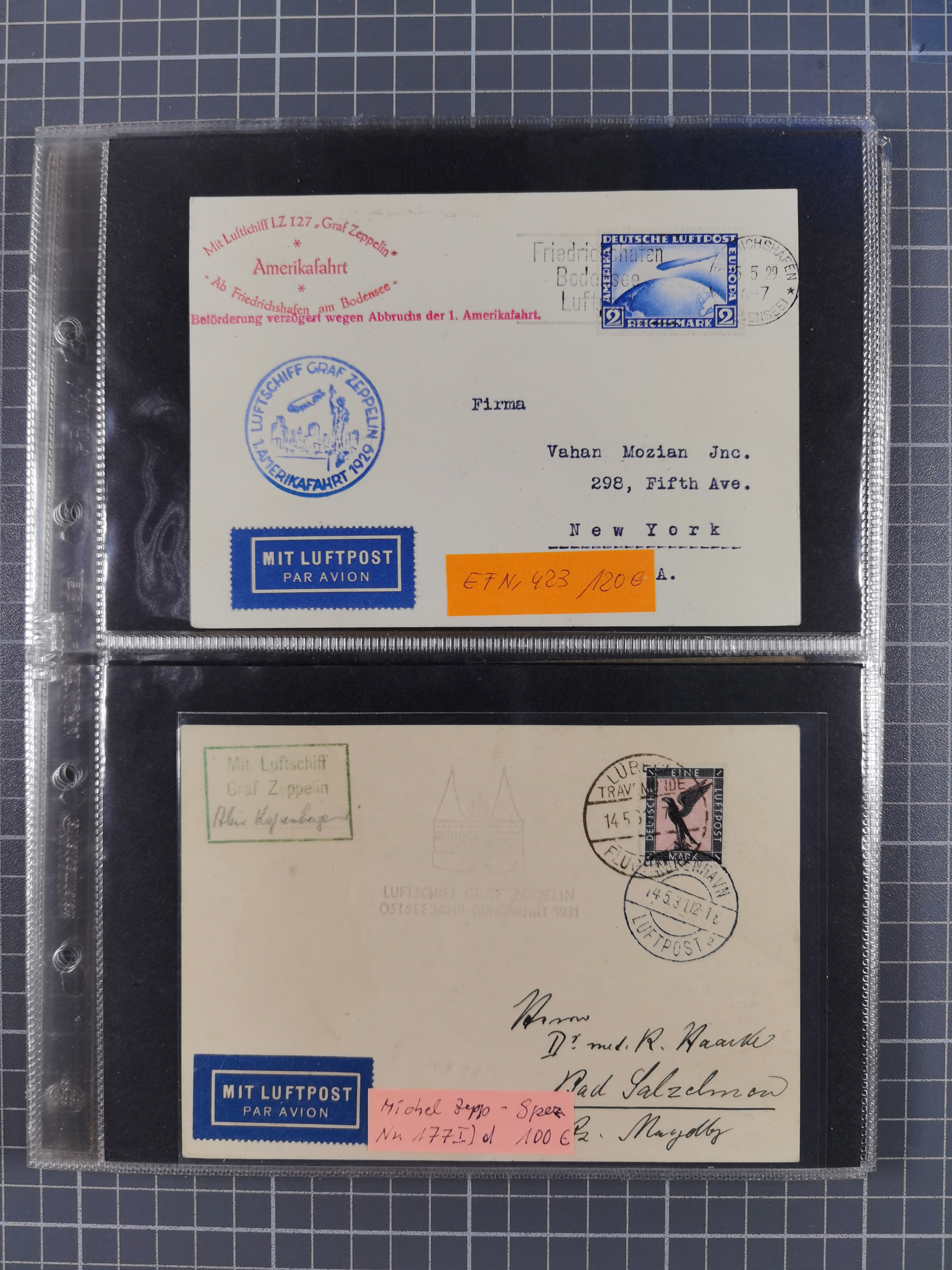 1913/36, Album mit 55 Zeppelinbriefen -Karten, (51 St. DR) dabei viele bessere Belege, u.a. DR großes Telegramm Luftschiff Hindenburg. Zeppelinkarte Viktoria Luise" und Hansa" (Sieger Nr. 4 und 6 II) Zeppelinbrief mit 1 und 2 RM Chicagofahrt!, Zeppelinkarte Nordpolarfahrt Zuleitung Niederlande. 2. SAF 1933, Zuleitung franz. Andorra, Zeppelin-Karte mit 2. SAF 1931 Hin- und Rückfahrt mit brasilianischer und deutscher Frankatur (2 x 1 RM Zeppelin) 10 Zeppelinbriefe/Karten mit 1.2 und 4 RM Zeppelin, meist gute Erhaltung